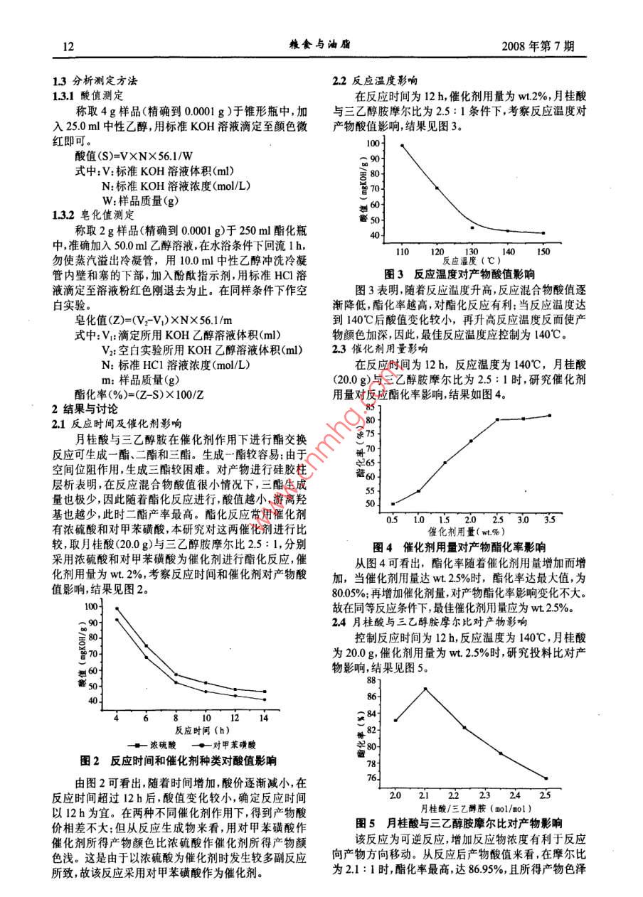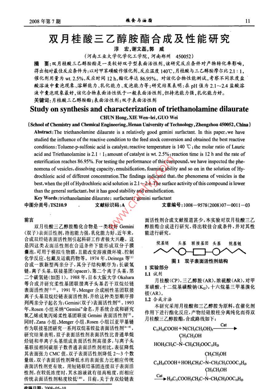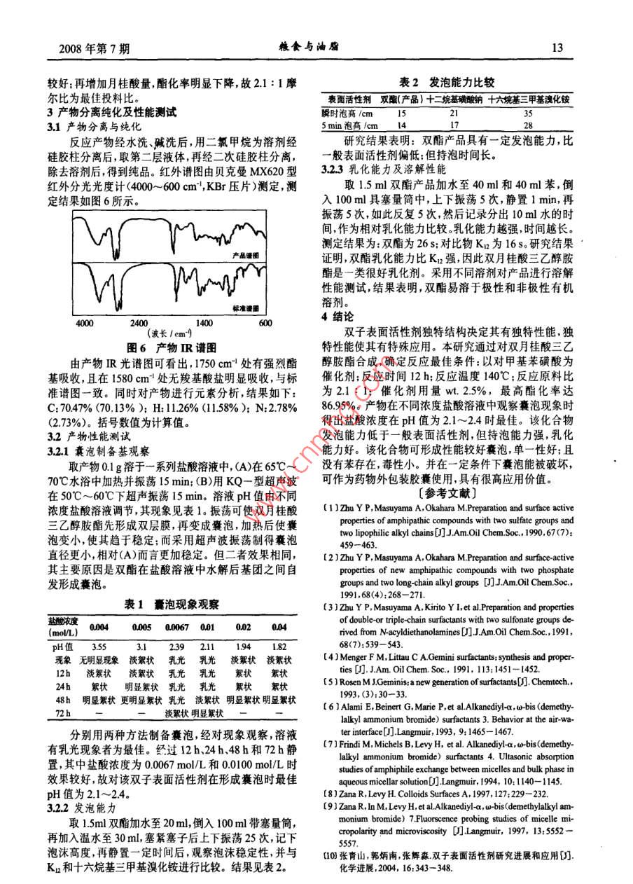 2008年第7期糧食與油脂雙月桂酸三乙醇胺酯合成及性能研究淳宏,謝文磊郭威(河南工業(yè)大學(xué)化學(xué)化工學(xué)院,河南鄭州450052)摘要:雙月桂酸三乙醇胺酯是一類(lèi)較好雙子型表面活性劑,該研究反應(yīng)條件對(duì)產(chǎn)物轉(zhuǎn)化率影響得出相對(duì)最佳反應(yīng)條件為:以對(duì)甲苯磺酸作催化劑,反應(yīng)溫度140℃,月桂酸與三乙醇胺摩爾比21:1,催化劑用量為w.2.5%,反應(yīng)時(shí)間12h,酯化率達(dá)8695%。對(duì)該化合物性能測(cè)試,考察不同濃度鹽酸溶液中囊泡現(xiàn)象、溶解能力、乳化能力、發(fā)泡能力等;研究結(jié)果表明:在pH值為2.l~2.4鹽酸溶液中囊泡現(xiàn)象最好,該化合物表面活性低于一般表面活性劑,但持泡能力強(qiáng),乳化能力好。關(guān)鍵詞:月桂酸三乙醇胺酯;表面活性劑;雙子表面活性劑Study on synthesis and characterization of triethanolamine dilaurateCHUN Hong, XIE Wen-lei, GUO Wei( School of Chemistry and Chemical Engineering, Henan University of Technology, Zhengzhou 450052, China)Abstract: The triethanolamine dilaurate is a relatively good gemini surfactant. In this paper, we havestudied the influence of the reactive condition to the feed stock conversion and obtained the best reactiveconditions: Toluene-p-sulfonic acid is catalyst; reactive temperature is 140 C: the molar ratio of Lauricacid and Triethanolamine is 2.1: 1: amount of catalyst is wt. 2.5% reaction time is 12 h and the rate ofesterification reaches 86.95%. For testing the performance of this compound, we have inspected the phenomena of vesicles, dissolving capacity, emulsification, foaming ability and so on in the solution of Hydrochloric acid of different concentration. The findings indicated that, the phenomena of vesicles is thebest,when the pH of Hydrochloric acid solution is 2. 1--2.4. The surface activity of this compound is lowerthan the general surfactant, but it has good stability and emulsificationKey Words: triethanolamine dilaurate; surfactant; gemini surfactant中圖分類(lèi)號(hào):TS2109文章編號(hào):1008-9578(2008)07-001-03前言面活性劑合成文獻(xiàn)報(bào)道甚少,本實(shí)驗(yàn)對(duì)雙月桂酸三乙雙月桂酸三乙醇胺酯化合物是一類(lèi)較好 Gemini醇胺酯合成進(jìn)行研究,得出較佳合成條件,并對(duì)其性雙子)表面活性劑,持泡能力強(qiáng),乳化能力好。近年來(lái),能進(jìn)行研究。合成雙烴鏈表面活性劑引起科研工作者極大興趣。這是因這類(lèi)表面活性劑在合適條件下能形成雙分子膜烷基鏈頭基聯(lián)接基團(tuán)頭基烷基鏈囊泡,可用于模擬生物膜,且能改變?nèi)芤何h(huán)境、控制化學(xué)反應(yīng)、包藏及運(yùn)載藥物等。1974年, Deinega等合成一族新型兩親分子,其分子結(jié)構(gòu)順序?yàn)?長(zhǎng)碳?xì)鋱D1雙子表面活性劑結(jié)構(gòu)鏈,離子頭基,聯(lián)接基團(tuán)( spacer),第二個(gè)離子頭基,第1實(shí)驗(yàn)部分個(gè)碳?xì)滏?如圖1)。1988年,日本大阪大學(xué) Okuhara1.1試劑等合成并研究柔性基團(tuán)聯(lián)接離子頭基若干雙烷烴鏈月桂酸(CP),三乙醇胺(AR),濃硫酸(AR),對(duì)甲表面活性劑2-3。1991年,Mmgr合成剛性基團(tuán)聯(lián)接磺酸,十二烷基磺酸鈉(Ka),十六烷基三甲基溴化銨(AR)。離子頭基雙烷烴鏈表面活性劑并給這種類(lèi)型順序排12合成方法列兩親分子起名為: Gemini(雙子)表面活性劑4。1993年, Rosen小組采納“ Gemini”命名,并系統(tǒng)合成和研究本研究采用月桂酸和三乙醇胺為原料,在催化劑氧乙烯或氧丙烯柔性基團(tuán)聯(lián)接 Gemini表面活性劑”。作用下進(jìn)行酯化反應(yīng),產(chǎn)物經(jīng)硅膠柱分離純化而得雙同時(shí),Zan小組、 Menger小組、Rosn小組以亞甲基鏈月桂酸三乙醇胺酯合成路線如下:作為聯(lián)接基團(tuán)研究一系列雙烷基銨鹽表面活性劑“明,CuhzcooH+N(CH_CH_OH)-研究結(jié)果表明,雙子表面活性劑表面活性比普通單烷CHICHIOH烴鏈和單離子頭基組成表面活性劑高很多,與離子頭基聯(lián)接相同碳原子數(shù)普通表面活性劑相比,表征降低HOHYCHC-N-CHCHOOCnH其表面張力CMC值,雙子表面活性劑降低2~3個(gè)數(shù)CHAHOH量級(jí),雙子表面活性劑降低水的表面張力比相應(yīng)傳統(tǒng)表面活性劑更有效。用短鏈聯(lián)結(jié)基團(tuán)連接雙子表面活CnHnCOOH+HOH_CH_ C-N-CH CH,COOCuH3性劑,在較低濃度時(shí),其水溶液就有很高粘度,而相應(yīng)CHICHOOH傳統(tǒng)表面活性劑粘度較低0。目前,關(guān)于含雙烴鏈表>.COOHCHC-N-CH,CH,OOCHH312糧食與油脂2008年第7期13分析測(cè)定方法2.2反應(yīng)溫度影響131酸值測(cè)定在反應(yīng)時(shí)間為12h,催化劑用量為wt2%,月桂酸稱(chēng)取4g樣品(精確到00001g)于錐形瓶中,加與三乙醇胺摩爾比為25:1條件下,考察反應(yīng)溫度對(duì)入250ml中性乙醇,用標(biāo)準(zhǔn)KOH溶液滴定至顏色微產(chǎn)物酸值影響,結(jié)果見(jiàn)圖3。紅即可。酸值(S)=V×N×561/W式中:V:標(biāo)準(zhǔn)KOH溶液體積(m)N:標(biāo)準(zhǔn)KOH溶液濃度(mol/L)W:樣品質(zhì)量(g)6013.2皂化值測(cè)定稱(chēng)取2g樣品(精確到0001)于250m酯化瓶中,準(zhǔn)確加入500m乙醇溶液,在水浴條件下回流1h,1101201勿使蒸汽溢出冷凝管,用10.0m中性乙醇沖洗冷凝反應(yīng)溫度(℃)管內(nèi)壁和塞的下部,加入酚酞指示劑,用標(biāo)準(zhǔn)HCl溶圖3反應(yīng)溫度對(duì)產(chǎn)物酸值影響液滴定至溶液粉紅色剛退去為止。在同樣條件下作空?qǐng)D3表明隨著反應(yīng)溫度升高,反應(yīng)