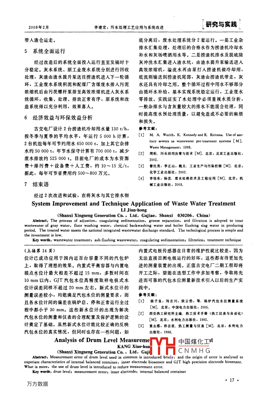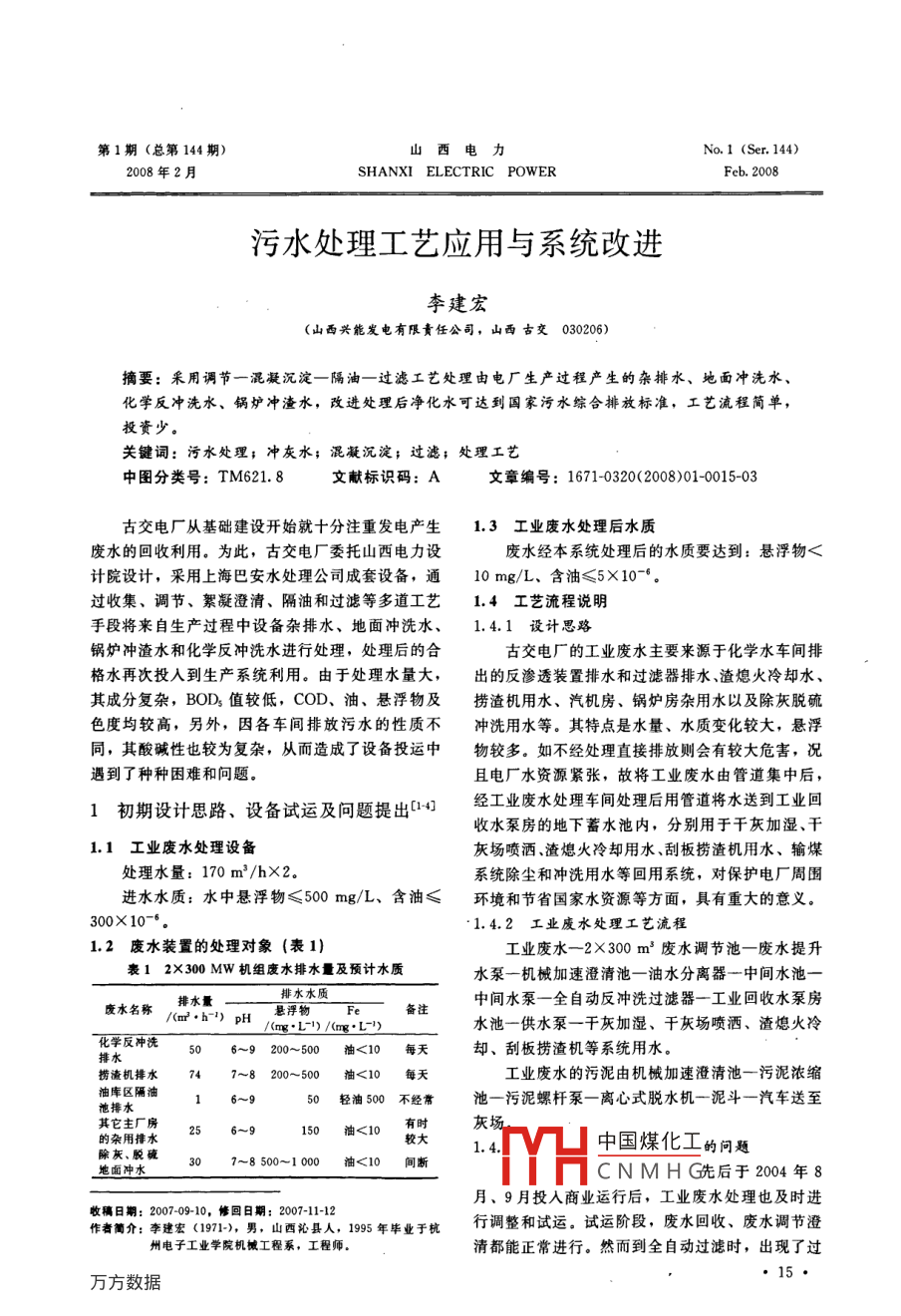 第1期(總第144期)山西電力No.1 (Ser. 144)2008年2月SHANXI ELECTRIC POWERFeb. 2008污水處理工藝應(yīng)用與系統(tǒng)改進(jìn)李建宏(山西興能發(fā)電有限責(zé)任公司,山西古交030206)摘要:采用調(diào)節(jié)一混凝沉淀-隔油-過濾工藝處理由電廠生產(chǎn)過程產(chǎn)生的雜排水、地面沖洗水、化學(xué)反沖洗水、鍋爐沖渣水,改進(jìn)處理后凈化水可達(dá)到國家污水綜合排放標(biāo)準(zhǔn),工藝流程簡單,投資少。關(guān)鍵詞:污水處理;沖灰水;混凝沉淀;過濾;處理工藝中圖分類號: TM621.8文獻(xiàn)標(biāo)識碼: A文章編號: 1671-0320(2008>01-0015-03古交電廠從基礎(chǔ)建設(shè)開始就十分注重發(fā)電產(chǎn)生1.3工業(yè) 廢水處理后水質(zhì)廢水的回收利用。為此,古交電廠委托山西電力設(shè)廢水經(jīng)本系統(tǒng)處理后的水質(zhì)要達(dá)到:懸浮物< <計院設(shè)計,采用上海巴安水處理公司成套設(shè)備,通10 mg/L.含油≤5X10-°.過收集、調(diào)節(jié)、絮凝澄清、隔油和過濾等多道工藝1.4 工 藝流程說明手段將來自生產(chǎn)過程中設(shè)備雜排水、地面沖洗水、1.4.1 設(shè)計思路鍋爐沖渣水和化學(xué)反沖洗水進(jìn)行處理,處理后的合古交電廠的工業(yè)廢水主要來源于化學(xué)水車間排格水再次投入到生產(chǎn)系統(tǒng)利用。由于處理水量大,出的反滲透裝置排水和過濾器排水渣熄火冷卻水、其成分復(fù)雜,BODs值較低,COD、油、懸浮物及撈渣機(jī)用水、汽機(jī)房、鍋爐房雜用水以及除灰脫硫色度均較高,另外,因各車間排放污水的性質(zhì)不沖洗用水等。其特點(diǎn)是水量、水質(zhì)變化較大,懸浮同,其酸堿性也較為復(fù)雜,從而造成了設(shè)備投運(yùn)中物較多。如不經(jīng)處理直接排放則會有較大危害,況.遇到了種種困難和問題。且電廠水資源緊張,故將工業(yè)廢水由管道集中后,1初期設(shè)計思路、設(shè)備試運(yùn)及問題提出[-412經(jīng)工業(yè)廢水處理車間處理后用管道將水送到工業(yè)回收水泵房的地下蓄水池內(nèi),分別用于干灰加濕、干1.1工業(yè)廢水處理 設(shè)備灰場噴灑、渣熄火冷卻用水、刮板撈渣機(jī)用水、輸煤處理水量: 170 m*/hX2.系統(tǒng)除塵和沖洗用水等回用系統(tǒng),對保護(hù)電廠周圍進(jìn)水水質(zhì):水中懸浮物≤500 mg/L、含油≤環(huán)境和節(jié)省國家水資源等方面,具有重大的意義。300X10-*..1.4.2 工業(yè)廢水處理工藝流程1.2 廢水裝置的處理對象(表1)工業(yè)廢水-2X300 m'廢水調(diào)節(jié)池一廢水提升表12X300 MW機(jī)組廢水排水量及預(yù)計水質(zhì)水泵一機(jī)械加速澄清池一油水分離器-中間水池一廢水名稱/(m?●h-1) pH排水量懸浮物排水水質(zhì)中間水泵-全自動反沖洗過濾器一工業(yè) 回收水泵房/(ng.L1) /(mg.L7)水池一供水泵一千灰加濕、千灰場噴灑、渣熄火冷化學(xué)反沖洗56~9 200~500 油<10 每天卻、刮板撈渣機(jī)等系統(tǒng)用水。撈渣機(jī)排水747~8 200~500 抽<10 每天工業(yè)廢水的污泥由機(jī)械加速澄清池一污泥濃縮油庫區(qū)隔油16~950輕油500 不經(jīng)常池一污泥螺桿泵一離心式脫水機(jī)一泥斗一汽車送至池排水其它主廠房灰場。的雜用排水25 6~150油<10大除灰、脫硫37~8 500~1000油<10 間斷1.中國煤化工的問題.地面沖水TYHCNMHG先后于2004年8月、9月投入商業(yè)運(yùn)行后,工業(yè)廢水處理也及時進(jìn)收稿日期: 2007-09-10, 修回日期: 207-11-12作者簡介:李建宏(1971-), 男,山西沁縣人,1995 年畢業(yè)于杭行調(diào)整和試運(yùn)。試運(yùn)階段,廢水回收、廢水調(diào)節(jié)澄州電子工業(yè)學(xué)院機(jī)械工程系,工程師。清都能正常進(jìn)行。然而到全自動過濾時,出現(xiàn)了過●15●研究與實(shí)踐山西電力2008年第1期濾器頻繁堵塞現(xiàn)象,甚至從過水到堵塞只能維持幾a)直接進(jìn)脫水機(jī)。由于當(dāng)初脫水機(jī)是按原水分鐘時間,導(dǎo)致整個廢水系統(tǒng)無法正常運(yùn)行下去。質(zhì)為200~500 mg/L設(shè)計的,處理量僅為10 m*/h同時,廢水處理澄清池排出的污泥也不能打出,工與目前的灰泥量不匹配。且一般此類灰泥宜用板框作一時陷人困境。式壓濾機(jī),實(shí)際使用離心脫水機(jī)中也出現(xiàn)了不能甩干故障。2問題分析b)進(jìn)污泥濃縮池。進(jìn)污泥濃縮池后,仍由螺出現(xiàn)問題后,業(yè)主與設(shè)計院、巴安公司進(jìn)行了桿泵打至離心脫水機(jī),與上述理由一樣。討論分析,認(rèn)為主要問題出在來水水質(zhì)。在詳細(xì)研c)進(jìn)泥斗?,F(xiàn)場實(shí)際安裝時,由于泥斗體積究當(dāng)初設(shè)計協(xié)議中發(fā)現(xiàn),當(dāng)時沒有考慮脫硫、除灰較小,且不適合裝未脫水的灰泥,故排污泵未接至地面沖洗水,而且對鍋爐撈渣機(jī)排水指標(biāo)分析和實(shí)泥斗,而是直接在泥斗附近預(yù)留了1個DN80的排際當(dāng)中水質(zhì)情況也有較大出人。古交電廠在投產(chǎn)初泥接口,用排渣泵打至車上,用車拖走。由于灰量期由于除灰效果不好,除灰車間地面沖洗水水量較很大,必須經(jīng)常拉灰泥(2~3h排1次),否則就大,而且含灰量高,大量細(xì)灰通過廢水回收系統(tǒng)回堵死高效濃縮機(jī)。另外用車?yán)瓗в写罅克值脑者M(jìn)入工業(yè)廢水處理系統(tǒng),與其它雜排水混合。廢現(xiàn)實(shí)也不可行。就目前系統(tǒng)而言,用車拖泥的方