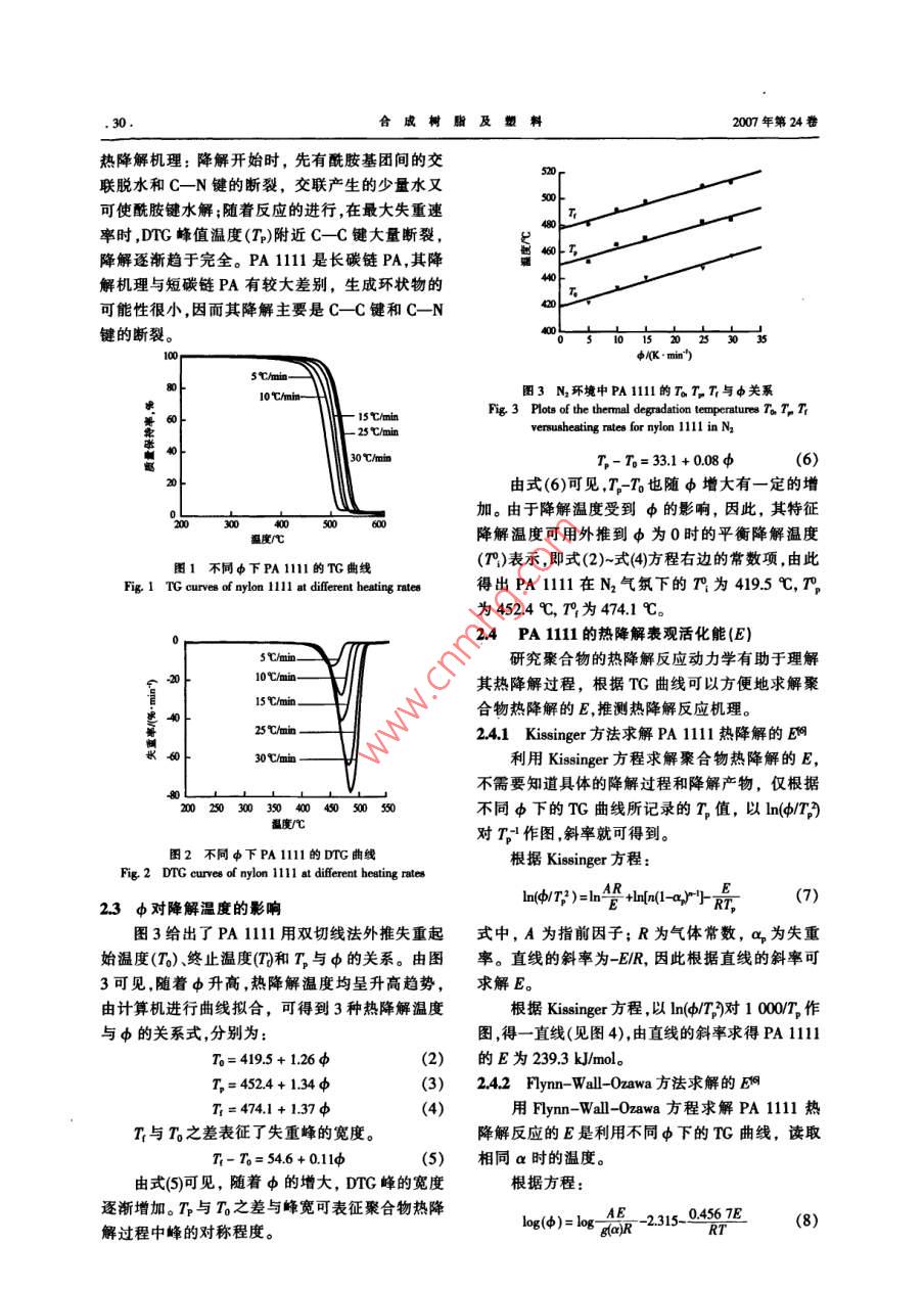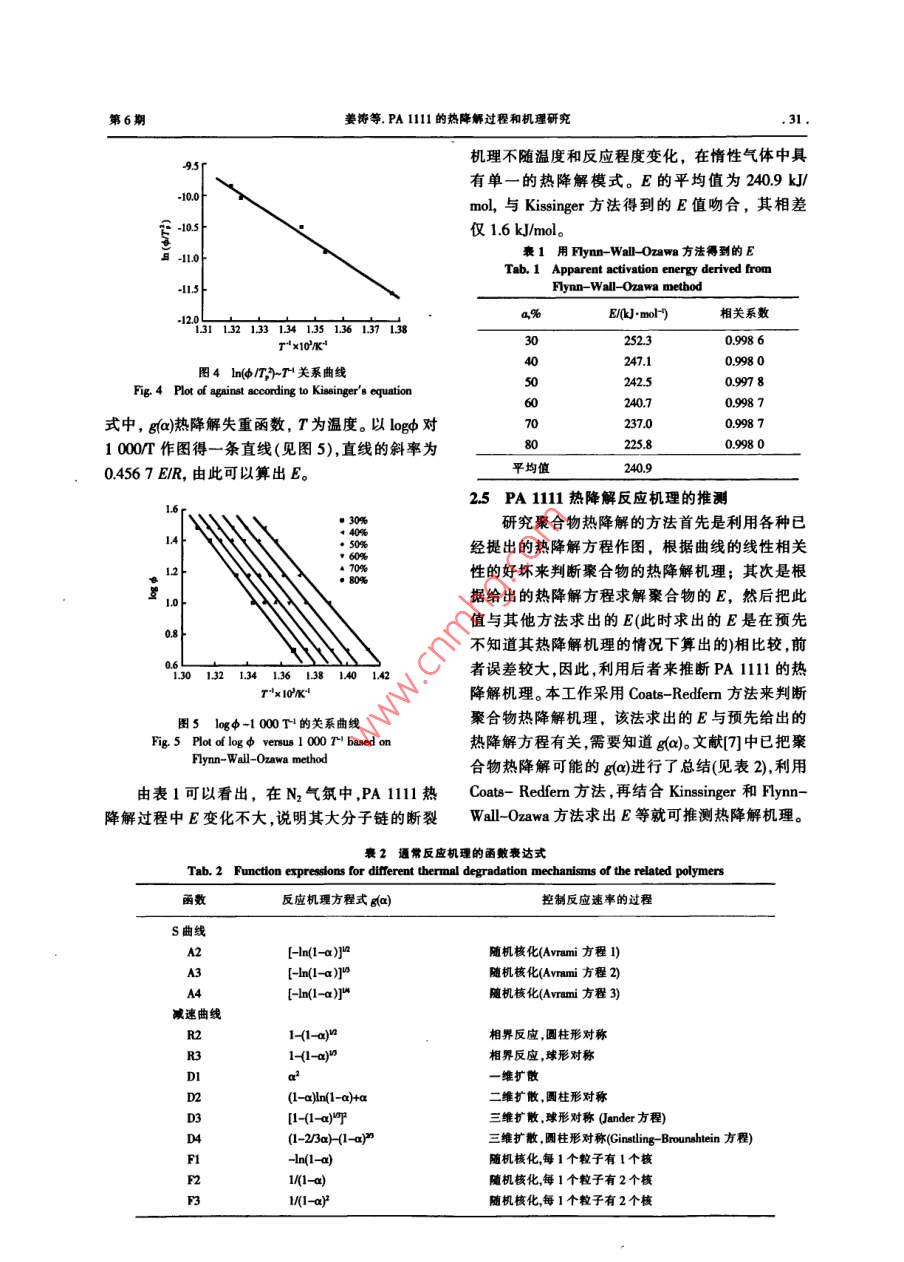 研究與開發(fā)合成樹脂及塑料,200,24(6):29CHINA SYNTHETIC RESIN AND PLASTICSPA1111的熱降解過程和機理研究姜濤聶雷劉民英王玉東羅楠黃正強趙清香(鄭州大學(xué)材料科學(xué)與工程學(xué)院,河南鄭州,450052)要:通過熱重分析研究了聚酰胺(PA)11在N2氣氛中以不同升溫速率時的熱降解過程和機理。PA11l的熱降解實驗表明,PA111的熱降解是一步過程熱降解溫度為4195℃用 Kissinger和lynn- Wall-ozawa方法求得PA1l1l的熱降解表觀活化能分別為2393kJmd和2409 k/mol。用 Coats- Redfern方法證明了PAll1l的熱降解為減速機理關(guān)鍵詞:聚酰胺l11l熱降解活化能降解機理中圖分類號:TQ323.6文獻標識碼:B文章編號:1002-1396(2000)06002904鄭州大學(xué)工程塑料實驗室在成功開發(fā)聚酰胺溫度的變化。所有實驗均在N2氣氛下進行,N2流(PA)1111的基礎(chǔ)上,又開展了用生物發(fā)酵的十量為40 ml/min。碳二元酸合成PA111的研究工作。以生物發(fā)酵法得到的十一碳二元酸為原料在工業(yè)設(shè)備上2結(jié)果與討論經(jīng)過腈化胺化、中和及聚合合成了PA111,其2.1動力學(xué)分析的基本假定化學(xué)結(jié)構(gòu)式為H[HN(CH2) uNCO(CH2)COl為了研究PA1111的熱降解過程及動力學(xué),OH。與PA66,PA1010相比,PA11l具有相對首先對其裂解過程做假定岡。假定PA11l1在熱密度小,熔點低,強度高,韌性好,尺寸穩(wěn)定性好,裂解過程中遵從下列簡單模式:耐化學(xué)藥品腐蝕性好,吸水率低等優(yōu)異性能,而且Aa→B。+Ct↑(1)在很多性能上與進口產(chǎn)品PA11叫和PA12接近式中,A表示裂解前聚合物固體;Ba表示裂甚至更優(yōu),因此在很多應(yīng)用領(lǐng)域都可代替PAl解后固體殘留物;C氣表示生成的逸出氣體。和PA12,但目前對其基礎(chǔ)研究尚未見報道。本工當對其進行動力學(xué)分析時,有2個基本假定:作用熱重分析(TG)對PA11的熱降解過程和(1)PA111l在熱降解過程中,沒有擴散障礙動力學(xué)進行了研究,這便于了解PA1111熱降解經(jīng)分解,氣體產(chǎn)物立即逸出;(2)PA1111的熱分機理及其影響因素,進而研究其穩(wěn)定方法,為加工解過程符合 Arrehnius方程和應(yīng)用提供理論依據(jù)。22熱降解過程由圖1和圖2可以看出,PA1111在3501實驗部分550℃的熱降解TG曲線和微分熱重分析(DTG)11試樣曲線基本上為平滑曲線,均為單峰,說明在N2氣PA1111對黏度為21,熔點為1821℃,氛中,PA110熱降解過程為一步反應(yīng),這與縮自制聚產(chǎn)物的熱降解均為無規(guī)斷鏈的機理相吻合參12儀器照PA66的熱降解機理,可大致說明PA1111的NETZSCH TG-209型熱重分析儀,德國Netsch公司生產(chǎn)。13實驗過程收稿日期:2007-05-28;修回日期:2007-07-15。將PA1111試樣置于80℃的真空烘箱中作者簡介:姜濤,1963年生,在讀博士研究生,主要從事高分子合成方面的研究。干燥24h取5-8mg試樣,在熱重分析儀中將試基金項目:河南省杰出人才創(chuàng)新基金資助項目(0521001300樣分別以5,10,15,25,30℃/min的升溫速率通訊聯(lián)系人聯(lián)系電話:15838198151: E-mail zhaoqingiangl(中)由室溫加熱到600℃左右,記錄試樣質(zhì)量隨@126c0m。合成樹脂及塑料2007年第24卷熱降解機理:降解開始時,先有酰胺基團間的交聯(lián)脫水和C一N鍵的斷裂,交聯(lián)產(chǎn)生的少量水又可使酰胺鍵水解;隨著反應(yīng)的進行,在最大失重速率時,DTG峰值溫度(TP)附近C_C鍵大量斷裂降解逐漸趨于完全。PA111l是長碳鏈PA,其降解機理與短碳鏈PA有較大差別,生成環(huán)狀物的可能性很小,因而其降解主要是C-C鍵和C-N鍵的斷裂。圖3N環(huán)境中PA111的T。TT與φ關(guān)系15chminFig 3 Plots of the thermal degradation temperatures T. T. Tr25C/min30/mT-T=31+0.08(6)由式(6)可見TT也隨ψ增大有一定的增加。由于降解溫度受到φ的影響,因此,其特征降解溫度可用外推到φ為0時的平衡降解溫度圖1不同φ下PA1的TG曲線()表示,即式(2)~式(4)方程右邊的常數(shù)項,由此Fig, 1 TG curves of nylon llll at different heating rates得出PA在N2氣氛下的n為495℃,7p為4524℃,T為4741℃。24PA111l的熱降解表觀活化能(E5℃hmin研究聚合物的熱降解反應(yīng)動力學(xué)有助于理解其熱降解過程,根據(jù)TG曲線可以方便地求解聚合物熱降解的E,推測熱降解反應(yīng)機理。25℃/min241 Kissinger方法求解PA111.熱降解的E利用 Kissinger方程求解聚合物熱降解的E,不需要知道具體的降解過程和降解產(chǎn)物,僅根據(jù)20025030035040046050050不同φ下的TG曲線所記錄的T值,以ln(4/TF溫度f℃對T作圖,斜率就可得到圖2不同中下PA1111的DG曲線根據(jù) Kissinger方程:Fig 2 DTG curves of nylon 1111 at different heating rates23φ對降解溫度的影響In(d/T:)=In AR+Inn(l-a, Rr (7)圖3給出了PA11|雙切線法外推失重起式中,A為指前因子;R為氣體常數(shù),av為失重始溫度(T)終止溫度(T和T與φ的關(guān)系。由圖率。直線的斜率為-E/R,因此根據(jù)直線的斜率可3可見,隨著φ升高,熱降解溫度均呈升高趨勢,求解E。由計算機進行曲線擬合,可得到3種熱降解溫度根據(jù) Kissinger方程,以lmφT)對10007作與φ的關(guān)系式,分別為:圖,得一直線(見圖4),由直線的斜率求得PA1111T=4195+1.26φ(2)的E為2393kJ/mol。T=4524+1.34φ(3)242Fymn-Wall0awa方法求解的T=474.1+1374用 Flynn-Wall-0awa方程求解PA111熱T與T0之差表征了失重峰的寬度。降解反應(yīng)的E是利用不同φ下的TG曲線,讀取T-T=546+011d5)相同a時的溫度由式(5)可見,隨著中的增大,DTG峰的寬度根據(jù)方程:逐漸增加。T與T之差與峰寬可表征聚合物熱降A(chǔ)E解過程中峰