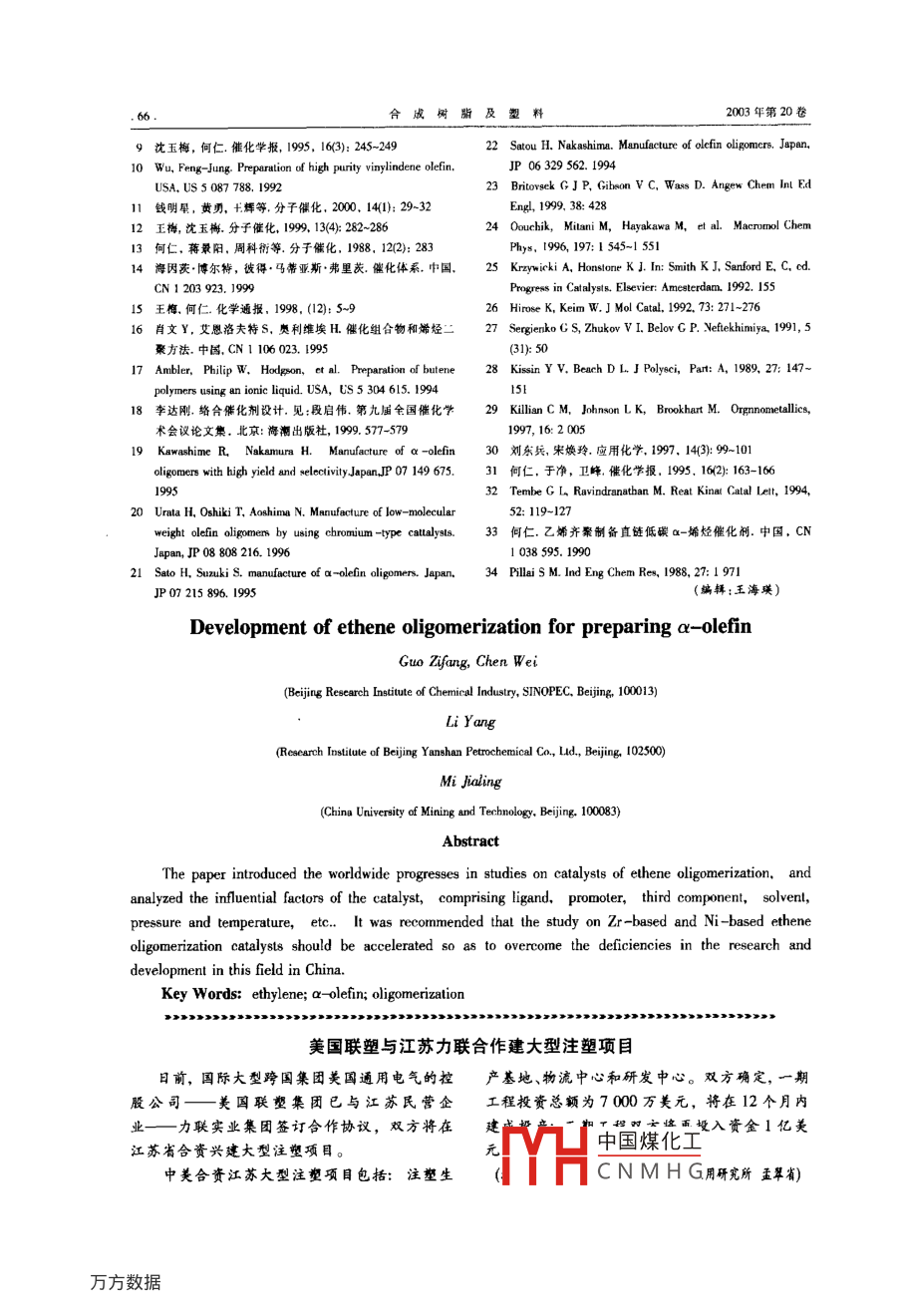 綜述成樹脂及塑料,2003,20(5):61CHINA SYNTHE TIC RESIN AND PLASTICS乙烯齊聚制備高級(jí)α-烯烴的研究新進(jìn)展郭子方陳偉(中國(guó)石油化工股份有限公司北京化工研究院,北京,100013)糜家鈴(中國(guó)石油化工股份有限公司北京燕山分公司研究院,北京,102500)(中國(guó)礦業(yè)大學(xué),北京,100083摘要:介紹了國(guó)內(nèi)外乙烯齊聚催化劑的研究進(jìn)展對(duì)乙烯齊聚催化體系的影響因素(配體、助化劑第組分、溶劑、壓力和溫度等)進(jìn)行了分析。針對(duì)我國(guó)乙烯齊聚研究的差距與不足,指出應(yīng)加快zr系及N系乙烯齊聚催化劑的研究關(guān)鵪詞:乙烯a-烯烴齊聚近年來,隨著烯烴工業(yè)和精細(xì)化工工業(yè)的發(fā)入成倍增加,各種類型的催化體系層出不窮,齊聚展,線型α-烯烴的需求迅速增加,發(fā)展成為一種技術(shù)也有了很大的發(fā)展?,F(xiàn)在已報(bào)道的催化體系重要的有機(jī)化工原料,其用途十分廣泛。通常,主要有:烷基鋁類系、zr系、N系Cr系FeG~C低碳線型α-烯烴可用作低密度聚乙烯系Co系、W系以及最近開始研究的離子液體等(LDPE)和線型低密度聚乙烯①LDPE)的共聚單體Cw以及部分C和Ca2可用以制備聚α-烯烴1乙烯齊聚制備a-烯烴催化劑的分類(PAO),用于生產(chǎn)航空、耐燃燒以及在惡劣環(huán)境下11烷基鋁類催化劑使用的高級(jí)潤(rùn)滑油;C~Cα-烯烴用于制備高烷基鋁催化乙烯齊聚制備線型高級(jí)α-烯烴級(jí)洗滌劑、表面活性劑、化妝品、合成調(diào)味品等;的技術(shù)是最早開發(fā)出來的乙烯齊聚技術(shù),也是迄C:及其以上的a-烯烴可直接或間接用于潤(rùn)滑油今為止工業(yè)生產(chǎn)a-烯烴的主要方法之添加劑及鉆井液、粘合劑密封劑和涂料等;同時(shí)用于催化乙烯齊聚的催化劑主要是三乙基線型a-烯烴還用于合成增塑劑、環(huán)氧化物、胺、直鋁,其催化理論主要是以 Ziegler發(fā)明的兒種反應(yīng)鏈硫醇、脂肪酸以及各類添加劑、低粘性合成油為基礎(chǔ)。烷基鋁催化劑催化乙烯聚合時(shí)因?yàn)榫酆蠗l件苛刻催化劑產(chǎn)率低、產(chǎn)品質(zhì)量不好,逐漸被a-烯烴的生產(chǎn)方法主要有烷烴脫氫法蠟裂新出現(xiàn)的催化劑所替代解法、萃取分離法以及乙烯齊聚法等。目前,工業(yè)12T系催化劑上主要采用乙烯齊聚法制備α-烯烴,烷烴脫氫和Ti系催化劑是研究最早的乙烯齊聚絡(luò)合催蠟裂解等其他方法均因收率低、成本高、產(chǎn)品質(zhì)化劑。該催化體系主要包括TORa、TiC4、Cp2TiCl2不好和工藝復(fù)雜等原因逐漸淡出。據(jù)統(tǒng)計(jì),等圍。其中,研究最多的為TiOR-AR3催化體2000年全球-烯烴生產(chǎn)能力為292Mua,其中275Mta均為乙烯齊聚法,約占總生產(chǎn)能力的收稿日期:2002-11-25修改稿收到日期:203-0626聚烯烴茂金屬催80年代以來,乙烯齊聚的研究愈來愈得到廣中國(guó)煤化工篇。聯(lián)系電話泛重視。各國(guó)在乙烯齊聚制備α烯烴上的科研投CNMHGniciac.cn合皮樹腳及塑料203年第20卷系,R為C1~C6的烷基,R為C1~C8的烷基或芳Ti系絡(luò)合催化劑的反應(yīng)條件大大優(yōu)于經(jīng)典基烷基鋁催化體系,但活性低,CCm烯烴選擇性不許多學(xué)者對(duì)T系催化劑的催化機(jī)理也進(jìn)行高。T系催化劑的開發(fā)使得乙烯齊聚催化劑的研了深入的研究,并提出了各種機(jī)理,其中尤以雙金究前進(jìn)了一大步。屬中心和環(huán)化機(jī)理得到了普遍認(rèn)可。1964年,13N系催化劑Cosee首先提出了這種雙金屬中心的機(jī)理N系催化劑具有活性高、反應(yīng)條件溫和,價(jià)Cose認(rèn)為,烷氧基橋聯(lián)的Ti-Al是乙烯二聚的格便宜等優(yōu)點(diǎn)。就直鏈α-烯烴含量、純度、產(chǎn)品活性中心,并認(rèn)為活性組分為八面體配合物。與催化劑的分離以及催化劑循環(huán)使用等方面來rodrnigerz、 Armstrong和 Novaro等人的進(jìn)一步理說鎳鰲合物催化劑體系都是優(yōu)秀的體系之一。論研究表明,齊聚的鏈增長(zhǎng)及B-H轉(zhuǎn)移均由Ti1.31Ni系催化劑體系的d軌道決定,并逐漸形成了其齊聚機(jī)理。自從 Shell公司開發(fā)鎳螯合物催化劑的殼牌1980年,Daa等人提出了環(huán)化機(jī)理,認(rèn)為在高級(jí)烯烴工藝過程(SHOP以來,大量的Ni系催乙烯齊聚的過程中2個(gè)烯烴分子與1個(gè)T原子化體系被開發(fā)出來,有零價(jià)N配合物,也有2價(jià)相偶合,形成環(huán)戊烷活性中間體。N配合物,其中典型的Ni系催化劑體系見表1。囊1N系乙齊聚催化荊Tab. I Ni-based ethene oligomerization catalysts催化體系反應(yīng)條件NiCl, 6H,O/NaBH,Ph2PCHCOOH HOCH2OH, 3.45 MPA,8%-20%C,31%C2300g/(gh75℃75min20%CxNiX NaBH/ Ph PCH CH, COOH/PPh, HO(CH-OH, 4.05 MPA.41%C·40.5%C1000g(g-h)185%C孟C】,6 HO/NaBH/鄰二苯基膦酸二甲基乙酰胺,4,7MPa67%C…,95%-100%a-烯烴轉(zhuǎn)化率為81%一線型率為100%NCOD》(H1PH七氟丁酸戊醇,482MPa1860g/(gh)NCOD/PCHC0H或HO(CH2OH, 5.0 MPNi(CODHRP(OR)CHCOCH,97%G轉(zhuǎn)化率為80%R為烷基Ni(COD2或Ni烷基》9-羧基芳族溶劑996%線型α-烯烴6 000 mol/mol甲基-9膦釀-二環(huán)(3,3,1)壬烷Ph(PPh,)Ni[Ph- PCHC(Ph)oJ甲苯,50MPa75℃98%α-烯烴線型率為99Ni(COD)Ph2_ COOH98%-99%C3芳族溶劑91%-烯烴000ggPh2PC( So, NajC(Ph)OyCH)A極性溶劑,148MPa50℃Al/Ni為200,(OCHn為0,1,2(R'RRORNIZRRC(R) C(R) M] CHOH/H2 0. 20-100C,48%C452%CnR-為HCa烷基,Cn芳基007-207MPa擇性為909M為S0;Z為 PAsSbNi(Ⅱy有機(jī)酸環(huán)丁鍋NaBH4環(huán)丁砜,655MPa,80℃大于17000g/