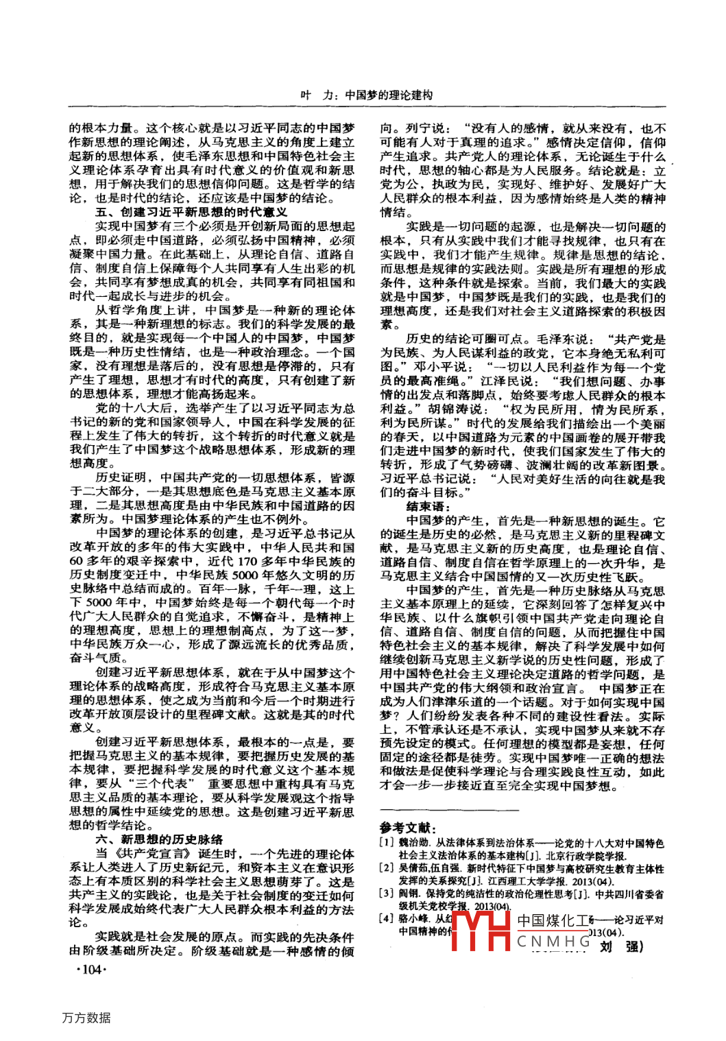 云南行政學院學報014年第6期中國夢的理論建構葉力(中共云南省委黨校哲學教研部,云南昆明,650111)搞要:中國夢的產生,是一種思想體系的理論高度,反映著社會變化的歷史必然趨向,是對一個關乎黨和國家命運問題的深刻回答,是對中國特色社會主義道路從馬克思主義基本屬性上的定型化,是全面建設小康社會的理論自覺和實踐自信。關鍵詞:中國夢;馬克思主義;鄧小平理論中圖分類號:D616文獻標識碼:A文章編號:1671-0681(2014)06-010203作者簡介:金雪花(1970-),女,中共江蘇省委黨校法政部教師,研究方向為憲法行政法,國際經濟法。引言:從三種意義上證明其發(fā)展的科學性,創(chuàng)建的合理在社會主義初級階段,有三種要素構成了一個性,科學的建設性。一是時代的意義,時代是每時代的思想內涵,一是改革開放的要素,二是市場歷史時期的哲學結論。二是歷史的意義,歷史是所經濟的要素,三是中國特色社會主義理論的要素。有時代的終結。三是哲學的意義,哲學是人類精神每一個歷史階段的發(fā)展過程,馬克思主義都要的反思,是檢驗思想正確與否的唯一標志。有一種新表述,形成一個階段的政治綱領,成為列寧說:“世界不會滿足人,人決心用自己的個時期的理想高度。在改革開放階段,馬克思主義行動改變世界,人給自己構成世界的客觀圖畫?!焙椭袊鴩橄嘟Y合,誕生了具有劃時代歷史意義的時代就是一種客觀圖畫,哲學是時代的顏色。鄧小平理論、“三個代表”重要思想和科學發(fā)展歷史是時代的結論。這個結論在于,歷史是一說°每一個時代的變遷,首先是理論的變化。理論成了鄧小平理論,解決了什么是社會主義、怎樣建切思想的結論。在社會主義初級階段,我們初步形是思想在認識上的屬性,是一個時代在方向上的坐設社會主義的問題。“三個代表”重要思想的形標,是一種具有歷史意義的意識形態(tài),它們都屬于成,解決了建設什么樣的黨、怎樣建設黨的問題。哲學的范疇??茖W發(fā)展觀的創(chuàng)建,則又解決了實現(xiàn)什么是發(fā)展中國夢是改革開放在中國特色社會主義初級階為什么要發(fā)展和怎樣發(fā)展的問題。一切思想體系的段全面建設小康社會和為實現(xiàn)二個一百年奮斗過程形成,總在從一種存在的問題中,解決一個時代性中形成的新的戰(zhàn)略思想,是馬克思主義與中國國情的問題,決定一個時代的歷史性方向,形成一種新相結合的又一次質的飛躍。的歷史格局。中國夢有其必然的邏輯性。它的邏輯起點就是現(xiàn)在,我們正從理論體系的哲學高度,圍繞中社會主義初級階段。習近平總書記說:“社會主義國夢創(chuàng)建新的思想體系,解決的是科學社會主義和初級階段是當代中國的最大國情,最大實際,不僅中國共產黨在歷史邏輯和思想邏輯上的辯證關系,在經濟總量低時要立足初級階段,而且在經濟總量解決的是如何把五千年的文明凝聚成正能量用于當提高后仍然要牢記初級階段;不僅在謀劃長遠發(fā)展今社會如何復興中華民族的歷史唯物主義和辯證唯時要立足初級階段,而且在日常工作中也要牢記初物主義的問題,把握的是社會主義如何科學發(fā)展,級階段?!背跫夒A段是中國夢的歷史起點,每一種中國共產黨如何科學發(fā)展的歷史性規(guī)律,從歷史的新思想體系的理論形成過程,立足點都源于一切理周期律上探索和諧社會在構建上的基本因素,從馬論形態(tài)在初級階段的歷史范疇。中國夢從思想屬性克思主義何以可能到重構馬克思主義的歷史邏輯上上的形成,是先前歷史過程的意義和當前歷史活動闡述了中國特色社會主義的基本方向,決定了中國的價值的高度統(tǒng)一和辯證關系。道路的發(fā)展方向。從實質上講,解決的是我們黨舉社會主義初級階段思想體系的哲學范障什么旗、走什么路、決定什么方向的問題哲學的范疇是歷史意義的表現(xiàn)。歷史是每一個有三個基本的事情是構成社會主義初級階段思時代的思想印痕。在社會主義初級階段,中國特色想體系的主要因素,也是社會主義初級階段在各個社會主義理論體系及價值觀是歷史的哲學范疇,它歷史時期的連接點。一是理論自信,它是所有行動中國煤化工收稿日期:20140604葉力,女,中共云南省委黨校哲學教研部酬教授CNMH葉力:中國夢的理論建構的指南。二是道路自信,它是實現(xiàn)中國夢的途徑。大問題,也都需要從戰(zhàn)略上拿出治本之策。”在十是制度自信,它是一切發(fā)展的根本保障,這三者八大之后,習近平總書記結合中國國情和時代特征是中國特色社會主義的基本立足點和歷史范疇,因發(fā)表了關于中國夢的重要論述,成為一種新的理論此形成經濟建設、政治建設、文化建設、黨的思想起點。建設、生態(tài)文明建設五位一體的格局和總依據(jù)、總中國夢的理論內涵有正能量、歷史周期律、最布局、總任務三個角度,構成中國特色社會主義在大公約數(shù)等要素,也有實現(xiàn)中國夢必須走中國道初級階段的理論體系。路、必須弘揚中國精神、必須凝聚中國力量等因馬克思主義從三大意識形態(tài)上解決了社會在發(fā)素,還有共同享有人生出彩的機會、共同享有夢想展中人類解放何以可能的問題,而這三種意識形成真的機會,共同享有同祖國和時代一起成長與進態(tài),一是自然的共同體,二是經濟的聯(lián)合體,三是步的機會等因素,從