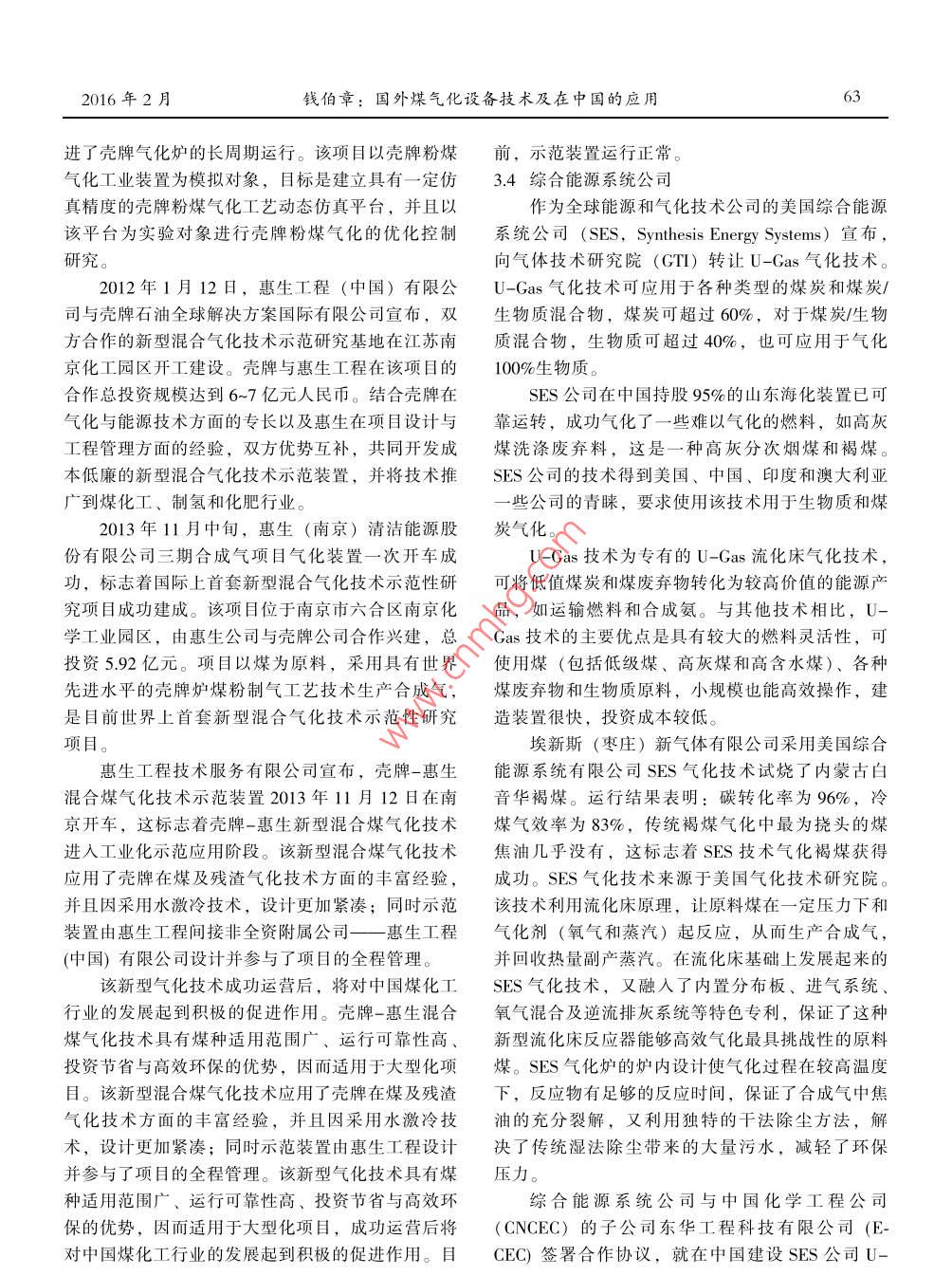 第37卷第1期2016年2月化工裝備技術(shù)57綜述國外煤氣化設(shè)備技術(shù)及在中國的應(yīng)用錢伯章"(上海擎督信息科技有限公司金秋能源石化工作室)摘要對幾種煤氣化爐爐型進(jìn)行了技術(shù)對比。論述了煤氣化技術(shù)的選用原則。分析了我國煤氣化技術(shù)裝備需要解決的一些問題。通過實(shí)例較詳細(xì)地介紹了國外煤氣化技術(shù)在中國的應(yīng)用關(guān)鍵詞煤氣化技術(shù)煤氣化爐粉煤水煤漿氣化溫度中圖分類號(hào)TQ54DOI:10.16759/j.cni.issn. 1007-7251.2016.02.017Overseas Coal Gasification Equipment Technology andIts Application in ChinaQian BozhangAbstract: The technical comparison between different types of the coal gasification furnaces is presented andthe selection principal of the coal gasification technology is discussed. Furthermore, the unsolved problems in thecoal gasification equipment of Chinese enterprises are analyzed. The applications of the overseas coal gasificationtechnology in China are introduced through case study.Key words: Coal gasification technology; Coal gasification furnace; Powdered coal; Coal water slury;Gasification temperature1煤氣化爐型的技術(shù)對比2氣化技術(shù)的選用原則煤化工的核心技術(shù)-煤氣化技術(shù)在我國呈現(xiàn)2.1 煤質(zhì)出巨大的市場需求。目前我國已成為世界上應(yīng)用煤雖然氣化方式很多,但是一-種氣化方式只適合氣化技術(shù)種類最多的國家,已應(yīng)用的(包括正在中某種特定的煤。反之,某一種煤的氣化只能采用特試的)煤氣化技術(shù)有GE氣化技術(shù)(原德士古氣化定的氣化方式。目前還沒有一種氣化方式可以通吃技術(shù))、多噴嘴水煤漿氣化技術(shù)、灰熔聚流化床氣各種煤。比如內(nèi)蒙古和新疆大都是褐煤。褐煤是一化技術(shù)、U-Gas煤氣化技術(shù)等18種之多。表1列種灰分較高的劣質(zhì)煤,水分含量一般為30%左右。出幾種煤氣化爐型進(jìn)行技術(shù)對比。如果采用氣流床氣化,要把這么高的水分干燥,再到2020年,我國對煤氣化爐的需求量將達(dá)到磨成很細(xì)的煤粉或者制成濃度不高的水煤漿,并且2250套。屆時(shí),我國將成為世界上最大的煤氣化氣化下渣口容易堵塞停產(chǎn),顯然不合算。如果選擇爐市場。而新型煤氣化裝備的研發(fā),提升了國內(nèi)煤加壓氣化的固定床魯奇爐就比較合算。比如新疆廣化工裝備制造水平,適應(yīng)了十分廣闊的國內(nèi)市場,匯能源有限公司120萬t甲醇項(xiàng)目氣化技術(shù)采用固大有可為。定床氣化,還有內(nèi)蒙古大唐克旗煤制天然氣氣化也*錢伯章,男,1939年生,教授級(jí)高工。上海市,200127。58化工裝備技術(shù)第37卷第1期表1幾種煤氣化爐型的技術(shù)對比項(xiàng)目殼牌GE(德士古)CSP恩德-段二段氣流床,液態(tài)流化床,固態(tài)排渣,固定床,固態(tài)排渣,固定床 ,固態(tài)排渣,氣化工藝氣流床排渣,渣C低渣C<10%渣C≥20%渣C<20%適用煤種褐煤,煙煤,煙煤(配比), 煙煤(配比),褐煤, 長焰煤,弱粘煤石油焦不粘煤進(jìn)料方式<80目<200目<10目>20 mm塊氣化壓力/MPa3.0常壓常壓.溫度/C .1400~ 16001300-1400 1400- 16001050 :氣化劑氧氧空氣, 富氧,純氧空氣單爐投料量(/(L.d4)20001000500~800180氧氣量/330~360380-430300~360180-2971000 m'(C0+H2)煤氣中C0+H2/%08646~7834~44對環(huán)境的影響較低.較低焦油,硫化物,粉塵焦油,硫化物,粉塵.氣化效率1%80~838069~76碳利用率1%99)6~97)8)1工業(yè)造氣適宜性量太大, 不宜量太大, 不宜量太大,不宜較適合.逐漸淘汰,廠內(nèi)用逐漸淘汰, 廠內(nèi)用投資對比高用固定床魯奇爐。系統(tǒng)投資。在我國一些地方,尤其是煤炭大省山西,無煙煤質(zhì)中硫元素對氣化工藝設(shè)備腐蝕非常嚴(yán)重。煤是主要煤種。然而,當(dāng)前無煙煤作為優(yōu)質(zhì)化工原新疆廣匯能源有限公司2011年氣化投料,固定床料的優(yōu)勢正在逐漸削弱。為了解決這一-問題, 企業(yè)魯奇爐氣化內(nèi)壁腐蝕,內(nèi)壁減薄,通過1年的時(shí)間應(yīng)該不斷研究適應(yīng)于無煙煤煤種的新型煤氣化技尋找解決腐蝕的技術(shù),最后通過鎳基焊條對氣化爐術(shù),開發(fā)適合無煙煤特性的其他現(xiàn)代氣化路線,延內(nèi)壁滿焊解決了腐蝕。由此可見,煤質(zhì)分析對氣化續(xù)無煙煤作為優(yōu)質(zhì)化工用煤的生命力,為煤化工產(chǎn)影響非常大,影響了項(xiàng)目早投產(chǎn)和公司經(jīng)濟(jì)效益。業(yè)發(fā)展提供強(qiáng)大的技術(shù)保障,開拓?zé)o煙煤潔凈利用2014年,內(nèi)蒙古大唐克旗煤制天然氣項(xiàng)目氣化投新途徑。如晉煤集團(tuán)為了適應(yīng)國家各項(xiàng)政策,積極料一個(gè)月就停車,最后查明原因,也和新疆廣匯公開展“適應(yīng)魯奇爐氣化特性的晉城無煙型煤的研究司發(fā)生的腐蝕一樣?;椿瘓F(tuán)本地煤資源豐富,但與開發(fā)”、“適應(yīng)晉城無煙洗粒煤固定床氣化技術(shù).其灰分達(dá)到27%~28%,灰熔點(diǎn)>1600 C,而GE工.研究與開發(fā)”、“晉城高硫無煙塊煤適應(yīng)常壓固定藝的氣化溫度為1300~ 1400 C,因此不得不改用河床氣化技術(shù)研究及工業(yè)試驗(yàn)”和“航天爐試燒晉城南義馬煤和甘肅華亭煤,致使生產(chǎn)成本增加,無法末煤工業(yè)示范試驗(yàn)”四個(gè)項(xiàng)目的技術(shù)研究,為解決將本地資源優(yōu)勢轉(zhuǎn)化成經(jīng)濟(jì)優(yōu)勢。這是我們要吸取集團(tuán)公司“三高”煤、洗粒煤