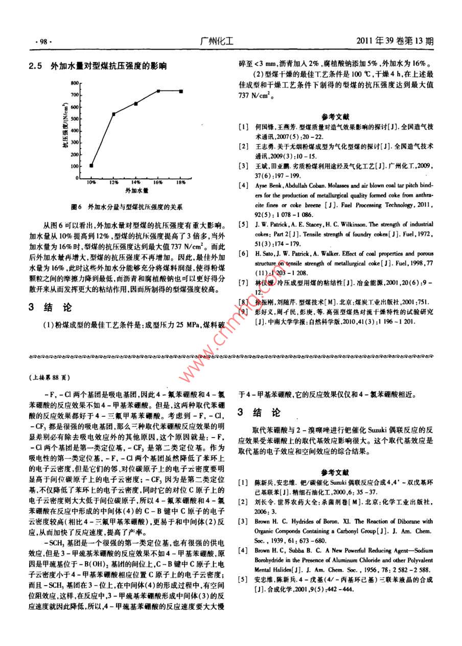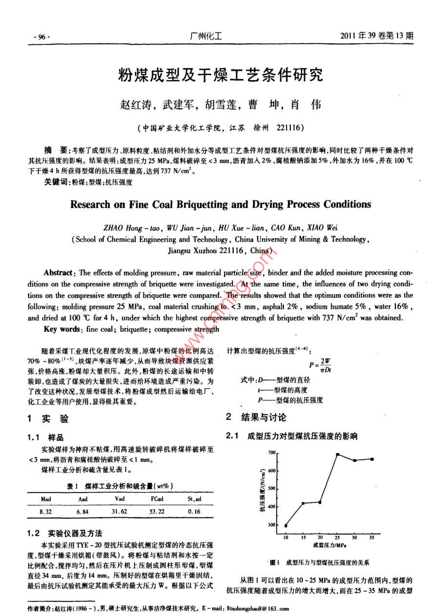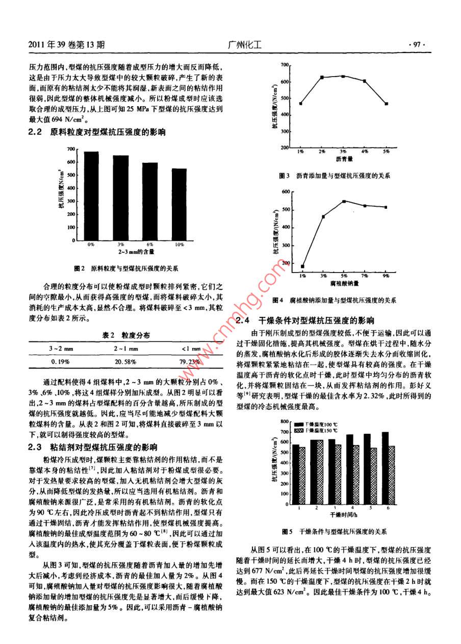 廠州化工2011年39卷第13期粉煤成型及干燥工藝條件研究趙紅濤,武建軍,胡雪蓮,曹坤,肖偉(中國礦業(yè)大學化工學院,江蘇徐州2216摘要:考察了成型壓力原料粒度粘結劑和外加水分等成型工藝條件對型煤抗壓強度的影響同時比較了兩種干燥條件對其抗壓強度的影響。結果表明:成型壓力25MPa,煤料破碎至<3mm,瀝青加入2%,腐植酸鈉添加5%,外加水為16%,并在100℃下干燥4h所獲得型煤的抗壓強度最高達到737Ncm2關鍵詞:粉煤;型煤;抗壓強度Research on Fine Coal Briquetting and Drying Process Conditionschool 2HAO Hong-tao, WU Jian-jun, HU Xue-lian, CAO Kun, XIAO WeiSchool of Chemical Engineering and Technology, China University of Mining TechnologyJiangsu Xuzhou 221116, China)Abstract The effects of molding pressure, raw material particle size, binder and the added moisture processing conditions on the compressive strength of briquette were investigated. At the same time, the influences of two drying condi-tions on the compressive strength of briquette were compared. The results showed that the optimum conditions were as tlfollowing: molding pressure 25 MPa, coal material crushing to <3 mm, asphalt 2%, sodium humate 5%, water 16%,and dried at 100 C for 4 h, under which the highest compressive strength of briquette with 737 N/cm" was obtainedKey words: fine coal; briquette; compressive strength隨著采煤T業(yè)現代化程度的發(fā)展,原煤中粉煤的比例高達計算出型煤的抗壓強度0%~80%-】,塊煤產率逐年減少,從而導致塊煤資源供應緊張價格高漲粉煤卻大量積壓。此外粉煤的長途運輸和中轉TDt裝卸,也造成了煤炭的大量損失,進而給環(huán)境造成嚴重污染。為式中:D—型煤的直徑了改變這種狀況,發(fā)展型煤技術,將粉煤成型然后運輸給電廠—型煤的高度化工企業(yè)等用戶使用,顯得極其重要。一型煤的抗壓強度1實驗2結果與討論1.1樣品21成型壓力對型煤抗壓強度的影響實驗煤樣為神府不粘煤,用高速旋轉破碎機將煤樣破碎至3mm,將瀝青和腐植酸鈉破碎至<1mm。煤樣工業(yè)分析和硫含量見表1。表1煤樣工業(yè)分析和硫含量(w%FCad8.326.8431.620.1612實驗儀器及方法本實驗采用TYE-20型抗壓試驗機測定型煤的冷態(tài)抗壓強成型壓力MPa度,型煤干燥采用烘箱(帶鼓風)。將粉煤與粘結劑和水按一定比例配合攪拌均勻,然后在壓片機上壓制成圓柱形型煤,型煤圖!成型壓力與型煤抗壓強度的關系直徑34mm,后度為14mm。壓制好的型煤在烘箱里干燥固結最后由抗壓試驗機測定其能承受的最大壓力W。根據以下公式從圖1可以看出在10~25MPa的成型壓力范圍內型煤的抗壓強度隨著成型壓力的增大而增大,而在25-35MPa的成型作者簡介:趙紅濤(1986-)男碩士研究生從事潔凈煤技術研究。E-mal:8taohongzhaod@163.com2011年39卷第13期廣州化工壓力范圍內,型煤的抗壓強度隨著成型壓力的增大而反而降低,這是由于壓力太大導致型煤中的較大顆粒破碎,產生了新的表面,而原有的粘結劑太少不能將其潤濕,新表面之間的粘結作用很弱,因此型煤的整體機械強度減小。所以粉煤成型時應該選取合理的成型壓力,從上圖可知25MPa下型煤的抗壓強度達到最大值694N/cm222原料粒度對型煤抗壓強度的影響瀝青量圖3瀝青添加量與型煤抗壓強度的關系Bz哪城2-3mm的含量圖2原料粒度與型煤抗壓強度的關系合理的粒度分布叮以使粉煤成型時顆粒排列緊密,它們之腐殖酸鈉量間的空隙最小,從而獲得高強度的型煤,而將煤料破碎太小,其圖4腐植酸鈉添加量與型煤抗壓強度的關系消耗的生產成本太高,顯然不合理。將煤料破碎至<3mm,其粒度分布如表2所示24干燥條件對型煤抗壓強度的影響表2粒度分布由于剛壓制成型的型煤強度較低,不便于運輸,因此可以通3~2mm過干燥固化措施,提高其機械強度。型煤在烘干過程中,隨水分的蒸發(fā)腐植酸鈉水化后形成的膠體逐漸失去水分而收縮固化,0.19%20.58%79.23%將煤顆粒緊緊地粘結在一起,使型煤具有較高的強度。在干燥溫度高于瀝青的軟化點時干燥,此時型煤中均勻分布的瀝青軟通過配料使得4組煤料中,2-3mm的大顆粒分別占0%3%、6%、10%將這4組煤樣分別加壓成型。從圖2明顯可以看等研究表明,型煤干燥的最佳含水率為232%,此時所得到的出2-3m的煤料占型煤配料的百分含量越高所壓制成的型型煤的冷態(tài)機械強度最高。煤的抗壓強度就越低。因此,應當盡叮能地減少型煤配料大顆粒煤料的含量。從表2和圖2可知將煤料直接破碎至3mm以下,就可以制得強度較高的型煤。F嫌溫度15023粘結荊對型煤抗壓強度的影響粉煤冷壓成型時煤顆粒主要靠粘結劑的作用粘結,而不是靠煤本身的粘結性,因此加入粘結劑對于粉煤成型很必要。對于發(fā)熱量要求較高的型煤,加入無機粘結劑會增大型煤的灰分,從而降低型煤的發(fā)熱量,所以應當選用有機粘結劑。瀝青和腐殖酸鈉來源很廣泛,是常采用的有機粘結劑。瀝青的軟化點為90℃左右,因此冷壓成型時瀝青起不到粘結作用,型煤只有干燥時間/h通過干燥固結瀝青才能發(fā)揮粘結作用,使型煤機械強度提高。腐植酸鈉的最佳成型溫度范圍為60~80℃,因此可以通過加圖5干燥條件與型煤抗壓強度的關系入該溫度內的熱水,使其充分覆蓋于煤粒表面便于粉煤顆粒成從圖5可以看出在100℃的干燥溫度下,型煤的抗壓強度從圖3可知型煤的抗壓強度隨著瀝青加入量的增加先增隨著干燥時間的延長而增大,干燥4h時,型煤的抗壓強度已經大后減小,考慮到經濟成本瀝青的最佳加入量為2%。從