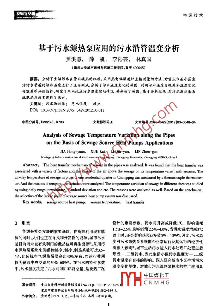 發(fā)電與空空調(diào)技術(shù)基于污水源熱泵應(yīng)用的污水沿管溫變分析賈洪愿,薛凱,李沁蕓,林真國(guó)(重慶大學(xué)城市建設(shè)與環(huán)境工程學(xué)院,重慶400045)摘要:分析了生活污水在管內(nèi)換熱的機(jī)理。采用熱電偶溫度計(jì)直接測(cè)量的方法,對(duì)重慶市某小區(qū)生活污水管道的污水溫度進(jìn)行了現(xiàn)場(chǎng)測(cè)試,分析了污水溫度變化的原因。利用污水溫度日較差和溫度變化標(biāo)準(zhǔn)差等評(píng)價(jià)指標(biāo),研究了不同地點(diǎn)污水溫度波動(dòng)情況,并分析了原因?;诜治鼋Y(jié)果,對(duì)污水源熱泵系統(tǒng)取水點(diǎn)設(shè)置進(jìn)行了探討。關(guān)鍵詞:污水源熱泵;污水溫度; 換熱DOI: 10.3969/J.ISSN.2095 -3429.2012.03.011中圖分類(lèi)號(hào):TM823.3, X703文獻(xiàn)標(biāo)識(shí)碼:B文章編號(hào):2095 -3429(2012)03 -0048 -04Analysis of Sewage Temperature Variation along the Pipeson the Basis of Sewage Source Heat Pumps ApplicationsJIA Hong- -yuan,XUE Kai, LI Qin- -yun,LIN Zhen- -guo(College of Urban Consnuetion & Entironme ntad Engineering, Chongqing Universiy, Chongying 400045 ,China)Abstract: The heat transfer mechanism of sewage in the pipes was analyzed. It was found that the heat transfer wasassociated with a variety of factors and the effects of the air above the sewage on its temperature varied with seasons. Theall-day temperature of sewage in pipes of one residential quarter in Chongqing was measured by a thermocouple thermome-ter. And the reasons of temperalure variation were analyzed. The temperature variation of sewage in different sites was studiedby using daily range temperature, standard deviation and etc. The reasons were analyzed as well. Based on the conclusion,the selection of the intake point of sewage source heat pump system was discussed.Key words: sewage souree heat pump; sewage temperature; heat transfer0引言設(shè)計(jì)的重要參數(shù)。污水每升高或降低1C.影響能耗,能源是社會(huì)發(fā)展的重要基礎(chǔ)。在高效利用現(xiàn)有能1.5%~2.5% ,影響投資2.5%~ 4.0% ,當(dāng)污水溫度增減3C源的同時(shí),人們也正在尋找和開(kāi)發(fā)新的能源。城市污水以上時(shí),還會(huì)影響熱泵COP值5% ~ 13%。因此.污水溫是目前尚未被有效利用的低品位可再生能源!"。采用污度對(duì)污水源熱泵系統(tǒng)能否正常運(yùn)行及其運(yùn)行的經(jīng)濟(jì)性水源熱泵系統(tǒng)來(lái)供暖和制冷,制冷、制熱系數(shù)可達(dá)3.5~有很大影響4。城市生活污水進(jìn)入污水處理廠處理過(guò)后4.4,比傳統(tǒng)空氣源熱泵要高出40%左右,而運(yùn)行費(fèi)用形成一、二級(jí)污水,因此生活小區(qū)污水溫度對(duì)一、二級(jí)僅為普通中央空調(diào)的50% -60%。在污水的特性參數(shù)污水溫度有直接的影響。深人研究城市小區(qū)生活污水中,污水溫度決定了污水可利用熱能總量,是換熱工況溫度變化規(guī)律,對(duì)城市污水源熱泵技術(shù)的推廣應(yīng)用具中國(guó)煤化工基金項(xiàng)目:重慶大學(xué)科研訓(xùn)練計(jì)劃項(xiàng) 目(No.CQU-SRTP- 2011692).MYHCNMHG重慶市建委科技資助項(xiàng)目(No.城科字2011第2-38號(hào))。作者簡(jiǎn)介:賈 洪愿(1989-),男,山東濟(jì)寧人,本科三年級(jí)在讀。n3201248 8第145用第3濤發(fā)電與空調(diào)空調(diào)技術(shù)Paerr Cratien & A Gelie有促進(jìn)作用。對(duì)流換熱弱。因此,在夏季,污水上方空氣對(duì)污水溫度就污水冷熱源的應(yīng)用而言,國(guó)內(nèi)外對(duì)污水溫度變的影響有限?;?guī)律有一定研究叫。如:戴通涌、劉安田、張素等對(duì)城而對(duì)于冬季則相反,污水管內(nèi)空氣與較熱的污水市污水的主要熱特性進(jìn)行了分析凹,周雙、康侍民對(duì)污換熱后,溫度高于室外空氣溫度,由于煙囪效應(yīng)的存水水溫與季節(jié)和地域關(guān)系開(kāi)展了分析向,廖吉香、劉興在,使得熱空氣沿管上升至污水檢查井,相應(yīng)的冷空氣業(yè)、馬慶艷等對(duì)污水熱能特征做了研究",錢(qián)劍鋒對(duì)污亦會(huì)進(jìn)人管道中,在地面與管道之間形成環(huán)形流動(dòng),如水熱能利用方式進(jìn)行了探討間。他們均采用一定的測(cè)量圖2所示??諝獾膶?duì)流作用加強(qiáng)了污水與上方空氣之間手段測(cè)試了城市一、二級(jí)污水管內(nèi)溫度、流量等全年變的換熱,促進(jìn)了污水的沿程降溫,這對(duì)于污水源熱泵在化情況,并分析得出了城市污水具有冬暖夏涼、受氣候冬季利用污水中的熱能不利。影響小的特征,但對(duì)污水沿管換熱過(guò)程及污水溫度變化的原因未作闡述。_4縱觀國(guó)內(nèi)外城市污水溫度變化研究現(xiàn)狀可以看出,目前大部分研究?jī)H著眼于城市一、二級(jí)污水,對(duì)城市小區(qū)生活污水溫度特性的研究甚少,且只針對(duì)污水溫度的季節(jié)和地域特征進(jìn)行探討,對(duì)污水溫度變化原因缺乏詳細(xì)分析。本文將針對(duì)城市生活小區(qū)污水溫度沿流程變化作初步探討。圖2冬季污水沿管換熱圖1-污水管2-污水管內(nèi)空氣 3-生活污水 4 室外空氣1污水沿管換熱過(guò)程5-室外地坪6-土壤 7-傾斜角污水在管道中為非滿管流流動(dòng),沿程埋管深度連2污水溫度 實(shí)測(cè)分析續(xù)變化,以保證污水在重力作用下順利流動(dòng)。污水管道材質(zhì)- -般為混凝土,在污水與周?chē)橘|(zhì)換熱分析中,其傳筆者對(duì)重慶市某生活小區