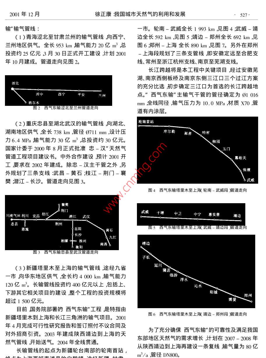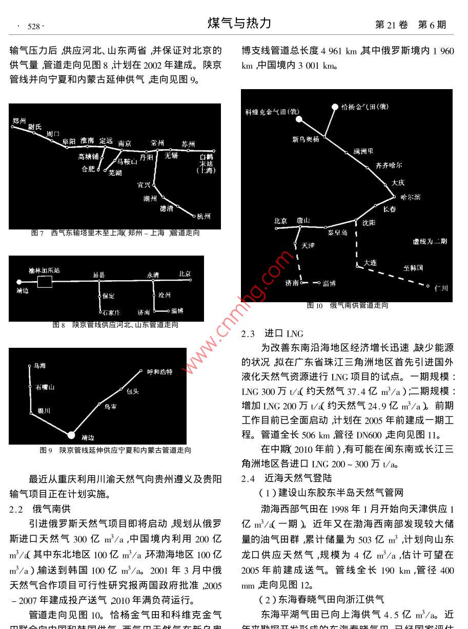 526煤氣與熱力第21卷第6期文章編號:1000-44162001)5-0526-04我國城市天然氣的利用和發(fā)展徐正康中國市政工程華北設(shè)計研究院天津300074)摘要根據(jù)全國夭然氣發(fā)展情況對我囯城市天然氣利用進行規(guī)劃和預(yù)測并展望城市利用天然氣的發(fā)展形勢關(guān)鍵詞天然氣利用覬劃預(yù)測中圖分類號:U996.5文獻標(biāo)識碼B1我國能源和城市燃氣的基本情況人工煤氣目前我國煤炭產(chǎn)量已居世界首位煤炭在一次90天然氣能源中占有很大的比重。近年來我國在能源結(jié)構(gòu)調(diào)整上花了很大的力量采取了很多措施使能源結(jié)構(gòu)初步得到改善由依賴煤炭的單一型結(jié)構(gòu)逐步形成/都20了以煤主多能互補的能源生產(chǎn)體系。我國一次能源消費結(jié)構(gòu)及預(yù)測見表1。91g2999697駙8"99表1一次能源消費結(jié)構(gòu)及預(yù)測%圖1我國城市燃氣供氣狀況圖石油天然氣水電核電1998年73.518.62全國城市利用天然氣規(guī)劃情況200年71.02.72.1015年2.1西氣東輸西氣東輸”"從廣義上講是將我國西部的大氣雖然煤炭在一次能源中的比例由原來的96%田即陜甘寧、四川、青海、新疆氣田蘊量豐富的天然已經(jīng)下降到目前的71.0%甚至在2015年可望調(diào)氣經(jīng)長輸管線輸送到需要天然氣能源的東部市場。整到60.9%但是以煤為主的能源格局不會有根到199年底西部地區(qū)累計探明的天然氣儲量已超本性的改變。過1.57萬億m3(其中川渝氣區(qū)5787億m3陜甘我國城市燃氣在20世紀80年代以前以發(fā)展人寧氣區(qū)3415億m3青海氣區(qū)1472億m3新疆氣區(qū)工煤氣為主80年代至90年代初期液化石油氣得5043億m3肼并且隨著天然氣勘探開發(fā)的進一步投到極快的發(fā)展到90年代末期之后天然氣有了更入天然氣探明資源逐年將會有較大的增長。大的發(fā)展。我國城市燃氣發(fā)展的狀況見圖1??梢?997年建成投產(chǎn)了陜京輸氣管線,管線全長看出次工煤氣的發(fā)展勢頭在減弱比例減少液化860km1999年的輸氣量為6.8億m3經(jīng)過在榆林石油氣目前仍占有主要的位置而城市燃氣中天然增建加氣站提高輸氣壓力后2000年底達到30億氣的比重將會有較大提高。m3的輸氣能力。近期內(nèi),計劃再建設(shè)三條西氣東2001年12月徐正康我國城市天然氣的利用和發(fā)展527輸”輸氣管線市。輪南-武威全長1993km見圖4武威-靖1)青海澀北至甘肅蘭州的輸氣管線向西寧、邊全長592km見圖5清邊-鄭州全長692km,見蘭州地區(qū)供氣。全長953km輸氣能力20億m3總圖6鄭州-上海全長890km見圖7。另外在鄭州投資約25億元3月30日正式開工建設(shè)計劃2001-上海段規(guī)劃了三條支管線即安徽定遠至合肥支年10月建成。管道走向見圖2。線、常州至浙江杭州支線、南京至蕪湖支線。長江跨越將是本工程中關(guān)鍵項目經(jīng)過安徽蕪湖、南京西側(cè)板橋及南京東側(cè)三江口三個過江方案的充分比選初步確定三江口為首選的長江跨越地點?!蔽鳉鈻|輸”主輸氣干管的管徑確定為φ1016m全線同徑輸氣壓力為10.0MPa材質(zhì)X70管道有內(nèi)涂層(2)重慶忠縣至湖北武漢的輸氣管線向湖北、輪南首站湖南地區(qū)供氣全長738km,管徑711m,設(shè)計壓庫爾勒善哈密力6.4MPa輸氣能力30億m3總投資約30億元國家計委于2000年8月正式批準(zhǔn)忠-漢”天然氣管道工程項目建議書。中外合作建設(shè)預(yù)計2001開嘉裕關(guān)工要求在2002年建成。除忠一漢主干管之外,另外規(guī)劃了三條支線:武昌-黃石技枝江-荊門-襄張掖樊潛江-長沙。管道走向見圖3圖4西氣東輸塔里木至上溆輪南-武威段蒼道走向荊門川渝氣H利川官昌寧癌安堡忠縣恩施黃石株州靖邊東輸忠縣至武漢管道走向子長3)新疆塔里木至上海的輸氣管線途經(jīng)九省市向華東地區(qū)供氣全長約4000km輸氣能力120億m3。長輸管線投資約400億元以上包括上、下游其它相關(guān)項目的建設(shè)整個工程的投資規(guī)模將陽城超過1500億元。博愛目前國務(wù)院部署的西氣東輸”工程是特指由新疆塔里木到上海和長江三角洲的輸氣項目。2001圖6西氣東輸塔里木至上溆靖邊-鄭州段簷道走向年4月完成可行性研究報告和簽訂照付不議合同及為了充分確保西氣東輸”的可靠性及滿足我國對外招面引。20年建成西請邊到上海的天東部地區(qū)天然氣的需求增長計劃在200-200年然氣管線開始送氣。2004年全線貫通長輸管線的起點為新疆輪臺南部的輪南首站,從陜西靖邊到上海再建設(shè)一條復(fù)線輸氣量為80億m3/a管徑DN800煤氣與熱力第21卷第6期輸氣壓力后供應(yīng)河北、山東兩省并保證對北京的博支線管道總長度4961km其中俄羅斯境內(nèi)1960供氣量,管道走向見圖8計劃在2002年建成。陜京km中國境內(nèi)3001kmo管線并向?qū)幭暮蛢?nèi)蒙古延伸供氣走向見圖9科維克金氣田〔餓)恰楊金田(俄)定遠南京常州蘇州新烏奧楊合肥蕘湖齊齊哈爾宜興長春抗州虛線為二期榆林加壓站至韓國淄博仁川石家濟南S淄博2.3進口LNG為改善東南沿海地區(qū)經(jīng)濟增長迅速缺少能源的狀況擬在廣東省珠江三角洲地區(qū)首先引進國外呼和浩特液化天然氣資源進行LNG項目的試點。一期規(guī)模石嘴山LNG300萬t(約天然氣37.4億m3/a)二期規(guī)模增加ING200萬t(約天然氣24.9億m3/a)前期工作目前已全面啟動計劃在2005年前建成一期工程。管道全長506km管徑DN600走向見圖11圖9陜京管線