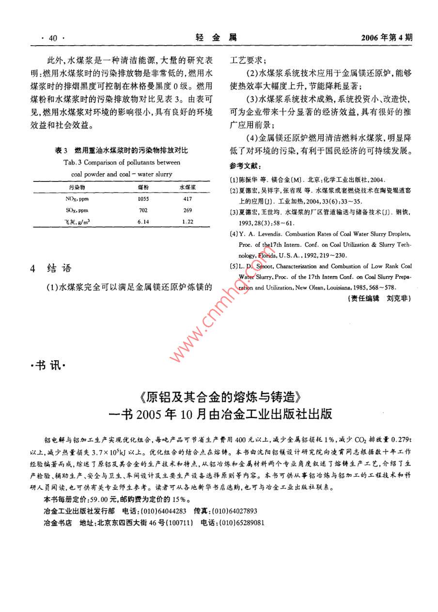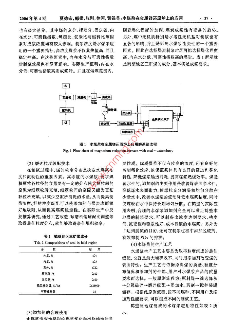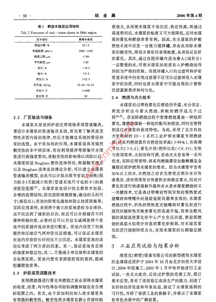 36輕金屬2006年第4期鎂鈦工業(yè)硅水煤漿在金屬鎂還原爐上的應(yīng)用夏德宏1,郭梁,張剛,徐河2,黃銀善(1.北京科技大學(xué),北京100083;2維恩克(鶴壁)鎂基有限公司,河南鶴壁458020)摘要;全屬鎂還原爐首次采用水煤漿親統(tǒng)技術(shù)進(jìn)行了工業(yè)應(yīng)用試驗(yàn),研發(fā)丁逶合然用水煤漿的鎂還原爐爐型。試驗(yàn)結(jié)果表明:然用水煤漿完全可以滿足金的工藝要求,并且還能大幅度提高生產(chǎn)率,顯著降低單位產(chǎn)品能耗。該親統(tǒng)技術(shù)的推廣應(yīng)用對(duì)金屬鎂生產(chǎn)企業(yè)具有良姸的經(jīng)濟(jì)效益和環(huán)保敦益關(guān)鍵詞:水煤漿;金屬鎂還原爐;燃燒;節(jié)能中圖分類(lèi)號(hào):TK803.13文獻(xiàn)標(biāo)識(shí)碼:A文章編號(hào):1002-1752(2006)04-0036-05The Application of Coal- Water Slurry inMagnesium Reduction FurnaceXIA De-hong, GUO Liang, ZHANG Gang, XU He, HUANG Yin-shan2(1. Univ. of Sci. and Tech. Beijing, Beijing 1000832. Winca( Hebi ) Magnesium Co. Ltd, Henan 458020)Abstract: Coal-Water Slurry(CwS)has been put into application in magnesium reduction furnace for the first time, The industr ial experiment on themagnesium reduction furnace is of a satisfactory success, and the reduction fumace which is fit for combustion of Cws has been turned up. The experi-nental results have proved that the complete technology of CwS preparation and combustion can meet the technical requirements of the magnesium re-ducing process in reduction fumace. Besides, the productivity is enhanced remarkably and the fumace can reach an ideal energy saving effect. The pop-ularization of this technology has a bright prospect for magnesium Co, both economically and environmentallyKeywords: Coal- Water Slurry(CWS), magnesium reduction furnace, combustion, energy-saving1前言2金屬鎂還原爐水煤漿應(yīng)用糸統(tǒng)技術(shù)鎂及鎂合金具有密度小,比強(qiáng)度、比剛度好,減振性、電磁屏蔽和抗輻射能力強(qiáng),易切削加工,易回水煤漿在金屬鎂還原爐上的應(yīng)用系統(tǒng)技術(shù)包括收等一系列優(yōu)點(diǎn),因而具有廣闊的應(yīng)用前景,是繼鋼水煤漿制備技術(shù)、廠區(qū)儲(chǔ)備與管道輸送、爐前漿質(zhì)調(diào)鐵和鋁合金之后發(fā)展起來(lái)的第三類(lèi)金屬結(jié)構(gòu)材料,整、還原爐內(nèi)的水煤漿燃燒與點(diǎn)火技術(shù)等圖1是該被稱為21世紀(jì)的綠色工程材料{。但是,鎂的冶煉系統(tǒng)的流程示意圖。工藝仍然相當(dāng)落后,不僅污染嚴(yán)重,而且能耗驚人。2.1水煤漿制備技術(shù)經(jīng)過(guò)深入分析和廣泛研究,得出造成這種局面的重高質(zhì)量的水煤漿要求濃度高、流變性好、穩(wěn)定期大原因之一是傳統(tǒng)金屬鎂還原爐大多數(shù)以原煤為燃長(zhǎng)。因此制備水煤漿需要嚴(yán)格的煤炭選擇、磨礦級(jí)料。因此,鎂的冶煉改燒經(jīng)濟(jì)型的煤基清潔燃料配技術(shù)、合適的添加劑及適當(dāng)?shù)闹茲{工藝。一水煤漿無(wú)疑是一條解決該問(wèn)題的良策。(1)煤炭選擇利用我國(guó)近年來(lái)研發(fā)的工業(yè)窯爐水煤漿應(yīng)用系由于煤的結(jié)構(gòu)極其復(fù)雜,煤中有機(jī)質(zhì)不是以一統(tǒng)技術(shù)2,在維恩克(鶴壁)鎂基有限公司的金屬鎂定的分子形式存在,而是以多樣復(fù)雜的高分子化合還原爐上首次進(jìn)行了水煤漿代煤工業(yè)應(yīng)用試驗(yàn),顯物的混合物形式存在,所以,不能客觀地確定其化學(xué)著提高了還原爐的熱效率,使金屬鎂冶煉過(guò)程的環(huán)結(jié)構(gòu)。煤種不同,即煤的體相、表面組成、表面形貌境污染問(wèn)題得到根本改善取得了可喜的成果。內(nèi)水含量、礦物質(zhì)種類(lèi)和含量等不同,制漿難易程度收稿日期:2005-12-302006年第4期夏德宏,郭梁張剛徐河,黃銀善:水煤漿在金屬鎂還原爐上的應(yīng)用37也有很大差異。其中煤的灰分、揮發(fā)分、固定碳、內(nèi)隨著煤化程度的加深,煤炭成漿性有變易的趨勢(shì)。在水分、可磨性指數(shù)、氧碳比、氫碳比與燃料比等因另外,煤中無(wú)機(jī)質(zhì)特別是水溶性無(wú)機(jī)鹽對(duì)制漿也有素對(duì)成漿濃度均有較大影響。制漿濃度是水煤漿應(yīng)顯著的影響,并且是影響水煤漿流變性的一個(gè)重要用的一個(gè)重要指標(biāo),高濃度煤漿不僅其熱值高,而且因素。因此在選擇煤炭制漿時(shí)盡可能選擇煤化程度穩(wěn)定性高。在這些因素中,內(nèi)在水分與可磨性指數(shù)高、內(nèi)在水分低、可磨性指數(shù)高的煤炭。表1所示就對(duì)制漿效果也有顯著影響。實(shí)際生產(chǎn)證明:內(nèi)在水是鶴壁地區(qū)三礦煤的成分,基本滿足成漿要求。分低、可磨性指數(shù)高則成漿好。并且在煙煤范圍內(nèi),}糖時(shí)士配料機(jī)攪拌「空壓機(jī)金屬還原爐是具圖1水煤漿在金屬鎂還原爐上應(yīng)用的系統(tǒng)流程Fig. l Flow sheet of magnesium reduction furnace with coal-waterslurry(2)磨礦粒度級(jí)配技術(shù)要性質(zhì)。優(yōu)質(zhì)煤漿不僅有較高的濃度,還有良好的在制漿過(guò)程中,煤的粒度分布是決定水煤漿濃剪切稀化效應(yīng),以保證漿體具有良好的泵送和霧化度和流動(dòng)性的重要因素。高濃度的水煤漿,要求煤特性,降低煤漿輸送能耗,提高煤漿燃燒效率。煤是粉顆粒各粒徑的含量要有一定的分布使大顆粒間的疏水性的,添加劑的主要作用是改善煤表面親水性,空
