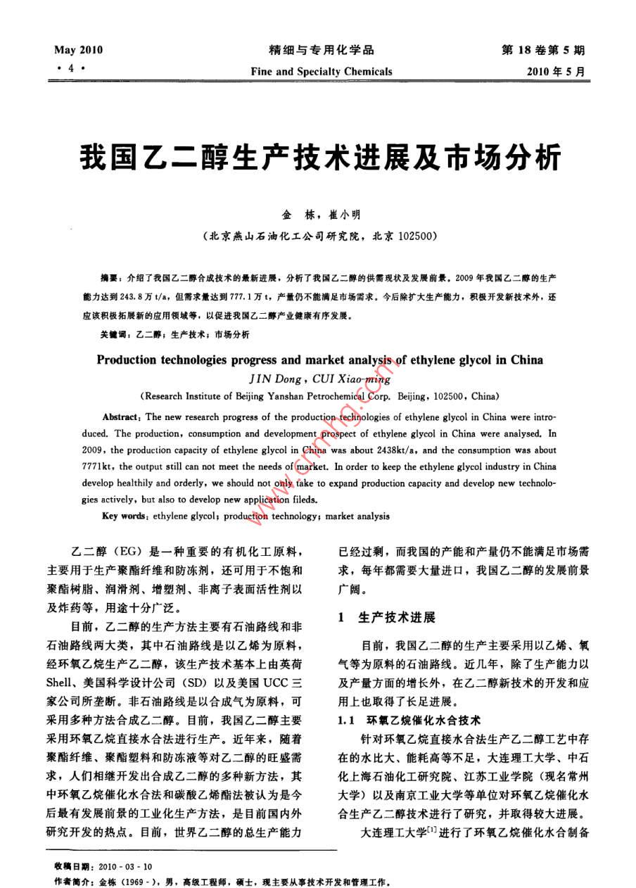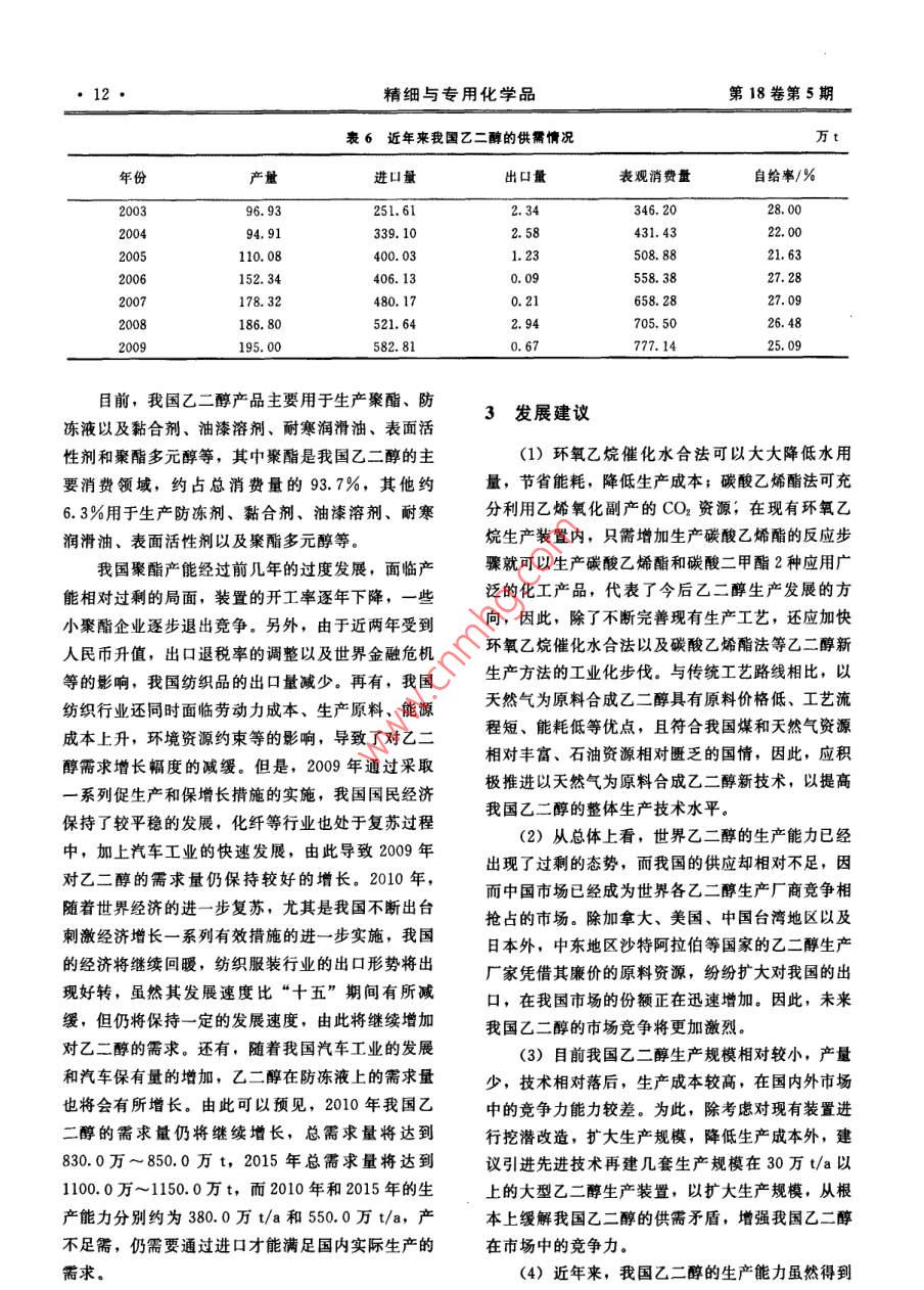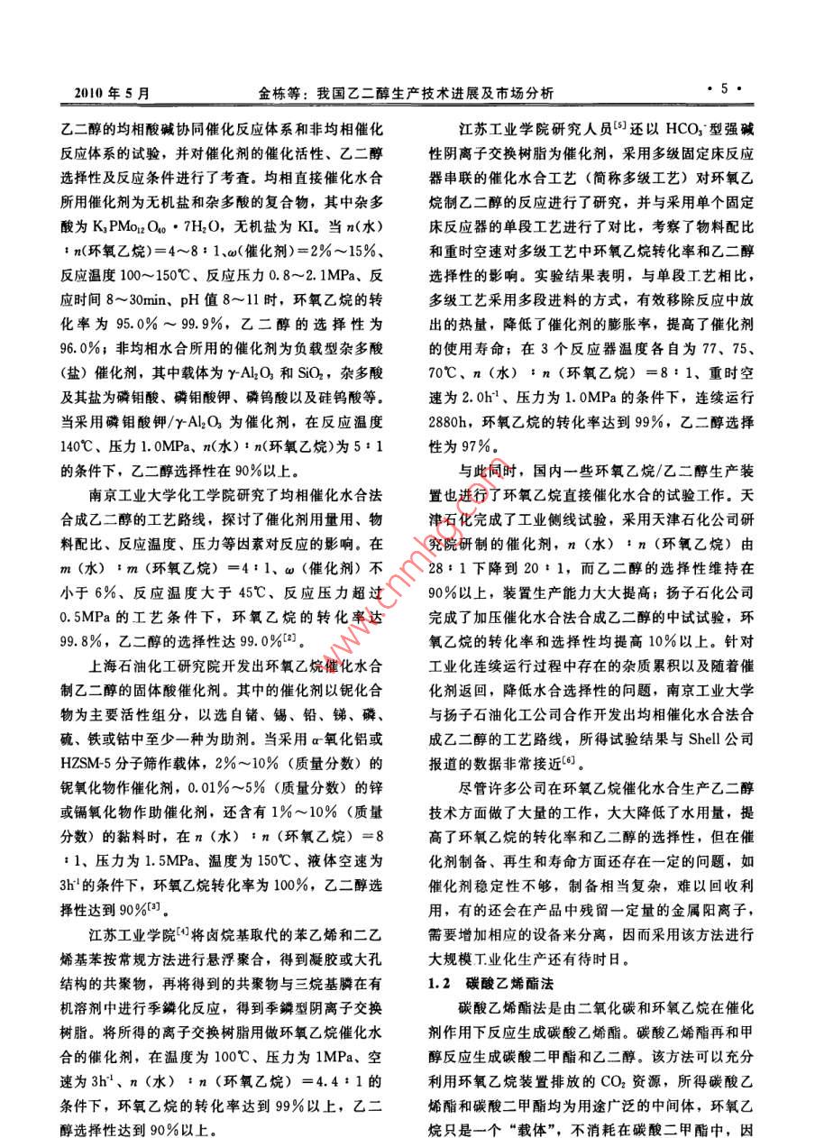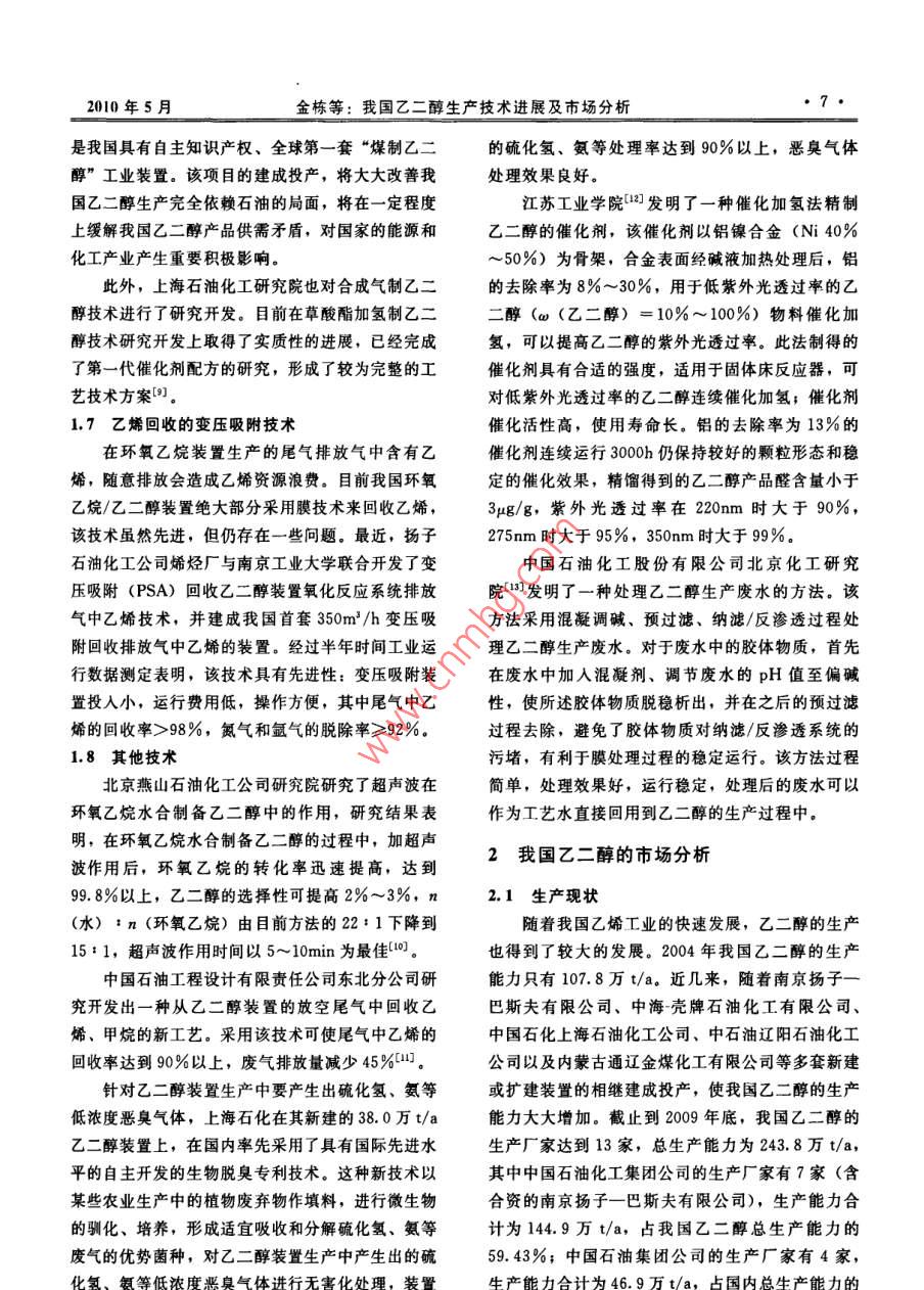 May 2010精細(xì)與專用化學(xué)品第18卷第5期4 Fine and Specialty Chemicals2010年5月我國乙二醇生產(chǎn)技術(shù)進(jìn)展及市場(chǎng)分析金棟,崔小明(北京燕山石油化工公司研究院,北京102500)摘要:介紹了我國乙二醇合成技術(shù)的最新進(jìn)展,分析了我國乙二醇的供需現(xiàn)狀及發(fā)展前景。2009年我國乙二醇的生產(chǎn)能力達(dá)到243.8萬t/a,但需求量達(dá)到777.1萬t,產(chǎn)量仍不能滿足市場(chǎng)需求今后除擴(kuò)大生產(chǎn)能力,積極開發(fā)新技術(shù)外,還應(yīng)該積極拓展新的應(yīng)用領(lǐng)域等,以促進(jìn)我國乙二醇產(chǎn)業(yè)健康有序發(fā)展。關(guān)鍵詞乙二醇;生產(chǎn)技術(shù);市場(chǎng)分析 Production technologies progress and market analysis of ethylene glycol in China JIN Dong, CUI Xiao-ming (Research Institute of Beijing Yanshan Petrochemical Corp. Beijing, 102500, China) Abstract: The new research progress of the production technologies of ethylene glycol in China were intro- duced. The production, consumption and development prospect of ethylene glycol in China were analysed. In 2009, the production capacity of ethylene glycol in China was about 2438kt/, and the consumption was about 7771kt, the output still can not meet the needs of market. In order to keep the ethylene glycol industry in China develop healthily and orderly, we should not only take to expand production capacity and develop new technolo- gies actively, but also to develop new application fileds. Key words: ethylene glycol, production technology; market analysis乙二醇(EG)是一種重要的有機(jī)化工原料,已經(jīng)過剩,而我國的產(chǎn)能和產(chǎn)量仍不能滿足市場(chǎng)需主要用于生產(chǎn)聚酯纖維和防凍劑,還可用于不飽和求,每年都需要大量進(jìn)口,我國乙二醇的發(fā)展前景聚酯樹脂、潤滑劑、增塑劑、非離子表面活性劑以廣闊。,,及炸藥等,用途十分廣泛。1生產(chǎn)技術(shù)進(jìn)展目前,乙二醇的生產(chǎn)方法主要有石油路線和非石油路線兩大類,其中石油路線是以乙烯為原料,目前,我國乙二醇的生產(chǎn)主要采用以乙烯、氧經(jīng)環(huán)氧乙烷生產(chǎn)乙二醇,該生產(chǎn)技術(shù)基本上由英荷氣等為原料的石油路線近幾年,除了生產(chǎn)能力以 Shell、美國科學(xué)設(shè)計(jì)公司(sd)以及美國uC三及產(chǎn)量方面的增長外,在乙二醇新技術(shù)的開發(fā)和應(yīng)家公司所壟斷。非石油路線是以合成氣為原料,可用上也取得了長足進(jìn)展。采用多種方法合成乙二醇。目前,我國乙二醇主要1.1環(huán)氧乙烷催化水合技術(shù)采用環(huán)氧乙烷直接水合法進(jìn)行生產(chǎn)。近年來,隨著針對(duì)環(huán)氧乙烷直接水合法生產(chǎn)乙二醇工藝中存聚酯纖維、聚酯塑料和防凍液等對(duì)乙二醇的旺盛需在的水比大、能耗高等不足,大連理工大學(xué)、中石求,人們相繼開發(fā)出合成乙二醇的多種新方法,其化上海石油化工研究院、江蘇工業(yè)學(xué)院(現(xiàn)名常州中環(huán)氧乙烷催化水合法和碳酸乙烯酯法被認(rèn)為是今大學(xué))以及南京工業(yè)大學(xué)等單位對(duì)環(huán)氧乙烷催化水后最有發(fā)展前景的工業(yè)化生產(chǎn)方法,是目前國內(nèi)外合生產(chǎn)乙二醇技術(shù)進(jìn)行了研究,并取得較大進(jìn)展。研究開發(fā)的熱點(diǎn)。目前,世界乙二醇的總生產(chǎn)能力大連理工大學(xué)進(jìn)行了環(huán)氧乙烷催化水合制備收稿日期:2010-03-1010作者簡介:金棟(1969-),男,高級(jí)工程師,碩士現(xiàn)主要從事技術(shù)開發(fā)和管理工作2010年5月金棟等:我國乙二醇生產(chǎn)技術(shù)進(jìn)展及市場(chǎng)分析5乙二醇的均相酸堿協(xié)同催化反應(yīng)體系和非均相催化江蘇工業(yè)學(xué)院研究人員還以HCO3型強(qiáng)堿反應(yīng)體系的試驗(yàn),并對(duì)催化劑的催化活性、乙二醇性陰離子交換樹脂為催化劑,采用多級(jí)固定床反應(yīng)選擇性及反應(yīng)條件進(jìn)行了考查。均相直接催化水合器串聯(lián)的催化水合工藝(簡稱多級(jí)工藝)對(duì)環(huán)氧乙所用催化劑為無機(jī)鹽和雜多酸的復(fù)合物,其中雜多烷制乙二醇的反應(yīng)進(jìn)行了研究,并與采用單個(gè)固定酸為KPMo2O4·7H2O,無機(jī)鹽為K當(dāng)n()床反應(yīng)器的單段工藝進(jìn)行了對(duì)比,考察了物料配比:n(環(huán)氧乙烷)=4~8:1、w(催化劑)=2%~1%、和重時(shí)空速對(duì)多級(jí)工藝中環(huán)氧乙烷轉(zhuǎn)化率和乙二醇反應(yīng)溫度100~150℃、反應(yīng)壓力0.8~2.1MPa、反選擇性的影響。實(shí)驗(yàn)結(jié)果表明,與單段工藝相比,應(yīng)時(shí)間8~30min、pH值8~1時(shí),環(huán)氧乙烷的轉(zhuǎn)多級(jí)工藝采用多段進(jìn)料的方式,有效移除反應(yīng)中放化率為95.0%~99.9%乙二醇的選擇性為出的熱量,降低了催化劑的膨脹率,提高了催化劑96.0%;非均相水合所用的催化劑為負(fù)載型雜多酸的使用壽命;在3個(gè)反應(yīng)器溫度各自為77、75、(鹽)催化劑,其中載體為yal2O和SO,雜多酸70℃、n(水):n(環(huán)氧乙烷)=8:1、重時(shí)空及其鹽為磷鉬酸、磷鉬酸鉀、磷鎢酸以及硅鎢酸等。速為2.0h、壓力為1.0MPa的條件下,連續(xù)運(yùn)行當(dāng)采用磷鉬酸鉀/yAl2O3為催化劑,在反應(yīng)溫度2880h,環(huán)氧乙烷的轉(zhuǎn)化率達(dá)到99%,乙二醇選擇140℃、壓力1.0MPa、n(水):n(環(huán)氧乙烷)為5:1性為97%的條件下,乙二醇選