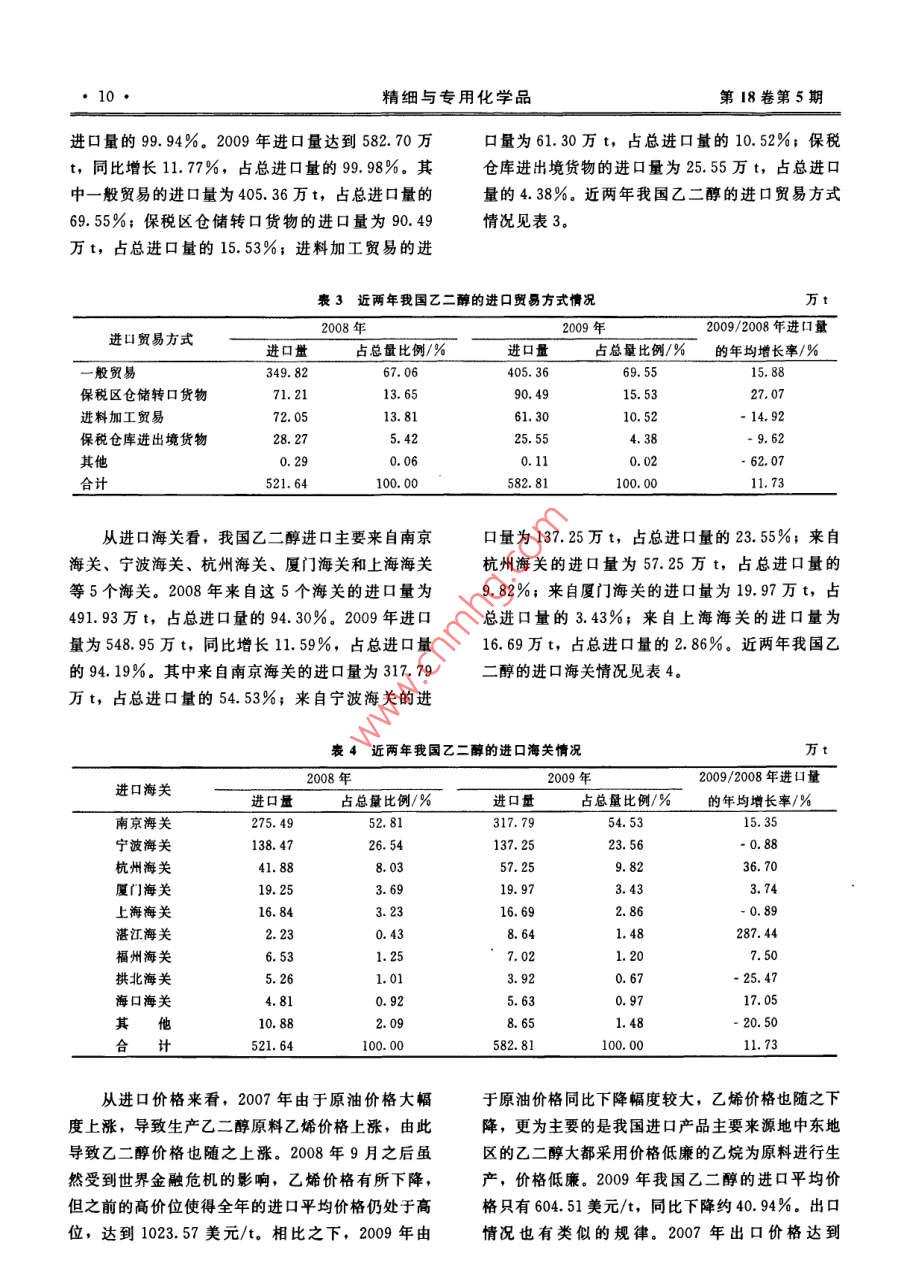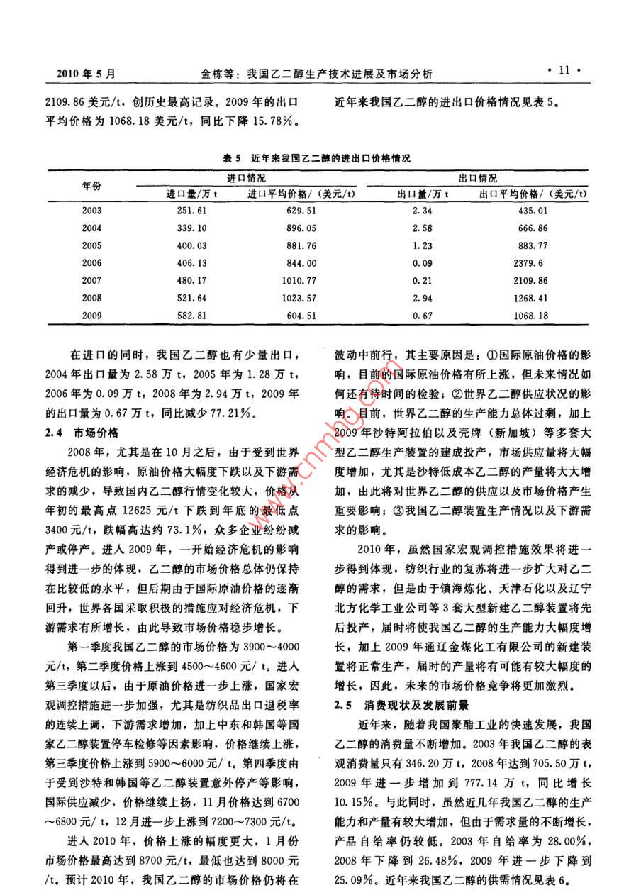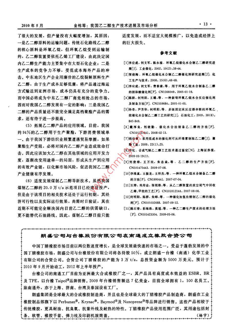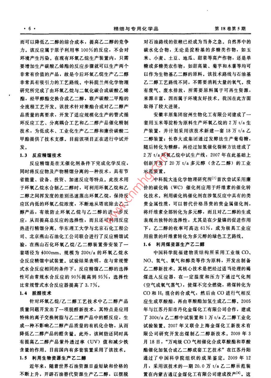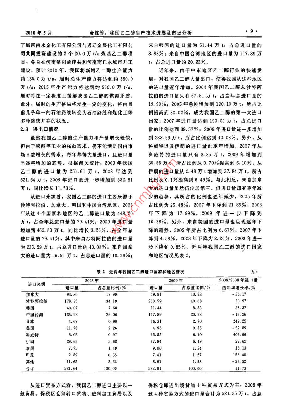 May 2010精細(xì)與專用化學(xué)品第18卷第5期4 Fine and Specialty Chemicals2010年5月我國乙二醇生產(chǎn)技術(shù)進(jìn)展及市場(chǎng)分析金棟,崔小明(北京燕山石油化工公司研究院,北京102500)摘要:介紹了我國乙二醇合成技術(shù)的最新進(jìn)展,分析了我國乙二醇的供需現(xiàn)狀及發(fā)展前景。2009年我國乙二醇的生產(chǎn)能力達(dá)到243.8萬t/a,但需求量達(dá)到777.1萬t,產(chǎn)量仍不能滿足市場(chǎng)需求今后除擴(kuò)大生產(chǎn)能力,積極開發(fā)新技術(shù)外,還應(yīng)該積極拓展新的應(yīng)用領(lǐng)域等,以促進(jìn)我國乙二醇產(chǎn)業(yè)健康有序發(fā)展。關(guān)鍵詞乙二醇;生產(chǎn)技術(shù);市場(chǎng)分析 Production technologies progress and market analysis of ethylene glycol in China JIN Dong, CUI Xiao-ming (Research Institute of Beijing Yanshan Petrochemical Corp. Beijing, 102500, China) Abstract: The new research progress of the production technologies of ethylene glycol in China were intro- duced. The production, consumption and development prospect of ethylene glycol in China were analysed. In 2009, the production capacity of ethylene glycol in China was about 2438kt/, and the consumption was about 7771kt, the output still can not meet the needs of market. In order to keep the ethylene glycol industry in China develop healthily and orderly, we should not only take to expand production capacity and develop new technolo- gies actively, but also to develop new application fileds. Key words: ethylene glycol, production technology; market analysis乙二醇(EG)是一種重要的有機(jī)化工原料,已經(jīng)過剩,而我國的產(chǎn)能和產(chǎn)量仍不能滿足市場(chǎng)需主要用于生產(chǎn)聚酯纖維和防凍劑,還可用于不飽和求,每年都需要大量進(jìn)口,我國乙二醇的發(fā)展前景聚酯樹脂、潤滑劑、增塑劑、非離子表面活性劑以廣闊。,,及炸藥等,用途十分廣泛。1生產(chǎn)技術(shù)進(jìn)展目前,乙二醇的生產(chǎn)方法主要有石油路線和非石油路線兩大類,其中石油路線是以乙烯為原料,目前,我國乙二醇的生產(chǎn)主要采用以乙烯、氧經(jīng)環(huán)氧乙烷生產(chǎn)乙二醇,該生產(chǎn)技術(shù)基本上由英荷氣等為原料的石油路線近幾年,除了生產(chǎn)能力以 Shell、美國科學(xué)設(shè)計(jì)公司(sd)以及美國uC三及產(chǎn)量方面的增長外,在乙二醇新技術(shù)的開發(fā)和應(yīng)家公司所壟斷。非石油路線是以合成氣為原料,可用上也取得了長足進(jìn)展。采用多種方法合成乙二醇。目前,我國乙二醇主要1.1環(huán)氧乙烷催化水合技術(shù)采用環(huán)氧乙烷直接水合法進(jìn)行生產(chǎn)。近年來,隨著針對(duì)環(huán)氧乙烷直接水合法生產(chǎn)乙二醇工藝中存聚酯纖維、聚酯塑料和防凍液等對(duì)乙二醇的旺盛需在的水比大、能耗高等不足,大連理工大學(xué)、中石求,人們相繼開發(fā)出合成乙二醇的多種新方法,其化上海石油化工研究院、江蘇工業(yè)學(xué)院(現(xiàn)名常州中環(huán)氧乙烷催化水合法和碳酸乙烯酯法被認(rèn)為是今大學(xué))以及南京工業(yè)大學(xué)等單位對(duì)環(huán)氧乙烷催化水后最有發(fā)展前景的工業(yè)化生產(chǎn)方法,是目前國內(nèi)外合生產(chǎn)乙二醇技術(shù)進(jìn)行了研究,并取得較大進(jìn)展。研究開發(fā)的熱點(diǎn)。目前,世界乙二醇的總生產(chǎn)能力大連理工大學(xué)進(jìn)行了環(huán)氧乙烷催化水合制備收稿日期:2010-03-1010作者簡介:金棟(1969-),男,高級(jí)工程師,碩士現(xiàn)主要從事技術(shù)開發(fā)和管理工作2010年5月金棟等:我國乙二醇生產(chǎn)技術(shù)進(jìn)展及市場(chǎng)分析5乙二醇的均相酸堿協(xié)同催化反應(yīng)體系和非均相催化江蘇工業(yè)學(xué)院研究人員還以HCO3型強(qiáng)堿反應(yīng)體系的試驗(yàn),并對(duì)催化劑的催化活性、乙二醇性陰離子交換樹脂為催化劑,采用多級(jí)固定床反應(yīng)選擇性及反應(yīng)條件進(jìn)行了考查。均相直接催化水合器串聯(lián)的催化水合工藝(簡稱多級(jí)工藝)對(duì)環(huán)氧乙所用催化劑為無機(jī)鹽和雜多酸的復(fù)合物,其中雜多烷制乙二醇的反應(yīng)進(jìn)行了研究,并與采用單個(gè)固定酸為KPMo2O4·7H2O,無機(jī)鹽為K當(dāng)n()床反應(yīng)器的單段工藝進(jìn)行了對(duì)比,考察了物料配比:n(環(huán)氧乙烷)=4~8:1、w(催化劑)=2%~1%、和重時(shí)空速對(duì)多級(jí)工藝中環(huán)氧乙烷轉(zhuǎn)化率和乙二醇反應(yīng)溫度100~150℃、反應(yīng)壓力0.8~2.1MPa、反選擇性的影響。實(shí)驗(yàn)結(jié)果表明,與單段工藝相比,應(yīng)時(shí)間8~30min、pH值8~1時(shí),環(huán)氧乙烷的轉(zhuǎn)多級(jí)工藝采用多段進(jìn)料的方式,有效移除反應(yīng)中放化率為95.0%~99.9%乙二醇的選擇性為出的熱量,降低了催化劑的膨脹率,提高了催化劑96.0%;非均相水合所用的催化劑為負(fù)載型雜多酸的使用壽命;在3個(gè)反應(yīng)器溫度各自為77、75、(鹽)催化劑,其中載體為yal2O和SO,雜多酸70℃、n(水):n(環(huán)氧乙烷)=8:1、重時(shí)空及其鹽為磷鉬酸、磷鉬酸鉀、磷鎢酸以及硅鎢酸等。速為2.0h、壓力為1.0MPa的條件下,連續(xù)運(yùn)行當(dāng)采用磷鉬酸鉀/yAl2O3為催化劑,在反應(yīng)溫度2880h,環(huán)氧乙烷的轉(zhuǎn)化率達(dá)到99%,乙二醇選擇140℃、壓力1.0MPa、n(水):n(環(huán)氧乙烷)為5:1性為97%的條件下,乙二醇選