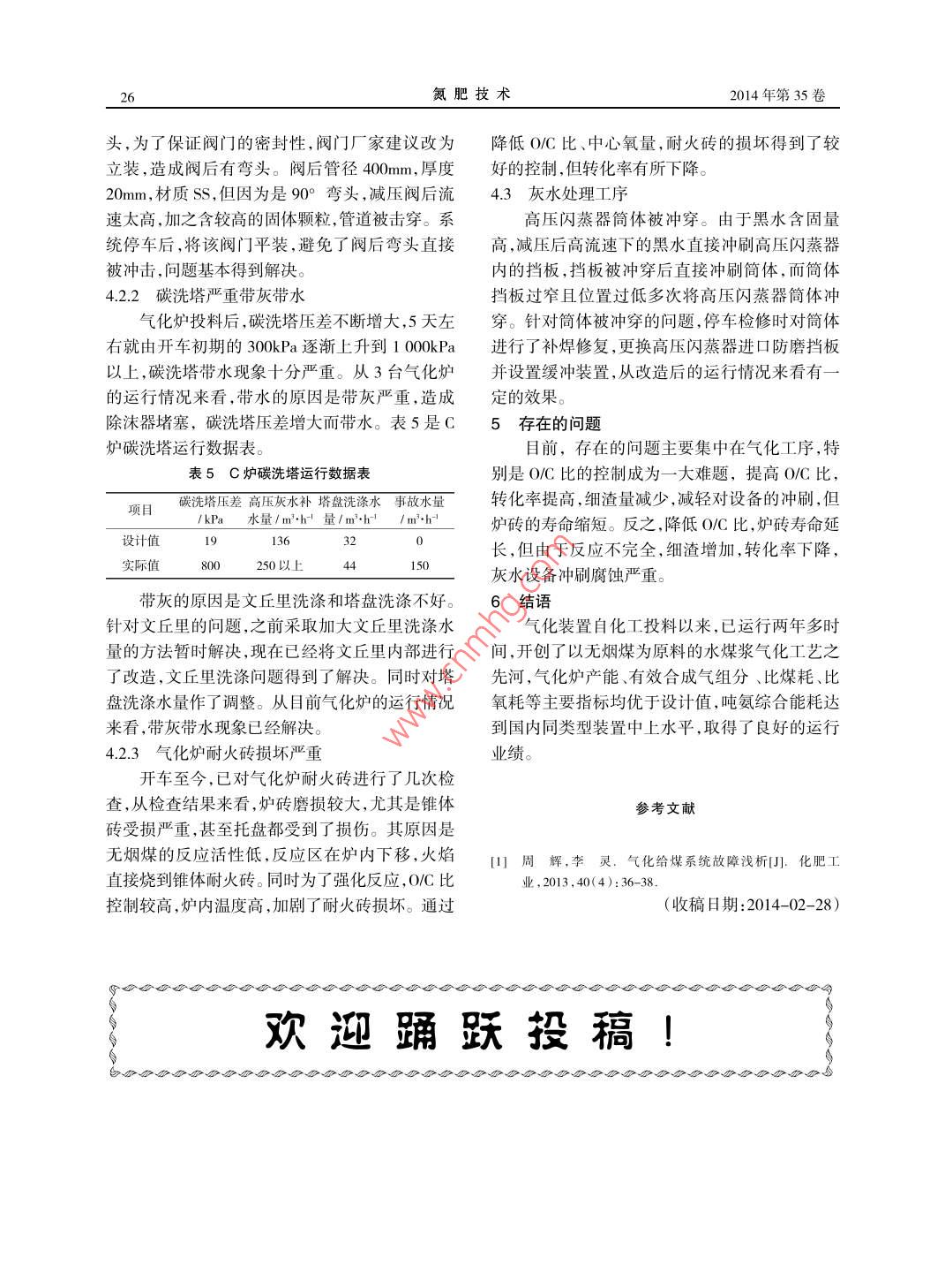 氮肥技術(shù)2014年第35卷第4期無(wú)煙煤在GE水煤漿氣化裝置的運(yùn)行總結(jié)胡云凱婁倫武(貴州金赤化工有限責(zé)任公司貴州桐梓563200),,,,,,,,,,,,,,,,,,,,,,,,,,,,,,.,,,。摘要介紹了貴州金赤化工有限責(zé)任公司桐梓煤化工一期工程于2007年8月開(kāi)工建設(shè),2011年12月28日生產(chǎn)出合格的精甲醇,2012年1月8日生產(chǎn)出合格的液氨,2012年1月10日生產(chǎn)出合格的尿素,實(shí)現(xiàn)一次開(kāi)車成功。通過(guò)對(duì)裝置原始開(kāi)車過(guò)程中岀現(xiàn)的問(wèn)題進(jìn)行分析,并對(duì)出現(xiàn)問(wèn)題進(jìn)行整改和優(yōu)化操作,達(dá)到了預(yù)期效果,為裝置的安全、穩(wěn)定、長(zhǎng)周期運(yùn)行提供了保障。關(guān)鍵詞無(wú)煙煤GE水煤漿氣化裝置運(yùn)Summary of in the ge coal water slurry gasification plantoperation anthraciteHu Yun-kai lou Lun -wu( Guizhou Jinchi Chemical Co, Ltd, Tongzi 563200, Guizhou ProvinceAbstract The paper introduces Guizhou Jinchi Chemical Company Limited Tongzi Coal Chemical project startedconstruction in August 2007, produced qualified refined methanol on December 28, 2011, produce qualified ammonia on January 8,2012, and produce qualified urea on January 10, 2012, achieving a successful operation. Through analysising problems in process ofinitial startup device, rectify problems and opand achieve desired effect, provide a guarantee for the security,stability, long period running device,Keywords anthracite; GE coal water slurry; gasification plant; operation貴州金赤化工有限責(zé)任公司桐梓煤化工(簡(jiǎn)士古燒嘴充分混合霧化后進(jìn)人氣化爐的燃燒室稱金赤化工)一期工程于2007年8月開(kāi)工建設(shè),在6.5MPa,約1200~1400℃條件下進(jìn)行氣化反2011年12月26日氣化爐化工投料,2011年12應(yīng),生成粗合成氣月28日生產(chǎn)出合格的精甲醇,2012年1月8日粗合成氣沿下降管和上升管的環(huán)隙上升,并經(jīng)生產(chǎn)出合格的液氨,2012年1月10日生產(chǎn)出合激冷室上部擋板折流后,由合成氣出口管線進(jìn)入文格的尿素。氣化裝置以無(wú)煙煤為原料,采用GE水丘里洗滌器。在文丘里洗滌器內(nèi)合成氣經(jīng)收縮管增煤漿氣化技術(shù)。該裝置配套3臺(tái)d3.2m、V=254m3速,在喉管內(nèi)與激冷水充分混合達(dá)到增濕的目的,使的等徑氣化爐,兩開(kāi)一備,分別配置三臺(tái)棒磨機(jī)細(xì)小熔渣與粗合成氣分離后進(jìn)入碳洗塔洗滌,出碳和三套渣水處理系統(tǒng),為30萬(wàn)t合成氨和30萬(wàn)t洗塔的水煤氣,流量:9984740Nm/h,壓力甲醇提供粗煤氣。6.20MPa,溫度:242℃,水氣比:1.461,各組分的1工藝流程簡(jiǎn)述體積分?jǐn)?shù)組成(干基):H234.79%,N0.60%來(lái)自煤漿槽質(zhì)量分?jǐn)?shù)為64%~70%的煤漿,CO49.03%,(HS+COS)0.81%,CO21.20%由高壓煤漿泵加壓(97MPa,124/h,50℃)后進(jìn)入CH0.20%,An0.15%,經(jīng)氣液分離器分離夾帶的水德士古燒嘴的內(nèi)環(huán)隙??辗盅b置來(lái)的體積分?jǐn)?shù)為分,再經(jīng)煤氣過(guò)濾器除去微量灰分及其它有毒物996%的氧氣(88MPa,72570Nmh,40℃)分兩質(zhì)后送變換工序。路進(jìn)入德士古燒嘴:一路直接進(jìn)入燒嘴外側(cè)環(huán)2煤質(zhì)特點(diǎn)隙,另一路進(jìn)入燒嘴中心管。水煤漿和氧氣經(jīng)德金赤化工以桐梓縣境內(nèi)的無(wú)煙煤為原料,具第4期胡云凱等:無(wú)煙煤在CE水煤漿氣化裝置的運(yùn)行總結(jié)有獨(dú)特的資源優(yōu)勢(shì)。桐梓無(wú)煙煤具有內(nèi)水含量表4比煤耗、比氧耗、碳轉(zhuǎn)化率低、成漿性能好、制漿濃度高的特點(diǎn),這可以大大設(shè)計(jì)實(shí)際提高氧化效率。但因礦點(diǎn)多,煤質(zhì)不穩(wěn)定,同時(shí)需比煤耗/kg(km)4有效氣5549要克服桐梓無(wú)煙煤高灰分、高硫含量、高灰熔點(diǎn)比氧耗/m3·(km3)有效氣低揮發(fā)分的困難。表1為經(jīng)洗選后的煤質(zhì)分析數(shù)據(jù)碳轉(zhuǎn)化率/%表1金赤化工煤質(zhì)分析數(shù)據(jù)(質(zhì)量分?jǐn)?shù)%)4原始開(kāi)車出現(xiàn)的問(wèn)題及解決措施4.1煤漿制備工序元素分析(干基)設(shè)計(jì)41.1磨煤系統(tǒng)運(yùn)轉(zhuǎn)不暢金赤化工使用的原料煤粒度細(xì),煤經(jīng)洗選裝碳?xì)涞蛐缆妊踔煤蠛州^高,造成輸煤系統(tǒng),尤其是磨煤機(jī)前煤倉(cāng)容易堵煤,無(wú)法下煤,致使磨煤機(jī)無(wú)法滿198負(fù)荷運(yùn)行。為了解決煤倉(cāng)堵煤的問(wèn)題,我們進(jìn)行了不斷0.020的探索和嘗試。首先在煤倉(cāng)倉(cāng)壁安裝空氣炮,用042MPa的空氣做沖擊介質(zhì),采取定時(shí)或人工手3氣化爐運(yùn)行參數(shù)及性能指標(biāo)動(dòng)的方式,用高速氣流沖擊原料煤,使其下落。加金赤化工通過(guò)對(duì)原料煤特性的研究,合理的空氣炮的方法取得了一定的效果,但始終沒(méi)有從確定助熔劑配比方案,確保了順暢的排渣和氣化根本上解決,尤其是來(lái)煤中水分偏高時(shí),效果就爐的連續(xù)運(yùn)行,氣化爐產(chǎn)能、有效合成氣成分、比不理想。最后,我們又嘗試在A套煤倉(cāng)內(nèi)安裝了煤耗、比氧耗等主要性能指標(biāo)均好于設(shè)計(jì)值。雖螺旋下料機(jī),但并沒(méi)有達(dá)到預(yù)想的效果,在運(yùn)行然助熔劑的添加使灰分有所増加,但無(wú)煙煤高含不久后其零部件脫落,反而造成煤倉(cāng)堵煤更加嚴(yán)碳量和良好的成漿性足以彌補(bǔ)這一缺點(diǎn)。表2、表重。3、表4為氣化爐主