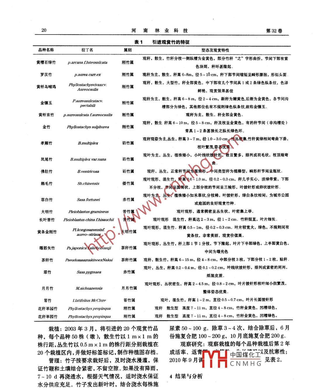 第32卷第1期.河南林業(yè)科技Vol. 32 No. 12012年3月Journal of Henan Forestry Science and TechnologyMar. 2012河南省觀賞竹引種試驗研究范定臣(河南省林業(yè)科學研究院,鄭州450008 )摘要: 通過對引進的20種觀賞竹觀察研究,孝順竹、鳳尾竹鵝毛竹在鄭州的適應性差,不易大范圍推廣;菲白竹、大明竹、長葉苦竹、黃條金剛竹在鄭州的適應性一般,推廣使用要注意采取保護措施,防止低溫造成損害,其余14種在鄭州的適應性較強,可以在園林綠化中使用,注意防止在極端低溫時采取保護措施,防止凍害關(guān)鍵詞:觀賞竹;引種;試驗;研究中國分類號: s 795.9文獻標識碼: A文章編號: 1003 -2630 (2012) 01-0019-03竹子,亭亭玉立,經(jīng)霜雪而不凋,歷四時而常經(jīng)113°30 ,北緯34°56",海拔102 m。土層深厚,茂,集堅貞、剛毅、挺拔、清幽于-身。自古以來除少量銹結(jié)石外,無其他石礫。土壤分布有砂土、人們不僅喜竹之外形,更愛竹之內(nèi)涵,把竹當作做立黃土、白面土等, pH值為8~8.5,氣候?qū)倥瘻貛说目?。竹子不僅是林業(yè)資源的組成部分,也是大陸性氣候,千旱少雨,年平均溫度14.9C,一月園林綠化的重要植物,尤其是觀賞竹,奇特的竿形.平均溫度1C,七月平均氣溫25.2C,極端溫度最多彩的竿色、婀娜的風姿,成為現(xiàn)代城市綠化的新低-11.0C,最高為40.5C, 年平均降雨量為645寵,正在不斷走入城市綠地。目前,河南的主要觀mm,年平均相對濕度74.6%賞竹品種有斑竹、桂竹、金竹、水竹、紫竹、箬竹等,滿足不了觀賞竹日益增長市場需求,該研究的2研究材料成功進行可豐富河南竹類資源,增加了物種的多樣性,增強了生態(tài)系統(tǒng)的穩(wěn)定性;彌補了我省城市綠通過調(diào)查觀賞竹品種分布及適生環(huán)境,結(jié)合研化中竹子品種單調(diào)的不足,增加景觀變化,豐富季究區(qū)域的地形、氣候、土壤條件,從適應性、可觀相色調(diào);觀賞竹的開發(fā)推廣,可以發(fā)揚和豐富中華性、色差對比、葉片稀密、籜形、節(jié)環(huán)等多項指標,竹文化,提高我省城市的品味,對構(gòu)建生態(tài)優(yōu)美、從各地引入觀賞竹20個品種。詳見表1。社會和諧的居住環(huán)境具有推動作用,同時觀賞竹市場奇缺,價格居高不下,開發(fā)前景廣闊,經(jīng)濟效益3研究方法也十分顯著。整園:在研究區(qū)域內(nèi),規(guī)劃一處約1 000 m2的1研究區(qū)域概況引種園,2003 年秋季,平整并深翻土地30 cm,并施入腐熟的廄肥2 000 kg和土壤消毒粉拌勻,晾曬該研究區(qū)位于鄭州市西北27 km處的黃河之一個冬季,規(guī)劃2^T節(jié)壓國煤化節(jié)為80 mx濱,黃河中下游的交匯處,黃土高原的末端的背風45mx12m的YHCNM H個區(qū)域種植向陽的山坳內(nèi),四周有泡桐、側(cè)柏、毛白楊等高大的竹子不得交錯h。n水管,保證喬木包圍,背風向陽,小氣候優(yōu)越。地理坐標為東能及時澆灌。收稿日期: 2011-03-05河南林業(yè)科技第32卷表1引進觀賞竹的特征品種名稱拉丁名屬別型態(tài)及觀賞特性黃槽石綠竹p.arcana fluteasnlcata剛竹屬觀稈,散生,竹稈分枝-側(cè)縱槽為金黃色, 部分竹稈“之”字形曲折,節(jié)間下部有紫色塊斑,稈環(huán)甚隆起.羅漢竹p.aurea car.ex剛竹屬觀稈為主, 散生,稈高6-8m,徑5- 10 cm,稈下部節(jié)間縮短呈畸形膨脹,形似頭面.黃桿烏哺雞Phyllostachysvivaxcv.觀稈,散生,大型竹,稈全部黃色,中下部有幾個節(jié)間具1或2條綠色縱條紋,色澤Aureocaulis鮮艷,觀賞效果甚佳觀稈為主,散生,稈高6-8m,徑2-4 cm,新稈為嫩黃色,后漸為金黃色,各節(jié)間溝金鑲玉Paureosulcatacv.pectabili槽部分為綠色,其他部位也有不規(guī)則綠色縱條紋,故稱金鑲玉.黃桿京竹aureosulcata faureocaulis觀稈為主,散生。稈全部金黃色。金竹Phyllostachys sulphurea觀稈,散生稈高6-10m,徑5-8cm,稈及枝呈金黃色,有的稈節(jié)間(非溝槽處)常具1~2條甚狹長之縱長綠色環(huán)。孝順竹B.multiplex筋竹屬觀稈觀姿為主,叢生,稈高3-7 m,徑1.0- 8.0 cm,竹叢密集,竹稈黃綠相間彎曲下垂,枝葉繁茂,姿態(tài)優(yōu)美.觀葉為主,叢生,植株矮小,小葉線狀披針形,數(shù)目繁多,排列成羽毛狀,枝頂端彎鳳尾竹B.multiplex var.nana由。佛肚竹B.ventricosa觀稈,叢生,正常稈節(jié)間為圓簡形,中間類型稈為棍棒型,畸形稈節(jié)間墾瓶狀.觀葉觀形,混生竹,稈高0.6- 1.0m,徑0.2-0.3cm,稈幾乎實心,談綠帶紫,下部鵝毛竹Sh.chinensis倭竹屬不分枝,節(jié)間呈圓簡狀,上部分枝的節(jié)間呈三棱形,葉披針形或卵狀披針形.觀葉為主,叢生,植株矮小如禾草狀,分枝稀, 葉披針形。綠白條紋相間,為城市公園菲白竹Sasa fortunei赤竹屬或庭園的良好觀賞竹種。大明竹Pleioblastus gramineus苦竹屬觀葉觀形,通常稠密呈叢生狀,葉密集上舉。長葉苦竹Pleioblastus china thisauchi苦竹屬觀葉觀形混生竹, 稈高達2~3m,徑1-2cm.竹稈挺直,葉片細長。Pl.kongosanensisf.觀葉觀形,混生竹。稈高0.5- 1m,徑0.2-0.8 cm.葉片較寬大,綠色,不規(guī)則間有黃條金剛竹大明竹屬aureo- -striaus黃條紋,非常美麗,觀賞價值高。觀葉觀形,叢生竹,稈上部1節(jié)1分枝,節(jié)下隆起,葉片下半部綠色,上半部黃白色,曙筋矢竹Psjaponica t.akebonosui茶稈竹屬中間為曙光色茶稈竹PseudosasamakinoexNakai茶稈竹屬觀稈, 散生竹,稈高6-15m,徑4-8cm,中部分枝3枚,下部分枝1-2枚, 貼稈.翠竹Sasa pygmaea觀葉,叢生,稈高0.2-0.4m,徑0.1 ~0.2 cm,葉線狀披針形,排列成緊密的兩列,紙裝皮質(zhì)。觀葉觀形,叢狀密生,稈高2-4.5m,徑0.8- 2
