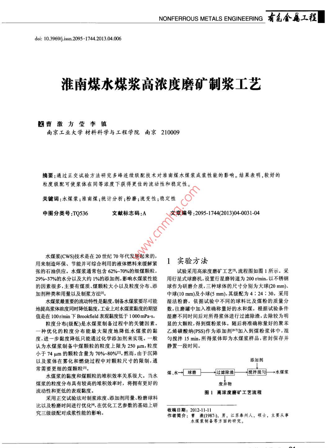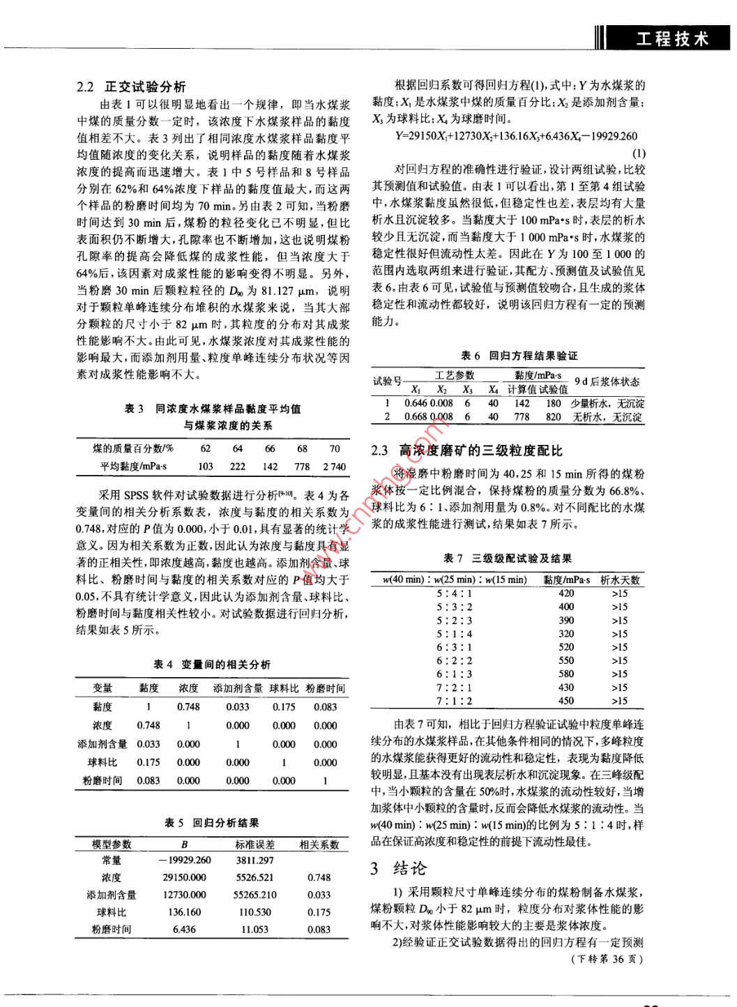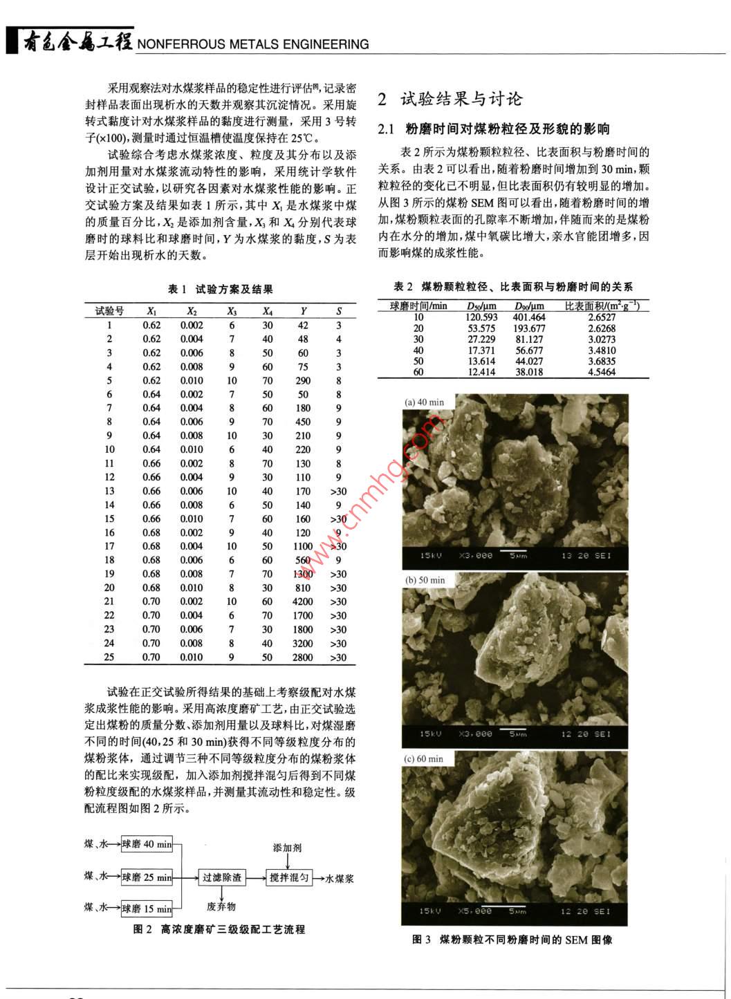 NONFERROUS METALS ENGINEERING有個(gè)屬工程do:10.3969/iss.2095-1744201304006淮南煤水煤漿高濃度磨礦制漿工藝囟曹激方瑩李鎮(zhèn)南京工業(yè)大學(xué)材料科學(xué)與工程學(xué)院南京210009摘要:通過(guò)正交試驗(yàn)方法研究多峰連續(xù)級(jí)配技術(shù)對(duì)淮南煤水煤漿成漿性能的影響。結(jié)果表明,較好的粒度級(jí)配可使?jié){體在同等濃度下獲得更佳的流動(dòng)性和穩(wěn)定性。關(guān)鍵詞:水煤漿;淮南煤;統(tǒng)計(jì)分析;粉磨;流變性;穩(wěn)定性中圖分類(lèi)號(hào):TQ536文獻(xiàn)標(biāo)志碼:A文章編號(hào):2095-1744(2013)4-0031-04用來(lái)制這環(huán)保、節(jié)能并可綜合利用的液體燃料來(lái)緩解緊1實(shí)驗(yàn)方法張的石油供應(yīng)。水煤漿通常包含62%70%的細(xì)煤顆粒,試驗(yàn)采用高濃度磨礦工藝S,流程圖如圖1所示。采29%-37%的水分以及大約1%的添加劑影響水煤漿性能用行星式球磨機(jī),設(shè)置行星磨轉(zhuǎn)速為200r/min,以不銹鋼的因素很多,主要有煤質(zhì)、煤顆粒大小以及粒度分布、添球作為研磨介質(zhì),三種球體的尺寸分別為大球(20mm)加劑種類(lèi)和用量以及制漿方法。中球(10mm)及小球(5mm),其級(jí)配為4:24:30。采用水煤漿最重要的流動(dòng)特性是黏度制備水煤漿要盡可能濕法粉磨,依據(jù)試驗(yàn)中不同的球料比及煤粉的質(zhì)量分地提高漿體濃度同時(shí)降低黏度。工業(yè)上對(duì)水煤漿黏度的期望數(shù),往磨罐中加入準(zhǔn)確稱量好的水和煤。根據(jù)試驗(yàn)條件值是在100r/min下 Brookfield表觀黏度低于1000mPa濕磨不同時(shí)間后對(duì)所得漿體進(jìn)行過(guò)濾除渣,去除較為明粒度分布(級(jí)配)是水煤漿制備過(guò)程中的關(guān)鍵因素。顯的大顆粒得到煤粉漿體。隨后將準(zhǔn)確稱量好的聚苯種優(yōu)化的粒度分布能最大限度地降低水煤漿的黏乙烯磺酸納(PSS)作為添加劑6加入到煤粉漿體中,混度,進(jìn)一步黏度降低只能通過(guò)化學(xué)添加劑來(lái)實(shí)現(xiàn)。一般勻攪拌15min,所得漿體即為水煤漿樣品,密封保存并認(rèn)為水煤漿制備中煤顆粒的粒度上限為250μm,粒度靜置一段時(shí)間。小于74pm的顆粒含量為70%80%然而,由于沉降以及漿體在霧化和燃燒過(guò)程中對(duì)顆粒尺寸的限制,通添加劑常需要更細(xì)的煤顆粒。水煤漿的黏度和煤額粒的堆積效率關(guān)系很大,當(dāng)水媒水一[球靜}這除拌混一水煤繁煤漿的粒度分布具有較高的堆積效率時(shí),將擁有更好的流動(dòng)性和更低的表觀黏度。圖1高濃度磨礦工藝流程采用正交試驗(yàn)法對(duì)制漿濃度、添加劑用量、粉磨球料比以及粉磨時(shí)間進(jìn)行優(yōu)化網(wǎng),在優(yōu)化工藝參數(shù)的基礎(chǔ)上研究三級(jí)級(jí)配對(duì)成漿性能的影響。收稿日期:2012-11-11作者簡(jiǎn)介:曹激(1987-),男,江蘇泰州人,碩士,主要從事水煤漿制備等方面的研究?!赣袀€(gè)屬工役 NONFERROUS METALS ENGINEERING采用觀察法對(duì)水煤漿樣品的穩(wěn)定性進(jìn)行評(píng)估記錄密封樣品表面出現(xiàn)析水的天數(shù)并觀察其沉淀情況。采用旋2試驗(yàn)結(jié)果與討論轉(zhuǎn)式黏度計(jì)對(duì)水煤漿樣品的黏度進(jìn)行測(cè)量,采用3號(hào)轉(zhuǎn)子(×100),測(cè)量時(shí)通過(guò)恒溫槽使溫度保持在25℃。2.1粉磨時(shí)間對(duì)煤粉粒徑及形貌的影響試驗(yàn)綜合考慮水煤漿濃度、粒度及其分布以及添表2所示為煤粉顆粒粒徑、比表面積與粉磨時(shí)間的加劑用量對(duì)水煤漿流動(dòng)特性的影響,采用統(tǒng)計(jì)學(xué)軟件關(guān)系。由表2可以看出,隨著粉磨時(shí)間增加到30mim,顆設(shè)計(jì)正交試驗(yàn),以研究各因素對(duì)水煤漿性能的影響。正粒粒徑的變化已不明顯,但比表面積仍有較明顯的增加。交試驗(yàn)方案及結(jié)果如表1所示,其中x是水煤漿中煤從圖3所示的煤粉SEM圖可以看出,隨著粉磨時(shí)間的增的質(zhì)量百分比,x1是添加劑含量,x和x分別代表球加煤粉顆粒表面的孔隙率不斷增加,伴隨而來(lái)的是煤粉磨時(shí)的球料比和球磨時(shí)間,Y為水煤漿的黏度,S為表內(nèi)在水分的增加,煤中氧碳比增大,親水官能團(tuán)增多,因?qū)娱_(kāi)始出現(xiàn)析水的天數(shù)。而影響煤的成漿性能。表1試驗(yàn)方案及結(jié)果表2煤粉顆粒粒徑、比表面積與粉磨時(shí)間的關(guān)系試驗(yàn)號(hào)X1X3 X4S一球靡時(shí)mmDm比血積2一0620.002304253.575193.6772.626820.620.00480000027.22981.1273.027317.371566773.48100.620.0087513.61444.02368351241438.0184.546450.6200101070290867505097045090640.008106402209110.660.002870130120660.00430110906791306600061040170>30140660.008650140960160>300.680.00240068000410501100>300.680.006605kU x3.088 Sum701300>300.680.010830810>30604200>30706701700>300.7000067240.7000088403200>300.700.01002800>30試驗(yàn)在正交試驗(yàn)所得結(jié)果的基礎(chǔ)上考察級(jí)配對(duì)水煤漿成漿性能的影響。采用高濃度磨礦工藝,由正交試驗(yàn)選定出煤粉的質(zhì)量分?jǐn)?shù)、添加劑用量以及球料比,對(duì)煤濕磨15kVX3, 800不同的時(shí)間(40,25和30min)獲得不同等級(jí)粒度分布的12 20 SEI煤粉漿體,通過(guò)調(diào)節(jié)三種不同等級(jí)粒度分布的煤粉漿體(c)60 min的配比來(lái)實(shí)現(xiàn)級(jí)配,加入添加劑攪拌混勻后得到不同煤粉粒度級(jí)配的水煤漿樣品,并測(cè)量其流動(