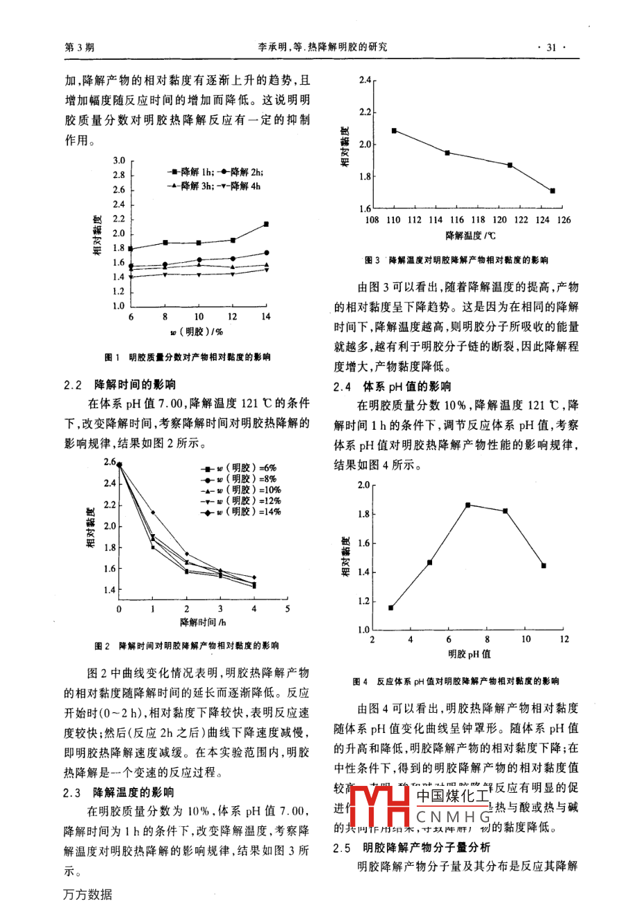 科研開發(fā)化工科技,2006,14(3):30-32scienCe TECHNOLoGY IN CHEMICAL INDUSTRY熱降解明膠的研究李承明,姜瑩,黃雅欽”,蔣國昌,夏宇正北京化工大學(xué)材料科學(xué)與工程學(xué)院,北京100029)摘要:報(bào)道了明膠熱降解反應(yīng),并考察了明膠質(zhì)量分?jǐn)?shù)、降解時(shí)間、降解溫度、明膠溶液pH值等因素對明膠熱降解反應(yīng)的影響規(guī)律。結(jié)果表明:熱催化是明膠降解的有效方法,較合適的降解條件為明膠質(zhì)量分?jǐn)?shù)10%,體系pH值7.00,降解溫度12l℃,降解時(shí)間2h。關(guān)鍵詞:明膠;熱降解;水解明膠中圖分類號(hào):TQ431.3文獻(xiàn)標(biāo)識(shí)碼:A文章編號(hào):10080511(2006)03003003明膠是由動(dòng)物皮、骨、腱和韌帶組織中的膠原其它試劑均為分析純。蛋白部分水解得到的,是蛋白質(zhì)片段的混合物,由1.2實(shí)驗(yàn)方法18種氨基酸組成。明膠由于其低的抗原性和良1.2.1明膠熱降解產(chǎn)物的制備好的生物相容性,廣泛應(yīng)用于醫(yī)藥領(lǐng)域,如生產(chǎn)膠取一定質(zhì)量分?jǐn)?shù)的明膠,調(diào)節(jié)體系pH值至囊,制作藥片藥丸,制成明膠敷料、明膠海綿、外科定值,置于反應(yīng)器中,在一定溫度下反應(yīng)一定時(shí)用粉劑等1,2)間,然后降至室溫,干燥,備用。明膠是大分子蛋白質(zhì),在酸、堿、酶及熱的條1.2.2黏度的測定件下可以發(fā)生降解反應(yīng),得到低分子的多肽采用型號(hào)為40.54烏氏黏度計(jì),測定明膠熱水解明膠3S。水解明膠更易被人體吸收,因降解產(chǎn)物的相對黏度孫。操作條件為:明膠降解此在醫(yī)藥上應(yīng)用更為廣泛。酸法和堿法工藝簡產(chǎn)物水溶液質(zhì)量分?jǐn)?shù)為2%,測定溫度為37℃。單,成本低,但產(chǎn)品中含鹽量較高,相對分子質(zhì)量1.2.3分子量及其分布的測定分布較寬,而且對設(shè)備的材質(zhì)要求較高;酶法降解原料明膠與明膠熱降解產(chǎn)物的分子量及其分的特點(diǎn)是酶專一性強(qiáng),反應(yīng)條件溫和;熱降解法工布采用凝膠滲透色譜法(GPC測定61。藝簡單,產(chǎn)物雜質(zhì)含量少。目前,關(guān)于酶法制備水解明膠的研究報(bào)道較2結(jié)果與討論多,而熱降解明膠的文獻(xiàn)報(bào)道很少。因此,作者以相對黏度和相對分子質(zhì)量及其分布是衡量明明膠熱降解反應(yīng)為研究目標(biāo),考察反應(yīng)體系中明膠降解產(chǎn)物重要的技術(shù)指標(biāo),影響明膠降解產(chǎn)物膠質(zhì)量分?jǐn)?shù)、反應(yīng)時(shí)間、反應(yīng)溫度、體系pH值等的性能和使用效果。設(shè)計(jì)實(shí)驗(yàn)考察了明膠熱降解因素對明膠熱降解產(chǎn)物性能的影響規(guī)律,為制備反應(yīng)條件對其產(chǎn)物相對黏度、相對分子量及其分明膠降解產(chǎn)物提供依據(jù)。布的影響規(guī)律。1實(shí)驗(yàn)部分2.1明膠質(zhì)量分?jǐn)?shù)的影響在體系pH值700,降解溫度121℃,降解時(shí)1.1原料和試劑中國煤化工,改變明膠質(zhì)量分明膠:藥品級羅賽洛(廣東)明膠有限公司;數(shù)CNMHG降解的影響規(guī)律收稿日期:200603結(jié)果如圖1所示。作者簡介:李承明(1981-),男,湖南衡陽人,北京化工大學(xué)碩士研究生,主要從事生物功能材料的研究。由圖1可以看出,4條曲線的變化趨勢相近?!巴ㄓ嵚?lián)系人。在本實(shí)驗(yàn)范圍內(nèi),隨著體系中明膠質(zhì)量分?jǐn)?shù)的增第3期李承明,等.熱降解明膠的研究31加,降解產(chǎn)物的相對黏度有逐漸上升的趨勢,且增加幅度隨反應(yīng)時(shí)間的增加而降低。這說明明2.2膠質(zhì)量分?jǐn)?shù)對明膠熱降解反應(yīng)有一定的抑制作用2.0降解lh;·降解2h;6降解3h;降解4h1.622108110112114116118120122124126降解溫度/℃圖3降解溫度對明膠降解產(chǎn)物相對黏度的影響由圖3可以看出,隨著降解溫度的提高,產(chǎn)物的相對黏度呈下降趨勢。這是因?yàn)樵谙嗤慕到?M(明膠)/%時(shí)間下,降解溫度越高,則明膠分子所吸收的能量就越多,越有利于明膠分子鏈的斷裂,因此降解程圖1明膠質(zhì)量分?jǐn)?shù)對產(chǎn)物相對黏度的影響度增大,產(chǎn)物黏度降低。2.2降解時(shí)間的影響24體系pH值的影響在體系pH值7.00,降解溫度121℃的條件在明膠質(zhì)量分?jǐn)?shù)10%,降解溫度121℃,降下,改變降解時(shí)間,考察降解時(shí)間對明膠熱降解的解時(shí)間1h的條件下調(diào)節(jié)反應(yīng)體系pH值,考察影響規(guī)律,結(jié)果如圖2所示。體系pH值對明膠熱降解產(chǎn)物性能的影響規(guī)律(明膠)=6%結(jié)果如圖4所示。(明膠)=8%-(明膠)=10%v(明膠)=12%(明膠)=14%16要1.41.2降解時(shí)間h10圖2降解時(shí)間對明膠降解產(chǎn)物相對黏度的影響明膠pH值圖2中曲線變化情況表明,明膠熱降解產(chǎn)物圖4反應(yīng)體系pH值對明膠降解產(chǎn)物相對黏度的影響的相對黏度隨降解時(shí)間的延長而逐漸降低。反應(yīng)開始時(shí)(0~2h),相對黏度下降較快,表明反應(yīng)速由圖4可以看出,明膠熱降解產(chǎn)物相對黏度度較快;然后(反應(yīng)2h之后)曲線下降速度減慢,隨體系pH值變化曲線呈鐘罩形。隨體系p值即明膠熱降解速度減緩。在本實(shí)驗(yàn)范圍內(nèi),明膠的升高和降低,明膠降解產(chǎn)物的相對黏度下降;在熱降解是一個(gè)變速的反應(yīng)過程。中性條件下,得到的明膠降解產(chǎn)物的相對黏度值2.3降解溫度的影響中國煤化工反應(y