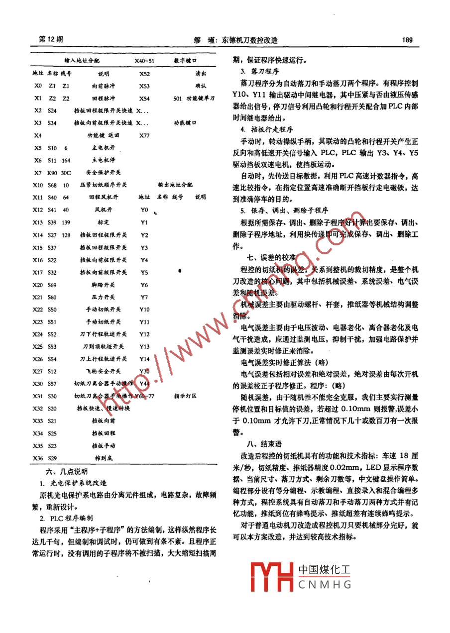 第5卷第12期中國(guó)水運(yùn)vo|.5No.12China Water Transport東德機(jī)刀數(shù)控改造繆瑾摘要:東德程控切紙機(jī)刀機(jī)械制造質(zhì)量好、切紙精度高、裁切速度快,八十年代末我國(guó)大量進(jìn)口,云南印刷業(yè)也有很多廠家引進(jìn),隨著時(shí)間推移,因其電控系統(tǒng)較為落后,多為分離元件大板結(jié)構(gòu),元件老化故障頻繁,檢修困難。為此,云南新華印刷集團(tuán)要求我們對(duì)PM系列、Vc系列切紙機(jī)進(jìn)行程控改造,現(xiàn)已正常運(yùn)行一年多,用戶對(duì)可靠性、穩(wěn)定性操作性非常滿意關(guān)鍵詞:三菱可編程控制器FX2N數(shù)控改造硬件原理程序設(shè)計(jì)中圖分類號(hào):TH15文獻(xiàn)標(biāo)識(shí)碼:A文章編號(hào):1006-7973(2007)120188-02、硬件改造方案齡入入,等刀檢修東德程控切紙機(jī)電控系統(tǒng)由以下部分組成:1、動(dòng)力驅(qū)動(dòng)翻頁(yè)部分由主電機(jī)、推紙器電機(jī)、風(fēng)機(jī)及相應(yīng)控制電器組成;2、自動(dòng)指示燈檢查指示燈啟動(dòng)指示燈調(diào)空指示燈顯示部分由LED及指示燈組成,用于顯示程序數(shù)據(jù),各種尺寸及運(yùn)行狀態(tài)指示等;3、安全保護(hù)由紅外光電保護(hù)電路、行機(jī)刀操作功能盡可能與原機(jī)相近程開關(guān)及門開關(guān)、保險(xiǎn)管組成;4、尺寸檢測(cè)及控制部分由旋轉(zhuǎn)編碼器、推紙離合器組成;5、壓紙切紙系統(tǒng)由壓紙器、液1、單尺寸操作:單刀(燈亮)一動(dòng)(燈亮)→輸入壓泵閥、切紙離合器及行程開關(guān)組成;6、操作指示部分由鍵盤、按鈕手柄開關(guān)組成;7、主控部分由單板機(jī)及接口電路組所需尺寸確認(rèn)當(dāng)板運(yùn)行到所需尺寸。成;8、電源部分。2、絕對(duì)精度校準(zhǔn)操作:廢潿(燈亮)→操作擋板低逮綜上所述,反復(fù)周密論證,確定以下改造方案:1、機(jī)刀開關(guān),后擋板運(yùn)行到200M0處自動(dòng)停車→輸入實(shí)際尺寸確單板機(jī)控制系統(tǒng)改用三菱可編程控制器RX2N,作為機(jī)η控囚→切紙退出校準(zhǔn):恢復(fù)擋板低速開關(guān)一校準(zhǔn)(燈滅)制系統(tǒng)核心,利用其固有功能:數(shù)字鍵盤輸入、多路BCD自動(dòng)碼輸出、高速脈沖計(jì)數(shù)及強(qiáng)大計(jì)算功能、大量計(jì)數(shù)、計(jì)時(shí)器、1、程序輸入調(diào)空檜入(燈亮)→輸入第一個(gè)尺寸(自中間繼電器、數(shù)據(jù)寄存器等完全滿足程序控制切紙機(jī)編程要?jiǎng)酉碌栋醋詣?dòng),不須則按滅自動(dòng)燈)確認(rèn):出下一個(gè)尺求。2、顯示部分采用自行設(shè)計(jì)與三菱可編程控制器配套七段寸重復(fù)輸入步驟直至完畢LED顯示電路,照顧工人操作習(xí)慣,顯示方式同原機(jī)。3、安全保護(hù)采用新型快速空氣開關(guān)和自恢復(fù)保險(xiǎn)。4、尺寸檢測(cè)2、程序調(diào)入調(diào)入(燈亮)→輸入程序號(hào)(1-40)及壓紙切紙系統(tǒng)不變旋轉(zhuǎn)編碼器及相關(guān)控制信號(hào)由PLC采集確認(rèn)→(顯示程序號(hào)及刀數(shù))。退出:自動(dòng)退出和給出。5、操作部分鍵盤重新設(shè)計(jì),采用中文鍵盤,增加手3、程序刪除刪除(燈克)→輸入程序號(hào)(1-40)動(dòng)/自動(dòng)選擇按鈕,其他不變。6、動(dòng)力驅(qū)動(dòng)部分更新老化元確認(rèn)(顯示程序號(hào)及刀數(shù)為零)件、電源部分嚴(yán)重老化,全新設(shè)計(jì)兩組Dc24vAC5V電源4程序檢查檢查(燈亮)一翻頁(yè)世頁(yè)→逐次顯示各、操作鍵盤設(shè)計(jì)刀尺寸若須更改當(dāng)前刀尺寸:渣出·輸入新個(gè)尺寸→確認(rèn)采用中文鍵盤,數(shù)字鍵十↑、功能鍵十五個(gè)、操作鍵四若須插入尺寸:插入(燈亮)個(gè)、備用出→輸入新尺寸確認(rèn)退出檢查(燈滅)單刀指示燈調(diào)入指示燈保存指示燈刪除指示燈5、程序運(yùn)行:運(yùn)行(燈亮),程序自動(dòng)運(yùn)行。暫停指示燈校準(zhǔn)指示燈運(yùn)行指示燈風(fēng)機(jī)指示燈6、暫停功能:停(燈亮)→暫停程序運(yùn)行。若當(dāng)前尺寸下刀自動(dòng)燈亮,程序自動(dòng)下刀;自動(dòng)燈不亮?xí)r,為手下刀。按風(fēng)機(jī)(燈亮)自動(dòng)下刀無(wú)風(fēng),反之有風(fēng)。按翻頁(yè)程序空走中國(guó)煤化工回回到當(dāng)前程序第刀輸入指示燈插入指示燈等刀指示燈檢修指示燈CNMHG五、王雯地理分既表收荷日期:2007-102作者簡(jiǎn)介:繆瑾昆明冶金高等??茖W(xué)校講師(650000第12期繆瑾:東德機(jī)刀數(shù)控改造輸入地址分配數(shù)字鍵口期,保證程序快速運(yùn)行地址名稱線號(hào)X523.落刀程序XO Z1 Z1向前脈沖落刀程序分為自動(dòng)落刀和手動(dòng)落刀兩個(gè)程序。有程序控制01功能鍵刀Y10.¥1l輸出驅(qū)動(dòng)中間繼電器,其中壓緊與否由液壓傳感擋板回程極限開美快速x器給出信號(hào),停刀信號(hào)利用凸輪和行程開關(guān)配合加PLC內(nèi)部X3s34擋板向前極限開關(guān)快逵x功能鍵口時(shí)間繼電器給出。4.擋板行走程序功能鍵返回手動(dòng)時(shí),轉(zhuǎn)動(dòng)操縱手柄,其聯(lián)動(dòng)的凸輪和行程開關(guān)產(chǎn)生正反向和高低速開關(guān)信號(hào)輸入PLC,PLC輸出Y3、Y4、Y5X6S11164驅(qū)動(dòng)擋板雙速電機(jī),使擋板運(yùn)動(dòng)。x7K9030C安全保護(hù)開美自動(dòng)時(shí),先傳送目標(biāo)數(shù)據(jù),利用