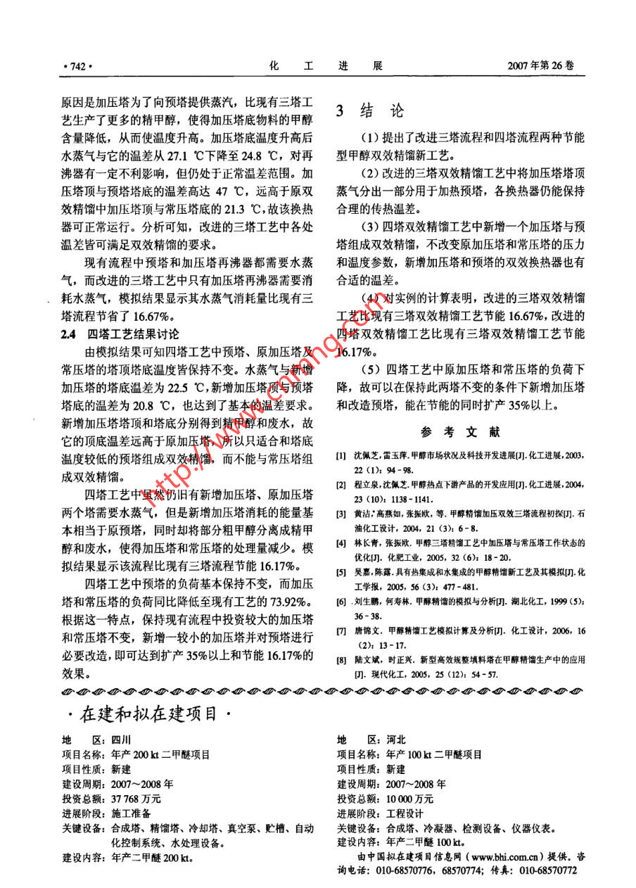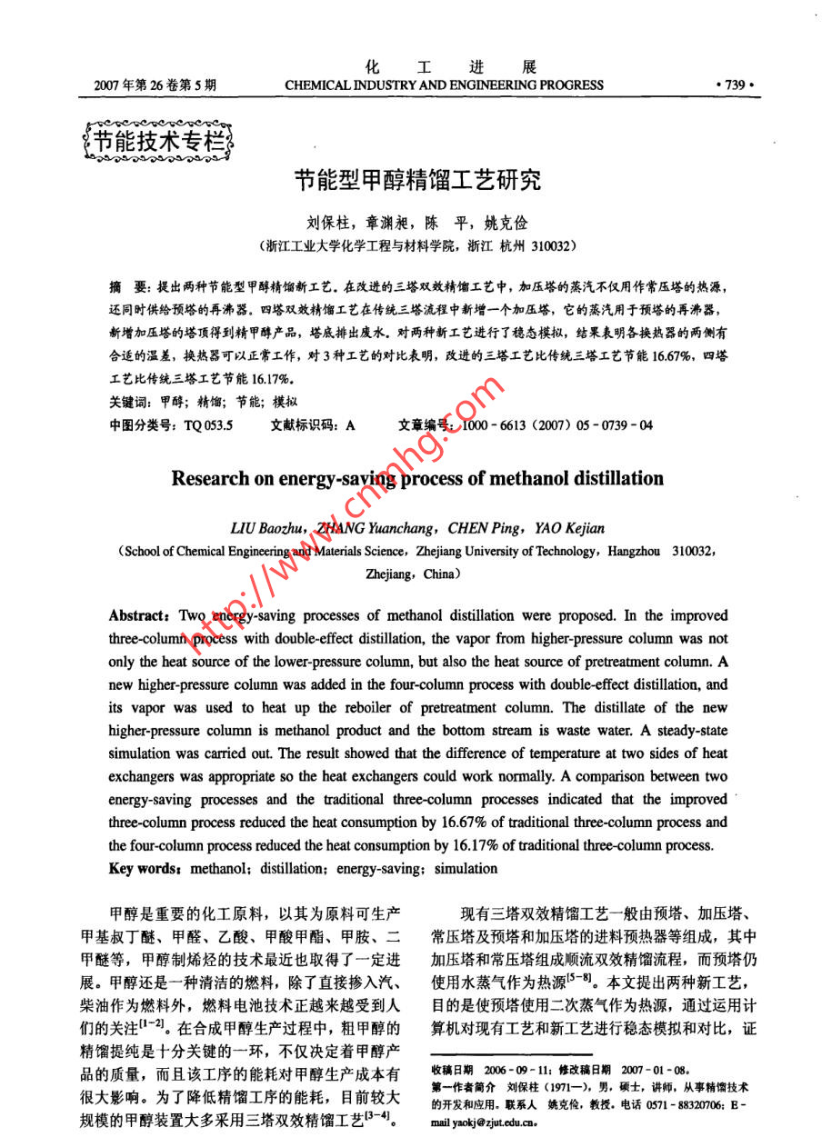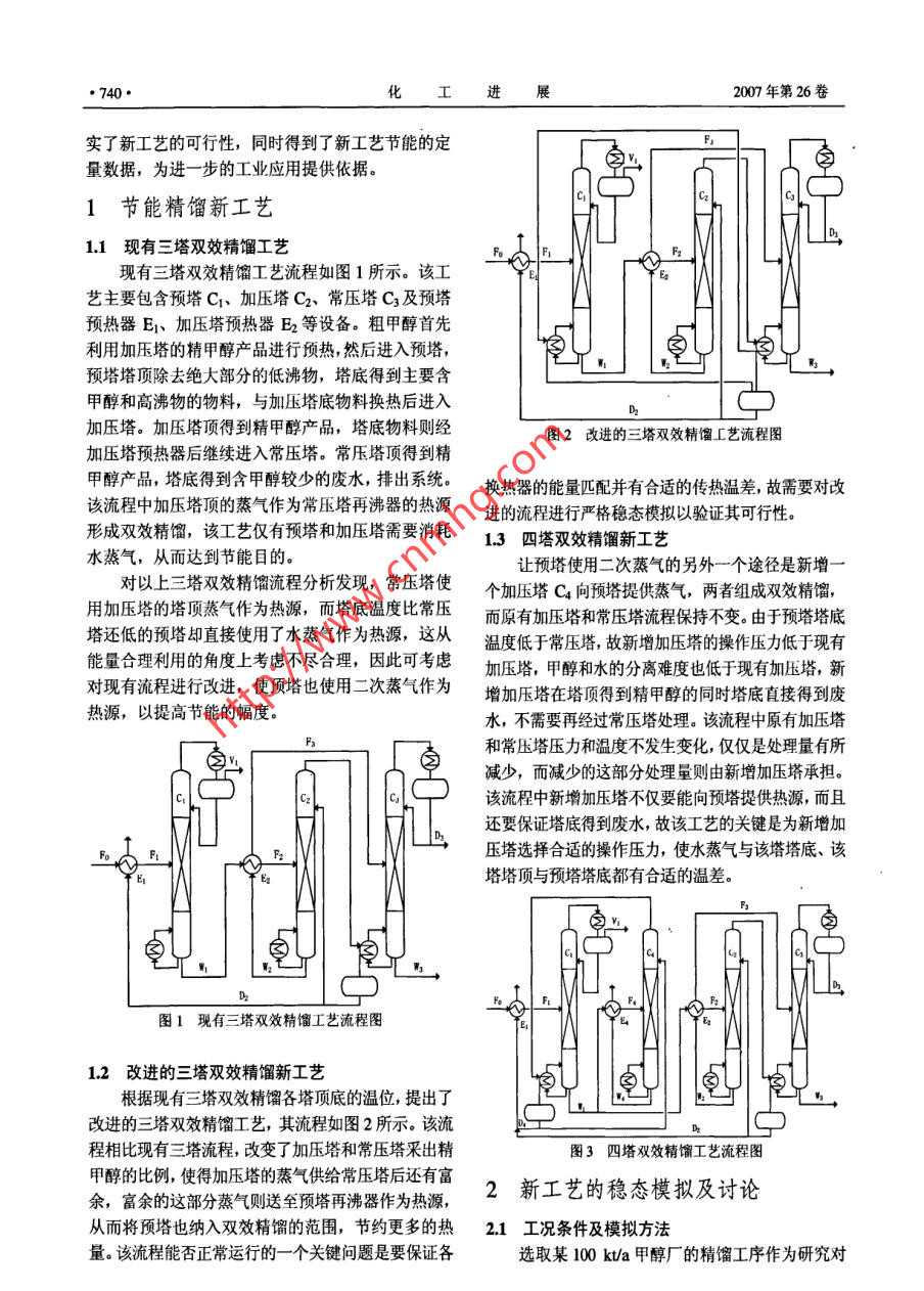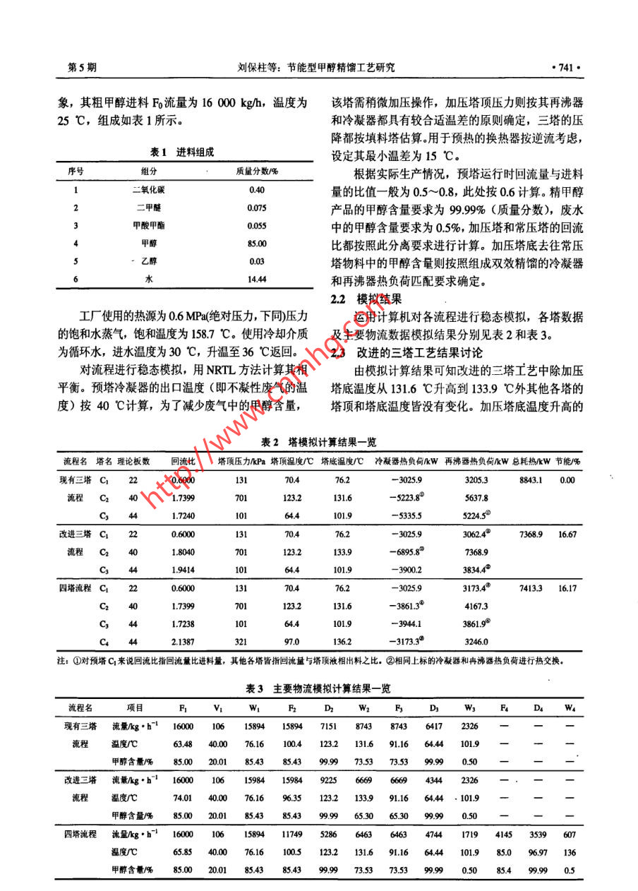 化I進展2007年第26卷第5期CHEMICAL INDUSTRY AND ENGINEERING PROGRESS●739●{節(jié)能技術(shù)專欄節(jié)能型甲醇精餾工藝研究劉保柱,章淵昶,陳平,姚克儉(浙江工業(yè)大學(xué)化學(xué)工程與材料學(xué)院,浙江杭州310032)摘要: 提出兩種節(jié)能型甲醇精餾新工藝。在改進的三塔雙效精餾工藝中,加壓塔的蒸汽不僅用作常壓塔的熱源,還同時供給預(yù)塔的再沸器。四塔雙效精餾工藝在傳統(tǒng)三塔流程中新增-一個加壓塔, 它的蒸汽用于預(yù)塔的再沸器,新增加壓塔的塔頂?shù)玫骄状籍a(chǎn)品,塔底排出廢水。對兩種新工藝進行了穩(wěn)態(tài)模擬,結(jié)果表明各換熱器的兩側(cè)有合適的溫差,換熱器可以正常工作,對3種工藝的對比表明,改進的三塔工藝比傳統(tǒng)三塔工藝節(jié)能16.67%,四塔工藝比傳統(tǒng)三塔工藝節(jié)能16.17%.關(guān)鍵詞:甲醇; 精餾;節(jié)能; 模擬中圖分類號: TQ 053.5文獻(xiàn)標(biāo)識碼: A文章編號: 1000- 6613 (2007) 05 - 0739 - 04Research on energy-saving process of methanol distillationLIU Baozhu, ZHANG Yuanchang, CHEN Ping, YAO Kejian(School of Chemical Engineering and Materials Science, Zhejiang University of Technology, Hangzhou 310032,Zhejiang, China)Abstract: Two energy-saving processes of methanol distillation were proposed. In the improvedthree-column process with double-effect distillation, the vapor from higher-pressure column was notonly the heat source of the lower-pressure column, but also the heat source of pretreatment column. Anew higher-pressure column was added in the four-column process with double-effect distlltion, andits vapor was used to heat up the reboiler of pretreatment column. The distillate of the newhigher-pressure column is methanol product and the bottom stream is waste water. A steady-statesimulation was carried out. The result showed that the difference of temperature at two sides of heatexchangers was appropriate so the heat exchangers could work normally. A comparison between twoenergy-saving processes and the traditional three- column processes indicated that the improvedthree-column process reduced the heat consumption by 16.67% of traditional three-column process andthe four-column process reduced the heat consumption by 16.17% of traditional three column process.Key wordst methanol; distillation; energy-saving; simulation甲醇是重要的化工原料,以其為原料可生產(chǎn)現(xiàn)有三塔雙效精餾工藝一般由預(yù)塔、加壓塔、甲基叔丁醚、甲醛、乙酸、甲酸甲酯、甲胺、二.常壓塔及預(yù)塔和加壓塔的進料預(yù)熱器等組成,其中甲醚等,甲醇制烯烴的技術(shù)最近也取得了一定進加壓塔和常壓塔組成順流雙效精餾流程,而預(yù)塔仍展。甲醇還是一種清潔的燃料,除了直接摻入汽、使用水蒸氣作為熱源[5-8]。本文提出兩種新工藝,柴油作為燃料外,燃料電池技術(shù)正越來越受到人目的是使預(yù)塔使用二次蒸氣作為熱源,通過運用計們的關(guān)注1-2。在合成甲醇生產(chǎn)過程中,粗甲醇的算機對現(xiàn)有工藝和新工藝進行穩(wěn)態(tài)模擬和對比,證精餾提純是十分關(guān)鍵的一環(huán),不僅決定著甲醇產(chǎn)品的質(zhì)量,而且該工序的能耗對甲醇生產(chǎn)成本有收稿日期2006-09-11; 修改稿日期2007-01-08。很大影響。為了降低精餾工序的能耗,目前較大第一作者簡介劉保柱 (1971-),男,硬士,講師,從事精慵技術(shù)的開發(fā)和應(yīng)用。聯(lián)系人姚克儉, 教授。電話0571 - 820706; B-規(guī)模的甲醇裝置大多采用三塔雙效精餾工藝[3-4。mil yokozj@t.du.c●740●化I工進展2007年第26卷實了新工藝的可行性,同時得到了新工藝節(jié)能的定自量數(shù)據(jù),為進一-步的工業(yè)應(yīng)用提供依據(jù)。中.1節(jié)能精餾新工藝1.1 現(xiàn)有三塔雙效精餾工藝現(xiàn)有三塔雙效精餾工藝流程如圖1所示。該工藝主要包含預(yù)塔C、加壓塔C2、常壓塔C3及預(yù)塔預(yù)熱器E環(huán)加壓塔預(yù)熱器Er等設(shè)備。粗甲醇首先利用加壓塔的精甲醇產(chǎn)品進行預(yù)熱,然后進入預(yù)塔,影,預(yù)塔塔頂除去絕大部分的低沸物,塔底得到主要含甲醇和高沸物的物料,與加壓塔底物料換熱后進入加壓塔。加壓塔頂?shù)玫骄状籍a(chǎn)品,塔底物料則經(jīng)圖2改進的三塔雙效精餾⊥藝流程圖加壓塔預(yù)熱器后繼續(xù)進入常壓塔。常壓塔頂?shù)玫骄状籍a(chǎn)品,塔底得到含甲醇較少的廢水,排出系統(tǒng)。換熱器的能量匹配并有合適的傳熱溫差,故需要對改該流程中加壓塔頂?shù)恼魵庾鳛槌核俜衅鞯臒嵩催M的流程進行嚴(yán)格穩(wěn)態(tài)模擬以驗證其可行性。形成雙效精餾,該工藝僅有預(yù)塔和加壓塔需要消耗1.3四塔雙效精餾新工藝水蒸氣,從而達(dá)到節(jié)能目的。讓預(yù)塔使用二次蒸氣的另外一個途徑是新增一對以上三塔雙效精餾流程分析發(fā)現(xiàn),常壓塔使個加壓塔Ca向預(yù)塔提供蒸氣,兩者組成雙效精餾,用加壓塔的塔頂蒸氣作為熱源,而塔底溫度比常壓而原有加壓塔和常壓塔流程保持不變。由于預(yù)塔塔底塔還低的預(yù)塔卻直接使用了水蒸氣作為熱源,這從溫度低于常壓塔,故新增加壓塔的操作壓力低于現(xiàn)有能量合理利用的角度上考慮不盡合理,因此可考慮加壓塔,甲醇和水的分離難度也低于現(xiàn)有加壓塔,新對現(xiàn)有流程進行改進,使預(yù)塔也使用二次蒸氣作為增加壓塔在塔頂?shù)玫骄状嫉耐瑫r塔底直接得到廢熱源,以提高節(jié)能的幅度。水,不需要再經(jīng)過常