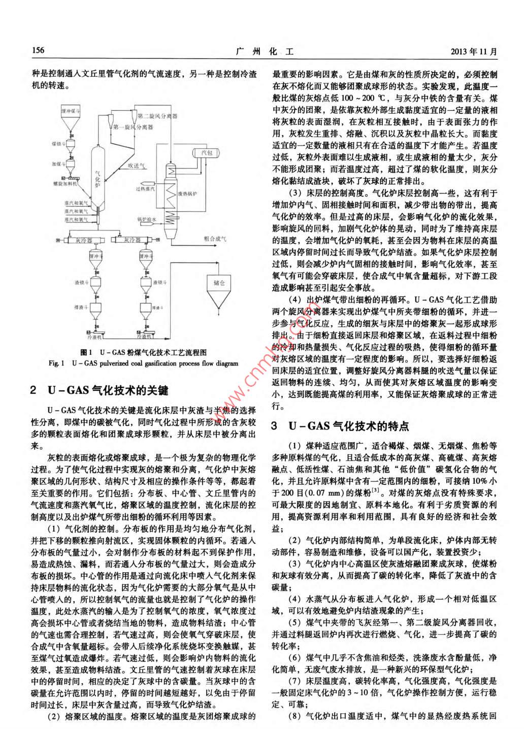第41卷第22期廣州化工 Vol. 41 No. 222013年11月 Guangzhou Chemical Industry November. 2013生產(chǎn)技術(shù)U-GAS粉煤氣化技術(shù)董文博(河南義馬煤業(yè)集團(tuán)股份有限公司技術(shù)中心,河南義馬472300)摘要:介紹了-GAS粉煤加壓氣化技術(shù)的工藝反應(yīng)原理,主要設(shè)備的作用和工藝流程走向,關(guān)鍵控制參數(shù)的調(diào)節(jié)方向,與其他爐型相比較,該爐型所具備的技術(shù)優(yōu)勢(shì)和特點(diǎn),該氣化技術(shù)的研究發(fā)展歷程以及目前在國(guó)內(nèi)的運(yùn)行情況,并指出了這種煤粉煤氣化工藝技術(shù)的發(fā)展前景及制約因素。關(guān)鍵詞:-GAS;粉煤氣化;灰團(tuán)聚;氣化技術(shù);流化床;氣化劑中圖分類號(hào):TQ546.2文獻(xiàn)標(biāo)識(shí)碼:B文章編號(hào):1001-9677(2013)22-0155-03 U-GAS Pulverized Coal Gasification Technology DONG Wen-Bo(Technology Center, Henan Yima Coal Group Co.,lt, Henan Yima472300, China) Abstract: U-GAS reaction principle of the technology of pulverized coal pressurized gasification technology, the role of the main equipment and technological process, the adjustment direction of key control parameters were introduced Compared with other type furnace, technology advantage and characteristic of fumace model, the gasification technology of research development and running situation at present in China were presented, and the pulverized coal gasification technology development prospect and restriction factor were pointed out. Key words: U-GAS; pulverized coal gasification; grey reunion; gasification; fluidized bed; gasification agent汽比值較大,故床層中心區(qū)域溫度較高,該區(qū)域的溫度高于周1u-gAs氣化爐及工藝流程圍流化床的溫度,接近煤的灰熔點(diǎn);U-gAs氣化爐,是一個(gè)單段流化床氣化爐。氣化爐主體(3)在文丘里管處由于氣流的擾動(dòng)使排灰中的碳粒從較重是帶有兩個(gè)旋風(fēng)分離器的粉煤流化床。氣化爐是一個(gè)直立的圓的團(tuán)聚灰筒體,分為上下兩段,上部的直徑較大,氣流速度較低,氣流灰?;抑蟹蛛x出來(lái)在文丘里管處使未燃碳燃燒氣化,又使相互粘結(jié)而團(tuán)聚起來(lái)。通過控制文丘里管的氣速,可控制中含有尚未完全氣化的焦粉和半焦粉,與下部相比,顆粒濃度排灰量。較低,稱之為稀相段,此處是氣化產(chǎn)生的焦油和輕油進(jìn)行裂解原料煤與氣化劑反應(yīng)生成的合成氣從氣化爐頂部導(dǎo)出,合的主要場(chǎng)所;下部的直徑較小,氣速較大,顆粒較大的粉煤成氣中夾帶有大量的煤粉,含碳量較大。經(jīng)過兩級(jí)旋風(fēng)分離器,將合成氣中所附帶的大顆粒粉塵捕集回收,再次送入氣化粉焦和灰渣都集中在這里,形成流化床的濃相段。原料煤被輸爐進(jìn)行反應(yīng)。合成氣中不含焦油,有利于熱量的回收和凈化過送到濃相段,這里是氣化反應(yīng)發(fā)生的主要場(chǎng)所。經(jīng)過加工后的原料煤(0~6mm),為了能順利進(jìn)入加壓運(yùn)程。氣化過程中形成的灰渣被熔融團(tuán)聚成球形顆粒,而后被分行的氣化爐,將經(jīng)過緩沖斗、鎖斗、加煤計(jì)量斗和定量螺旋加般的流化床氣化爐不能從床層中排出低碳灰渣,這是因料器噴人分布板上方區(qū)域。在氣化爐內(nèi),煤與氧氣、水蒸汽在為要保持床層中高的碳灰比和維持穩(wěn)定的不結(jié)渣操作,流化床高溫高壓條件下接觸、反應(yīng),將迅速完成干燥破粘(如果是內(nèi)必須要混合良好因此,排料的組成與床內(nèi)物料相同,故排黏結(jié)性煤的話)、脫揮發(fā)分、熱裂解、燃燒、氣化、灰團(tuán)聚、出的灰渣含碳量就會(huì)比較高。而u-gAS氣化技術(shù)是利用灰團(tuán)灰分離等一系列重要步驟。床層溫度取決于原料煤的種類,應(yīng)聚的原理,來(lái)進(jìn)行反應(yīng)和排灰過程的。在氣化爐內(nèi),導(dǎo)入氧化使煤灰熔聚而不結(jié)渣。氣化爐的運(yùn)行壓力取決于產(chǎn)品氣的用性高速射流,使煤中的灰分在軟化而未熔融的狀態(tài)下,在錐形途。原料煤在氣化爐內(nèi)停留時(shí)間為45~60min,流化速度為床中相互熔聚而黏結(jié)成含碳量較低的球狀灰渣,有選擇的排出0.65~1m/s,中心管處的固體分離速度約為10m/sc爐外。這種排渣工藝的優(yōu)點(diǎn)是不需要熔化所有的灰,對(duì)灰渣的氣化劑由三處進(jìn)入氣化爐:流動(dòng)性要求不高。這種氣化爐的灰渣比純干式排灰的灰渣對(duì)環(huán)(1)床層底部的分布板上開了數(shù)百個(gè)小孔,氣化劑從分布境的污染小。與固態(tài)排渣相比降低了灰渣中的碳損失,提板下部進(jìn)入,由小孔散出,以均勻的分布?xì)饣瘎┎⑾乱频奈锔吡藲饣?與液態(tài)排渣相比,減少了灰渣中帶走的顯熱損料推向中心射流區(qū)域,建立固體顆粒的內(nèi)部循環(huán);失,從而提高了氣化過程中碳的利用率(21。這是煤氣化排渣技(2)通過床層底部中心管進(jìn)入,由于中心管口位置的氧/術(shù)的重大發(fā)展?;以欧诺乃俾士赏ㄟ^兩種途徑進(jìn)行控制:作者簡(jiǎn)介:董文博(1986-)男,助理工程師。156廣州化工2013年11月種是控制通入文丘里管氣化劑的氣流速度,另一種是控制冷渣最重要的影響因素。它是由煤和灰的性質(zhì)所決定的,必須控制機(jī)的轉(zhuǎn)速。在灰不熔化而又能夠團(tuán)聚成球形的狀態(tài)。實(shí)驗(yàn)發(fā)現(xiàn),此溫度一般比煤的灰熔點(diǎn)低100~200℃,與灰分中鐵的含量有關(guān)。煤緩沖斗第二旋風(