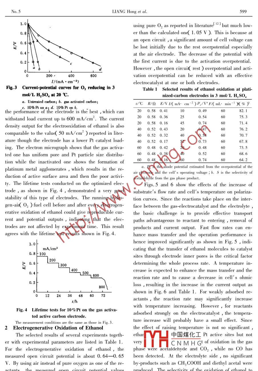 CHEM. RES. CHINESE U. 2005, 21(5), 597-600Electrocatalytic Activity of Pt/c Electrodes forEthanol Oxidation in Vapor PhaseLIANG Hong2"', YE Dai-qi' and LIN Wei-ming 21. School of Biological and Chemical Engineering, Guangzhou UniversityGuangzhou 510091,.r. china2. School of Environment Science and Engineering South China University of TechnologyGuangzhou 510640, P.R. ChinaReceived Nov, 19,2004High performance platinized-carbon electrodes have been developed for the electrocatalyticcetaldehyde in electrogenerative processes. A load current density of the electrode can be achieved as high as 600mA per square centimeter for oxygen reducing in 3 mol/L sulfuric acid with a good stability. With these electrodesand sulfuric acid as an electrolyte in fuel cells ethanol vapor carried by nitrogen gas can be oxidized selectively toacetaldehyde. Selectivity of acetaldehyde depends on the potential of the cell and the feed rate of ethanol vapor andcan be more than 80% under optimized conditions. The initial product of ethanol oxidized on a platinized-carbonelectrode is acetaldehyde and the ethanol oxidation mechanism is discusseds Ethanol, Platinum, Electrocatalytic oxidation, AcetaldehydeArticle|D10059040(2005)05-597404Introductionsubject of numerous investigations with the main purThe selective oxidation of ethanol to acetaldehyde pose to elucidate the mechanism with the double-layerspecial interest in the areas where biomass-based region on platinum, but is has not been well undereconomics are under development since acetaldehyde stood. Most reports about the oxidations of ethanecan be used for the syntheses of other basic chemicals acetaldehyde in literature have dealt with dissolved sub-such as acetic acid, acetic anhydride, n-butanol, strate systems while very few have been devoted to theetc.I-6. With the advancement of fuel cell technology investigation of vapor phase oxidation on gas porousand electrocatalysis stimulated by the world energy and electrodes and the recovery of acetaldehyde hasraw material situation, some special opportunities have pursued in only a few instances[ l0. The work reportedbeen provided for investigating electrosynthesis of or- here is on the electrogenerative oxidation of ethanolganic chemicals not only without requiring a power with air on porous platinized-carbon electrodessource but withgeneratioExperimentalElectrogenerative processes produce desired chemicals 1 Preparation of Catalyst and Electrodeson generating electricity. However, chemical synthe-Active carbon chosen as the catalyst' s support wassis ,i.e. producing desired chemicals, is the primary subjected to repeating gravity separation with a saturatmotivation and electricity is the by-product. Apart from ed calcium chloride solution and" Soxhlet"treatmentenergy recovery there are possibilities of controlling re- with azeotropic hydrochloric acid and the ash contentaction rates as well as selectivity through potentials and of the treated carbon was found to be less than 0. 03%other electrocatalytic means. For its high free energy Then the treated carbon was activated by heating inchange and using ai( O2)as one of the reactants the CO2 atmosphere at 900 C for 4 h. Theelectrogenerative oxidation of ethanol to acetaldehyde is the activated carbon obtained by the bet method wasa very promising electrogenerative process. Qian Yong- found to be more than 1500 m/g. Acetylene black10] studied the electrochemical behavior of used中國(guó)煤化Pt/C electrodes. Shen Mu-zhong et al L l investigated hydroC N MH Go subjected to the prethe regulation of power conversion in fuel cells. The treatment with the similar procedure as that for activeelectrooxidation of ethanol on platinum has been the carbon. The BET surface area of gas activated acety∴7搖m時(shí)時(shí)ted Partially by the Ministry of Education of Chidence should be addressed. E-mail cedaqiye@ scut. edu. enCHEM. RES. CHINESE UVol 21lene black was about 500 m/g. The catalyst was preAir(O3)Ethanol+Npared by depositing platinum from chloroplatinic acidonto the active carbon by sodium formate reduction witha platinum loading of 10%( mass fraction ) The subselent heat treatment was conducted in a quartz tube for3 h at 300C in hydrogen atmosphere. The electrodeswere manufactured by pressing an Ni screen( about 80Electrolytenesh), a diffusion membrane and a catalytic mem-brane together at about 4.9 x 10 Pa for one minuteFig. 2 The electrogenerative cell working atThe diffusion membrane was made by the following pro-room temperature.cedure: a 60%( mass fraction ) Teflon( PtFE) emulthe gas activated acetylene black and an"OP" 1-cm thick electrolyte chamber containing 3 mol/Lemulsifier with the mass ratio of 10: 4. 2 were mixed. H, SO, that could be forced to flow during the measure-Then to it was added a suitable volume of distilled wa- ment. The substrate carrier gas N, passes through a gaster until it became a dough, then it was rolled carefully washing bottle with about 100 mL ethanol ligand repeatedly until a very thin and uniform membrane bubble type flow meter is used to measure the flow ratesas obtained with a thickness of ca. 0.5 mm. The reby diverting streams before and after the cell. The 0sulted film was subjected to repeating" Soxhlet"treat- flow rate at the cathode exceeds the required flow ratement with acetone for 48 h in order to remove the oP for complete combustion at the anode. Analyses of theand to create the fine pores within the membrane. The inlet and outlet streams were carried out by using a Shicatalytic membrane was manufactured by following the madzu 7 A gas chromatograph equipped with a 3 m x3same procedure as that for the diffusion film, but the mm carbowax 1500 column. Prod o r0 was analyzedTeflon content was about 20% and the thickness was with a porapak Q column. Thele polarization curves re-about 0. 2 mm. The resulted platinum loading of cata- ported here are the second ones taken after a period oflytic membrane was found t