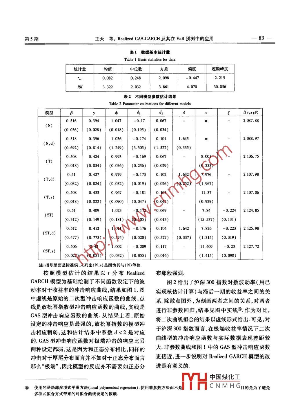 第18卷第5期管理科學(xué)學(xué)報(bào)Vol. 18 No 52015年5月JOURNAL OF MANAGEMENT SCIENCES IN CHINAMay 2015Realized gas- GARCH及其在VaR預(yù)測(cè)中的應(yīng)用王天一1,黃卓(1.對(duì)外經(jīng)濟(jì)貿(mào)易大學(xué)金融學(xué)院,北京100029;2.北京大學(xué)國(guó)家發(fā)展研究院,北京100871)摘要:論文提出了新的波動(dòng)率模型 Realized GAS- GARCH,并推導(dǎo)了該模型的QMIE參數(shù)估計(jì).該模型結(jié)合了 Generalized Autoregressive Score(GAS)模型的基本思路,把 Realized GARCH模型擴(kuò)展到包含厚尾分布的情形,并采用了與厚尾分布參數(shù)相依的沖擊響應(yīng)函數(shù).與簡(jiǎn)單的厚尾分布擴(kuò)展模型相比,這種設(shè)定對(duì)于回報(bào)率中的極端值更加穩(wěn)健.在基于滬深300指教高頻數(shù)據(jù)的實(shí)證結(jié)果中,使用GAS沖擊響應(yīng)函數(shù)的模型對(duì)“在險(xiǎn)價(jià)值”VaR的預(yù)測(cè)能力顯著的超過(guò)了傳統(tǒng)的厚尾 Realized GarCh模型關(guān)鍵詞: Realized GARCH;沖擊響應(yīng)函數(shù);厚尾分布;ⅤaR中圖分類號(hào):F830.9文獻(xiàn)標(biāo)識(shí)碼:A文章編號(hào):1007-9807(2015)05-0079-080引言差設(shè)定基于正態(tài)分布,后繼研究9指出這種設(shè)定并不能擬合數(shù)據(jù)中的偏峰厚尾現(xiàn)象,并提出用從 Andersen等開創(chuàng)性的工作開始,越來(lái)越 Skewed+分布改進(jìn)模型對(duì)厚尾分布擬合能力的方多的文獻(xiàn)已經(jīng)證實(shí),使用高頻數(shù)據(jù)可以獲得波動(dòng)法.文獻(xiàn)[9]同時(shí)將沖擊響應(yīng)函數(shù)的冪指數(shù)放松率更精確的度量,并引發(fā)了相關(guān)領(lǐng)域的大量研為待估參數(shù)結(jié)果顯示冪指數(shù)大部分都小于2,即究2-.由于 GARCH模型在傳統(tǒng)波動(dòng)率建模中原始的二次型設(shè)定存在設(shè)定問(wèn)題的出色表現(xiàn),如何將已實(shí)現(xiàn)測(cè)度與 GARCH模型以上現(xiàn)象顯示, Realized GARCH模型設(shè)定沖進(jìn)行結(jié)合成為研究中的熱點(diǎn)話題對(duì)于兩者的擊響應(yīng)函數(shù)對(duì)于收益率沖擊的響應(yīng)強(qiáng)度過(guò)大類結(jié)合,最直接的做法是將已實(shí)現(xiàn)測(cè)度以外生變量似的現(xiàn)象在日數(shù)據(jù) GARCH模型中也常見(jiàn).其的形式引人 GARCH模型,即 GARCH-X模型這背后的機(jī)理在于,不同尾部厚度的分布下同樣大種方式雖然簡(jiǎn)單,但缺乏針對(duì)已實(shí)現(xiàn)測(cè)度的建模部分因此模型無(wú)法進(jìn)行多步預(yù)測(cè)為了解決這個(gè)小的沖擊其罕見(jiàn)程度不同分布的尾部越厚對(duì)于問(wèn)題研究者提出了將已實(shí)現(xiàn)測(cè)度納入 GARCH同樣大小的沖擊而言,其罕見(jiàn)程度越低③因此尾框架的 Realized garch模型,實(shí)證研究9表部厚的模型其沖擊響應(yīng)強(qiáng)度應(yīng)該比尾部薄的模型明,相比傳統(tǒng)的 GARCH模型而言,應(yīng)用已實(shí)現(xiàn)測(cè)小如果對(duì)于任何分布都采用同樣的函數(shù)設(shè)定,必度的 Realized garch模型對(duì)波動(dòng)率建模預(yù)測(cè)能然會(huì)導(dǎo)致某些分布下,模型的沖擊響應(yīng)強(qiáng)度過(guò)度力有顯著的提升原始的 Realized garch模型誤或者不足實(shí)際上,現(xiàn)有的 GARCH模型最早都是①收稿日期:2012-09-20;修訂日期:2013-07-01基金項(xiàng)目:國(guó)家自然科學(xué)基金青年科學(xué)基金資助項(xiàng)目(71201001;71301027);教育部人文社會(huì)科學(xué)青年基金資助項(xiàng)目(12YJc790073;l3Yc790146);對(duì)外經(jīng)濟(jì)貿(mào)易大學(xué)中央高?;究蒲袠I(yè)務(wù)費(fèi)專項(xiàng)資金資助項(xiàng)目(14YQ05);對(duì)外經(jīng)濟(jì)貿(mào)易大學(xué)學(xué)科建設(shè)專項(xiàng)經(jīng)費(fèi)資助項(xiàng)目(XK2014l通信作者:黃卓(1978-),男,湖北武漢人,助理教授.Emil: zhuhuang@nsd.pk②國(guó)內(nèi)已有文獻(xiàn)5-6]比較了已實(shí)現(xiàn)波動(dòng)率和 GARCH模型波動(dòng)率之間的異同但是將中國(guó)煤化工③罕見(jiàn)程度可以用零均值檢驗(yàn)的P值衡量,值越小說(shuō)明沖擊大于給定值的概率越小,CNMHG個(gè)實(shí)現(xiàn)值x而言,分布尾部越薄,對(duì)應(yīng)的P值越小,即越罕見(jiàn)管理科學(xué)學(xué)報(bào)2015年5月針對(duì)誤差服從正態(tài)分布設(shè)計(jì)的,對(duì)服從厚尾分布方程(3)將已實(shí)現(xiàn)測(cè)度與條件波動(dòng)率經(jīng)由測(cè)量方隨機(jī)變量建模時(shí)(如收益率數(shù)據(jù)),其沖擊響應(yīng)強(qiáng)程形式聯(lián)系起來(lái)由于u1作為測(cè)量誤差進(jìn)入整個(gè)度過(guò)大是必然的因此,對(duì) GARCH模型進(jìn)行分布模型系統(tǒng),討論分布設(shè)定的時(shí)候總假設(shè)u1~N(0上的拓展僅將誤差分布修正成厚尾分布是不夠1)間由于已實(shí)現(xiàn)測(cè)度的計(jì)算只基于交易時(shí)間的的,還需要將模型本身的函數(shù)形式做相應(yīng)的修正.收益率而條件波動(dòng)率對(duì)應(yīng)的是從一個(gè)收盤到下正是基于這種思想,文獻(xiàn)中提出了 generalized ar個(gè)收盤的收益率,因此并不要求φ=1.函數(shù)toregressive score(GAS)模型框架在這個(gè)模型r(z)描述了波動(dòng)率對(duì)于收益率的沖擊響應(yīng)⑦框架下,數(shù)據(jù)進(jìn)入模型的函數(shù)形式是依分布不同本文選取已實(shí)現(xiàn)核估計(jì)2作為模型使用的而