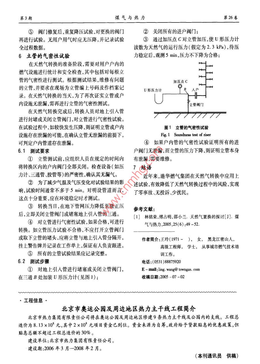 第26卷第3期煤氣與熱力Vol 26 No. 32006年3月GAS heatMar.2006天然氣轉(zhuǎn)換前的試驗(yàn)王玲(山東港華培訓(xùn)學(xué)院,山東濟(jì)南250101)摘要:介紹了天然氣轉(zhuǎn)換前進(jìn)行的的調(diào)壓器的運(yùn)行試驗(yàn)、舊管網(wǎng)的升壓試驗(yàn)、地下管網(wǎng)及閥門的切斷試驗(yàn)、新敷設(shè)管道的氣密性試驗(yàn)、立管閥門的切斷試驗(yàn)和立管的氣密性試驗(yàn),以提高天然氣轉(zhuǎn)換的安全性。關(guān)鍵詞:天然氣轉(zhuǎn)換;試驗(yàn);安全中圖分類號(hào):TU996文獻(xiàn)標(biāo)識(shí)碼:B文章編號(hào):1000-416(2006)03-000-0Test before Natural Gas ConversionShandong Ganghua Gas Training Institute, Jinan 250101, China)Abstract: An introduction is given to the tests conducted before natural gas conversion, includingperation test of regulator, upraising pressure test of old network, cut-off test of underground network andalves, gas-tight test of newly installed pipeline, cut-off test of riser valve and gas-tight test of riser, toimprove the safety of natural gas conversionKey words: natural gas conversion; test safety港華燃?xì)饧瘓F(tuán)(以下簡(jiǎn)稱集團(tuán))在全國(guó)有多家壓試驗(yàn)。在升壓試驗(yàn)中檢測(cè)管網(wǎng)的泄漏情況,分析合資公司,從2003年起安徽江蘇、山東等地的合資泄漏原因并及時(shí)消除泄漏點(diǎn)。升壓試驗(yàn)中出現(xiàn)的問公司陸續(xù)成功地進(jìn)行了天然氣轉(zhuǎn)換。根據(jù)在天然氣題要在管網(wǎng)改造中綜合考慮,選擇合適的修復(fù)及改轉(zhuǎn)換中積累的經(jīng)驗(yàn),集團(tuán)編寫了《天然氣置換手造方法以保證管網(wǎng)安全運(yùn)行。冊(cè)》,對(duì)內(nèi)作為集團(tuán)員工的培訓(xùn)資料,對(duì)外與同行技3地下管網(wǎng)及閥門的切斷試驗(yàn)術(shù)共享。此手冊(cè)建議在天然氣轉(zhuǎn)換前進(jìn)行調(diào)壓器的因天然氣轉(zhuǎn)換的需要,城區(qū)舊管網(wǎng)中會(huì)增加一運(yùn)行試驗(yàn)舊管網(wǎng)的升壓試驗(yàn)地下管網(wǎng)及閥門的切些連通管和切斷閥。地下管網(wǎng)及閥門的切斷試驗(yàn)是斷試驗(yàn)新敷設(shè)管道的氣密性試驗(yàn)、立管閥門的切斷為了驗(yàn)證轉(zhuǎn)換區(qū)管網(wǎng)與非轉(zhuǎn)換區(qū)管網(wǎng)是否能可靠地試驗(yàn)和立管的氣密性試驗(yàn)。這些試驗(yàn)非常重要,可隔離驗(yàn)證用于隔離的切斷閥是否能可靠地切斷。以消除天然氣轉(zhuǎn)換中可能出現(xiàn)的安全隱患。3.1試驗(yàn)時(shí)間試驗(yàn)時(shí)間應(yīng)選擇在用氣最低谷時(shí),應(yīng)事先通知調(diào)壓器的運(yùn)行試驗(yàn)用戶,盡可能不影響用戶用氣。試驗(yàn)時(shí)要選擇合天然氣轉(zhuǎn)換過程中,管網(wǎng)的壓力級(jí)制會(huì)變化,需適的試驗(yàn)壓力,并記錄試驗(yàn)全過程數(shù)據(jù)。這項(xiàng)工作要對(duì)調(diào)壓器進(jìn)行更換或增減。天然氣轉(zhuǎn)換前,調(diào)壓應(yīng)在天然氣轉(zhuǎn)換前的一個(gè)月進(jìn)行,以便及時(shí)解決發(fā)器必須安裝調(diào)試完畢,并利用天然氣進(jìn)行運(yùn)行試驗(yàn),現(xiàn)的問題。為確保轉(zhuǎn)換工作安全進(jìn)行,轉(zhuǎn)換當(dāng)日必提高轉(zhuǎn)換后調(diào)壓器工作的安全性和穩(wěn)定性。須再試驗(yàn)一次2舊管網(wǎng)的升壓試驗(yàn)3.2試驗(yàn)方法般天然氣轉(zhuǎn)換后,管網(wǎng)壓力會(huì)提高,需進(jìn)行升地下管網(wǎng)及閥門切斷試驗(yàn)可以分為調(diào)壓式和閥第3期王玲:天然氣轉(zhuǎn)換前的試驗(yàn)第26卷門控制式,二者的主要區(qū)別在于:調(diào)壓式是待試驗(yàn)的戶。轉(zhuǎn)換小區(qū)只通過調(diào)壓器供氣給區(qū)內(nèi)用戶;閥門控制②在相鄰的非轉(zhuǎn)換區(qū)可能有小口徑管道進(jìn)入式是待試驗(yàn)的轉(zhuǎn)換小區(qū)通過一條或數(shù)條管道供氣給轉(zhuǎn)換區(qū)某一樓宇的某一立管(多數(shù)是靠近轉(zhuǎn)換區(qū)域區(qū)內(nèi)用戶。的邊界地段)。①調(diào)壓式③在轉(zhuǎn)換區(qū)域周邊的新建筑,可能是從轉(zhuǎn)換將調(diào)壓器的出口壓力調(diào)低,如正常的出口壓力區(qū)域的小口徑管道供氣為1.5kPa,可調(diào)低至1kPa,觀測(cè)區(qū)內(nèi)外的壓差。如④在進(jìn)行切斷試驗(yàn)時(shí),在轉(zhuǎn)換區(qū)域周邊盡可能在10mn內(nèi)保持0.5kPa的穩(wěn)定壓差,就證明被能多選一些測(cè)壓點(diǎn),便于更可靠地觀測(cè)管網(wǎng)發(fā)生誤檢測(cè)區(qū)域的管網(wǎng)沒有與其他區(qū)域連接。切斷或未切斷的情況。②閥門控制式新敷設(shè)管道的氣密性試驗(yàn)將所有的分區(qū)切斷閥逐漸關(guān)閉,直至區(qū)內(nèi)外產(chǎn)新敷設(shè)管道指為滿足天然氣供氣和轉(zhuǎn)換需要安生壓力差。如正常的壓力為1.5kPa,可待壓力降低裝的高、中壓主管、連通管和旁通管等。新安裝管道至1kPa,再開始觀測(cè)區(qū)內(nèi)外的壓差。若能在10min除按安裝要求進(jìn)行吹掃試壓外,在與原管道連通時(shí)內(nèi)保持05kPa的穩(wěn)定壓差,就證明受檢測(cè)區(qū)域的要做氣密性試驗(yàn)。一般在天然氣轉(zhuǎn)換前,采用氮?dú)夤芫W(wǎng)沒有與其他區(qū)域連接。如在試驗(yàn)期間有少量用間接置換法、天然氣直接置換法或綜合間斷置換法氣需求,可用閥門調(diào)節(jié)保證在試驗(yàn)壓力下維持少量將管道內(nèi)的氣體