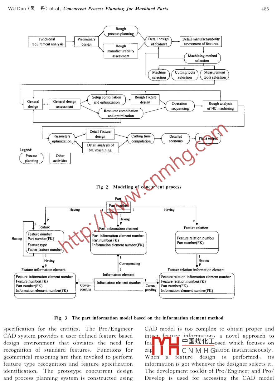 TSINGHUA SCIENCE AND TECHNOL0GYISSN 1007-0214 10/22pp481 - 487Volume 7,Number 5,October 2002Concurrent Process Planning for Machined Parts'WU Dan (吳丹)** ,WANG Xiankui (王先逵), LI Zhizhong (李志忠)Department of Precision Instruments and Mechanology,Tsinghua University, Beijing 100084,ChinaAbstract: Detailed manufacturing information about the parts can help designers produce better designs.Detailed manufacturing information is conveyed to the designer through micro. circles within the concurrentdesign process for machined parts, focusing on instantaneous product design and process planning. Theprocess has three key elements: a hier archical architecture design of the concurrent process planning system ,modeling and reengineering of the concurrent process planning, and modeling of information. The approach issuccessfully implemented and applied for concurrent design and process planning of some complicated parts.Key words: concurrent engineering; concurrent design; process planningand employment of design for X tools, such asIntroductiondesign for manufacturing, design for assembly,Development of a product undergoes a sequence ofdesign for cost, and design for serviceability. Inlife-cycle phases including design,process plan-the concurrent design, as the evaluations of thening,manufacturing,inspection, andmain-downstream productdevelopment aspects atenance. In the past,these product developmentcarried out instantaneously at the early designactivities were organized in a sequential manner :stage,this approachincreasesindustrialfrom design to downstream life-cycle phases. Ascompetitiveness by reducing the number of costlythe design engineers tend to generate designs withredevelopments,shortening product developmentexcellent functional performance, these designslead-time and providing high quality products.usually require excessive manufacturing efforts;Concurrent design is actually modeled bytherefore, leading to a high production costl1.21multipleiteration sub-processes called designTo reduce the gap between design and othercircles, for the gradual generation and addition ofdownstreamproductdevelopmentaspects,design information. Analyzing concurrent designconcurrent design has been extensively studied[3-8].shows that the iteration processes have to beConcurrent design is a method which incorporatesdesigned at different levels of macro- and micro-theconsiderationindow nstreamcircles. The macro circle emphasizes the roughdevelopment aspects into the design stage tosimultaneity of design withproduce a design with the best overall product life-development aspects at the level of a part, whilecycleperformance.Concurrentdesign isthe micro-circle focuses on the detailed informationcharacterized by early involvement of differentfeedback between design and downstream activitiesfunctional disciplines, parallelism and rational-at the feature level of the part. The existence ofization of sequential product development activities中國煤化工ffective increase in the .desMYHC N MH Ghich will shorten theproduct development per1od. With the goal ofReceived : 2001-04-26; revised: 2002-03-27* Supported by the State High- Tech Development Plan ofreflecting the essence of concurrent design, it isChina (No. 863-511- 9842- 011)necessary to make full use of the approach to*¥Towhom correspondence should be addressed. .micro-design circles from the point of both processE-mailm. tsinghua. edu.cn;and information. Based on the analysis of productTel: 86-10- 62773270development process involving design, process482Tsinghua Science and Technology, October 2002,7(5): 481 - 487planning, and other relevant aspects, an optimizedThe research in this paper aims at developing anprocessanddetailedinformation flow areapproach to instantaneous concurrent design andsubsequently reengineered to identify when andprocess planning focusing on the formation ofhow every sub-process runs, and what kind ofconcurrent design micro -circles and the provisioninformation flows among sub -processes.of detailed manufacturing information to help theIn concurrent design, downstream manufactur-designer to formulate appropriate manufacturinging information should be provided to make properspecifications and to yield the best product design.decisions at the design stage. Since process1 Architecture of Concurrentplanning is the stage of production preparationthrough product development aspects, it canProcess Planning Systemprovide detailed manufacturing information to theThe proposed system provides a concurrent processdesigner and play a crucial role in concurrentplanning environment for parts to be machined.design. Therefore, concurrent process planning isDuring the process planning stage, the plannerviewed as one of the most important areas ofshould be able to access design information andconcurrent design which deserves extensiveresearchE9-151.However,the framework of adesigner for manufacturability assessment.Theconcurrent process planning system at the micro-architecture of the system is designed in fourcircle level of concurrent design has not yet beenlayers: information, function, control andfully addressed.application, shown in Fig. 1.User interfaceApplication layerExecution and controlModeling ofControl layerof concurent processconcurrent pro--個-ETechnological decision-Definition ofmakingfunection modelFunction layer二二土一一一二一個二------Definition of information modelInformation layer| linformationlinformationJlinformationlinfommationFig.1 The architecture of the proposed concurrent process planning systemSince the information model is the basis of the .for making different technological decisionsconcurrent process planning system, the bottom ofaccording to various kinds of decision logic andthe architecture is designated as the informationproducing detailed manufacturing information.layer including information of parts, technologicalBasedonthedecision-makingengineknowledge,manufacturing resource, etc. Theinform