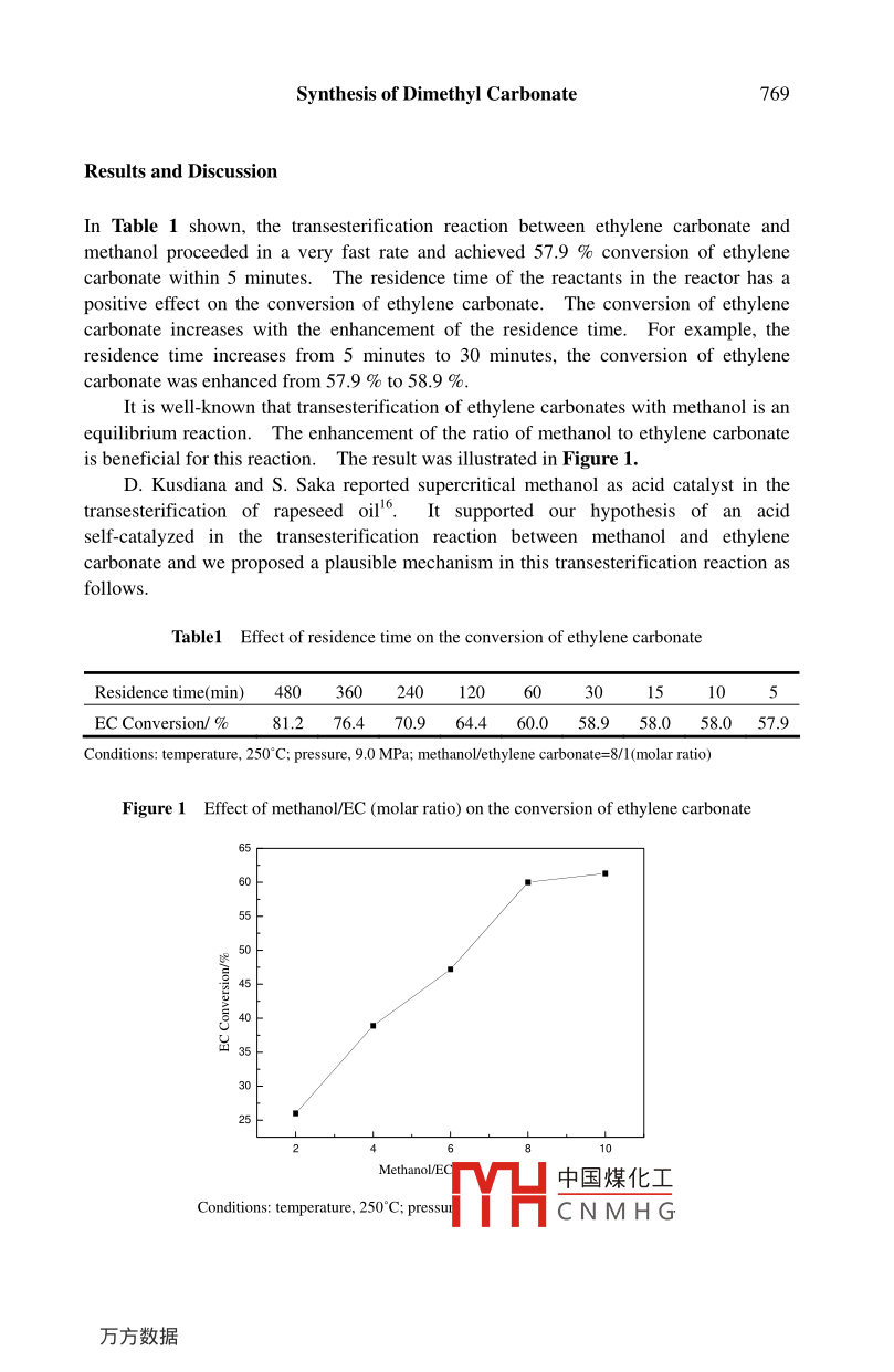 Chinese Chemical Letters Vol. 16, No.6, pp 767-770, 2005767http://www.imm.ac.cn/journal/ccl.htmlA New Process for Synthesis of Dimethyl Carbonate from EthyleneCarbonate and Methanol without any Catalyst underSupercritical ConditionsXiu Juan FENG, Xiao Gang LI, Ren HE*, Hui ZHOUState Key Laboratory of Fine Chemicals, Dalian University of Technology, Dalian 116012Abstract: Dimethyl carbonate was synthesized by transesterification reaction between ethylenecarbonate and methanol under supercritical conditions without any catalyst. Experimentalresults showed that the residence time and the molar ratio of methanol to ethylene carbonate allcan affect the conversion of ethylene carbonate. When the molar ratio of methanol to ethylenecarbonate was 8:1, 81.2 % conversion can be achieved at 9.0 MPa and 250C after 8 h.Keywords: Supercritial methanol, dimethyl carbonate, ethylene carbonate, transesterification.Dimethyl carbonate (DMC) has extensive applications as an environmentally benignsolvent, an octane booster in gasoline to meet oxygenate specifications and a precursorfor polycarbonate resins-. Also, it can be used as a substitute reagent of poisonousphosgene and dimethyl sulphate for carbonylation and methylation in organicsynthesis'4. DMC is mainly synthesized by oxidative carbonylation of methanol(non-phosgene route) or phosgenation of methanol (phosgene route). Both routesinvolve the use of poisonous or corrosive phosgene or carbon monoxide. DMC wasalso synthesized by transesterification reaction between ethylene carbonate andmethanol in the presence of a Lewis acid or base catalyst' "(Scheme 1). However, toour best knowledge, there is no report on the transesterification of ethylene carbonateand methanol for the synthesis of dimethyl carbonate in the absence of any catalystunder supercritical conditions. It is of great interest to study a practically possibleprocess without any catalyst.Scheme1H2C-0CH2OH2C- -CH2==0+2CHfOH二:二中國煤化工MHCNMHGE-mail: ho@ maildpt.ln.cn768Xiu Juan FENG et al.Recently, the use of supercritical fluids as substitute solvent has received muchattention because of their tunable solvent properties by variation of pressure andtemperaturel213.Furthermore, supercritical fluid may be a particularly advantageousreaction medium when it serves as both reactant and solvent. The improved rates forcatalytic hydrogenation of carbon dioxide to formic acid in supercritical conditionsprovided support for this approach'4. However, only limited reactions have beenexplored based on this ideal. Herein, we report an efficient synthesis of DMC fromsupercritical methanol/ethylene carbonate mixture without any catalyst. Supercriticalmethanol serves as both reactant and solvent.ExperimentalThe reactions were carried out in a 15 mL stainless steel autoclave reactor which hasinner diameter of 6 mm and length of 480 mm (Figure 1). In a typical procedure,methanol and ethylene carbonate mixture were put into the reactor. The reactorretained at a constant temperature and pressure. The effluent from the reactor wascooled and reduced to atmospheric pressure, then collected in a vessel. The conversionbased on ethylene carbonate was analyzed by gas chromatography method (Agilent6890,DB-FFAP30 mx0.25 mm, injection temp.=250°C, column temp.=200°C,detection temp.-=250"C, N2 flow rate =30 mL/min).Figure 1 Equipment used for the transesterification reaction(⑤)④-(671 [318中國煤化工CNM H G.(1) reactor, (2) oil bath, (3) electrical furnace, (4) te.JMH......._. pressure controlmonitor, (6) product exit valve, (7) condenser, (8) product collecting vessel.Synthesis of Dimethyl Carbonate769Results and DiscussionIn Table 1 shown, the transesterification reaction between ethylene carbonate andmethanol proceeded in a very fast rate and achieved 57.9 % conversion of ethylenecarbonate within 5 minutes. The residence time of the reactants in the reactor has apositive effect on the conversion of ethylene carbonate. The conversion of ethylenecarbonate increases with the enhancement of the residence time. For example, theresidence time increases from 5 minutes to 30 minutes, the conversion of ethylenecarbonate was enhanced from 57.9 % to 58.9 %.It is well-known that transesterification of ethylene carbonates with methanol is anequilibrium reaction. The enhancement of the ratio of methanol to ethylene carbonateis beneficial for this reaction. The result was illustrated in Figure 1.D. Kusdiana and S. Saka reported supercritical methanol as acid catalyst in thetransesterification of rapeseed oilo.It supported our hypothesis of an acidself-catalyzed in the transesterification reaction between methanol and ethylenecarbonate and we proposed a plausible mechanism in this transesterification reaction asfollows.Table1Effect of residence time on the conversion of ethy lene carbonateResidence time(min)48036040120503015105EC Conversion/ %81.276.4 .70.964.460.058.958.0 58.0 57.9Conditions: temperature, 250 C; pressure, 9.0 MPa; methanolethylene carbonate=8/ l(molar ratio)Figure 1 Effect of methano/EC (molar ratio) on the conversion of ethylene carbonate6055下o言4035 t30 F25Methano/EC中國煤化工Conditions: temperature, 250°C; pressul:TYHCNMHG770Xiu Juan FENG et al.Scheme 2CHzOHzocH,品甲H2c=o亡CHzO-C-O-CH2CH2OHCH2i.cH,0+ H+ cH,o-C-0-CH2CH,OH亡CH,O-C-0CH3 + HOCH2CH2OHIn conclusion, we found that DMC could be rapidly, successively synthesized fromsupercritical methanol/ethylene carbonate mixture in the absence of any catalyst. Inparticular, the reaction perfectly eliminates any problem probably caused by the use ofcatalysts, and completely conforms to“environmentally benign concept”.AcknowledgmentGratitude is expressed to the National Natural Science foundation of China (No. 20204002) andthe Natural Science Foundation of Liaoning Province (No.2003 1074) for financial support.References1. Y. Ono, Appl. Catal. A, 1997, 155, 133.M. A. Pacheco, C. L. Marshall, Energy Fuels, 1997, 11,2.S. Fujita, B. M. Bhana
