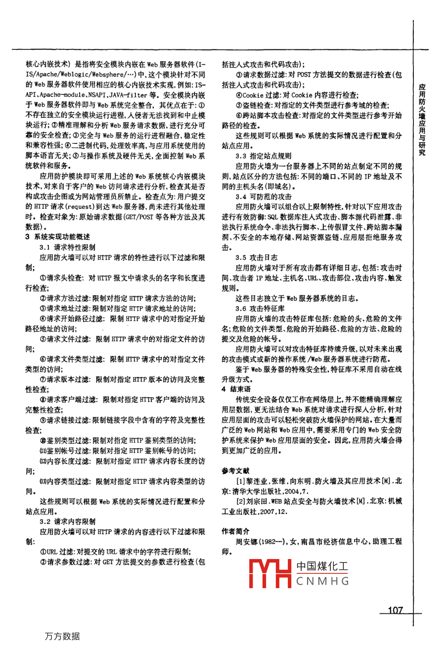 技廣場207應(yīng)用防火墻應(yīng)用與研究Application and Research of Application Firewall周安娜Zhou Anna(南昌市經(jīng)濟信息中心,江西南昌330038)(Nanchang Economic Information Center, Jiangxi Nanchang 330038)摘要:本文介紹了應(yīng)用防火墻對web應(yīng)用保護的實現(xiàn)方法,它成功地提高了整個網(wǎng)站運行的穩(wěn)定性和安全性,保證了用戶的安全可靠訪間,避免了黑客繞過網(wǎng)絡(luò)防火墻攻擊b應(yīng)用的可能。在網(wǎng)站信息化建設(shè)中,應(yīng)用防火墻將會發(fā)揮更大的安全穩(wěn)定的作用。關(guān)鍵詞:應(yīng)用防火墻;‰b應(yīng)用中圖分類號:TP393文獻標識碼:A文章編號:1671-4792-(2009)7-010602Abstract: The thesis introduces how to implement the protection of the web application by applicationfirewalls. It has increased the website's stability and security, and ensure users' safe access successful-y. It can also prevent hackers from attacking sites by detouring the firewall. The application firewallwill be more safe and stable in website information constructionKeywords: Application Firewall; Web Application0引宮網(wǎng)站。在實際情形中,不可能讓所有程序員在編寫所有Web現(xiàn)代的信息系統(tǒng),無論是建立對外的信息發(fā)布和數(shù)據(jù)交應(yīng)用程序時都注意防范這些漏洞況且部分漏洞是應(yīng)用程序換平臺還是建立內(nèi)部的業(yè)務(wù)應(yīng)用系統(tǒng)都離不開Web應(yīng)用。無法防范的,所以在大量而廣泛的Web網(wǎng)站和Web應(yīng)用中,Web應(yīng)用不僅給用戶提供一個方便和易用的交互手段,也給需要采用專門的應(yīng)用防火墻來保護Web應(yīng)用層面的安全信息和服務(wù)提供者構(gòu)建一個標準技術(shù)開發(fā)和應(yīng)用平臺可以1系統(tǒng)概述預(yù)計在相當長的一段時間內(nèi),Web應(yīng)用仍將是網(wǎng)絡(luò)應(yīng)用的最應(yīng)用防火墻可以實現(xiàn)對Web站點特別是Web應(yīng)用的保主要方式之護。它內(nèi)置于Web服務(wù)器軟件中,通過分析應(yīng)用層的用戶請網(wǎng)絡(luò)的發(fā)展歷史可以說是攻擊與防護不斷交織發(fā)展的求數(shù)據(jù)(如URL、參數(shù)、鏈接 Cookie等),區(qū)分正常用戶訪間過程。目前,全球網(wǎng)絡(luò)用戶已近20億,用戶利用互聯(lián)網(wǎng)進行Web和攻擊者的惡意行為,對攻擊行為進行實時阻斷和報購物銀行轉(zhuǎn)賬支付和各種軟件下載企業(yè)用戶更是依賴于警。這些攻擊包括利用特殊字符修改數(shù)據(jù)的數(shù)據(jù)攻擊設(shè)法網(wǎng)絡(luò)構(gòu)建他們的核心業(yè)務(wù),對此,Web安全性已經(jīng)提高到一執(zhí)行程序或腳本的命令攻擊等黑客通過這些攻擊手段可以個空前的高度。然而隨著黑客們將注意力從以往對網(wǎng)絡(luò)服達到算改數(shù)據(jù)庫和網(wǎng)頁繞過身份認證和假冒用戶、竊取用務(wù)器的攻擊逐步轉(zhuǎn)移到了對Web應(yīng)用的攻擊上,他們針對戶和系統(tǒng)信息等嚴重危害網(wǎng)站內(nèi)容安全的目的Web網(wǎng)站和應(yīng)用的攻擊愈演愈烈頻頻得手,根據(jù) Gartner應(yīng)用防火墻對常見的注入式攻擊跨站攻擊、上傳假冒的最新調(diào)查信息安全攻擊有75%都是發(fā)生在Web應(yīng)用而非文件不安全本地存儲非法執(zhí)行腳本、非法執(zhí)行系統(tǒng)命令、網(wǎng)絡(luò)層面上同時,數(shù)據(jù)也顯示三分之二的Web站點都相當資源盜鏈、源代碼泄漏URL訪問限制失效等攻擊手段都有脆弱易受攻擊。目前,利用網(wǎng)上隨處可見的攻擊軟件,攻擊有效的防護效果者不需要對網(wǎng)絡(luò)協(xié)議的深厚理解,即可完成諸如更換Web網(wǎng)應(yīng)用防火墻為軟件實現(xiàn)適用于所有的操作系統(tǒng)和Web站主頁盜取管理員密碼破壞整個網(wǎng)站數(shù)據(jù)等等攻擊而這服務(wù)器軟件,并且完全對Web應(yīng)用系統(tǒng)透明。些攻擊過程中產(chǎn)生的網(wǎng)絡(luò)層數(shù)據(jù),和正常數(shù)據(jù)沒有什么區(qū)2系統(tǒng)結(jié)構(gòu)設(shè)計方案應(yīng)用防火使用eb服條黑核心內(nèi)嵌技術(shù)來對所有用現(xiàn)階段很多傳統(tǒng)的安全設(shè)備僅僅工作在網(wǎng)絡(luò)層上并不戶請習中國煤化工被Web服務(wù)器軟件處能精確理解應(yīng)用層數(shù)據(jù),更無法結(jié)合Web系統(tǒng)對請求進行深理之育人分析針對應(yīng)用層面的攻擊可以輕松地突破防火墻保護的攻擊CNMHG進行檢查確保所有…眾力心內(nèi)嵌技術(shù)(以下簡稱106核心內(nèi)嵌技術(shù))是指將安全模塊內(nèi)嵌在Web服務(wù)器軟件(I-括注入式攻擊和代碼攻擊);IS/ Apache/ Weblogic/ Websphere/…)中,這個模塊針對不同③請求數(shù)據(jù)過濾對PsT方法提交的數(shù)據(jù)進行檢查(包的web服務(wù)器軟件使用相應(yīng)的核心內(nèi)嵌技術(shù)實現(xiàn),例如:IS-括注入式攻擊和代碼攻擊)API、 Apache-todule、 NSAPI、 JAVA-filter等。安全模塊內(nèi)嵌④ Cookie過濾:對 Cookie內(nèi)容進行檢查;于聊eb服務(wù)器軟件即與Web系統(tǒng)完全整合,其優(yōu)點在于:①④盜鏈檢查:對指定的文件類型進行參考域的檢查;不存在獨立的安全模塊運行進程,人侵者無法找到和中止模應(yīng)用防火墻應(yīng)④跨站腳本攻擊檢查對指定的文件類型進行參考開始墻塊運行;②精準理解和分析Web服務(wù)請求數(shù)據(jù),進行充分可路徑的檢查靠的安全檢查;完全與Web服務(w