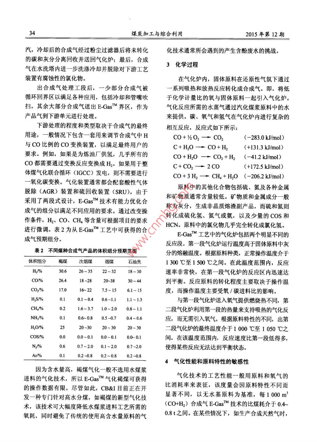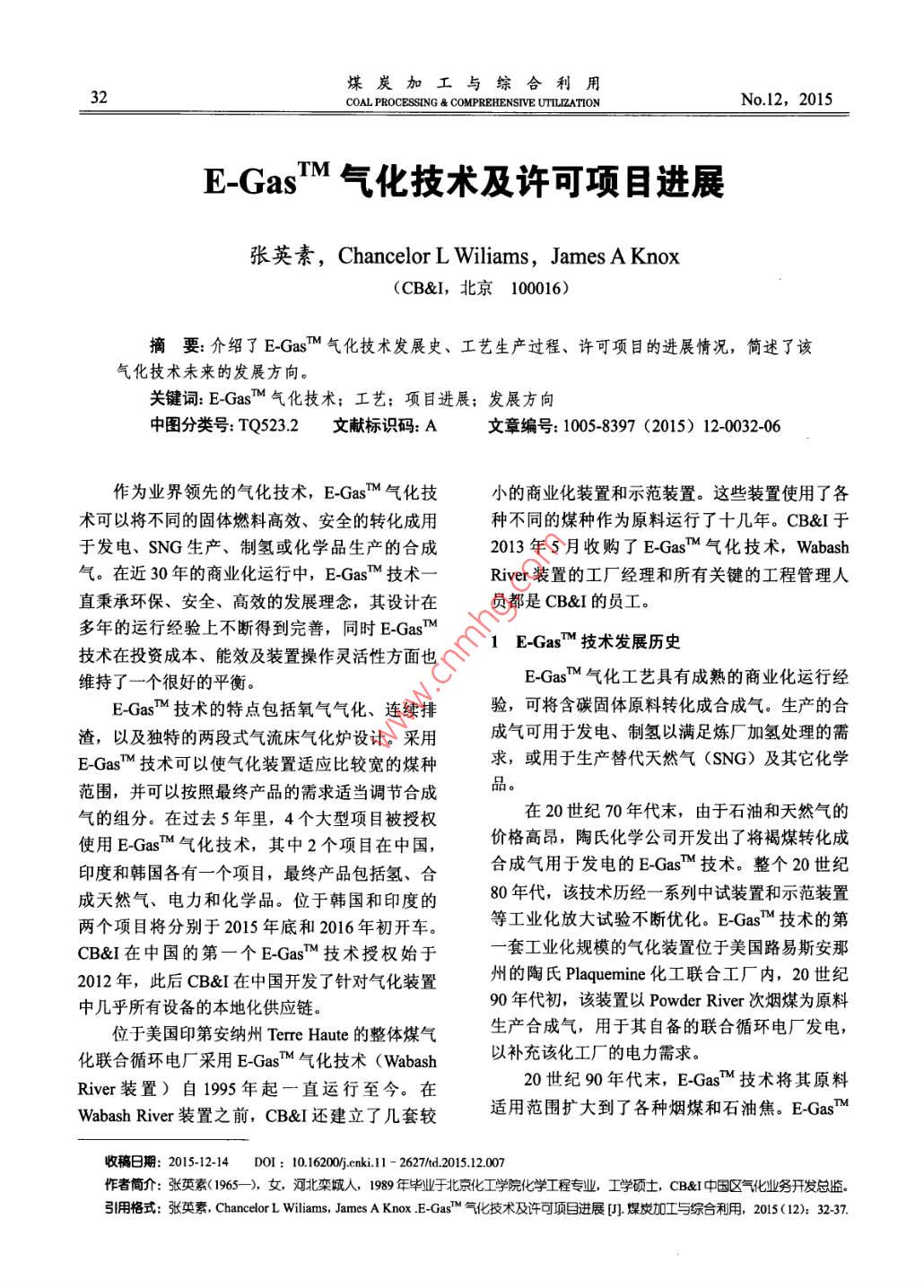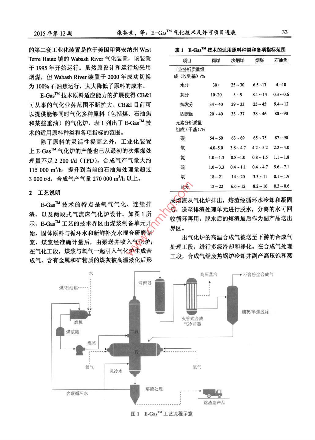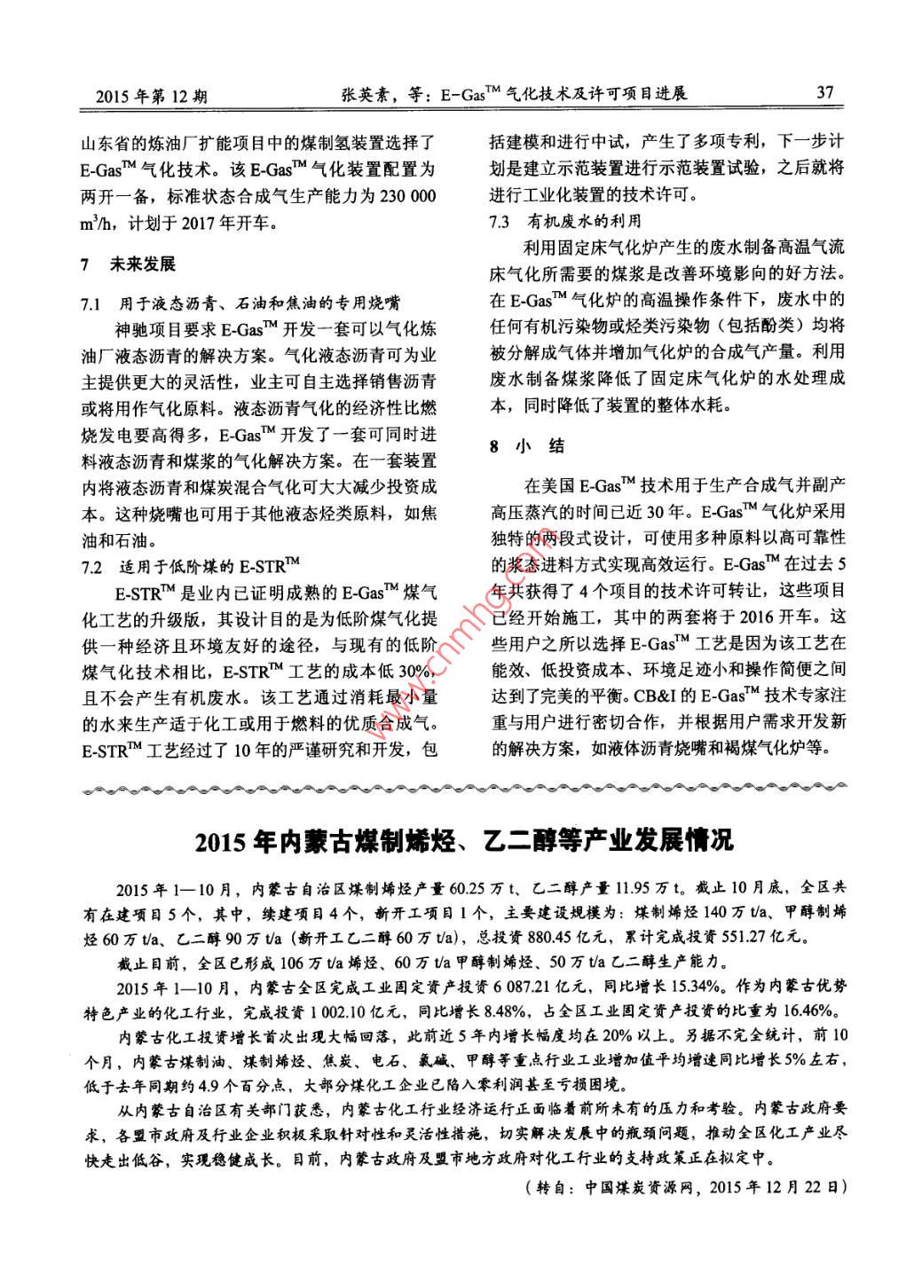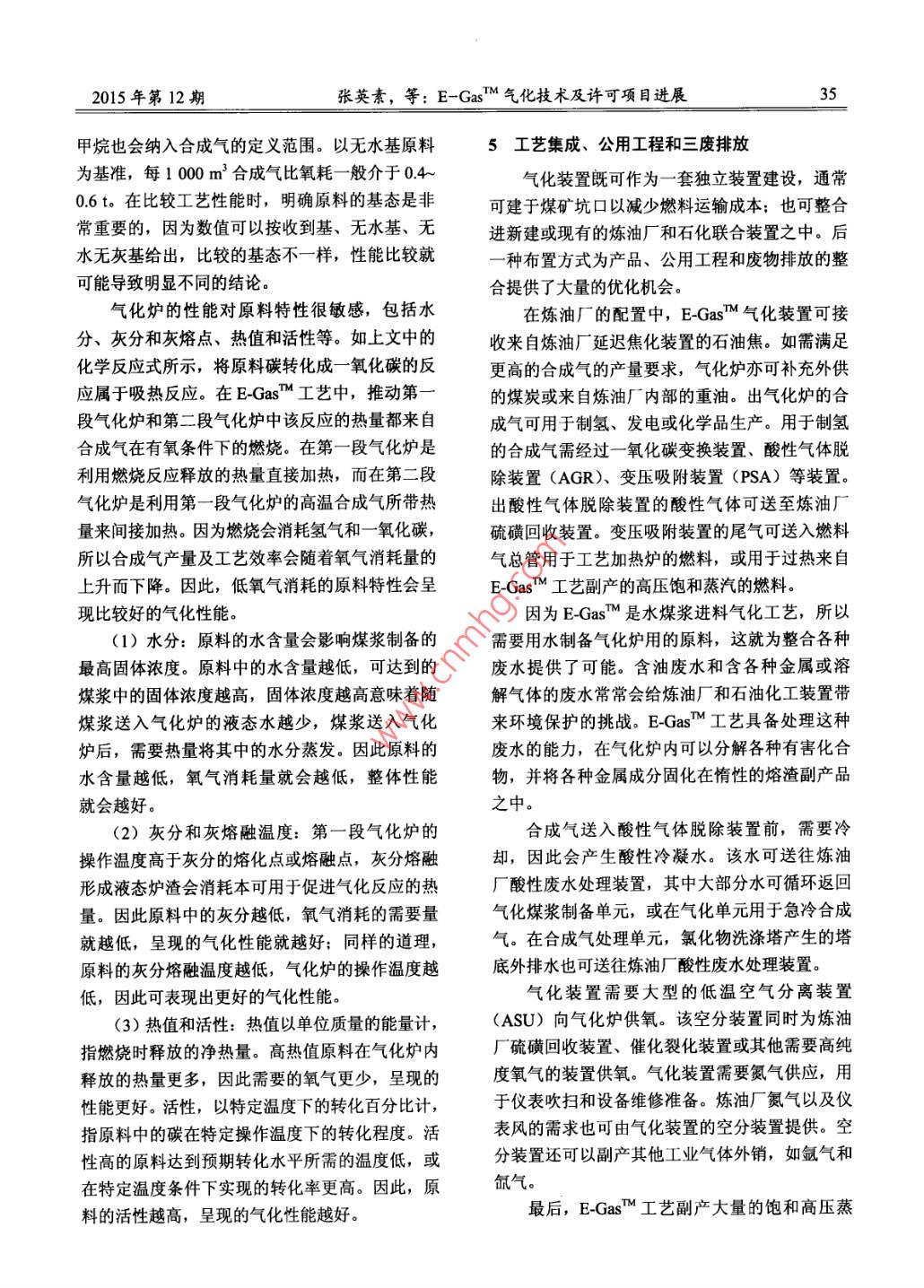 煤炭加工與綜合利用32COAL PROCESSING & COMPREHENSIVE UTILIZATIONNo.12, 2015E-GasTM氣化技術及許可項目進展張英素,Chancelor L Wiliams,James A Knox(CB&I,北京100016)摘要:介紹了 E-GasM氣化技術發(fā)展史、工藝生產(chǎn)過程、許可項目的進展情況,簡述了該氣化技術未來的發(fā)展方向。關鍵詞: E-GasTM 氣化技術;工藝;項目進展;發(fā)展方向中圖分類號: TQ523.2文獻標識碼: A .文章編號: 1005-8397 (2015) 12-0032-06作為業(yè)界領先的氣化技術,E-GasTM 氣化技小的商業(yè)化裝置和示范裝置。這些裝置使用了各術可以將不同的固體燃料高效、安全的轉(zhuǎn)化成用種不同的煤種作為原料運行了十幾年。CB&I于于發(fā)電、SNG生產(chǎn)、制氫或化學品生產(chǎn)的合成2013年5月收購了E-GasM氣化技術,Wabash氣。在近30年的商業(yè)化運行中,E-GasM 技術一River裝置的工廠經(jīng)理和所有關鍵的工程管理人直秉承環(huán)保、安全、高效的發(fā)展理念,其設計在員都是CB&I的員工。多年的運行經(jīng)驗上不斷得到完善,同時E-GasM1 EGasM 技術發(fā)展歷史技術在投資成本、能效及裝置操作靈活性方面也維持了一個很好的平衡。E-GasM氣化工藝具有成熟的商業(yè)化運行經(jīng)E-GasTM技術的特點包括氧氣氣化、連續(xù)排驗,可將含碳固體原料轉(zhuǎn)化成合成氣。生產(chǎn)的合渣,以及獨特的兩段式氣流床氣化爐設計。采用成氣可用于發(fā)電、制氫以滿足煉廠加氫處理的需E-GasM技術可以使氣化裝置適應比較寬的煤種求,或用于生產(chǎn)替代天然氣(SNG) 及其它化學范圍,并可以按照最終產(chǎn)品的需求適當調(diào)節(jié)合成品。氣的組分。在過去5年里,4個大型項目被授權.在20世紀70年代末,由于石油和天然氣的使用E-GasM氣化技術,其中2個項目在中國,價格高昂,陶氏化學公司開發(fā)出了將褐煤轉(zhuǎn)化成印度和韓國各有一個項目,最終產(chǎn)品包括氫、合合成氣用于發(fā)電的E-GasMM技術。整個20世紀成天然氣、電力和化學品。位于韓國和印度的80年代,該技術歷經(jīng)一系列中 試裝置和示范裝置兩個項目將分別于2015年底和2016年初開車。等工業(yè)化放大試驗不斷優(yōu)化。E-GasM 技術的第CB&I在中國的第一個E-GasM技術授權始于一套工業(yè)化規(guī)模的氣化裝置位于美國路易斯安那2012年,此后CB&I在中國開發(fā)了針對氣化裝置州的陶氏Plaquemine化工聯(lián)合工廠內(nèi),20世紀.90年代初,該裝置以Powder River次煙煤為原料中幾乎所有設備的本地化供應鏈。位于美國印第安納州Terre Haute的整體煤氣生產(chǎn)合成氣,用于其自備的聯(lián)合循環(huán)電廠發(fā)電,化聯(lián)合循環(huán)電廠采用E-GasM氣化技術(Wabash以補充該化工廠的電力需求。20世紀90年代末,E-GasT 技術將其原料River裝置)自1995年起一直運行至今。在Wabash River裝置之前,CB&I 還建立了幾套較適用范圍擴大到了各種煙煤和石油焦。E-GasM收稿日期: 2015-12-14 D0I: 1020/j.cnki.1 - 2627/d.2015.12.007作者簡介:張英素(1965- -),女河北欒域入,1989 年畢業(yè)于北京化工學院化學工程專業(yè),工學碩土, CB&I中國區(qū)氣化業(yè)務開發(fā)總監(jiān)。引用格式:張英素,Chancelor L Wiliams, James A Knox .E-Gas5m氣化技術及許可項目進展[J]煤炭加工與綜合利用,2015(12): 32-37.2015年第12期張英素,等: E-GasM 氣化技術及許可項目進展33的第二套工業(yè)化裝置是位于美國印第安納州West表1 E-GasM 技術的適用原料種類和各項指標范圍Terre Haute鎮(zhèn)的Wabash River 氣化裝置,該裝置褐煤次煙煤煙煤石油焦于1995年開始運行。雖然原設計和運行均采用工業(yè)分析質(zhì)量組煙煤,但Wabash River裝置于2000年成功切換成(收到基) 1%為100%石油焦運行,大大降低了原料的成本。水分30+25~30 6.5~17 4 ~10E-GasM技術原料適應能力的擴展使得CB&I灰分10-20 .5~98.1~14 0.3~0.6 :可從事的氣化業(yè)務范圍不斷擴大。CB&I目前可揮發(fā)分34~40 29~33 25~45 9.4 ~ 12以提供能夠同時氣化多種原料(包括煤、石油焦固定碳20~40 33~37 38~46 80~90和某些重油)的氣化爐,表1列出了E-GasM技元素分析質(zhì)量組成(千基)/%術的適用原料種類和各項指標的范圍。碳54~6063~69 65~75 87~90除了原料的靈活性提高之外,工業(yè)化裝置上E-GasM氣化爐的產(chǎn)能也已從最初的次煙煤處氫4.0-5.0 .3.8~4.7 4.2-5.2 2.2~4.0理量不足2 200 td (TPD),合成氣產(chǎn)氣量大約氮1.0~1.3 0.8~-1.0 0.8~1.5 1.1~1.81.0~3.3 0.4-1.1 0.4~4.7 5.6~7.1115000m2/h,提升到當前的石油焦處理量超過3 000t/d,合成氣產(chǎn)氣量270 000 m/h以上。18~2114~2033~11 0.1~1.912~22 6.6~12 8.2~16 0.3~0.62工藝說明E-GasM技術的特點是氧氣氣化、連續(xù)排成熔渣從氣化爐排出,熔渣經(jīng)循環(huán)水冷卻和凝固渣,以及兩段式氣流床氣化爐設計。如圖1所后,送至排渣處理單元進行脫水,分離的水可回示,E-GasM工藝的技術界區(qū)由煤漿制備單元開收循環(huán)再用,脫水后的熔渣最后作為副產(chǎn)品送出界區(qū)。始,固體原料與循環(huán)水和新鮮補充水混合研磨制出氣化爐的高溫合成氣被送至下游的合成氣漿,煤漿經(jīng)準確計量后,由泵送并噴入氣化爐;處理工段,進行多級冷卻和凈化。在合成氣處理在氣化工段,煤漿與氧氣- -起引入氣化爐生成合工段,合成氣經(jīng)廢熱鍋爐冷卻并副產(chǎn)高壓飽和蒸成氣,含有金屬和礦物質(zhì)的煤灰被高溫液化后形水高壓蒸汽+不含粉塵合成氣滯留器煤/石油焦-細灰/半焦脫除火管式合成磨村氣冷卻器