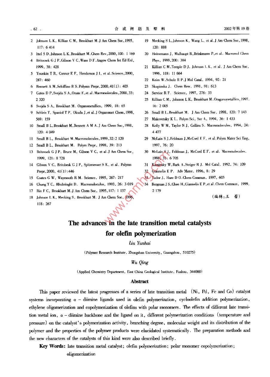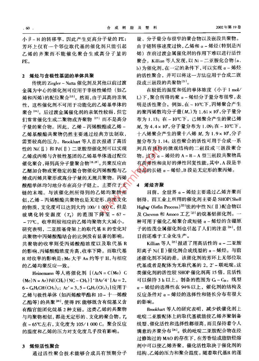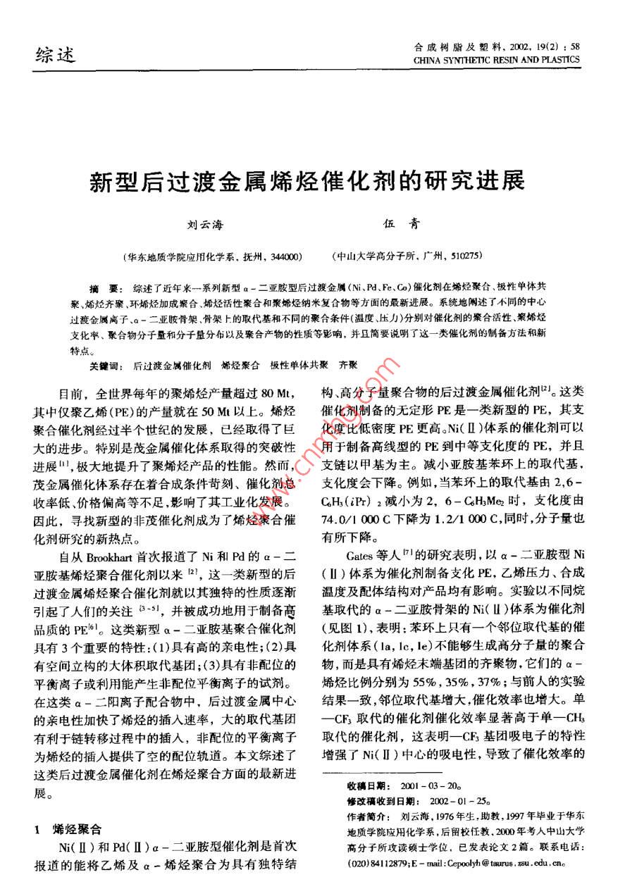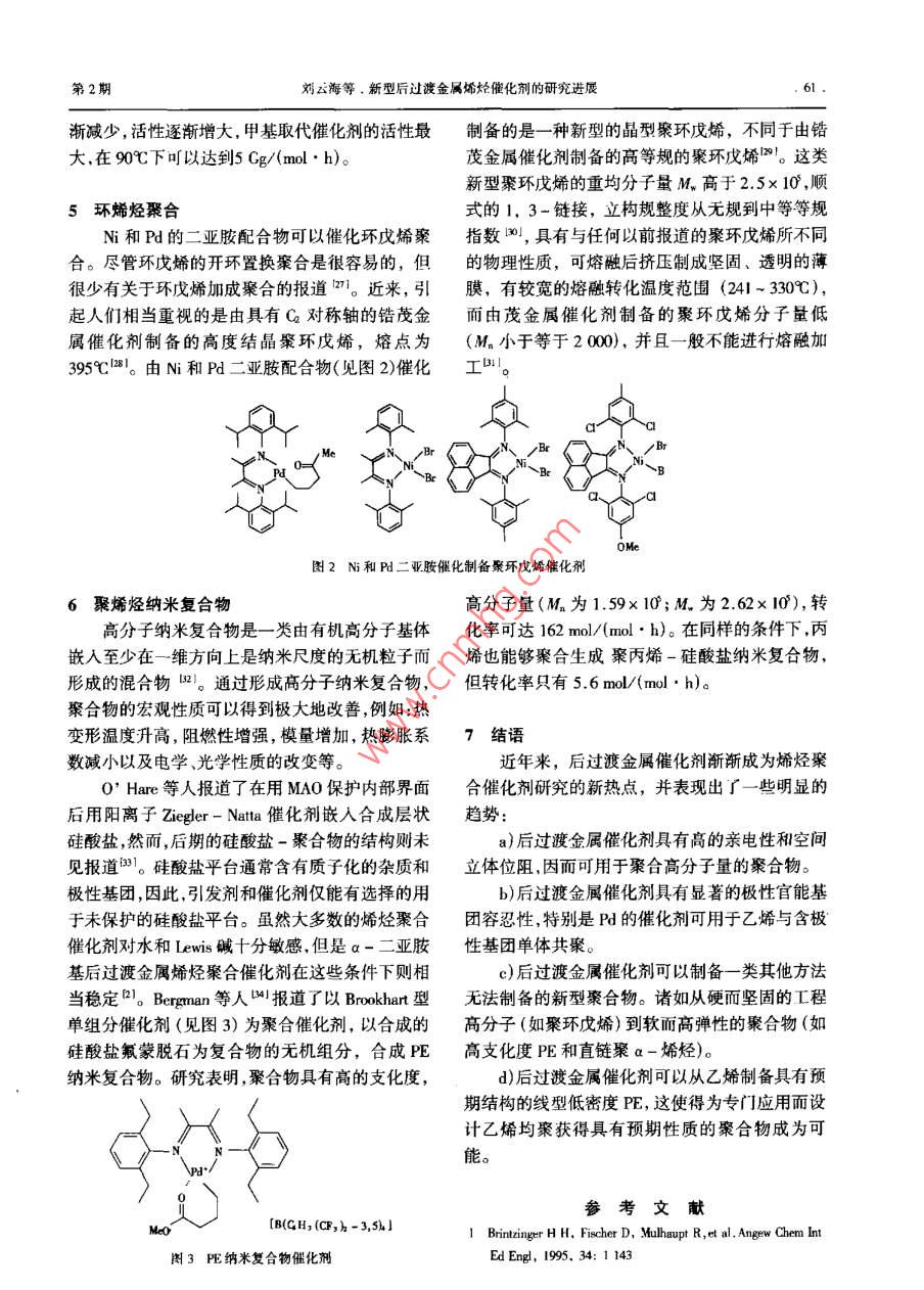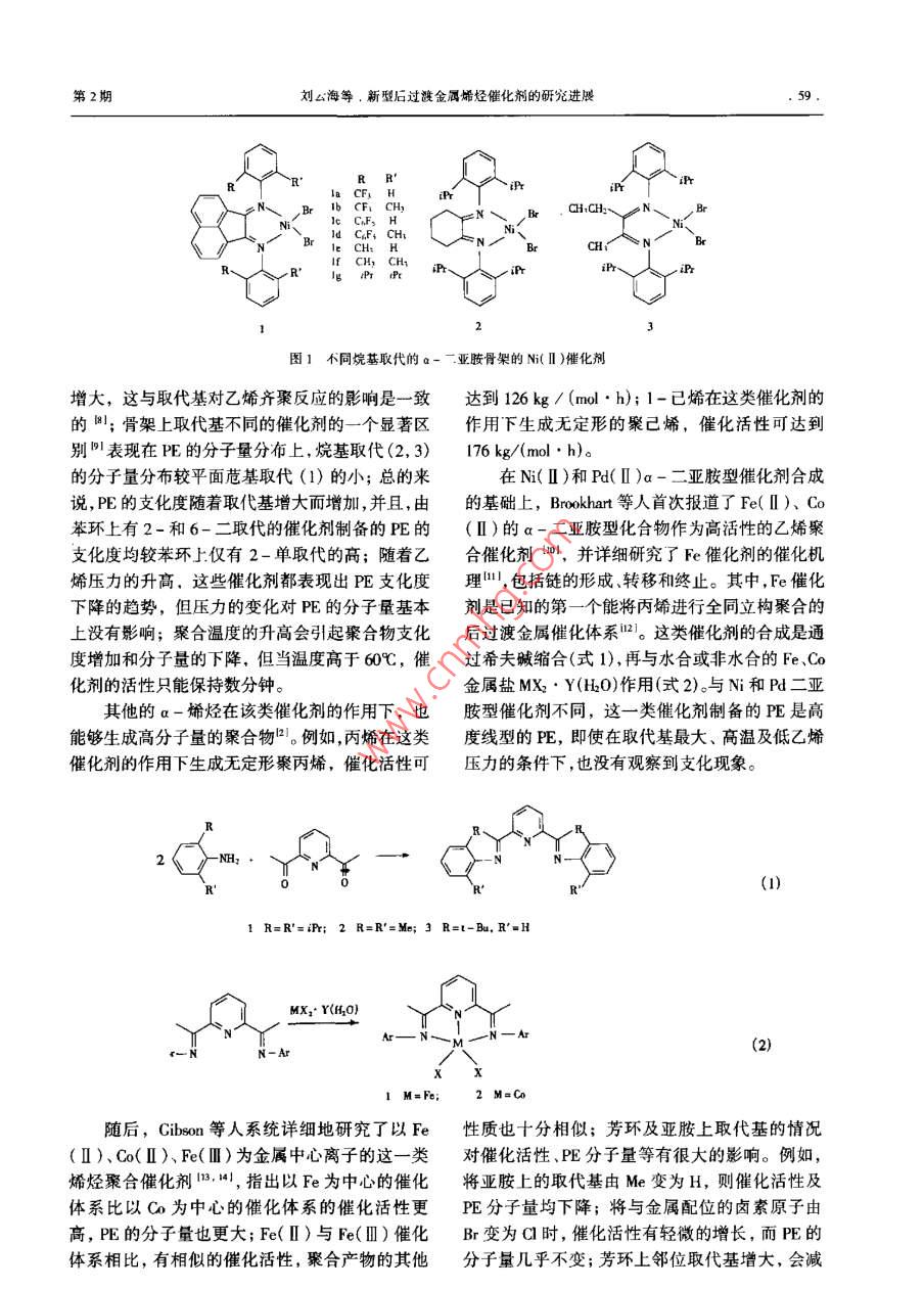 合成樹脂及塑料, 2002. 19(2) :58綜述CHINA SYNTHETC RESIN AND PLASTICS新型后過渡金屬烯烴催化劑的研究進展劉云海伍青(華東地質(zhì)學院應(yīng)用化學系,撫州,344000(中山大學高分子所,廣州,510275)摘要:綜述了近年來-系列新型a-二亞胺型后過渡金屬(Ni、Pd、Fe、Co)催化劑在烯烴聚合、極性單體共聚、烯烴齊窠、環(huán)晞烴加成緊合、烯烴活性聚合和聚烯烴納米復(fù)合物等方面的最新進展。系統(tǒng)地闡述了不同的中心過渡金屬離子.a-二亞膠骨架、骨架上的取代基和不同的聚合條件(溫度壓力)分別對催化劑的案合活性聚烯烴支化率、聚合物分子量和分子量分布以及聚合產(chǎn)物的性質(zhì)等影響,并且簡要說明了這-類催化劑的制備方法和新特點。關(guān)鍵詞:后過渡金屬催化劑烯烴聚合極性單體共聚 齊聚目前,全世界每年的聚烯烴產(chǎn)量超過80 Mt,構(gòu)、高分子量聚合物的后過渡金屬催化劑以。這類其中僅聚乙烯(PE)的產(chǎn)量就在50 Mt以上。烯烴催化劑制備的無定形PE是- -類新型的PE,其支聚合催化劑經(jīng)過半個世紀的發(fā)展,已經(jīng)取得了巨化度比低密度PE更高oNi(I)體系的催化劑可以大的進步。特別是茂金屬催化體系取得的突破性用于制備高線型的PE到中等支化度的PE,并且進展",極大地提升了聚烯烴產(chǎn)品的性能。然而,支鏈以甲基為主。減小亞胺基苯環(huán)上的取代基,茂金屬催化體系存在著合成條件苛刻、催化劑總支化度會下降。例如,當苯環(huán)上的取代基由2,6-收率低、價格偏高等不足,影響了其工業(yè)化發(fā)展。CH(iPr) 2減小為2, 6- CH3Mer時,支化度由因此,尋找新型的非茂催化劑成為了烯烴聚合催74.0/1 000C下降為1.2/1 000 C,同時,分子量也化劑研究的新熱點。有所下降。自從Brookhart首次報道了Ni和Pd的a-二Cates等人71的研究表明,以a-二亞胺型Ni亞胺基烯烴聚合催化劑以來21,這- -類新型的后(II)體系為催化劑制備支化PE,乙烯壓力、合成過渡金屬烯烴聚合催化劑就以其獨特的性質(zhì)逐漸溫度及配體結(jié)構(gòu)對產(chǎn)品均有影響。實驗以不同烷引起了人們的關(guān)注8-51, 并被成功地用于制備高基取代的a-二亞胺骨架的N(ll)體系為催化劑品質(zhì)的PEl61。這類新型a-二亞胺基聚合催化劑(見圖1),表明:苯環(huán)上只有一個鄰位取代基的催具有3個重要的特性:(1)具有高的親電性;(2)具化劑體系(Ia, le, le)不能夠生成高分子量的聚合有空間立構(gòu)的大體積取代基團;(3)具有非配位的物,而是具有烯烴末端基團的齊聚物,它們的a-平衡離子或利用能產(chǎn)生非配位平衡離子的試劑。烯烴比例分別為55% , 35% , 37%;與前人的實驗在這類a-二陽離子配合物中,后過渡金屬中心結(jié)果- -致,鄰位取代基增大,催化效率也增大。單的親電性加快了烯烴的插人速率,大的取代基團- CF3取代的催化劑催化效率顯著高于單一-CH有利于鏈轉(zhuǎn)移過程中的插人,非配位的平衡離子取代的催化劑,這表明一-CF 基團吸電子的特性為烯烴的插入提供了空的配位軌道。本文綜述了增強了Ni(I)中心的吸電性,導(dǎo)致了催化效率的這類后過渡金屬催化劑在烯烴聚合方面的最新進收稿日期: 2001- 03- 20。展。修改稿收到日期: 2002- 01-25。,作者簡介:劉云海, 1976年生,助教, 1997年畢業(yè)于華東1烯烴聚合地質(zhì)學院應(yīng)用化學系,后留校任教.2000年號人中山大學Ni(I)和Pd( I)a-二亞胺型催化劑是首次高分子所攻讀碩士學位,已發(fā)表論文2篇。聯(lián)系電話:報道的能將乙烯及a-烯烴聚合為具有獨特結(jié)(020)841 12879;E - mail:Cepolyh @ taurus。網(wǎng)u . edu . cno第2期劉c海等.新型后過渡金屬唏烴催化劑的研究進展.59.R’iP謝iPrBbeBrRgPPriPr~,iPr2圖1不同烷基取代的 a-一:亞胺骨 架的Ni( II )催化劑增大,這與取代基對乙烯齊聚反應(yīng)的影響是一致達到126 kg/ (mol●h); 1-已烯在這類催化劑的的圖;骨架上取代基不同的催化劑的-一個顯著區(qū)作用下生成無定形的聚己烯,催化活性可達到別"|表現(xiàn)在PE的分子量分布上,烷基取代(2, 3)176 kg/(mol●h)。的分子量分布較平面苊基取代(1)的小;總的來在Ni( I)和Pd( [)a-二亞胺型催化劑合成說,PE的支化度隨著取代基增大而增加,并且,由的基礎(chǔ)上,Brookhart 等人首次報道了Fe( I)、Co苯環(huán)上有2-和6-二取代的催化劑制備的PE的(I)的a-二亞胺型化合物作為高活性的乙烯聚支化度均較苯環(huán)上僅有2-單取代的高;隨著乙合催化劑Lu0I, 并詳細研究了Fe催化劑的催化機烯壓力的升高,這些催化劑都表現(xiàn)出PE支化度理",包括鏈的形成、轉(zhuǎn)移和終止。其中, Fe催化下降的趨勢,但壓力的變化對PE的分子量基本劑是已知的第一個能將丙烯進行全同立構(gòu)聚合的上沒有影響;聚合溫度的升高會引起聚合物支化后過渡金屬催化體系21。這類催化劑的合成是通度增加和分子量的下降,但當溫度高于60C,催過希夫堿縮合(式1),再與水合或非水合的Fe、Co化劑的活性只能保持數(shù)分鐘。金屬鹽MX2. Y(H20)作用(式2)。與Ni和Pd二亞其他的a-烯烴在該類催化劑的作用下,也胺型催化劑不同,這一類催化劑制備的PE是高能夠生成高分子量的聚合物口。例如,丙烯在這類度線型的PE,即使在取代基最大、高溫及低乙烯催化劑的作用下生成無定形聚丙烯,催化活性可壓力的條件下,也沒有觀察到支化現(xiàn)象。2(- NH:(1)1 R=R'=iPr; 2 R=R'=Me; 3 R=t-Bu, R'=HMX;* Y(H20)--Ar(2)tNN-A1 M=Fe;2 M=Co隨后,Cibso