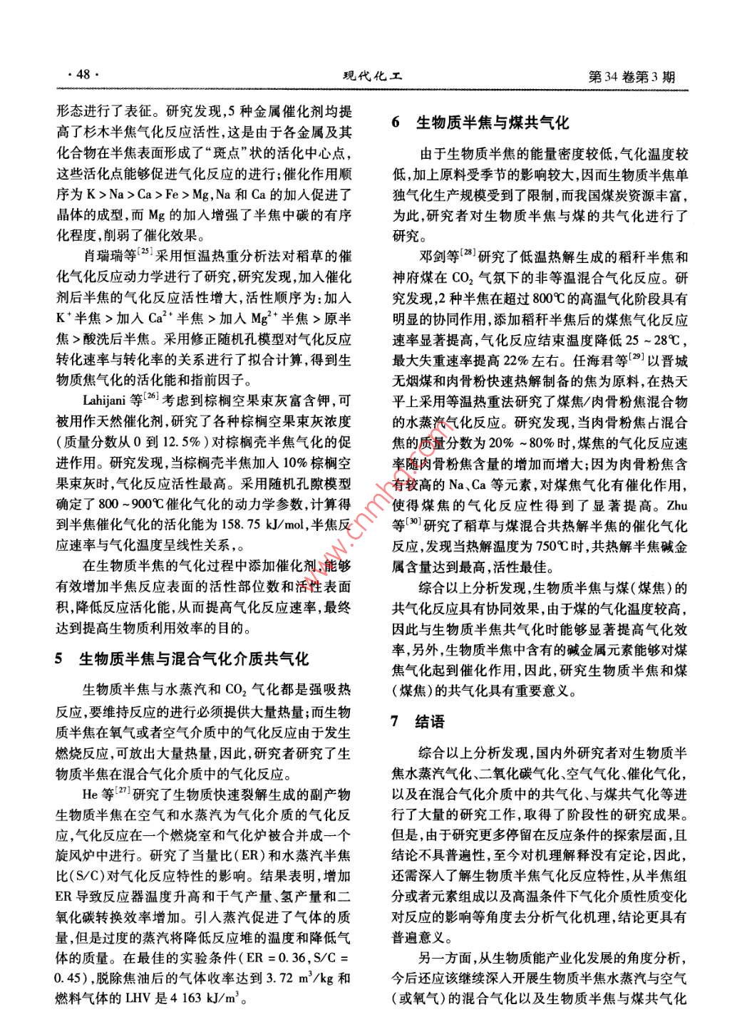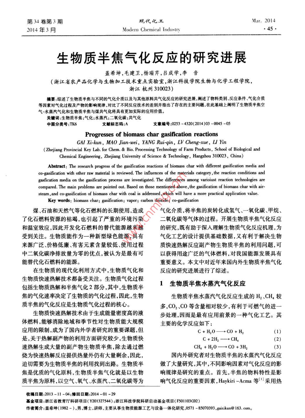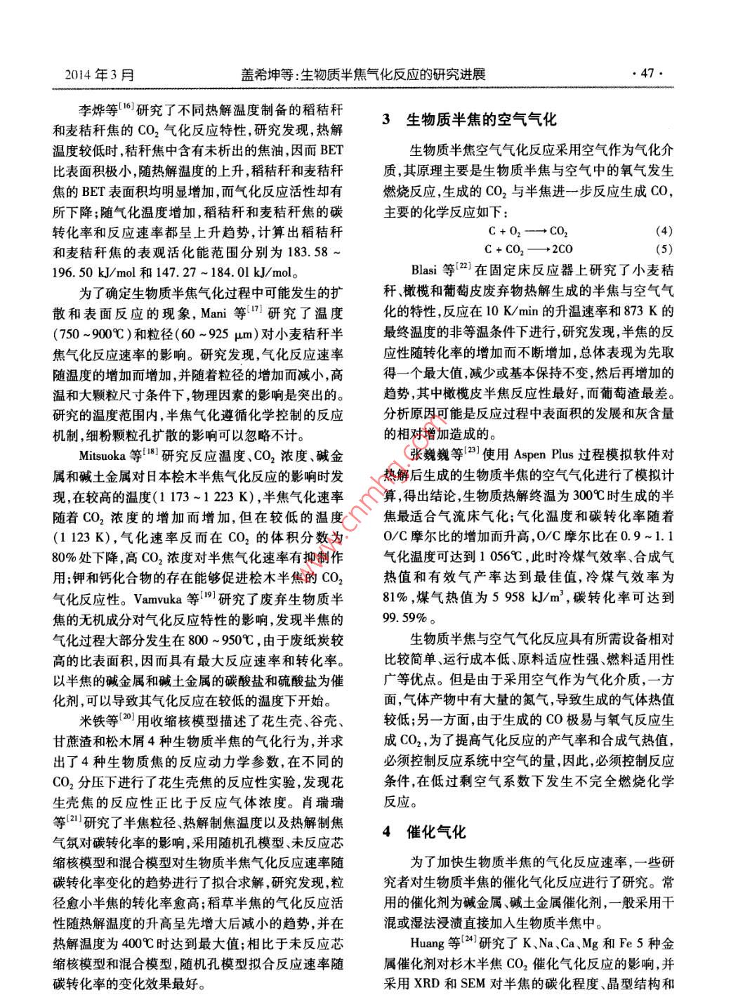 第34卷第3期現(xiàn)代化工Mar. 20142014年3月Modern Chemical Industry●45.生物質(zhì)半焦氣化反應(yīng)的研究進展蓋希坤,毛建衛(wèi),楊瑞芹,呂成學(xué),李音(浙江省農(nóng)產(chǎn)品化學(xué)與生物加工技術(shù)重點實驗室,浙江科技學(xué)院生物與化學(xué)工程學(xué)院,浙江杭州310023)摘要:綜述了生物質(zhì)半焦與不同的氣化介質(zhì)以及與其他原料共氣化反應(yīng)的研究進展,闡述了物料類別、反應(yīng)條件、氣化介質(zhì)等因素對氣化過程及產(chǎn)物的影響規(guī)律,對比了不同反應(yīng)技術(shù)的差別并指出了存在的主要問題.在此基礎(chǔ)上闡明了生物質(zhì)半焦空氣-水蒸汽氣化和生物質(zhì)半焦與煤共氣化將具有更加實際的應(yīng)用價值。關(guān)鍵詞:生物質(zhì)半焦;氣化;水蒸汽;二氧化碳;共氣化中團分類號:TK6文獻標(biāo)志碼:A文章編號:02533 - 4320(2014)03 -0045 -05Progresses of biomass char gasification reactionsGAI Xi-kun, MAO Jian-wei, YANG Rui-qin, LV Cheng-xue, LI Yin(Zhejiang Provincial Key Lab. for Chem. & Bio. Processing Technology of Farm Products, School of Biological andChemical Engineering, Zhejiang University of Science & Technology, Hangzhou 310023 , China)Abstract: The research progress of the gasifcation reactions of biomass char with different gasification media andco-gasification with other raw material is reviewed. The influences of the materials category , the reaction conditions andgasfication media on the gasification process are investigated. The differences among varioiust reaction technologies arecompared. The main problems are pointed out. Based on those mentioned above , the gasification of biomass char with air-steam , and co-gasification of biomass char with coal is addressed, which will have a more practical application value.Key words: biomass char; gasification; vapor; carbon dioxide; co-gasifcation煤、石油和天然氣等化石燃料的長期使用,造成氣化介質(zhì),將半焦的炭轉(zhuǎn)化成氫氣、- -氧化碳、甲烷、了化石燃料資源的枯竭,也引起了嚴重的環(huán)境污染二氧化碳等氣體的過程。開展生物質(zhì)半焦氣化反應(yīng)和溫室效應(yīng),因此開發(fā)化石燃料的替代能源越來越的研究,既有助于深入理解生物質(zhì)氣化反應(yīng)機理,為受到關(guān)注。生物質(zhì)能作為一種新型綠色能源,具有氣化工藝的設(shè)計提供基礎(chǔ)數(shù)據(jù),又有利于解決生物來源廣泛、價格低廉、有害元素含量較低、使用過程質(zhì)快速熱解反應(yīng)副產(chǎn)物生物質(zhì)半焦的利用問題,可中二氧化碳凈排放量為零的優(yōu)點,被認為是最有可以獲得用途廣泛的氣體燃料,對我國能源發(fā)展具有能替代化石燃料的能源。重要意義。本文中對近年來國內(nèi)外生物質(zhì)半焦氣化在生物質(zhì)的現(xiàn)代化利用方式中,生物質(zhì)氣化和反應(yīng)的研究進展進行了綜述。生物質(zhì)快速熱解技術(shù)都備受關(guān)注。生物質(zhì)氣化過程1生物 質(zhì)半焦水蒸汽氣化反應(yīng)包括生物質(zhì)熱解和半焦氣化2部分,其中,生物質(zhì)半焦的氣化速率決定了生物質(zhì)的氣化過程,因此,生物生物質(zhì)半焦水蒸汽氣化反應(yīng)生成的H2、CH,較質(zhì)半焦的氣化反應(yīng)是生物質(zhì)氣化過程的核心。多,CO2、CO等含量相對較少,有利于可燃氣的進一生物質(zhì)快速熱解技術(shù)由于生成能量密度高的液步處理,因而是最有應(yīng)用前景的一種氣化工藝。其體燃料,能夠消除地域和季節(jié)性對生物質(zhì)能大規(guī)模主要的化學(xué)反應(yīng)如下:應(yīng)用的限制,成為了國內(nèi)外學(xué)者研究的重要課題,但C+H20- +CO + H2(1)是,關(guān)于熱解副產(chǎn)物的利用方面研究較少,生物質(zhì)快C+2H2→CH,(2)速熱解生成大量的副產(chǎn)物生物質(zhì)半焦,除去通過燃CH, + H20-→C0 + 3H2(3燒為快速熱解反應(yīng)提供熱量外仍有大量剩余,因此,國內(nèi)外研究者對生物質(zhì)半焦的水蒸汽氣化反應(yīng)迫切需要為生物質(zhì)半焦的利用找到出路。生物質(zhì)半做了大量研究,其中,不同影響因素對氣化反應(yīng)的影焦是優(yōu)質(zhì)的氣化原料,生物質(zhì)半焦氣化就是以生物響規(guī)律是研究的重點。首先,半焦的物料特性是影質(zhì)半焦為原料,以空氣、氧氣、水蒸汽、二氧化碳等為響氣化反應(yīng)的重要因素, Haykiri -Acma等"采用熱收稿日期:2013 -11 -04;修回日期:2014-01 -29基金項目:浙江省教育廳科研項目( Y201327544) ;浙江科技學(xué)院科研啟動基金項目( F501103002)作者簡介:蓋希坤(1982 -),男,博士,講師,主要從事生物質(zhì)能源工藝與設(shè)備-體化研究 ,0571 - 85070393 ,gaixikun@ 163. com。2014年3月蓋希坤等:生物質(zhì)半焦氣化反應(yīng)的研究進展●47.李燁等[16]研究了不同熱解溫度制備的稻秸稈3生物質(zhì)半焦的空氣氣化和麥秸稈焦的CO2氣化反應(yīng)特性,研究發(fā)現(xiàn),熱解溫度較低時,秸稈焦中含有未析出的焦油,因而BET生物質(zhì)半焦空氣氣化反應(yīng)采用空氣作為氣化介比表面積極小,隨熱解溫度的上升,稻秸稈和麥秸稈質(zhì),其原理主要是生物質(zhì)半焦與空氣中的氧氣發(fā)生焦的BET表面積均明顯增加,而氣化反應(yīng)活性卻有燃燒反應(yīng),生成的CO2與半焦進一步反應(yīng)生成CO,所下降;隨氣化溫度增加,稻秸稈和麥秸稈焦的碳主要的化學(xué)反應(yīng)如下:轉(zhuǎn)化率和反應(yīng)速率都呈上升趨勢,計算出稻秸稈C+O2-
