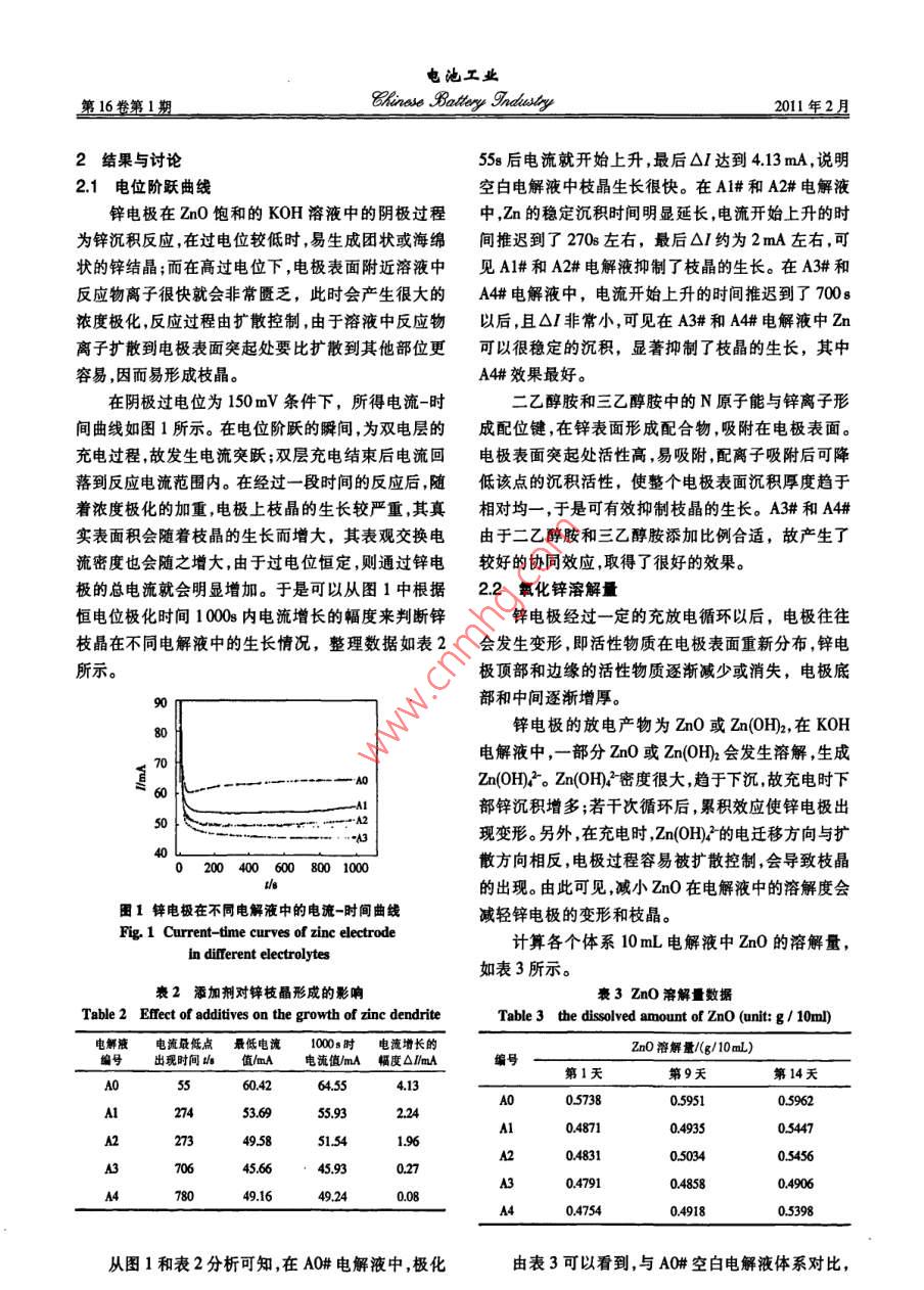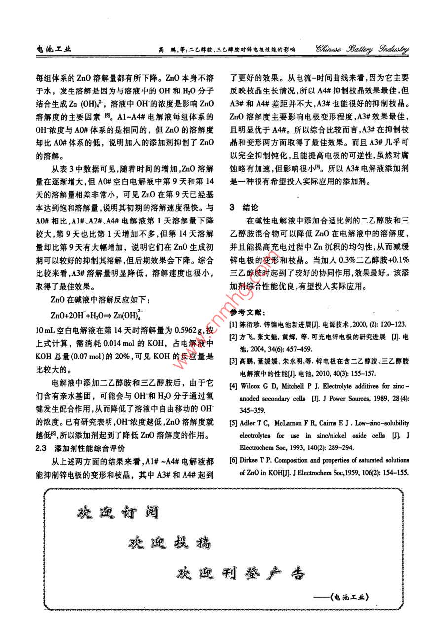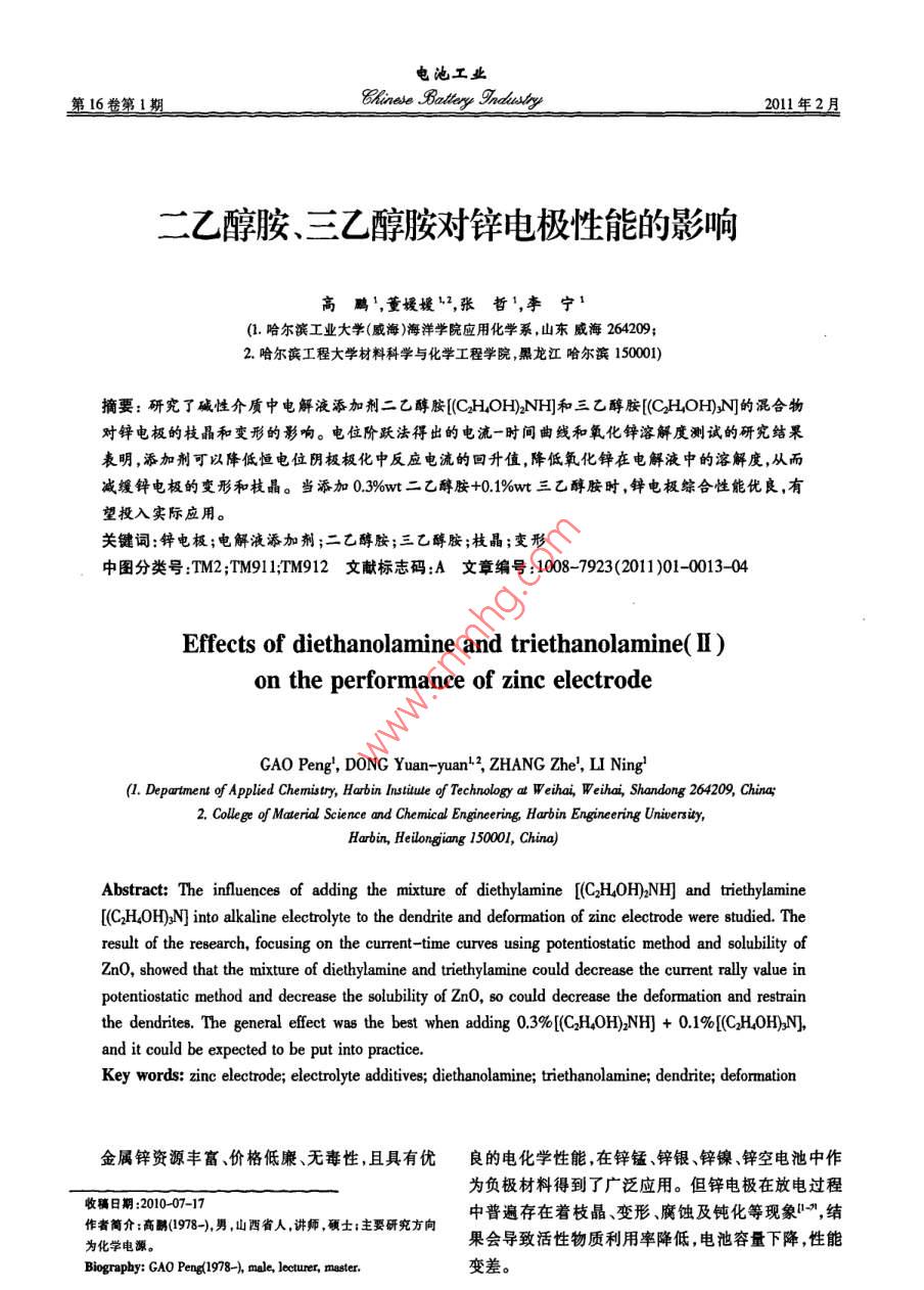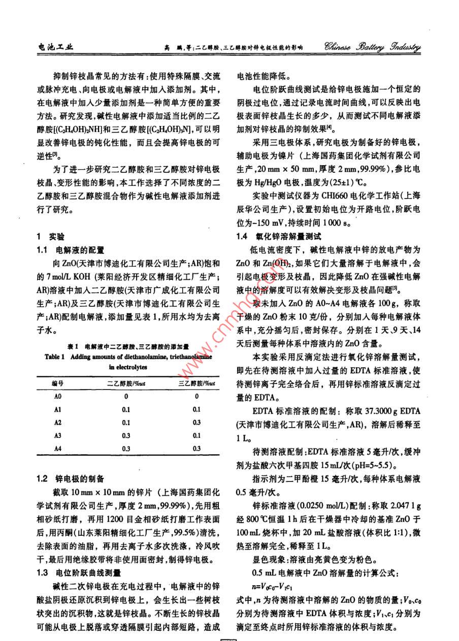 二乙醇胺、三乙醇胺對(duì)鋅電極性能的影響 二乙醇胺、三乙醇胺對(duì)鋅電極性能的影響