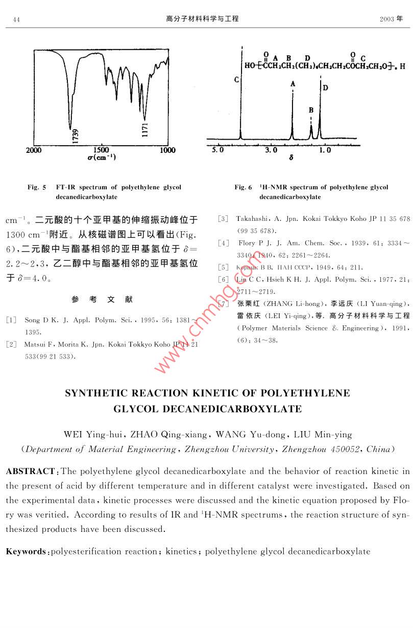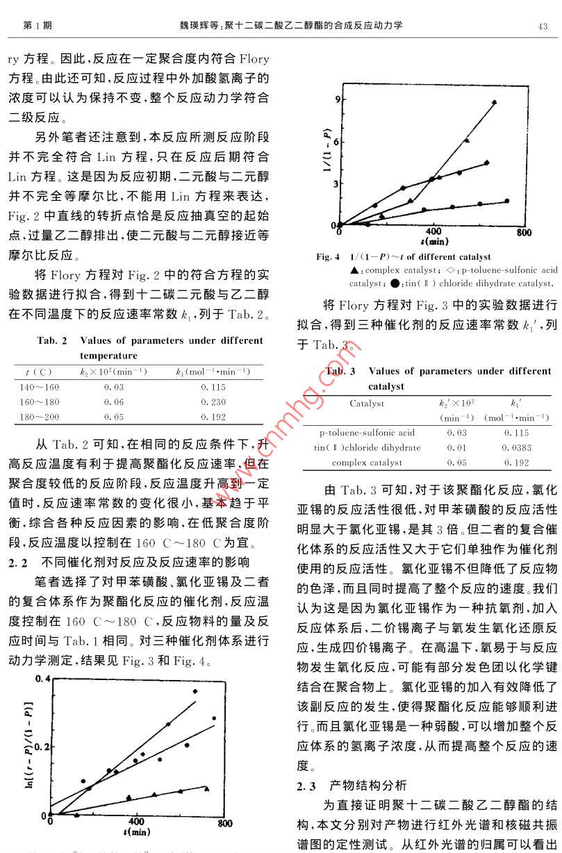 第19卷第1期高分子材料科學與工程Vol. 19. No. 12003 FF1 POLYMER MATERIALS SCIENCE AND ENGINEERINGJan.2003聚十二碳二酸乙二醇酯的合成反應動力學魏瑛輝,趙清香,王玉東,劉民英(鄭州大學材料工程系,河南鄭州450052)摘要:在不同的反應溫度和催化劑體系下,研究了十二碳二酸與乙二醇的外加強酸催化劑的聚酯化反應動力學,在反應控制階段,動力學過程符合 Flory方程。通過紅外光譜和核磁譜圖,討論了合成反應產(chǎn)物的結構。關鍵詞:聚酯化反應;動力學;聚十二碳二酸乙二醇酯中圖分類號:O631.5文獻標識碼:A文章編號:1000-7555(2003)01-0041-04脂肪族長碳鏈聚酯因其主鏈柔順性較大,淄博廣通化工有限公司生產(chǎn);乙二醇:二級,北生物降解速度較快,適于作為藥物緩釋體系、手京化工廠產(chǎn)品,用前經(jīng)氫氧化鈉和4A分子篩術中的可吸收固定材料,以及能控制除草劑、農(nóng)干燥后減壓蒸餾;其它溶劑和試劑均為分析純,藥釋放速度的生物可降解材料。通過改性得直接使用。到的脂肪族共聚酯,其熱性能、耐溶劑性、力學1.2分析測試強度等性能均大幅度提高,在纖維、薄膜、粉末使用 Nicolet460紅外光譜儀,KBr壓片法凃料、熱熔膠等方面有潛在的廣泛用途·。進行紅外光譜測試;使用 Bruker dpx400高頻關于聚二元酸酯系列脂肪族聚酯的合成反核磁共振儀,以CDCl3為溶劑,四甲基硅烷為應動力學,不少學者如 Flory,kopaκ等都內(nèi)標進行核磁共振測試;動力學數(shù)據(jù)通過酸值曾作過研究,其中沿用時間較長的是 Flory方測定確定。程。但是由于不同研究者所采用的研究、分析鑒1.3十二碳二酸乙二醇酯的縮合聚合反應定方法不同,或者對進行動力學分析時條件的1.3.1聚十二碳二酸乙二醇酯的合成:將十二復雜性估計不足,導致了許多不同的反應動力碳二元酸、乙二醇、催化劑在通氮氣條件下于指學結論。1977年,Lin等人也提出了他們自己定溫度反應5h,然后在約9.7×10Pa真空度的聚酯化動力學方程。本文以生物發(fā)酵法合成下繼續(xù)反應8h即得產(chǎn)物,冷至室溫后測定酸的十二碳二元酸為原料,通過與乙二醇的酯縮值。催化劑選用對甲苯磺酸,氯化亞錫及其復合合反應,制得一種新型的可降解材料。有關直接體系。具體合成條件見Tab.1。熔融縮聚法合成長碳鏈脂肪族聚酯的硏究未見Tab. I Synthetic condition of polyethylene報道,鑒于其在生物可降解材料方面具有廣闊glycol decanedicarboxylate的應用前景,研究其合成和合成反應動力學具No. Decamethylene Glycol t有現(xiàn)實意義acid (g11.533.2712140~1600.7611,533,2712160~1800,891實驗部分11.533.2712180~2000.901.1主要試劑P is the extent of reaction十二碳二元酸:石油生物發(fā)酵法制備,山東高分子材料科學與工程2003年1.3.2動力學測定:在裝有磁力攪拌器、溫度1/(1-P)=C,kt+1計和回流冷凝管的100mL三口瓶中,加入十式中:k=kK。k;C元酸初始濃度;碳二元酸、乙二醇和催化劑,在氮氣保護下加K二元酸的表觀電離常數(shù);k=[Ha+熱至140C~180C,攪拌反應5h,然后升溫OH],[Ha+]—二元酸電離的氫離子濃度。至160C~200C于9.7×10Pa真空度條件繼續(xù)反應7h。在規(guī)定的反應時間內(nèi),定時取樣。冷卻后的樣品溶解于丙酮中,反應后期兩個樣品溶解于丙酮與氯仿的混合溶劑中,用molL的KOH-甲醇標準溶液滴定,以DDS-11型電導儀在滴定過程中測定不同的電導值,作圖確定滴定終點,用酸值(扣除催化劑的影響)來表示羧基的轉化率。結果與討論Fig. I In [(r-P)/(1-P)]-t of different reaction實驗觀察到,十二碳二元酸在自催化反應temperature中,反應速率極小,反應10h后,體系粘度無明140C~160C;□:160C~180C;▲180C~200C顯變化。這主要是因為十二碳二元酸的電離常數(shù)非常小(18C時的電離常數(shù)為K1=2.0×0-6),不足以提供足夠高濃度的氫離子。而根據(jù)聚酯化反應是氬離子催化機理,氫離子濃度的大小直接決定反應速率的大小,因此十二碳二元酸必須在酸催化下與二元醇進行聚酯化反應,本體系選用對甲苯磺酸作為催化劑,由于在取樣過程體系中會引入氧,高溫下易發(fā)生副反應,使產(chǎn)物色污,給動力學處理帶來較大的誤1000差。通過加入氯化亞錫,明顯降低了副反應的發(fā)Fig2 1/(1-P)-t of different reaction temperature生,可以在不考慮副反應的情況下進行動力學◇:140C~160C;▲:160C~180C;●:180C~200C處理。2.1不同溫度下的縮聚反應及其表觀反應速縮聚反應的合成條件見Tab.1。將反應結率常數(shù)7。果分別按 Flory方程和Lin方程作圖,得到酯化反應是氫離子催化,總的速率方程為Fig.1,Fig.2。由圖可知,在以對甲苯磺酸與氯化亞錫為復合催化劑時,本反應所測反應階段式中,真實反應速率常數(shù)它是溫度的函基本符合Fory方程,但實驗數(shù)據(jù)在反應起始數(shù)在有外酸催化時 Flory將[H+看成恒定,反應初期(約5h)不符合下ry的動力學方程,他所得的速率方程為隨著反應聚合度的增加,反應在一定聚合度內(nèi)d[COOH/dt=k1[COOH]OH]積分得符合 Flory方程。這是因為反應初期體系的氫離子濃度比較復雜,無合適的酸值函數(shù)來計算ln[(r-P)/(1-P)]=k2t+k羧酸的濃度。而反應后期,聚合度增加,反應混r=[OH Jo/[COOH o,k,=a k,, a=OH]合物的粘度增加,水分子脫除困難,在真空度保LCOOH],ko=-In(1/r)持不變的情況下,即使增大攪拌諫度,也不易使Lin則認為外酸催化時的速率方程為微的水公子擴出去世時“擴散控制”效應魏瑛輝等:聚十二碳二酸乙二醇酯的合成反應動力學ry方程。因此,