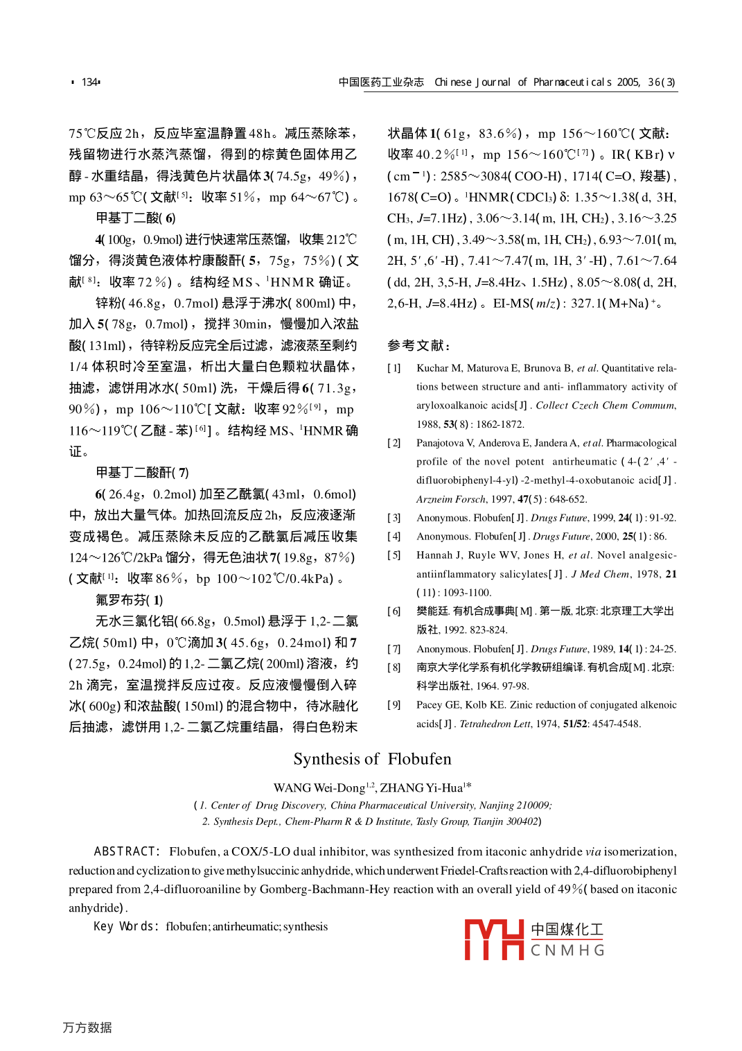 中國醫(yī)藥工業(yè)雜志Chi nese J ournal of Pharnaceuti cal s 2005, 36(3)133■氟羅布芬的合成王未東12,張奕華1*(1.中國藥科大學(xué)新藥研究中心,江蘇南京210009; 2.天津天土力集團(tuán)化學(xué)研究所合成室,天津300402)摘要:用衣康酸酐經(jīng)異構(gòu)化、還原、環(huán)合得到甲基丁二酸酐,與由2,4-二氟苯胺經(jīng)Gomberg-Bachmann-Hey反應(yīng)得到的2,4-二氟聯(lián)苯進(jìn)行付-克反應(yīng),制得COX/5-LO雙重抑制劑氟羅布芬,總收率49%(以衣康酸酐計(jì))。關(guān)鍵詞:氟羅布芬;類風(fēng)濕性關(guān)節(jié)炎治療藥物;合成中圖分類號(hào)R971+. 1文獻(xiàn)標(biāo)識(shí)碼A文章編號(hào)1001- 8255( 2005)03- 0133- 02氟羅布芬( flobufen, 1), 化學(xué)名為2' ,4'-二氟-(3)與甲基丁二酸酐( 7)進(jìn)行付-克反應(yīng)得到1,并進(jìn)a-甲基_γ_氧代-[1,1'-聯(lián)苯]丁酸,是由捷克共和國行了改進(jìn)。文獻(xiàn)(5]用柱色譜分離純化3,本文改在VUFB公司研發(fā)的類風(fēng)濕性關(guān)節(jié)炎治療藥物,現(xiàn)正反應(yīng)結(jié)束后蒸干溶劑,殘留物用水蒸汽蒸餾后再用處于1II期臨床。本品除能抑制環(huán)氧合酶( COX)和5-乙醇-水重結(jié)晶,簡化了操作。7的制備,可用2-脂氧合酶( 5-LO)外,還能通過調(diào)節(jié)各種細(xì)胞因子水平溴丙酸乙酯與氰乙酸乙酯經(jīng)縮合、水解、脫羧、脫起到免疫調(diào)節(jié)作用,對(duì)急慢性炎癥均有-定療效[1+4。水等反應(yīng)得到(6],或用2-丁烯酸乙酯經(jīng)加成、水每天單劑量口服125mg 的抗炎活性與吡羅昔康解、脫水反應(yīng)制得[7],但均存在原料不易得、試劑( piroxicam)相當(dāng),優(yōu)于雙氯芬酸( diclofenac)和布洛劇毒及反應(yīng)條件苛刻等不足。本文參考文獻(xiàn)8.],用芬( ibuprofen),胃腸道副作用明顯小于雙氯芬酸和衣康酸酐( 4)經(jīng)異構(gòu)化、還原和脫水反應(yīng)制得7,原吡羅昔康,藥效可持續(xù)48h。料易得,適于放大生產(chǎn)。改進(jìn)后1的總收率為49%本文參考文獻(xiàn)1.5] ,用2,4-二氟苯胺( 2)經(jīng)(以4計(jì))。Gomberg- Bachmann-Hey反應(yīng)得到的2,4-二氟聯(lián)苯,F(xiàn)FCHCH(CH)CH2CH2ONO3200-215 C.CHCOCI常壓快速蒸餾OH3+7- AIChCICH,CH,CI F-一CH2- -CH-COOHCH3圖11的合成路線Impact 410型紅外光譜儀,KBr壓片。Bruker ACF-300MHz實(shí)驗(yàn)部分型核磁共振儀,溶劑CDCl,內(nèi)標(biāo)TMS。HP1100 LC/MSDRDCSY-I型熔點(diǎn)測(cè)定儀,溫度計(jì)未經(jīng)校正。Nicolet型質(zhì)譜儀。2,4-二氟聯(lián)苯( 3)收稿日期: 2004-03-18作者簡介:王未東( 1977),男,碩士,從事新型非甾體抗炎藥的2( 81.5ml, 0.8mol) 和苯( 2L, 22 .5mol)控溫于張奕( 1947),男,教授,博導(dǎo),從事治療重大疾病20°C以下攪拌滴加亞硝酸異戊酯0( 156ml, 1.2mol),的NO調(diào)控劑的研究。約30min滴完,升至68~75C,當(dāng)有大量氣泡生Tel: 022-26736391E-mail: wwd96411 @ tom.com成時(shí)停止加熱中國煤化工加熱至68~YHCNMHG.■134+中國醫(yī)藥工業(yè)雜志Chi nese J ournal of Phar maceutical s 2005, 36(3)75°C反應(yīng)2h,反應(yīng)畢室溫靜置48h。減壓蒸除苯,狀晶體1(61g,83.6%), mp 156~160C( 文獻(xiàn):殘留物進(jìn)行水蒸汽蒸餾,得到的棕黃色固體用乙收率40.2%川1,mp 156~160°CI7])。 IR( KBr) v醇-水重結(jié)晶,得淺黃色片狀晶體3( 74.5g, 49%),(cm -): 2585~3084( COO-H), 1714(C=O,羧基),mp 63~65°C(文獻(xiàn)[1:收率51%,mp 64~67°C)。1678( C=O)。'HNMR( CDCl3) δ: 1.35~1.38( d, 3H,甲基丁二酸( 6)CH3, J=7.1Hz), 3.06~3.14( m, 1H, CH2), 3.16~3.254( 100g, 0.9mo1) 進(jìn)行快速常壓蒸餾,收集212°C( m, 1H, CH), 3.49~3.58( m, 1H, CH2), 6.93~7.01(m,餾分,得淡黃色液體檸康酸酐( 5, 75g, 75%)(文2H, 5' ,6' -H), 7.41~7.47( m, 1H, 3'-H), 7.61~7.64獻(xiàn)[8]:收率72%)。結(jié)構(gòu)經(jīng)MS、'HNMR確證。(dd, 2H, 3,5-H, J=8.4Hz、1.5Hz), 8.05~8.08( d, 2H,鋅粉( 46.8g,0.7mol) 懸浮于沸水( 800ml)中,2,6-H, J=8.4Hz)。EI-MS( m/z): 327.1( M+Na) +。加入5(78g,0.7mol), 攪拌30min,慢慢加入濃鹽酸( 131ml),待鋅粉反應(yīng)完全后過濾,濾液蒸至剩約參考文獻(xiàn):1/4體積時(shí)冷至室溫,析出大量白色顆粒狀晶體,. 1] Kuchar M, Maturova E, Brunova B, et al. Quantitative rela-抽濾,濾餅用冰水( 50ml)洗,干燥后得6( 71.3g,tions between structure and anti- inflammatory activity of90%),mp 106~110°C[文獻(xiàn):收率92%I9,mparyloxoalkanoic acids[J] . Collect Czech Chem Commum,1988, 53( 8): 1862-1872.116~119°C( 乙醚-苯)[6]。結(jié)構(gòu)經(jīng)MS、'HNMR確[2] Panajotova V, Anderova E, Jandera A, et al. Pharmacological證profile of the novel potent antirheumatic (4+(2' ,4'-甲基丁二酸酐( 7)difluorobiphenyl-4-yl) -2-methyl-4-oxobutanoic acid[J] .6( 26.4g,0.2mol) 加至乙酰氯( 43ml, 0.6mol)Arzneim Forsch, 1997, 47(5): 648-652.中,放出大量氣體。加熱回流反應(yīng)2h,反應(yīng)液逐漸3] Anonymous. Flobufen[ J]. Drugs Future, 1999, 24( 1):91-92.變成褐色。減壓蒸除未反應(yīng)的乙酰氯后減壓收集[4] Anonymous. Flobufen[J] . Drugs Future, 2000, 25( 1): 86.124~126°C/2kPa餾分,得無色油狀7( 19.8g, 87%)[5] Hannah J, Ruyle WV, Jones H, et al. Novel analgesic-(文獻(xiàn):收率86%,bp 100~102C/0.4kPa) 。antinflammatorysalicylates[J].J Med Chem, 1978, 21(11): 1093-1100氟羅布芬( 1)6]樊能廷 有機(jī)合成事典[M].第一版,北京:北京理工大學(xué)出無水三氯化鋁( 66.8g, 0.5mol) 懸浮于1,2-二氯版社, 1992. 823-824.乙烷( 50m1)中,0°C滴加3( 45.6g, 0.24mol) 和77] Anonymous. Flobufen[ J]. Dnugs Future, 1989, 14( 1):24-25.(27.5g, 0.24mol) 的1,2-二氯乙烷( 200ml)溶液,約[8]南京大學(xué)化學(xué)系有機(jī)化學(xué