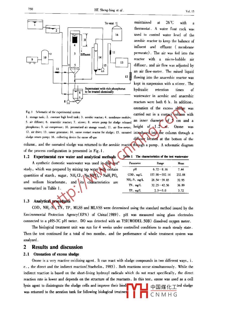 Joumnal of Fromeral Sienes Vol. I.No6,pp.749- -756.2003ISN 10-02CAII - 26291XArticle ID: 1001-0742<(20003 >06-0749-08CLC number: X703 Document code: ATreating both wastewater and excess sludge with an innovativeprocessHE Sheng-bing, W ANG Bao-zhen, WANG Lin, JIANC Yi-feng(Schol of Municipal & Enrionomental Enginering, Harhin Iosiute of Technlogy, Harbin 10090. China. E-mail: heshenping @ sina.com)Abstract: The invaive process consists of biologiral unit for wastewaler treatment and onation unit for res sludge reatment. An serobiemenbrane bioreactor( MBR) was used to remove organics and nitrogen. and an anarobie reactor was added to the biologiral uni for the releaspof phospons cnnind a arobic sludge l0 enhance the removal of phospbons. For the exces sludge produed in the MBR, which wus fed toone rontu:t colunn and reacted with ozoe , then the oronated sludge was retuned to the MBR for further hiolngead tratment. Experimentalresults showed lhat this process could remove organcs, mitrogen and phosphorus eficicnl, and the removals for COD, NH)-N, TN and TPwere 93.17%,97.57% .82.77% and 79.5% . rspectively. Bach test idicaed that the sperifie ririfcation rate and peie drinifcatioinrale of the MBR mere 1.03 mg NH3.N( gMLSS'h) and 0.56 mg NOr-N/( gMISS.h), and deinication sems to be the re-iniig step.Inder the lest conditions,lhe sludge concentration in the MBR was kept at 5000- 6000 mg/L. and the wasird sludge w制1 0zonated at an ozonedose of 0. I0 kgQ)/kgSS. During the experimental period of lwo months, no exces sudger was wasted. and a rero withdrawal of excess sludkpewas implemented. Through eoomie analysis , it was found that an aditiona ozonation operting coet for treatment of both vestewater andexcrss sludge was only 0.045 RMB Yuan( USD 0.0054)1m3 waslewaler.Keywords: wastewaler treatment; excess sludge: aerobice menubrane bioreacte( MBR) ; anerbic reacor; onatin; ro withdrawal of exctssludgeIntroductionUrban wastewater is usually treated by conventional activated sludge process in China, which involvesthe biodegradation of organic pollutants by activated sludge in aeraled bioreactors, and then the activatedsludge could be separated by gravitaional stling in clanifiers. The optimal sludge concentration isgenerally in the range of2→3 g/L, which imposes large size of bioreactor( Defrance, 1998). In addition,a large amount of excess sludge is produced and the separation, dewatering, treatment and disposal of thisexcess sludge represent major investment and operating costs. With the rising costs and restrictions onsludge disposal, the minimization of sludge yield has become of inereasing imporance( Chen, 2000).Up to now,numerous researches have been conducted 10 reduce the production of excess sludge inwastewater lreatment( Wang,1991; Yasui, 1996; Lee, 1996; Sirand, 1999; Ghyool, 2000). However,there are some drawbacks in heir tests, i.e., minimization of excess sludge often results in sludgebulking, meanwhile, nitrogen and phosphonus can nol be removed efectively and efluent often can notmeet the requirement of National efluent standard . Therefore, it becomnes necessary to modify conventionalwastewater treatment process in order to reduce excess sludge production as well as to get high quality o[efluent.The aim of this study was to minimize the production of excess sludge a well as to get an excellentefluent. To achieve both the goals, combined aerobic MBR and anaerobic reactor process was chosen totreat wastewaler, and excess sludge produced in MBR was reacted with ozone,then the ozonated sludgewas retumned to the MBR and mixed with influent for further biological treatment.M laterials and methods1.1 Experimental equipmentA hollow fiber polyethylene ultrfitration( UF) membrane module with a total surface area of2.0 m' ,pore size o[ 0.05 μm and a lengh of0.35 m was used as the中國煤化工! lhe erobiend anaerobic reactors were 16.3 L and 5 L respectively .Freactorsrs wasMYHCNMHG750HE Sheng-bing et al .Vol.15F了1Toveat 1|maintained at 26弋 withthermostat. A water floal cock wasused to control water level of the|Haerobic reactor to keep the balance ofinfluent and efluent ( membrane13 EMuent|1411pemeate). The air was fed into the[2H13reactor with a mie:ro-bubble airdifuser, and air flow was adjusted by11|an air flow-meter. The mixed liquid2flowing into the anaerobie reactor waskept in suspension with a stirrer. TheSupernatant with rich phosphorushydraulicetention limes of6 tobe treated cbemicallywastewater in aerobic and anaerobicreactors were both 6 h. In addition,ozonation of the excess sludge wasFig. | Schenatic of the experimental syslemncarried out in a contact column with5. air difuser; 6. anaerobie reacor; 7. stirer; 8. rehum pump for sludge relesedan inner diameter of 5 cm and aphosphonus; 9. uir coprsorsr, 10. pesurzrd air slorage vesel; 11. air fow-mrter: height of 1.2 m,Ozone was12. air dier; 13. one getato; 14. 0zone contart tractor for sludge; 15. onaled intnoduced into the columnn through asludge returm pump; 16. clleting device for ozone ff-aisdiffuser located at the botton of thecolumn, and the (2z0nated sludge was returmed to the aerobic reaclor through a pump. A schematic diagramof the process configuration is presented in Fig.I.Experimental raw water and analytical methodsTable 1 The chancteristics of the tet wastewaterA synthetic domestic wastewater was used in this testParameterRangtMeanstudy,which was prepared by mixing tap water with certainpH6.72-8.167.44quantities of starch, sugar, NH,GI, Naz HPO, , NaH,P04COD, mng/L157.98- -352. 14232.0828.54- 39.8532.95 .and sodium bicarbonate, and its characteristics areTN. mg/L32.25-42.5636.89summarized in Table I.TP, mg/L2.5-5.03.721.3 Analytical proceduresCOD, NH,-N, TN, TP, MILSS and MLVSS were determined using the standard method issued by theEnvironmental Prolection Agency(EPA) of China(1989). pH was measured using glass eletrodesconnected to a pHS-3C pH meter. D0 was detected with an YSI( MODEL 50B) dissolved oxygen