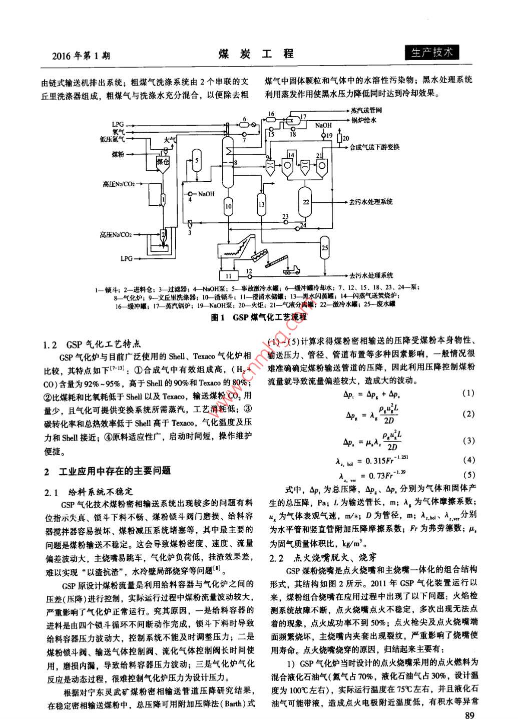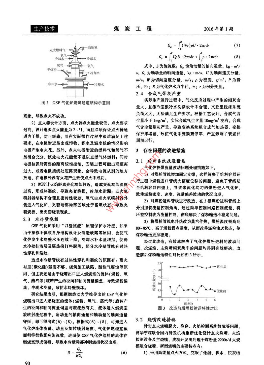 煤炭工程第48卷第1期COAL ENGINEERINGVol. 48, No. 1doi: 10. 11799/ ce201601026GSP氣化技術(shù)工業(yè)應(yīng)用分析蔣立翔1.2.3(1.中國礦業(yè)大學(xué),江蘇徐州21116; 2.神華集團有限責(zé)任公司,北京10011;3.神華寧煤煤化工公司,寧夏銀川750411)摘要:介紹了GSP氣化技術(shù)工藝原理、技術(shù)特點,重點對GSP氣化技術(shù)在工業(yè)應(yīng)用中出現(xiàn)的粉煤輸送不穩(wěn)定、點火燒嘴脫火燒穿、水冷壁燒損、合成氣帶灰嚴重等問題進行了分析,總結(jié)闡述了神華寧煤針對上述GSP氣化技術(shù)問題開展的探索與改進措施。關(guān)鍵詞:煤氣化; GSP 氣化爐;工業(yè)應(yīng)用;給料系統(tǒng);燒嘴;水冷壁;合成氣帶灰中圖分類號: TQ546文獻標識碼: A文章編號: 1671-0959( 2016)01-0088-04Analysis on industrial application of GSP gasification technologyJIANG Li-xiang"'(1. Ching University of Mining and Technology , Xuzhou 21116, China; 2. Shenhua Group Corporation Limited,Beijing 10011, China;3. Shenhua Ningxia Coal Group Coal Chemistry Industry Company, Yinchuan 750411, China)Abstract: This paper introduces the technological process and technical characteristics of GSP gasification technology,and emphatically analyzes the problems in industrial application of GSP gasification technology, such as unstable pulverizedcoal conveying, igniter burner blow - off and burmning through, water wall buming loss and synthesis gas carrying ash.Finally the exploration and improvement measures to the above GSP gasifcation technology problems of Shenhua NingxiaCoal Group are summarized.Keywords: coal gasification; GSP gasification technology; indusrial aplicaion; feeding system; burmer; water wall;synthesis gas carrying ash煤氣化技術(shù)是煤化工的龍頭技術(shù),是煤潔凈利用技術(shù)業(yè)應(yīng)用中出現(xiàn)的問題進行分析總結(jié)并提出改進措施。的重要環(huán)節(jié),碳一化學(xué)的基礎(chǔ)(2。目前,現(xiàn)代煤化工氣化1 GSP 氣化工藝技術(shù)主要有固定床、流化床和氣流床工藝,以氣流床工藝居多,主要爐型有Shell爐、GE(Texaco)爐、 多噴嘴水煤漿爐、航1.1 工藝簡介天爐、清華爐、GSP 爐等。實踐證明,CSP 氣化爐經(jīng)過神氣流床氣化以進料形態(tài)可分為干煤粉氣化和水煤漿氣華寧煤近5年的運行實踐與非常艱苦地探索改進,目前已化5.41。神華寧煤52萬Va烯烴項目采用的GSP氣化技術(shù)成為最有競爭力的氣化技術(shù)之一-。屬干煤粉進料氣流床氣化技術(shù)。神華寧煤50萬Va MTP項目采用CSP粉煤加壓氣化工GSP氣化工藝主要由磨煤、煤粉輸送、氣化、粗合成藝, 5臺氣化爐,4開1備,設(shè)計單爐投煤量2000/d,產(chǎn)氣洗滌、排渣和黑水處理等組成[5,],工藝流程如圖1所氣量30萬Nm'/h,有效氣(CO+H)13萬Nm'/h。該項目于示。煤倉為氣化生產(chǎn)線的連續(xù)供給煤粉提供倉儲,煤倉過2008年開工建設(shè),2010 年9月30日竣工,2010 年底5臺濾器將進人煤倉的N2和CO2外排大氣前進行清潔過濾,清氣化爐全部投料試車,目前氣化爐滿負荷運行,A類運行潔后的氣體中甲醇含量低于190mg/Nm';鎖斗將煤粉從煤(不停爐檢修)達14ld,達國內(nèi)氣化爐運行領(lǐng)先水平。倉規(guī)律性的輸送至進料倉;氣化爐將氧氣、煤粉和水蒸氣CSP氣化爐在世界上首次大規(guī)模工業(yè)化應(yīng)用,在實踐轉(zhuǎn)變?yōu)楦缓琀2和CO的合成氣,并使合成氣在激冷室中冷中出現(xiàn)過很多問題,如加料系統(tǒng)不穩(wěn)定、燒嘴不易點火、卻且洗滌熔渣;渣鎖斗從激冷的壓力系統(tǒng)中將爐渣排出到特殊件磨損、水冷壁超溫等,本文著重對GSP氣化爐的工大氣壓力環(huán)境中,并在后系統(tǒng)中洗滌氣化產(chǎn)生的粒狀爐渣,收稿日期: 2015-08-02作者簡介:蔣立翔(1975-), 男,陜西商洛人,博士研究生,高級工程師,主要從事煤化工技術(shù)研發(fā)及生產(chǎn)管理工作,E-mail: 0000379@ shenhua. cc。引用格式:蔣立翔. CSP 氣化技術(shù)工業(yè)應(yīng)用分析[J].煤炭工程, 2016, 48(1): 88-91.2016年第1期某炭工程生產(chǎn)技術(shù)由鏈式輸送機排出系統(tǒng);粗煤氣洗滌系統(tǒng)由2個串聯(lián)的文煤氣中固體顆粒和氣體中的水溶性污染物;黑水處理系統(tǒng)丘里洗滌器組成,粗煤氣與洗滌水充分混合,以便除去粗利用蒸發(fā)作用使黑水壓力降低同時達到冷卻效果。+燕汽送管網(wǎng)+鍋爐給水低壓氮氣+大氣4i919 D2-工+合成氣送下游變換煤粉→且事高壓N/COz→-9- NaOH22一◆去污水處理系統(tǒng)1-鎖斗:2-進料倉:3 -過德器:4 -NaOH系: s- 事故激冷水罐:6緩沖鱧冷卻水; 7.12.15.18.23、24-泵;_氣化爐: 9 _文丘里洗滌器: 10- 渣鎖斗; 11- 澄清水儲罐: 13--黑水閃蒸罐: 14-閃蒸氣送焚燒爐:16縵沖罐;17-蒸汽鍋爐: 19 -NaOH泵; 20-火炬: 21- 氣液分離罐; 22-微冷水罐; 25--廢水罐圖1 GSP煤氣化工藝流程1.2 GSP氣化工藝特點(1)- (5)計算求得煤粉密相輸送的壓降受煤粉本身物性、GSP氣化爐與目前廣泛使用的Shell Texaco 氣化爐相輸送壓力、管徑、管道布置等多種因素影響,一般情況很比較,其特點如下[7-B):①合成氣中有效組成高,(H2+難準確確定煤粉輸送管道的壓降,因此利用壓降控制煤粉co)含量為92%-95%,高于Shell的90%和Texaco的80%;流量就導(dǎo)致流量偏差較大,造成大的波動。②比煤耗和比氧耗低于Shell以及Texaco,輸送煤粉CO2用Ap.=Ap,+Ap,(1)量少,且氣化可提供變換系統(tǒng)所需蒸汽,工藝消耗低;③Ap。=入。(2)碳轉(zhuǎn)化率和總熱效率低于Shell 高于Texaco,氣化溫度及壓. 2D力和Shell接近;④原料適應(yīng)性