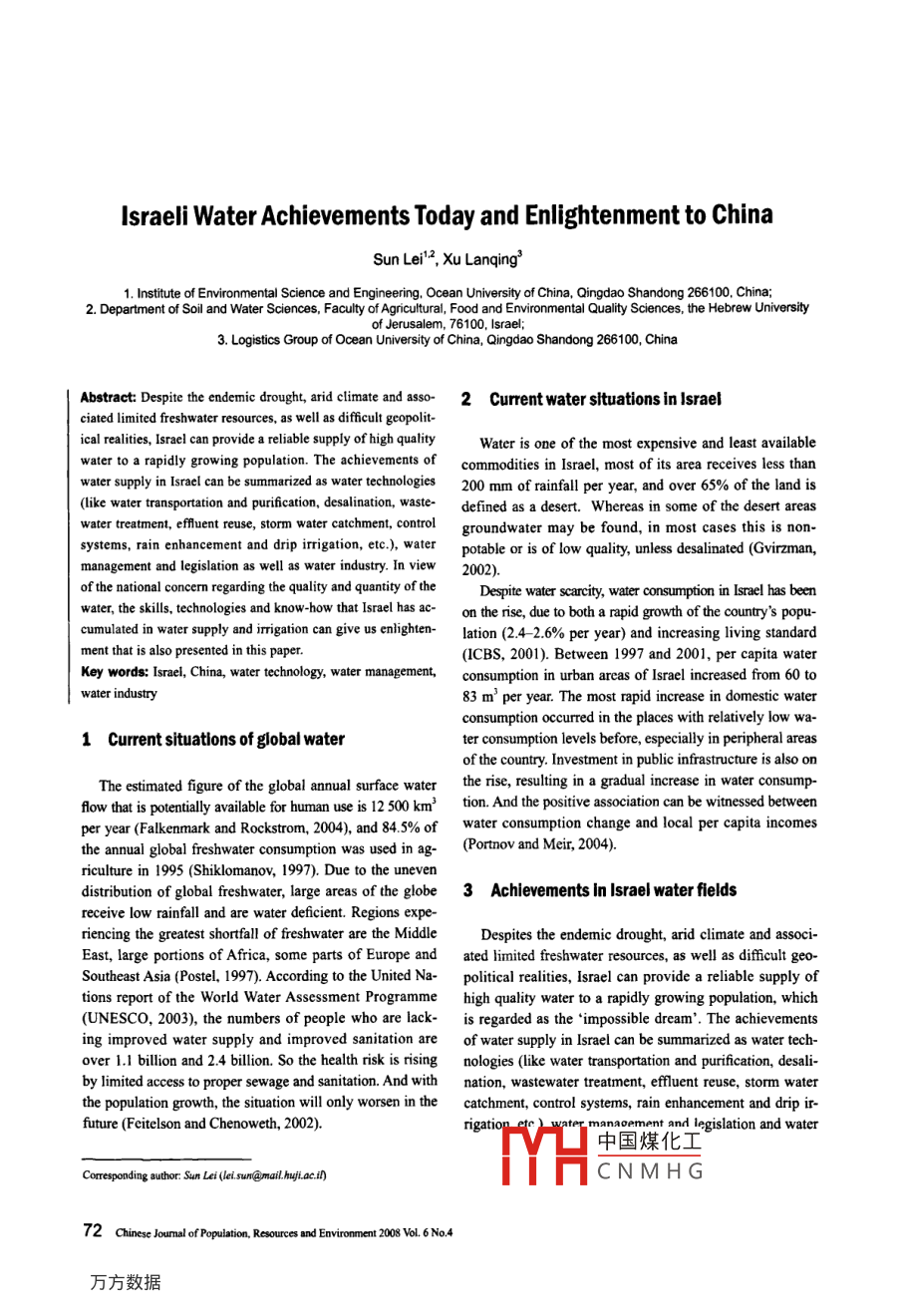 Israeli Water Achievements Today and Enlightenment to ChinaSun Lei12, Xu Lanqing'1. Institute of Environmental Science and Enginering. Ocean University of China, Qingdao Shandong 266100, China;2. Department of Soil and Water Scinces, Faculty of Agicultural, Food and Environmental Quality Sciences, the Hebrew Universityof Jerusalem, 76100, Israel;3. Logistics Group of Ocean University of China, Qingdao Shandong 266100, ChinaAbstract: Depite the endemic drought, arid elimate and asso= 2 Current water situations in Israelciated limited freshwater resources, as well as difcult geopolit-ical realities, Israel can provide a reliable supply of high qualityWater is one of the most expensive and least availablewater to a rapidly growing population. The achievements of commodities in Israel, most of its area receives less thanwater supply in Israel can be summarized as water technologies200 mm of rainfall per year, and over 65% of the land is(like water transportation and purifcation, desalination, waste-defined as a desert. Whereas in some of the desert areaswater treatment, effluent reuse, storm water catchment, controlgroundwater may be found, in most cases this is non-systems, rain enhancement and drip irigation, etc.), waterpotable or is of low quality, unless desalinated (Gvirzman,management and legislation as well as water industry. In view 2002).of the national concern regarding the quality and quantity of theDespite water scarcit, water consumption in Israel has beenwatr, the sills technologics and know -how that Israel has ac on the ise, due to both a mapid growth of the county's popu-cumulated in water spply and imigation can give us enighen. latin (2.4 2.6% per year) and increasing living standardment that is also presented in this paper.(ICBS, 2001). Between 1997 and 2001, per capita waterKey words: Israel, China, water technology, water management, consumption in urban areas of Israel increased from 60 towater industry83 m' per year. The most rapid increase in domestic waterconsumption occurred in the places with relaively low wa-1 Current situatlons of global waterter consumption levels before, especially in peripheral areasof the country. Investment in public infrastructure is also onThe etimated figure of the global annual surface waterthe rise, resulting in a gradual increase in water consump-low that is potentially available for human use is 12 500 km'tion. And the positive association can be witnessed betweenper year (Falkenmark and Rockstrom, 2004), and 84.5% ofwater consumption change and local per capita incomesthe annual global freshwater consumption was used in ag-(Portnov and Meir, 2004).riculture in 1995 (Shiklomanov, 1997). Due to the unevendistribution of global feshwater, large areas of the globe 3 Achievements In Israel water fieldsreceive low rainfall and are water deficient. Regions expe-riencing the greatest shortfall of freshwater are the MiddleDespites the endemic drought, arid climate and associ-East, large portions of Africa, some parts of Europe and ated limited freshwater resources, as well as difcult geo-Southeast Asia (Postel, 1997). According to the United Na- political realities, Israel can provide a reliable supply oftions report of the World Water Assessment Programme high quality water to a rapidly growing population, which(UNESCO, 2003), the numbers of people who are lack-is regarded as the impossible dream . The achievementsing improved water supply and improved sanitation are of water supply in Israel can be summarized as water tech-over 1.1 billion and 2.4 billion. So the health risk is rising nologies (like water transportation and purification, desali-by limited access to proper sewage and sanitation. And withnation, wastewater treatment, effluent reuse, storm waterthe population growth, the situation will only worsen in the catchment, control systems, rain enhancement and drip irfuture (Feitelson and Chenoweth, 2002).中國(guó)煤化工Coresponding auhor: Sur Lei (le. sunmailhj.c.ilCNMHG72 Chinese Joumal oPpuation, Resources end Environment 2008 VolL. 6 Nio.4industry.water per year. The plant will produce high-quality water,3.1 Advanced and experlenced water technologles Inwhich will be supplied to Israeli residents via primary na-tional water systems. The plant is scheduled to come on lineIsraelin 2011.3.1.1 Qualified water transportation3.1.3 Wastewater treatment and effuent reuseThe National Water Carrier delivers fresh water from theWith the unparalleled experience, know-how, technolo-north, with its fairly abundant rainfall and water sources togies and innovative processes for the management, opera-the dry south, which is a technical challenge that traverses. tion and treatment of all types of water resources, like sur-a wide range of terrains and comprises a network of aquc-face water, underground water, brackish water, seawater andducts, tunnels, reservoirs and pumping stations. The Na-effuents. Israel constantly searches for solutions to increasetional Carrier delivers about 400 million m' of water eachthe water supply. One of these solutions is wastewateryear. The water pumps from 209 meters below sea level ontreatment and efluent reuse for agriculture. Israel aims atthe northwest shore of the Sea of Galilee (reshwater lake) improving the level of the reclaimed water quality, therebyto 150 meters above sea level and then to the Eshkol site,broadening is application as an alternative water source. Inwhere the water undergoes treatment before continuing2005, 350 million m' of efluents were reused in Israel forsouthward.agriculture (75% of the total raw sewage) that is one of theThe central filtration plant at Eshkol site was built at ahighest rates in the world.cost of more than USS 100 million, and has an annual filter-Let's take the Dan Region Wastewater Treatment Planting capacity of more than 500 million m', which is the larg-(Shafdan) as an example: the Shafdan treats 130 million m'est plant of its kind in Israel, and one of the l