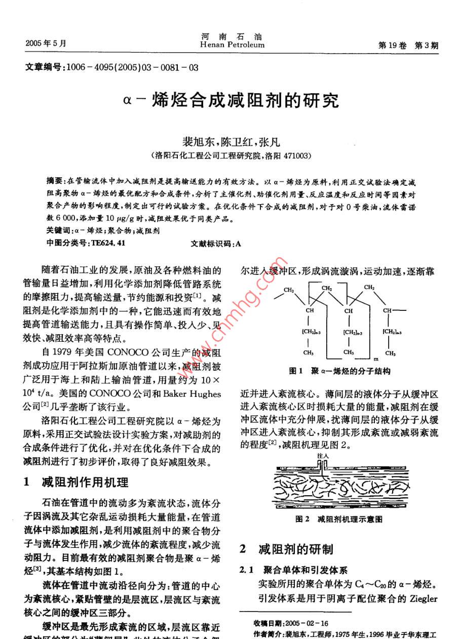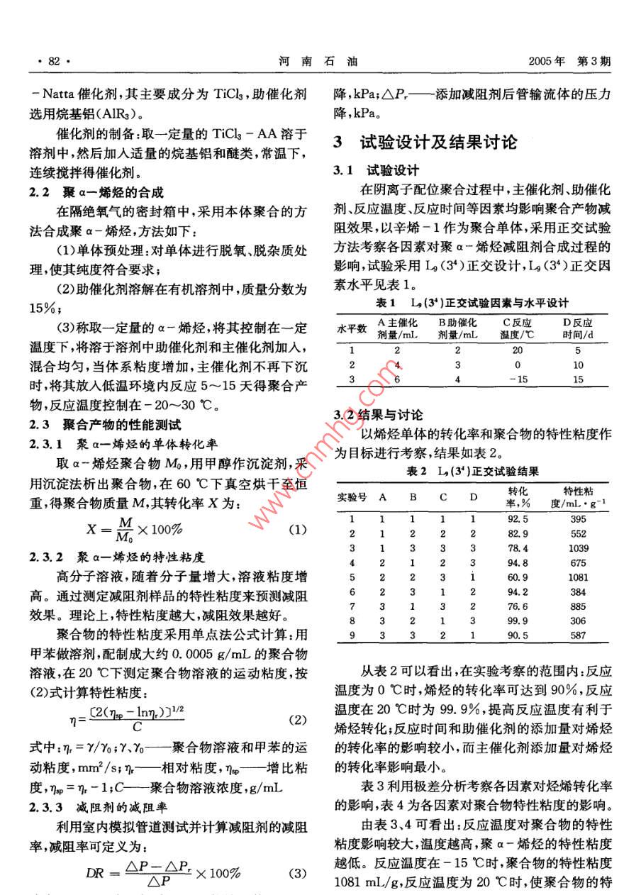河南石油2005年5月H enan I Petroleum第19卷第3期文章編號:1006 - 4095(2005)03- 0081- 03a-烯烴合成減阻劑的研究裴旭東,陳衛(wèi)紅,張凡(洛陽石化工程公司工程研究院,洛陽471003)摘要:在管輸流體中加入減阻劑是提高輸送能力的有效方法。以a-烯烴為原料,利用正交試驗法確定減阻高聚物a-烯烴的最優(yōu)配方和合成條件,分析了主催化劑、助催化劑用量、反應(yīng)溫度和反應(yīng)時間等因素對聚合產(chǎn)物的影響程度,制定出可行的試驗方案。在優(yōu)化條件下合成的減阻劑,對于對0號柴油,流體雷諾數(shù)6000,添加量10 ug/g時,減阻效果優(yōu)于同類產(chǎn)品。關(guān)鍵詞:a-烯烴;聚合物;減阻劑中圖分類號:TE624.41文獻(xiàn)標(biāo)識碼:A隨著石油工業(yè)的發(fā)展,原油及各種燃料油的爾進(jìn)人緩沖區(qū),形成渦流漩渦,運動加速,逐漸靠管輸量日益增加,利用化學(xué)添加劑降低管路系統(tǒng)CH2的摩擦阻力,提高輸送量,節(jié)約能源和投資口。減阻劑是化學(xué)添加劑中的一種,它能迅速而有效地CHCH一提高管道輸送能力,且具有操作簡單、投入少、見[CH].[CH2]nsCH]hs效快、減阻效率高等特點。自1979年美國CONOCO公司生產(chǎn)的減阻:H)CHs劑成功應(yīng)用于阿拉斯加原油管道以來,減阻劑被圖1聚a-烯烴的分子結(jié)構(gòu)廣泛用于海上和陸上輸油管道,用量約為10x10 t/a.美國的CONOCO公司和Baker Hughes近并進(jìn)人紊流核心。薄間層的液體分子從緩沖區(qū)公司2]幾乎壟斷了該行業(yè)。進(jìn)人紊流核心區(qū)時損耗大量的能量,減阻劑在緩洛陽石化工程公司工程研究院以a-烯烴為沖區(qū)流體中充分伸展,擾薄間層的液體分子從緩原料,采用正交試驗法設(shè)計實驗方案,對減助劑的沖區(qū)進(jìn)入紊流核心,抑制其形成紊流或臧弱紊流合成條件進(jìn)行了優(yōu)化,并對在優(yōu)化條件下合成的的程度[2 ,減阻機(jī)理見圖2。減阻劑進(jìn)行了初步評價,取得了良好減阻效果。1減阻劑作用機(jī)理石油在管道中的流動多為紊流狀態(tài),流體分子因渦流及其它雜亂運動損耗大量能量,在管道圖2減阻劑機(jī)理示意圖流體中添加減阻劑,是利用減阻劑中的聚合物分子與流體發(fā)生作用,減少流體的紊流程度,減少流2減阻劑的研制動阻力。目前最有效的減阻劑聚合物是聚a-烯烴[3] ,其基本結(jié)構(gòu)如圖1。2.1聚合單體和引發(fā)體系流體在管道中流動沿徑向分為:管道的中心實驗所用的聚合單體為Ca~C2o的a-烯烴。為紊流核心,緊貼管壁的是層流區(qū),層流區(qū)與紊流引發(fā)體系是用于陰離子配位聚合的Ziegler核心之間的緩沖區(qū)三部分。緩沖區(qū)是最先形成紊流的區(qū)域,層流區(qū)靠近收稿日期:2005- 02-16緩沖區(qū)的部分為“薄間層”,此處的液體分子會偶作者簡介:裴旭東,工程師, 1975年生,1996畢業(yè)于華東理工大學(xué)化學(xué)工程系,現(xiàn)在工程研究院煉油助劑室工作., 82●河南石油2005年第3期-Natta催化劑,其主要成分為TiCl,助催化劑降,kPa;OP,-添加減阻劑后 管輸流體的壓力選用烷基鋁(AIR3)。降,kPa。催化劑的制備:取一定量的TiCl- AA溶于3試驗設(shè)計及結(jié)果討論溶劑中,然后加入適量的烷基鋁和醚類,常溫下,連續(xù)攪拌得催化劑。3.1試驗設(shè)計2.2聚a- 烯烴的合成在陰離子配位聚合過程中,主催化劑、助催化在隔絕氧氣的密封箱中,采用本體聚合的方劑、反應(yīng)溫度、反應(yīng)時間等因素均影響聚合產(chǎn)物減法合成聚a-烯烴,方法如下:阻效果,以辛烯- 1作為聚合單體,采用正交試驗(1)單體預(yù)處理:對單體進(jìn)行脫氧、脫雜質(zhì)處方法考察各因素對聚a-烯烴減阻劑合成過程的理,使其純度符合要求;影響,試驗采用I, (3* )正交設(shè)計,g(34 )正交因(2).助催化劑溶解在有機(jī)溶劑中,質(zhì)量分?jǐn)?shù)為素水平見表1。表1 L(3* )正交試驗因素與水平設(shè)計15%;(3)稱取一定量的a-烯烴,將其控制在一定水平數(shù)A主催化B助催化C反應(yīng)D反應(yīng).劑量/mL溫度/C時間/d .溫度下,將溶于溶劑中助催化劑和主催化劑加人,一122(5混合均勻,當(dāng)體系粘度增加,主催化劑不再下沉,0104-1515_時,將其放人低溫環(huán)境內(nèi)反應(yīng)5~15天得聚合產(chǎn)物,反應(yīng)溫度控制在- 20~30 C。3.2結(jié)果與討論2.3聚合產(chǎn)物的性能測試以烯烴單體的轉(zhuǎn)化率和聚合物的特性粘度作2.3.1聚a- 烯烴的單體轉(zhuǎn)化率取a-烯烴聚合物Mo,用甲醇作沉淀劑,采為目標(biāo)進(jìn)行考察,結(jié)果如表2。表2 L,(3* )正交試驗結(jié)果用沉淀法析出聚合物,在60 C下真空烘干至恒.實驗號AD轉(zhuǎn)化.特性粘重,得聚合物質(zhì)量M,其轉(zhuǎn)化率X為:率,%度/ml.g-192.5395x=M。. x 100%82.955278.410392.3.2聚a-烯烴的特性粘度94.8675高分子溶液,隨著分子量增大,溶液粘度增60.91081高。通過測定減阻劑樣品的特性粘度來預(yù)測減阻94. 238476.6885效果。理論上,特性粘度越大,減阻效果越好。99.9306聚合物的特性粘度采用單點法公式計算:用90. 5587甲苯做溶劑,配制成大約0. 0005 g/mL的聚合物溶液,在20C下測定聚合物溶液的運動粘度,按從表2可以看出,在實驗考察的范圍內(nèi):反應(yīng)(2)式計算特性粘度:溫度為0C時,烯烴的轉(zhuǎn)化率可達(dá)到90%,反應(yīng).[2(ηp - lnn)]1/2溫度在20C時為99.9%,提高反應(yīng)溫度有利于C烯烴轉(zhuǎn)化;反應(yīng)時間和助催化劑的添加量對烯烴式中:n =γ/Yo;Y、Y