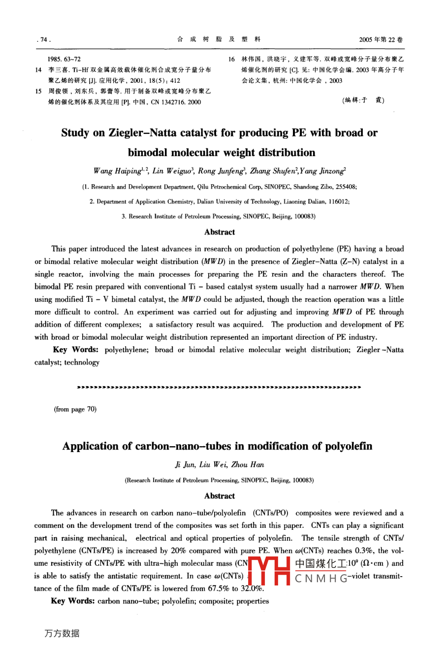 綜述合成樹脂及塑料,2005, 22(3): 67CHINA SYNTHETIC RESIN AND PLASTICS碳納米管在聚烯烴改性中的應用籍軍劉偉周涵(中國石油化工股份有限公司石油化工科學研究院,北京,10083)摘要:綜述了碳納米管(CNTs)/聚烯烴復合材料的研究進展,評述了今后CNTs/聚烯烴復合材料的研究方向。CNTs對聚烯烴的力學性能、電性能和光學性能有促進作用:CNTs/聚乙烯復合材料的拉伸強度提高了約20%;w(CNTs)為0.30%的CNT:/超高相對分子質量聚乙烯的體積電阻率小于1x10° ∩.cm,達到了抗靜電的要求,w(CNTs)為0.01%的CNTs/聚Z烯薄膜的紫外線總透過率從67.5%降到32.0%。關鍵詞:碳納米管 聚烯烴復合材料 性能中國分類號: TQ 325.1文獻標識碼: A文章編號: 1002-1396(2005 )03- 0067-04碳納米管(CNTs)是一種新型的功能材料,應CNTs,其導電性優(yōu)于銅,CNTs的楊氏模量和剪切.用于原子力顯微鏡的針尖凹.儲氫材料場發(fā)射電模量與金剛石相同,理論強度可達1.0 TPa,是鋼子源2、修飾電極凹納米電子設備、催化劑載體閣、的100倍。具有超高的韌性,而密度僅為鋼的1/7,高分子復合材料及催化劑促進劑9等。自1991年耐強酸強堿,在空氣中973K以下基本不被氧化。被發(fā)現以來,CNTs就引起了科研工作者的極大興因此,利用CNTs制備聚烯烴復合材料可極大地趣。CNTs的研究是當前化學、物理和材料科學領改善聚烯烴的力學性能、電性能和光學性能。域的熱點之一。目前,關于CNTs/高分子復合材料的文獻很2CNTs/聚烯烴復合材料的制備方法多1611。有人2-17已對CNTs/聚烯烴復合材料的研究CNTs粒徑小,表面能大,在范德華力的作用進展做了詳細介紹。本文主要就CNTs改性聚烯下,容易發(fā)生團聚。另外,CNTs具有較大的長烴的研究現狀和研究結果進行了總結。徑比,會發(fā)生纏繞。Ouyang等19測量了扶手型和鋸齒型CNTs的能帶,發(fā)現具有金屬性的鋸齒型1 CNTs 的結構及性能CNTs由于團聚會顯示出1個高于Feimi能級的CNTs一般由單層或多層石墨層卷曲而成,兩能帶結構而實際上呈現半導體性;扶手型CNTs端各被半個富勒烯封閉。因此,也可以將其看作是則會出現1個較小的偽能帶。因此,提高CNTs在富勒烯在一個方向上的延伸。CNTs的直徑一般在聚合物中的分散能力,增加與聚合物的界面結合1 nm到幾十納米,長度在幾十納米到微米級, 長力,防止CNTs團聚是制備CNTs/聚烯烴復合材料徑比在1 000左右,可看作準-維材料。CNTs 可的關鍵。以分為單壁管和多壁管。單壁管由單層碳原子繞制備CNTs/聚烯烴納米復合材料的方法主要合而成,CNTs具有對稱性和單一性;多壁管由多有機械混合、熔融共混、溶液共混和原位聚合等方層碳原子一層接一層繞合而成,好像同軸電纜一法。 但是,對于非極性的聚烯烴而言,主要采用機樣。CNTs獨特的結構使其具有優(yōu)異的力學性能、械混合和熔融共混的方法。熱穩(wěn)定性及電性能。理論計算表明舊,單壁CNTs的導電性能與其中國煤化工明: 2005-03-02。津大學化工系,現為中手性及直徑有關。當結構參數為(n,m) 的單壁CNTs滿足2n+3m=3q(q為整數)時,CNTs表現為FYHC N M H G研究院研究生,主要從事分子模擬及高分子復合材料的研究工作。聯系電話:金屬性,其他類型的則屬于半導體。作為導體的(010)62327551轉3080;E- mail: jun7308@163.com。.68.合成樹脂及塑料2005年第22卷2.1機械混合法混煉;最后,將混煉物切成小片擠出,并在PP的.機械混合法主要用研磨設備將CNTs和聚烯玻璃化轉變溫度(T)附近用熔融紡絲的方法制得烴混合而得到復合材料。胡平等啊通過球磨法制纖維。備了CNTs/超高相對分子質量聚乙烯(UHMWPE)狄澤超等叫將CNTs用氫氟酸和硝酸處理后,復合材料。UHMWPE為白色粉末,平均粒徑為兒與低密度聚乙烯在 180 C下混煉、造粒,制得了百微米。為了改善UHMWPE的塑性,先將自制的CNTs分散均勻的CNTs/聚乙烯(PE)復合材料。解CNTs與經過稀釋的分散偶聯劑混合,然后同孝林等129采用球磨共混和熔融共混相結合的方UHMWPE - -起放入三頭研磨機中研磨2h以上。法,制備了CNT/PP復合材料。其中,馬來酸酐接通過掃描電子顯微鏡(SEM)觀察表明,CNTs在枝苯乙烯-乙烯-丁烯-苯乙烯共聚物(MA- -SEBS)UHMWPE中分散良好,直徑在50~60 nm。還與手作為相容劑促進了CNTs在PP基體中的分散,形工混合、溶液超聲混合及磁力攪拌混合等方法進成了完善的逾滲網絡。行了比較,發(fā)現研磨法的分散效果最好。王琪等凹利用固相剪切的方法制備了CNTs/3CNTs對聚烯烴性能的影響聚烯烴復合粉體。將聚烯烴顆粒和CNTs在高速3.1力學性能攪拌器中均勻混合后送人固相剪切粉碎設備,重CNTs與聚合物大分子尺寸在同一數量級,可復碾磨多次,得到外觀均勻的CNTs/聚烯烴復合以近似看作--種剛性大分子。因此,作為增強材料粉體。該復合粉體通過熱壓成型可得到CNTs/聚對提高聚烯烴性能有著重要意義。烯烴復合材料。王琪等叫利用固相剪切的方法制備的CNTs/2.2熔融 共混法聚烯烴復合粉體,其拉伸強度和抗沖擊性能均得熔融共混法是將CNTs和聚烯烴混合后熔到了一-定的提高。同純PE相比,CNTs/PE復合材融,再制成各種復合材料。Kumar等四在雙螺桿擠料的拉伸強度提高了大約20%,沖擊強度提高了出機上制備了CNTs/聚丙烯(PP)復合材料。擠出15%-30%;而CNTs/PP復合材料的拉伸強度和沖機的各段溫度分別為150,200,220,240 C,螺桿擊強度比純PP分別提高了25%和20%。轉速為20 r/min。擠出物料經過淬火和真空干燥.胡平等網在測試CNTs/UHMWPE復合材料的后,