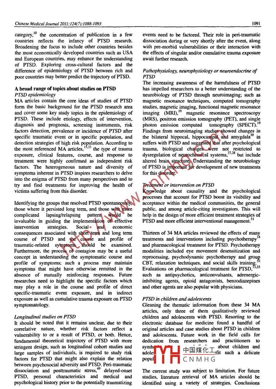 1088Chin MedJ 2011;124(7): 1088-1093Meta analysisCitation analysis of meta-analysis articles on posttraumatic stressdisorderLIAO Xi-ming and CHEN Ping-yanKeywords: meta analysis; postraumatic stress disorder; bibliometric analysisBackground In the past two decades enormously scientific researches on postraumatic stress disorder (PTSD) havebeen undertaken and many related meta- analyses have been published. Citation analysis was used to getcomprehensive perspectives of meta-analysis articles (MA articles) on PTSD for the purpose of facilitating theresearchers, physicians and policy-makers to understand the PTSD.Methods MA articles on PTSD in any languages from January 1980 to March 2009 were included if they presentedmeta-analytical methods and received at least one citation recorded in the Web of Science (WoS). Whereas studies, inwhich any effect sizes of PTSD were not distinguished from other psychological disorders, were excluded. Citations toand by identified MA articles were documented basing on records in WoS. Citation analysis was used to examinedistribution patterns of characteristics and citation impact of MA articles on PTSD. Canonical analysis was used toexplore the relationship between the characterstics of MA articles and citation impact.Results Thirty-four MA aricles published during 1998 and 2008 were identified and revealed multiple study topics onPTSD: 10 (29.49%) were about epidemiology, 13 (38.2%) about treatment or intervention, 6 (17.6%) aboutpathophysiology or neurophysiology or neuroendocrine, 3 (8.8%) about childhood and 2 (5.9%) about psychosocialadversity. Two articles cited most frequently with 456 and 145 counts were published in Jouma/ of Consulting and ClinicalPsychology by Brewin (2000) and Psychological Bulletin by Ozer (2003), respectively. Mean cited count was 7.48+10.56and mean age (year 2009 minus article publication year) was (4.24+2.91) years. They had been cited approximately by67 disciplines and by authors from 42 countries or trritories. Characteristics of meta -analysis highly correlated withcitation impact and reflected by canonical correlation of 0.899 (P <0.000 01).Conclusions The age of MA articles predicted their citatin impact. Citation analysis would serve to capture the globalperspectives and topics of MA articles on PTSD.Chin Med J 2011;124(7):1088-1093Meta-analysis (MA) is a stistical technique forpolicy-makers by getting the whole pictures of existingamalgamating, summarizing, and reviewingscientific evidence on one specific field. Web of Scienceprevious quantitative researches on one topic to examine(WoS) enables the users to search curent and pasta particular question; it plays an important role inliteratures from approximately 8500 of the mostevidence-based medicine.' There are a wealth of primaryprestigious, high-impact research jourmals in the world. Itstudies from hybrid fields of medicine that have beenalso provides a unique search method as well as citedexplored through meta- analysis: 2 medical science,reference search. The advent of WoS benefits thepreventive medicine and clinical medicine,' includingapplication of citation analysis.diabetes, cardiovascular disease’ and critical carepractice." By collecting and reviewing a serial of MAPosttraumatic stress disorder (PTSD) is a form of anxietyarticles on a particular field from the perspective ofrelated to trauma exposure which is the cause of severebibliometrics, a panoramic evolution and development ofpsychological, psychosocial, biological and physicalthat field could be better understood. Citation analysis,consequences and symptoms. There is recently athe examination of the frequency, patterms and graphs ofincreasing awareness of the harmful effects of PTSD;citations in articles and books, uses citations in academicworks to establish links to other works or other research.DO: 0.760/cmij.s.036-6999.20 1.07.025Department of Biostatistics, School of Publie Health and TropicalIt has been utilized as a tool to track the progress ofMedicine, Southern Medical University, Guangzhou, Guangdongresearch in the medical community.' In an increasingly510515, China (Liao XM and Chen PY)competitive research environment, aspects of citationCorres中國(guó)煤化工Tropicep MedicineT -1g-yan, Department ofanalysis have been advocated as simple proxy, objectiveBiostalmeasures to appraise the quality of joumals, publishedSouthe一u, Guangdong 510515,ChinaHarticles, research institutions and even individualchenpy99@ 126.com)CN M H G2-2061604832. Emal:researcher. Therefore using citation analysis on MATThis study was supported by the grants form the National Naturalarticles would facilitate the traditional concept ofScience Foundation of China (No. 30972554) and the Guangdongcitation analysis for researchers, physicians and Natural Science Foundation (No, 915180200400001).Chinese Medical Jourmal 2011;124(7;:1088 10931089including impaired verbal memory, behavioral, structuralimpact was explored with CCA. The correlation wasbrain abnormalities and sleep abnormalities. A called the canonical correlation and the linearburgeoning of original articles and MA articles havecombinations were the canonical variates. Thecontributed to the investigation of the basal cardiovascularfundamental principle behind CCA was the creation of aactivity and neurobiological pathophysiology of PTSDnumber of canonical variables, each consisting of a linearduring the last two decades. T0 The current project utilizedcombination of one set of variables (X), which had thecitation analysis to delve into the evolution andform: U1=ajX+...+a.+..+apXp and a lineardevelopment of MA articles on PTSD from 1980 to 2009.combination of the other set of variables (Yn), which hadPhenomena that arose from our investigation, along withthe form: V1=byY/+... +b;Y+...+bpYp. The goal was tothe limitations and implication for researchers aredetermine the coefficients, or canonical weights (ap anddiscussed.b1p), that maximize the correlation 
