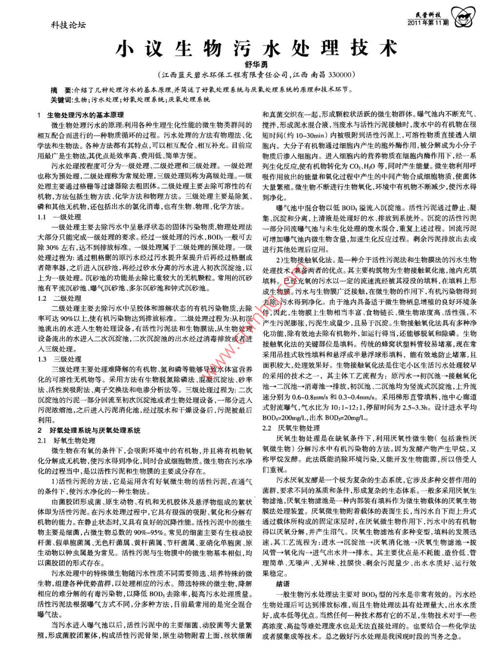 科技論壇201年第1期小議生物污水處理技術(shù)舒華勇(江西藍天碧水環(huán)保工程有服責(zé)任公司,江西南昌330000摘要:介紹了幾種處理污水的基本原理并簡迷了姸氧處理系統(tǒng)與厭氧處理系統(tǒng)的原理和技術(shù)環(huán)節(jié)。關(guān)鍵詞:生物;污水處理;好氧處理系統(tǒng);厭氧處理系統(tǒng)1生物處理污水的基本原理和真菌交織在一起,形成顆粒狀活躍的微生物群體。曝氣池內(nèi)不斷充氣微生物處理污水的原理利用各種生理生化性能的微生物類群間的攪拌,形成泥水混合液,當(dāng)廢水與活性污泥接觸時,廢水中的有機物在很相互配合而進行的一種物質(zhì)循環(huán)的過程。污水處理的方法有物理法化短時間(約10-30mn)內(nèi)被吸附到活性污泥上,可溶性物質(zhì)直接透人細學(xué)法和生物法。各種方法都有其特點,可以相互配合、相互補充。目前應(yīng)胞內(nèi)。大分子有機物通過細胞內(nèi)產(chǎn)生的胞外酶作用,被分解成為小分子用最廣是生物法其優(yōu)點是效率高、費用低、簡單方便物質(zhì)后滲入細胞內(nèi)。進入細胞內(nèi)的營養(yǎng)物質(zhì)在細胞內(nèi)酶作用下,經(jīng)一系污水處理按程度可分為一級處理、二級處理和三級處理。一級處理列生化反應(yīng),使有機物轉(zhuǎn)化為CO2、HO等同時產(chǎn)生能量。微生物利用呼也稱為預(yù)處理,二級處理稱為常規(guī)處理,三級處理則稱為高級處理。一級吸作用放出的能量和氧化過程中產(chǎn)生的中間產(chǎn)物合成細胞物質(zhì)使菌體處理主要通過格柵等過濾器除去粗固體。二級處理主要去除可溶性的有大量繁殖。微生物不斷進行生物氧化環(huán)境中有機物不斷減少,使污水得機物方法包括生物方法、化學(xué)方法和物理方法。三級處理主要是除氮、到凈化磷和其他無機物還包括出水的氯化消毒,也有生物、物理化學(xué)方法。曝氣池中混合物以低BOD3溢流入沉淀池?;钚晕勰嗤ㄟ^靜止凝1.1一級處理集、沉淀和分離,上清液是處理好的水、排放到系統(tǒng)外。沉淀的活性污泥級處理主要去除污水中呈懸浮狀態(tài)的固體污染物質(zhì)物理處理法一部分回流曝氣池與未生化處理的廢水混合,重復(fù)上述過程。回流污泥大部分只能完成一級處理的要求。經(jīng)過一級處理的污水BOD5一般可去可增加曝氣池內(nèi)微生物含量加速生化反應(yīng)過程。剩余污泥排放出去或除30%左右,達不到排放標(biāo)準(zhǔn)。一級處理屬于二級處理的預(yù)處理。一級進行其他處理后應(yīng)用。處理過程為:通過粗格刪的原污水經(jīng)過污水提升泵提升后再經(jīng)過格刪或2)生物接觸氧化法。是一種介于活性污泥法和生物膜法的污水生物者篩率器,之后進入沉砂池,再經(jīng)過砂水分離的污水進入初次沉淀池,以處理技術(shù),兼?zhèn)鋬烧叩膬?yōu)點。其主要構(gòu)筑物為生物接觸氧化池,池內(nèi)充填上為一級處理。沉砂池的功能是去除比重較大的無機顆粒。常用的沉砂填料。已經(jīng)充氧的污水以一定的流速流經(jīng)被其浸沒的填料,在填料上形池有平流沉砂池、曝氣沉砂池、多爾沉砂池和鐘式沉砂池成生物膜。污水與生物膜廣泛接觸,在微生物的作用下,有機污染物得到1.2二級處理去除,污水得到凈化。由于池內(nèi)具備適于微生物棲息增殖的良好環(huán)境條二級處理主要去除污水中呈膠體和溶解狀態(tài)的有機污染物質(zhì)去除件因此,生物膜上生物相當(dāng)豐富、食物鏈長、微生物濃度高活性強,不率可達9%以上使有機污染物達到排放標(biāo)準(zhǔn)。二級處理過程為從初沉產(chǎn)生污泥膨脹,污泥生成量少,且易于沉淀。生物接觸氧化法具有多種凈設(shè)備流出的水進人二次沉淀池,二次沉淀池的出水經(jīng)過清毒排放或者進化功能,除有效地去除有機物外,如運行得當(dāng),還能夠脫氧和除磷。生物人三級處理13三級處理采用吊掛式軟性填料和懸浮或半懸浮球形填料,能有效地防止堵塞,且三級處理主要處理難降解的有機物、氮和磷等能夠?qū)е滤w富營養(yǎng)面積較大,處理效果好。生物接觸氧化法是住宅小區(qū)生活污水處理較早法、活性炭吸附法、離子交換法和電滲分析法等。三級處理過程為:二池→二沉池→消毒池→排放,初沉池、二沉池均為豎流式沉淀池,上升流淀池的污泥一部分回流至初次沉淀池或者生物處理設(shè)備,一部分進入速分別為06-0.8mms和03-0.4mms。采用梯形直管填料,池中心廊道污泥濃縮池,之后進入污泥消化池,經(jīng)過脫水和干燥設(shè)備后,污泥被最后式射流曝氣氣水比為10:1-12:1,停留時間為25-33h。設(shè)計進水平均BOD=200mg,出水BOD=20mg2好氧處理系統(tǒng)與厭氧處理系統(tǒng)22厭氧生物處理2.1好氧生物處理厭氧生物處理是在缺氧條件下,利用厭氧性微生物(包括兼性厭微生物在有氧的條件下,會吸附環(huán)境中的有機物,并且將有機物氧氧微生物)分解污水中有機污染物的方法因為發(fā)酵產(chǎn)物產(chǎn)生甲烷又化分解成無機物使污水得到凈化同時合成細胞物質(zhì)。微生物在污水凈稱甲烷發(fā)酵。此法既能消除環(huán)境污染又能開發(fā)生物能源所以倍受人化的過程當(dāng)中,是以活性污泥和生物膜的主要成分存在們重視1)活性污泥的方法,它是運用含有好氧徽生物的活性污泥,在通氣污水厭氧發(fā)酵是一個極為復(fù)