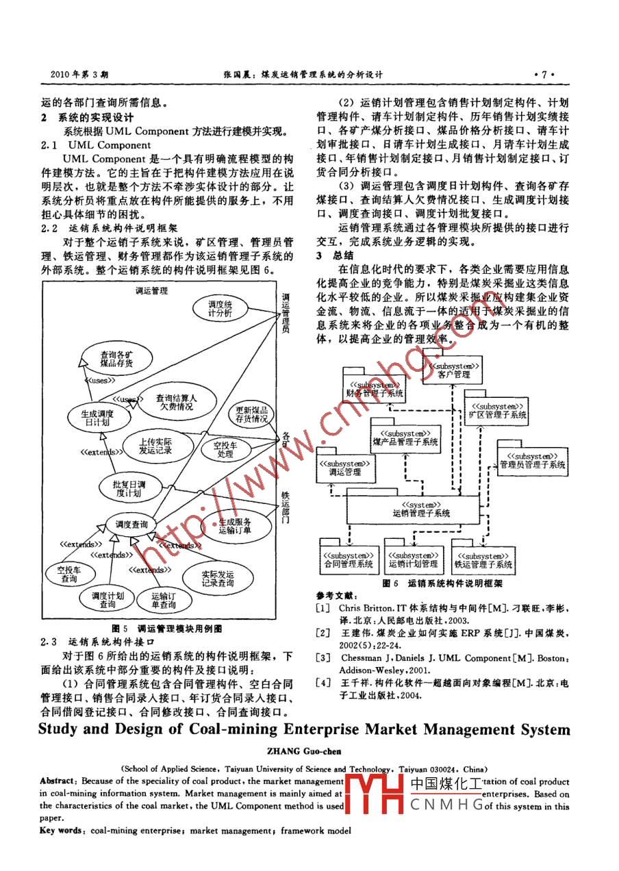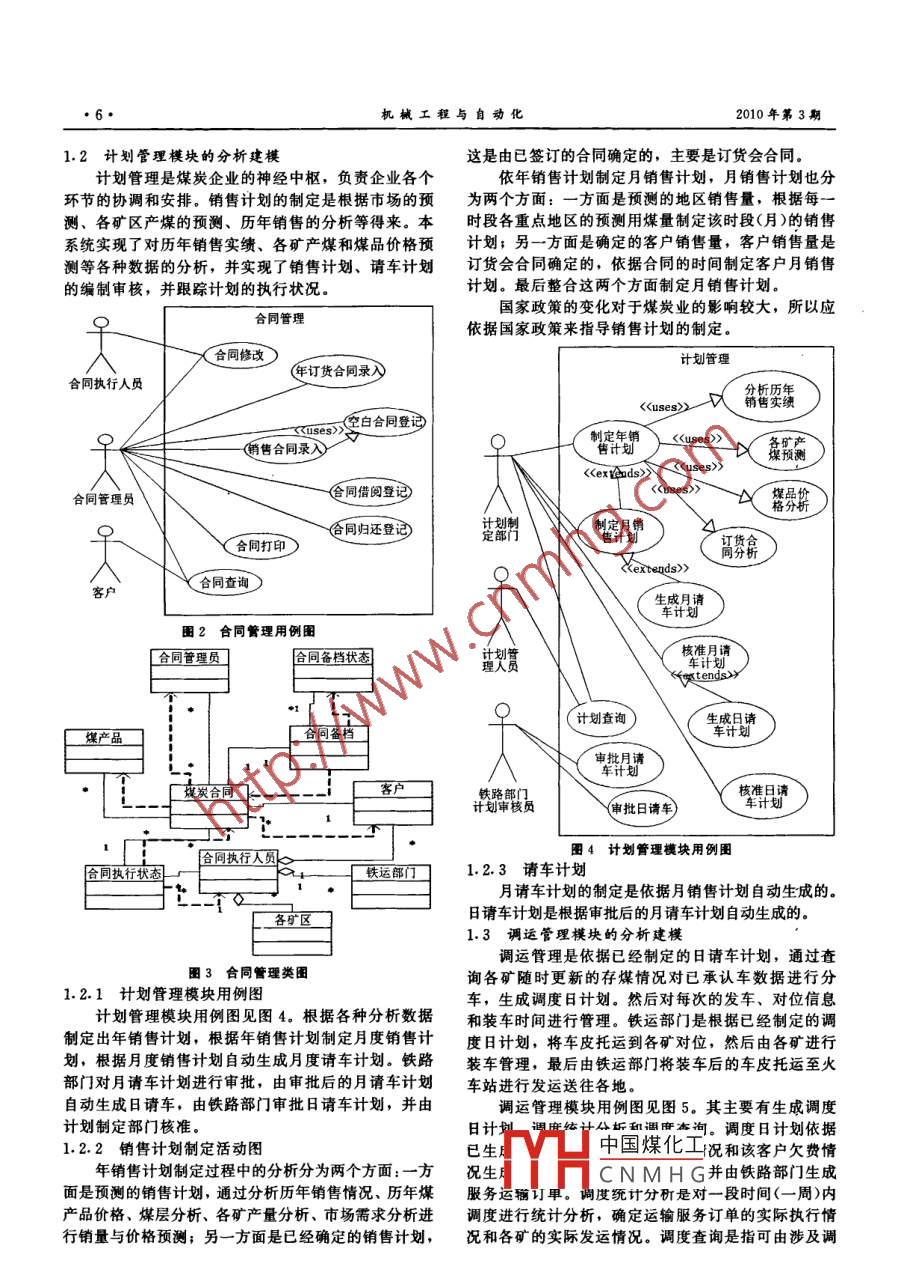 第3期(總第160期)機械工程與自動化No. 32010年6月MECHANICAL ENGINEERINGAUTOMATIONJun. .文章編號:1672-6413(2010)03-0005-03煤炭運銷管理系統(tǒng)的分析設計*張國晨(太原科技大學應用科學學院,山西太原030024)摘要:在煤炭采掘業(yè)信息系統(tǒng)中。運銷管理主要是針對企業(yè)的運輸與銷售部門相關業(yè)務的管理,負貴煤炭產(chǎn)品的銷售與運輸,由于煤炭產(chǎn)品的特殊性,所以該環(huán)節(jié)是煤炭采掘業(yè)信息系統(tǒng)的一個重點。在對煤炭運銷系統(tǒng)的特點進行分析的基礎上,應用UML Component構(gòu)件建模方法建立了該系統(tǒng)構(gòu)件框架模型。關鍵詞:煤炭采掘業(yè);運銷管理;框架模型中圈分類號: TP315文獻標識碼: A0引言要先登記再錄人,合同錄人后就可以對合同進行有效在煤炭采掘業(yè)信息系統(tǒng)中,運銷管理主要是針對的管理和打印。對合同的修改是對合同狀態(tài)進行修改,企業(yè)的運輸與銷售部門相關業(yè)務的管理,負責煤炭產(chǎn)以便及時跟蹤合同,合同狀態(tài)的修改涉及合同執(zhí)行的品的銷售與運輸,由于煤炭產(chǎn)品的特殊性,所以該環(huán)不同人員,如各礦區(qū)、客戶、鐵路部門等。合同借閱節(jié)是煤炭采掘業(yè)信息系統(tǒng)的一個重點。當前,煤炭采與歸還登記是對備檔合同的借閱與歸還進行登記。掘業(yè)的運銷管理模式與手段存在著明顯的缺點,所以市場需在煤炭采掘業(yè)信息系統(tǒng)中實現(xiàn)運銷管理的網(wǎng)絡化管1決策理,使與運銷管理相關的業(yè)務流、數(shù)據(jù)流完全基于網(wǎng)絡系統(tǒng),形成-一個相對公開、透明的管理網(wǎng)絡系統(tǒng)。營銷活動|資源及物流管理1運銷 業(yè)務管理煤炭運銷管理指生產(chǎn)出的煤炭通過煤炭運銷這--環(huán)節(jié)流向煤炭使用單位,實現(xiàn)煤炭的使用價值向商用合同管理L計劃、調(diào)運管理| 采質(zhì)化驗管理價值轉(zhuǎn)化的一系列管理過程。整個運銷管理包括營銷活動管理、物流管理以及煤炭運銷業(yè)務管理,見圖1。結(jié)算管理根據(jù)煤炭運銷業(yè)務的管理職能,煤炭運銷業(yè)務信息管理分為合同管理、計劃管理、調(diào)運管理、采質(zhì)化驗管圈1運銷管理理、結(jié)算帳務管理5大部分。1.1.2合 同類圖1.1 合同管理模塊的分析建模在合同管理中所設置的類與類間關系見圖3,其由于煤炭運銷業(yè)務的特殊性和不確定性,目前,在中每個類所包含的屬性如下:合同的實際執(zhí)行中也具有不穩(wěn)定性.在實際的運銷系統(tǒng)合同備檔狀態(tài)類:記錄號、是否借閱、是否歸還、中,并不能嚴格按合同執(zhí)行,因此,在本系統(tǒng)的實現(xiàn)過是否在檔。程中,考慮到合同的實際執(zhí)行情況,合同管理模塊實現(xiàn)合同管理員類:管理員號、管理員類別、管理員了合同的錄入、修改、增加、打印,供相關部門領導和名稱、管理員密碼。工作人員查詢并實現(xiàn)了合同執(zhí)行狀態(tài)的跟蹤。煤炭合同類:合同編號、出賣人、買受人、收貨1.1.1合同管理用例 圖人名稱、發(fā)站、到站等。合同管理用例圖見圖2.主要有合同錄人、合同修煤產(chǎn)品類:產(chǎn)品號、產(chǎn)品名稱、產(chǎn)品質(zhì)地。改、合同借閱與歸還登記等。合同的錄人分為年訂貨合同執(zhí)行狀態(tài):執(zhí)行號、合同編號、是否備檔、是合同的錄人和銷售合同的錄人,對銷售合同的錄入需否生中國煤化工●山西省科技攻關項目資助(051124-8-2)tYHCNMHG收稿日期: 2010-04-19作者簡介:張國晨(1980-),男,山西芮城人.助教,碩士?!?●機械工程與自動化2010年第3期1.2 計劃管理模塊的分析建模這是由已簽訂的合同確定的,主要是訂貨會合同。計劃管理是煤炭企業(yè)的神經(jīng)中樞,負責企業(yè)各個依年銷售計劃制定月銷售計劃,月銷售計劃也分環(huán)節(jié)的協(xié)調(diào)和安排。銷售計劃的制定是根據(jù)市場的預為兩個方面: - -方面是預測的地區(qū)銷售量,根據(jù)每一測、各礦區(qū)產(chǎn)煤的預測、歷年銷售的分析等得來。本時段各重點地區(qū)的預測用煤量制定該時段(月)的銷售系統(tǒng)實現(xiàn)了對歷年銷售實績、各礦產(chǎn)煤和煤品價格預計劃;另一方面是確定的客戶銷售量,客戶銷售量是測等各種數(shù)據(jù)的分析,并實現(xiàn)了銷售計劃、請車計劃訂貨會合同確定的,依據(jù)合同的時間制定客戶月銷售的編制審核,并跟蹤計劃的執(zhí)行狀況。計劃。最后整合這兩個方面制定月銷售計劃。國家政策的變化對于煤炭業(yè)的影響較大,所以應合同管理依據(jù)國家政策來指導銷售計劃的制定.(合同修改)計劃管理(年訂貨合同錄)合同執(zhí)行人員<>分析歷年銷售實績空白合同登記I KKuses>Q制定年銷<>(>合同管理員合同歸還登記定部門制定月銷S< 合同打印)>客戶合同查詢)生成月請車計劃圈2合同管理用例圉C合同管理員]合同備檔狀態(tài)理人員核準月請fotends>1.(計劃查詢生成日請煤產(chǎn)品合同備檔牛計劃審批月請11↑煤炭合同鐵路部門核準日請(審批日請車)Jt圖4 計劃管理模塊用例圄合同執(zhí)行狀態(tài)鐵運部門1.2.3請車計劃月請車計劃的制定是依據(jù)月銷售計劃自動生成的。各礦區(qū)日請車計劃是根據(jù)審批后的月請車計劃自動生成的。1.3 調(diào)運管理模塊的分析建模調(diào)運管理是依據(jù)已經(jīng)制定的