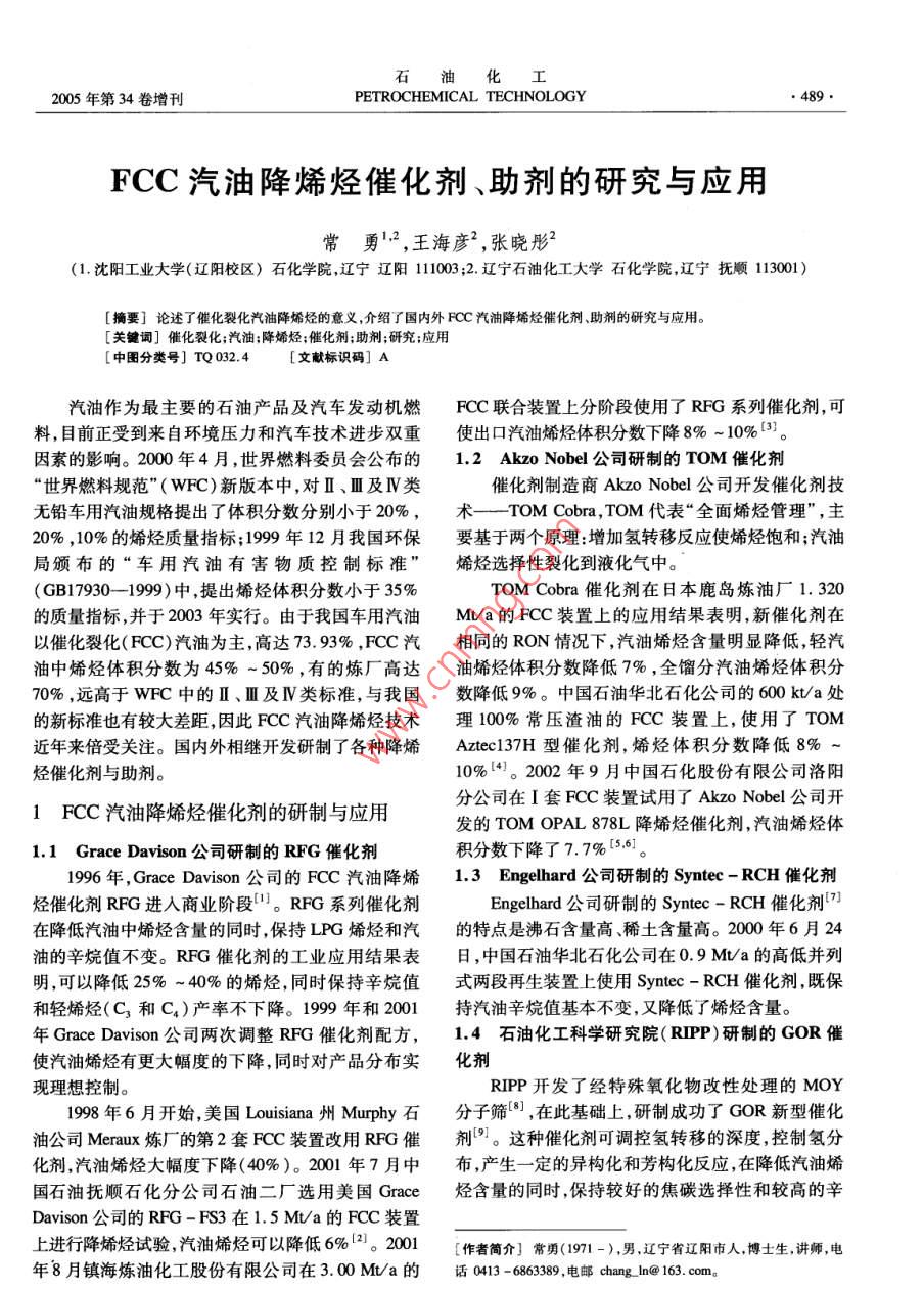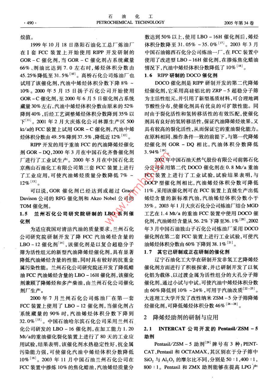 2005年第34卷增刊PETROCHEMICAL TECHNOLOGY●489,F(xiàn)CC汽油降烯烴催化劑、助劑的研究與應(yīng)用常勇'2,王海彥,張曉彤2(1.沈陽(yáng)工業(yè)大學(xué)(遼陽(yáng)校區(qū))石化學(xué)院,遼寧遼陽(yáng)11003;2.遼寧石油化工大學(xué)石化學(xué)院,遼寧撫順113001)[摘要]論述了催化裂化汽油降烯烴的意義,介紹了國(guó)內(nèi)外FCC汽油降烯烴催化劑、助劑的研究與應(yīng)用。[關(guān)鍵詞]催化裂化;汽油;降烯烴;催化劑;助劑;研究;應(yīng)用[中圖分類號(hào)] TQ 032.4[文獻(xiàn)標(biāo)識(shí)碼] A汽油作為最主要的石油產(chǎn)品及汽車發(fā)動(dòng)機(jī)燃FCC 聯(lián)合裝置上分階段使用了RFG系列催化劑,可料,目前正受到來自環(huán)境壓力和汽車技術(shù)進(jìn)步雙重使 出口汽油烯烴體積分?jǐn)?shù)下降8% ~ 10% [3]。因素的影響。2000 年4月,世界燃料委員會(huì)公布的1.2 Akzo Nobel公司研制的TOM催化劑“世界燃料規(guī)范”( WFC)新版本中,對(duì)I、皿及IV類催化劑制造商Akzo Nobel 公司開發(fā)催化劑技無鉛車用汽油規(guī)格提出了體積分?jǐn)?shù)分別小于20% ,術(shù)-- TOM Cobra ,TOM代表“全面烯烴管理”,主20% ,10%的烯烴質(zhì)量指標(biāo);1999年12月我國(guó)環(huán)保要 基于兩個(gè)原理:增加氫轉(zhuǎn)移反應(yīng)使烯烴飽和;汽油局頒布的“車用汽油有害物質(zhì)控制標(biāo)準(zhǔn)”烯烴選擇性裂化到液化氣中。( GB17930- -1999)中,提出烯烴體積分?jǐn)?shù)小于35%TOM Cobra催化劑在日本鹿島煉油廠1. 320的質(zhì)量指標(biāo),并于2003年實(shí)行。由于我國(guó)車用汽油Mt/a的FCC裝置上的應(yīng)用結(jié)果表明,新催化劑在以催化裂化( FCC)汽油為主,高達(dá)73.93% ,FCC汽相同的 RON情況下,汽油烯烴含量明顯降低,輕汽油中烯烴體積分?jǐn)?shù)為45% ~ 50% ,有的煉廠高達(dá)油烯烴體積分?jǐn)?shù)降低7%,全餾分汽油烯烴體積分70%,遠(yuǎn)高于WFC中的lI.皿及IV類標(biāo)準(zhǔn),與我國(guó)數(shù)降低9%。中國(guó)石油華北石化公司的600 kt/a處的新標(biāo)準(zhǔn)也有較大差距,因此FCC汽油降烯烴技術(shù)理100%常壓渣油的FCC裝置上,使用了TOM近年來倍受關(guān)注。國(guó)內(nèi)外相繼開發(fā)研制了各種降烯Aztec137H型催化劑,烯烴體積分?jǐn)?shù)降低8% ~烴催化劑與助劑。10%4]。2002年9月中國(guó)石化股份有限公司洛陽(yáng)1 FCC 汽油降烯烴催化劑的研制與應(yīng)用分公司在I套FCC裝置試用了AkzoNobel公司開發(fā)的TOM OPAL 878L降烯烴催化劑,汽油烯烴體1.1 Grace Davison公司研制的RFG催化劑積分?jǐn)?shù)下降了7. 7% [5,6]。1996年,GraceDavison公司的FCC汽油降烯1.3 Engelhard 公司研制的Syntec - RCH催化劑烴催化劑RFG進(jìn)人商業(yè)階段"。RFG系列催化劑Engelbard公司研制的Syntec-RCH催化劑[7在降低汽油中烯烴含量的同時(shí),保持LPG烯烴和汽的特點(diǎn)是沸石含量高、稀土含量高。2000年6月24油的辛烷值不變。RFG催化劑的工業(yè)應(yīng)用結(jié)果表日,中國(guó)石油華北石化公司在0. 9 Mt/a的高低并列明,可以降低25%~40%的烯烴,同時(shí)保持辛烷值式兩段再生裝置上使用Syntec-RCH催化劑,既保和輕烯烴(C;和C4)產(chǎn)率不下降。1999 年和2001持汽油辛烷值基本不變,又降低了烯烴含量。年GraceDavison公司兩次調(diào)整RFG催化劑配方,1.4石油化工科學(xué)研究院(RIPP)研制的GOR催使汽油烯烴有更大幅度的下降,同時(shí)對(duì)產(chǎn)品分布實(shí)化劑現(xiàn)理想控制。RIPP開發(fā)了經(jīng)特殊氧化物改性處理的MOY1998年6月開始,美國(guó)Louisiana州Murphy石分子篩[8],在此基礎(chǔ)上,研制成功了GOR新型催化油公司Meraux煉廠的第2套FCC裝置改用RFG催劑[9]。這種催化劑可調(diào)控氫轉(zhuǎn)移的深度,控制氫分化劑,汽油烯烴大幅度下降(40%)。2001 年7月中布,產(chǎn)生- -定的異構(gòu)化和芳構(gòu)化反應(yīng),在降低汽油烯國(guó)石油撫順石化分公司石油二廠選用美國(guó)Grace烴含量的同時(shí),保持較好的焦碳選擇性和較高的辛Davison公司的RFG- FS3在1.5 Mt/a的FCC裝置上進(jìn)行降烯烴試驗(yàn),汽油烯烴可以降低6%2]。2001[作者簡(jiǎn)介]常勇(1971 -),男,遼寧省遼陽(yáng)市人,博士生,講師,電年8月鎮(zhèn)海煉油化工股份有限公司在3.00 Mt/a的話0413 - 6863389 ,電郵chang In@ 163. com。石油●490●PETROCHEMICAL TECHNOLOGY2005年第34卷烷值。數(shù)達(dá)到50%以上,使用LBO-16H催化劑后,烯烴1999年10月18日洛陽(yáng)石油化工總廠煉油廠體積分?jǐn)?shù)降至31. 05% ~35. 0%17]。2003 年3月在I套FCC裝置上開始使用RIPP開發(fā)研制的中國(guó)石油錦西石化分公司煉油一廠, 在FCC裝置中GOR-C催化劑,當(dāng)GOR -C催化劑占系統(tǒng)藏量使用了改進(jìn)型LBO - 16H催化劑,在摻煉焦化蠟油66%、劑油比達(dá)到7.0左右時(shí),烯烴體積分?jǐn)?shù)由情況下,汽油中烯烴體積分?jǐn)?shù)降低了10% [18]。45.25%降低至31. 5%[10]。高橋石化公司煉油廠也1.6 RIPP 研制的DOCO催化劑試用了該催化劑,汽油中烯烴體積分?jǐn)?shù)下降8% ~DOCO催化劑是RIPP研制開發(fā)的第二代降烯10%。2000年5月15日揚(yáng)子石化公司開始使用烴催化劑,它采用高硅鋁比的ZRP-5超穩(wěn)分子篩.GOR-C催化劑,至2000年6月5日催化劑占系統(tǒng)為主活性組元,并引用了新型基質(zhì)材料,可合理地調(diào)藏量30%左右,汽油中烯烴體積分?jǐn)?shù)由原來的52%節(jié)酸性分布,使催化劑具有優(yōu)良的可擴(kuò)散性能。同
