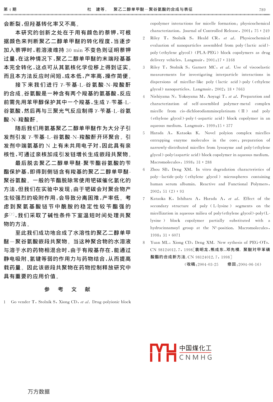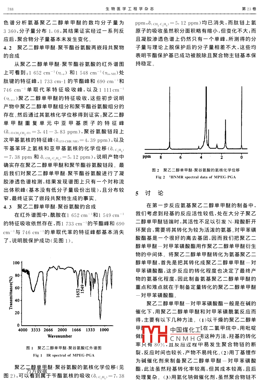 生物醫(yī)學工程學雜志J Biomed eng2006;23(4):786~789聚乙二醇單甲醚一聚谷氨酸的合成與表征杜建張晟張麗芳孫蕊熊成東^彭宇行(中國科學院成都有機化學研究所,成都610041)摘要以聚乙二醇單甲醚為原料在溶劑中與萘鉀反應,形成聚乙二醇單甲醚的鉀鹽活性中間體,再與對甲苯磺酰氯反應得到聚乙二醇單甲醚對甲苯磺酸酯,進而反應生成氨基聚乙二醇單甲醚,并用此引發(fā)γ芐基-L-谷氨酸N-羧酸酐,生成嵌段共聚物聚乙二醇單甲醚聚芐酯谷氨酸,然后用堿脫去芐酯保護基,得到水溶性的聚乙二醇單甲醚一聚谷氨酸。用紅外光譜,核磁共振,凝膠滲透色譜對聚合物結(jié)構進行了表征。該嵌段共聚物在藥物控制釋放研究中具有重要的應用價值關鍵詞氨基聚乙二醇單甲醚γ芐基-L-谷氨酸N-羧酸酐聚乙二醇單甲醚一聚谷氨酸嵌段共聚物Synthesis and Characterizations of Poly (ethylene glycolblock-poly (glutamateDu Jian Zhang Sheng Zhang Lifang Sun Rui Xiong Chengdong Peng Y uxing(Chengdu Institute of Organic Chemistry, Academia Sinica, Chengdu 610041ChAbstract Amine-terminated poly (ethylene glycol )(PEG) was prepared by two steps. Firstly, potassiumnaphthalene was added to a solution of methoxypolyethylene glycol 5, 000 in benzene until thegreen in half of an hour, then excess tosylchloride was introduced secondly, the conversion of the tosylate into anamine was carried out by Gabriel synthesis. The block copolymer poly (ethylene glycol )-co-poly(y-benzyl L.lutamate ) could be obtained by ring-opening polymerization of y-benzyl-L-glutamate N-carboxy anhydride withamine-terminated PEG as macroinitiator. And the benzyl group could be removed by sodium hydroxide. Theproduct structure was characterized by IR, HNMR, GPC. The cisplatin-loaded micelle was observed bytransmission electron microscope(TEM ). And the block copolymer is expected to be useful as functional materialsincluding carrier systems in drug controlled delivery applications.Key words Amine-terminated PEG Y-Benzyl-L-glutamate N-carboxy Poly (ethylene glycol)-co-poly(glutamate acid) Block copolymer要使用有機溶劑,強力攪拌,和表面活性劑。這就使得那些易失活,不穩(wěn)定的藥物不可避免的存在失活在聚合物科學領域,無論是基礎研究還是應用分解變性的現(xiàn)象。而且這類載體往往載藥量較低,原研究,通過大分子自組裝形成超分子結(jié)構的新型功因是藥物與載體之間是靠物理吸附和包裹作用結(jié)合能高分子都是研究熱點之一。在這一領域中嵌段共到一起的因此,近年來人們開始對聚醚共聚物的結(jié)聚物特別是以聚醚為基礎的嵌段共聚物引起了人構進行改性,引入帶有活性基團的水溶性的鏈段,其們的特別關注。在聚醚與可生物降解高分子共聚材中八料研究得最多的是聚醚與可生物降解聚酯的共聚材物件H中國煤化工迷聚氨基酸兩嵌段共聚CNMHG成方法上進行一些創(chuàng)新料,如聚醚一聚乳酸等-3。該共聚物能自組裝成納性探米粒子,但是這種納米粒子在包裹藥物過程中往往2試劑與儀器國家繆封數(shù)資助項目(50273041)聚乙二醇單甲醚(5000),鄰苯二甲酰亞胺鉀鹽△通訊作者。E-mail:xcd@cioe.ac.cn三聚光氣均購自 Sigma公司;對甲苯磺酰氯用苯將第4期杜建等。聚乙二醇單甲醚一聚谷氨酸的合成與表征787其溶解,石油醚沉淀純化,干燥;四氫呋喃,苯,1,4-氣(過量10%),在60C下反應,待反應液變清亮后氧六環(huán),石油醚均先經(jīng)過預干燥,然后用金屬鈉回冷卻至室溫,加大量石油醚沉淀,然后用四呋喃重流脫水,直至二苯甲酮指示劑變?yōu)樗{色蒸岀;N,N-結(jié)晶三次,干燥,得白色疏松狀固體,產(chǎn)率57.4%二甲基甲酰胺,三氯甲烷用五氧化二磷干燥η2h,3.3聚乙二醇單甲醚一聚谷氨酸的合成使用前蒸餾;其它試劑均為國產(chǎn)分析純。 NICOLET3.3.1聚乙二醇單甲醚-聚芐酯谷氨酸兩嵌段共聚200 SXV FT-IR紅外光譜儀,溴化鉀壓片; Varian物的合成將氨基聚乙二醇單甲醚和y芐基L-谷UNITYINOVA-400Hz核磁共振儀,以氘代氯仿為氨酸N-羧酸酐加入預先用氮氣置換過的干燥反應溶劑; Waters Associates Model alc/GPC244凝瓶中,然后用注射器加入1,4二氧六環(huán)和氯仿的混膠滲透色譜,聚苯乙烯為標樣,四氫呋喃為溶劑。合溶劑(3:2,v/v),使兩種原料的總濃度為5%3實驗部分(wt/y),在35C下攪拌反應72h后,加入大量甲醇沉淀得白色固體產(chǎn)物,產(chǎn)率63.2%3.1氨基聚乙二醇單甲醚的制備3.3.2聚乙二醇單甲醚-聚芐酯谷氨酸脫保護將3.1.1聚乙二醇單甲醚一對甲苯磺酸酯的制備8乙二醇單甲醚聚芐酯谷氨酸配成5%(wt/)的氯在干燥的充有氮氣的反應瓶中加入聚乙二醇單甲仿溶液,加入過量的1molL的氬氧化鈉水溶液,在醚和苯,待聚乙二醇單甲醚溶解后,加入適量的萘鉀室溫下攪拌反應30min,然后用鹽酸將溶液pH值直至綠色0.5h不消失,然后加入過量的對甲苯磺調(diào)至中性,分液,得氯仿層和水層,將水層溶液用氯酰氯,室溫反應24h,抽濾除去氯化鉀,用大量乙醚仿萃取3次,然后把萃取液和氯仿層溶液合并,加大沉淀得到初產(chǎn)物。初產(chǎn)物再用乙醇重結(jié)晶,真空干量乙醚沉淀,真空干燥,得淺黃色固體,產(chǎn)率53%。燥,得白色固體,產(chǎn)率92.3%。3.1.2聚乙二醇單甲醚一鄰苯二甲酰亞胺的制備4結(jié)果把聚乙二醇單甲醚一對甲苯磺酸酯溶于N,N-二4.1氨基聚乙二醇單甲醚的制備甲基甲酰胺,加入過量的鄰苯二甲酰亞胺鉀鹽,4.1.Ⅰ聚乙二醇單甲醚一對甲苯磺酸酯的制備120℃,氮氣保護攪拌反應3h,冷卻到室溫,過濾掉從其氫核化學位移上看,δ=4.18ppm為對甲