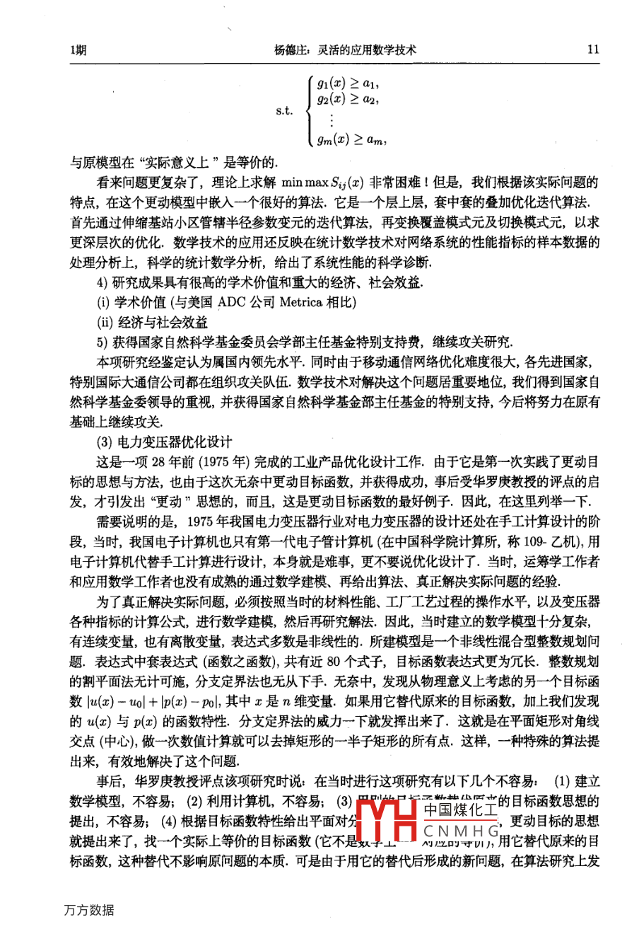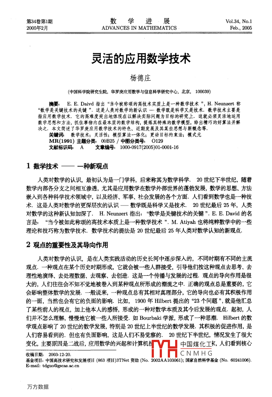 第34卷第1期數(shù)學進展Vol 34. No. 1005年2月ADVANCES IN MATHEMATICSFeb.2005靈活的應(yīng)用數(shù)學技術(shù)楊德莊(中國科學院研究生院,華羅庚應(yīng)用數(shù)學與信息科學研究中心,北京,10039)摘要:E.E.Davd指出“當今被稱頌的高技術(shù)實質(zhì)上是一種數(shù)學技術(shù)",H. Neunzert稱《數(shù)學是關(guān)鍵技術(shù)的關(guān)鍵”.這是人類對數(shù)學的新認識一數(shù)學既是科學又是技術(shù),數(shù)學技術(shù)主要是指應(yīng)用數(shù)學技術(shù).它的高難度突出地體現(xiàn)在以解決實際問題為目標的研究上.這就必須靈活地運用數(shù)學思想和方法,抓住事物內(nèi)在最本質(zhì)的數(shù)學結(jié)構(gòu),提煉其特殊的數(shù)學模型,給出精巧的好算法并解決之,本文簡述了華羅庚應(yīng)用數(shù)學技術(shù)的特色、近期發(fā)展及其某些思想與新概念等關(guān)鍵詞數(shù)學技術(shù);靈活性;模型算法一體化;更動目標約東法;模式元MR(1991)主題分類:00B25/中圖分類號:O129文獻標識碼:A文章編號1000917(2005)01-0001-161數(shù)學技術(shù)—一種新觀點人類對數(shù)學的認識,最初認為是一門學科,后來稱其為數(shù)學科學.20世紀下半世紀,隨著數(shù)學內(nèi)部各分支之間相互滲透,尤其是應(yīng)用數(shù)學在數(shù)學外部世界的蓬勃發(fā)展,數(shù)學的思想、方法嵌入到各種科學技術(shù)領(lǐng)域中,以及經(jīng)濟、軍事、社會發(fā)展的各個方面.人們看到數(shù)學也是一種技術(shù).這是人類對數(shù)學的更深層次的認識—數(shù)學既是科學又是技術(shù).20世紀最后25年,人類對數(shù)學的這種新認知加深了. H. Neunzert指出:“數(shù)學是關(guān)鍵技術(shù)的關(guān)鍵”.E.E.Davd的名言是:“當今被如此稱頌的高技術(shù)本質(zhì)上是一種數(shù)學技術(shù)”M. Atiyah也將純粹數(shù)學中的一些理論和技巧稱為數(shù)學技術(shù).數(shù)學技術(shù)的提法是20世紀最后25年人類對數(shù)學認知的新觀點2觀點的重要性及其導向作用人類對數(shù)學的認識,是在人類實踐活動的歷史長河中逐步深入的,不同時期有不同的主流觀點.一種觀點在某個歷史時期形成,它就會被一些人群接受,引導他們按這種觀點去思考、去理性地演繹、去處理數(shù)據(jù)、去觀察、去創(chuàng)造.這是一個傳播與發(fā)展的過程.觀點的導向作用是很大的,人們往往會不知不黨地被卷入到某種觀點所形成的潮流之中.正確的觀點總是重要的,它會影響整體數(shù)學的發(fā)展一般說來,一種觀點總有其相對真理部分,它的導向也必有其積極作用的一面,當然也會有它的負面的影響.比如,1900年 Hilbert提出的“23個問題”,就是他匯總了某些前人的視點,加上他本人的感悟,形成的一種對數(shù)學本質(zhì)及其今后發(fā)展的觀點起初,人們并不怎么理解,慢慢地它被一些人所接受.如 Bourbaki學派,形成了一種思潮. Hilbert的數(shù)學觀點影響了20世紀的數(shù)學發(fā)展,特別是20世紀上半世紀的數(shù)學發(fā)展.其積極的促進作用,是人們?nèi)菀卓吹降?但也有負面影響,這是人們不易覺察的.20世紀下半世紀,情況發(fā)生了很大變化,主要原因是二戰(zhàn)后,應(yīng)用數(shù)學的興起和計算機中國煤化工,人們看到核心收稿日期12-20CNMHG基金項目:中國高技術(shù)研究和發(fā)展項目(863項目)3TNet資助(No.2002AA103061);國家自然科學基金(No.60241006)數(shù)學進34卷數(shù)學的發(fā)展之外,應(yīng)用數(shù)學和計算機技術(shù)得到突飛猛進的發(fā)展.今天,我們談起數(shù)學,都會著重地提核心數(shù)學、應(yīng)用數(shù)學和計算機技術(shù)的互動作用.20世紀末,數(shù)學整體發(fā)展水平已達到一個新的境界.且不提過去一個世紀中社會因素對數(shù)學整體發(fā)展的作用,僅就數(shù)學界來講,諸多數(shù)學家的數(shù)學觀點,以及起主導作用的數(shù)學團隊(他們可能散布在世界各地)的勤奮工作,都對世界整體數(shù)學發(fā)展做出了貢獻,其中不能不提到馮·諾伊曼的貢獻.他不但是一位世界一流的純粹數(shù)學家,也是世界一流的應(yīng)用數(shù)學家和現(xiàn)代計算技術(shù)的倡導者和奠基人.他可算是20世紀對人類社會、經(jīng)濟、生活影響最大的數(shù)學家.他的數(shù)學觀點,來自他對純粹數(shù)學、應(yīng)用數(shù)學和計算機技術(shù)發(fā)展的全面思考,他對應(yīng)用數(shù)學的推動以及他卓有遠見的發(fā)展電子計算機的思想,已結(jié)出豐碩果實,還要在本世紀發(fā)揮他的影響力.馮·諾伊曼的數(shù)學觀點,對20世紀的應(yīng)用數(shù)學和計算技術(shù)的發(fā)展起到積極的導向作用,而應(yīng)用數(shù)學和計算技術(shù)的發(fā)展自然導致數(shù)學技術(shù)提法的出現(xiàn)3應(yīng)用數(shù)學技術(shù)數(shù)學既是科學又是技術(shù),數(shù)學技術(shù)這種提法,本身是一種觀點,這種數(shù)學技術(shù)主要是指應(yīng)用數(shù)學技術(shù)人們把數(shù)學分為純粹數(shù)學和應(yīng)用數(shù)學,但這只是一種大致的分法,有時很難把某一分支或某一方向歸屬于純的,還是應(yīng)用的.事實上,時至今日,人們也沒有說清楚什么是數(shù)學?什么是應(yīng)用數(shù)學?但是數(shù)學工作者總要大體上把握它們,必須有一種觀點理解它們,認識它們,因為只有這樣,才知道自己該做什么和怎么做什