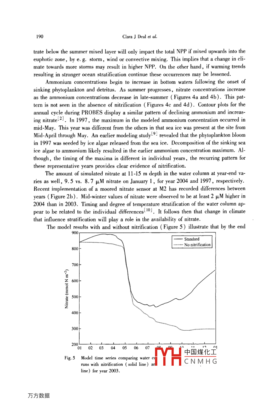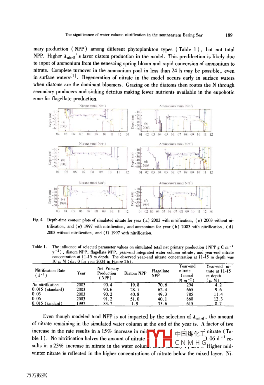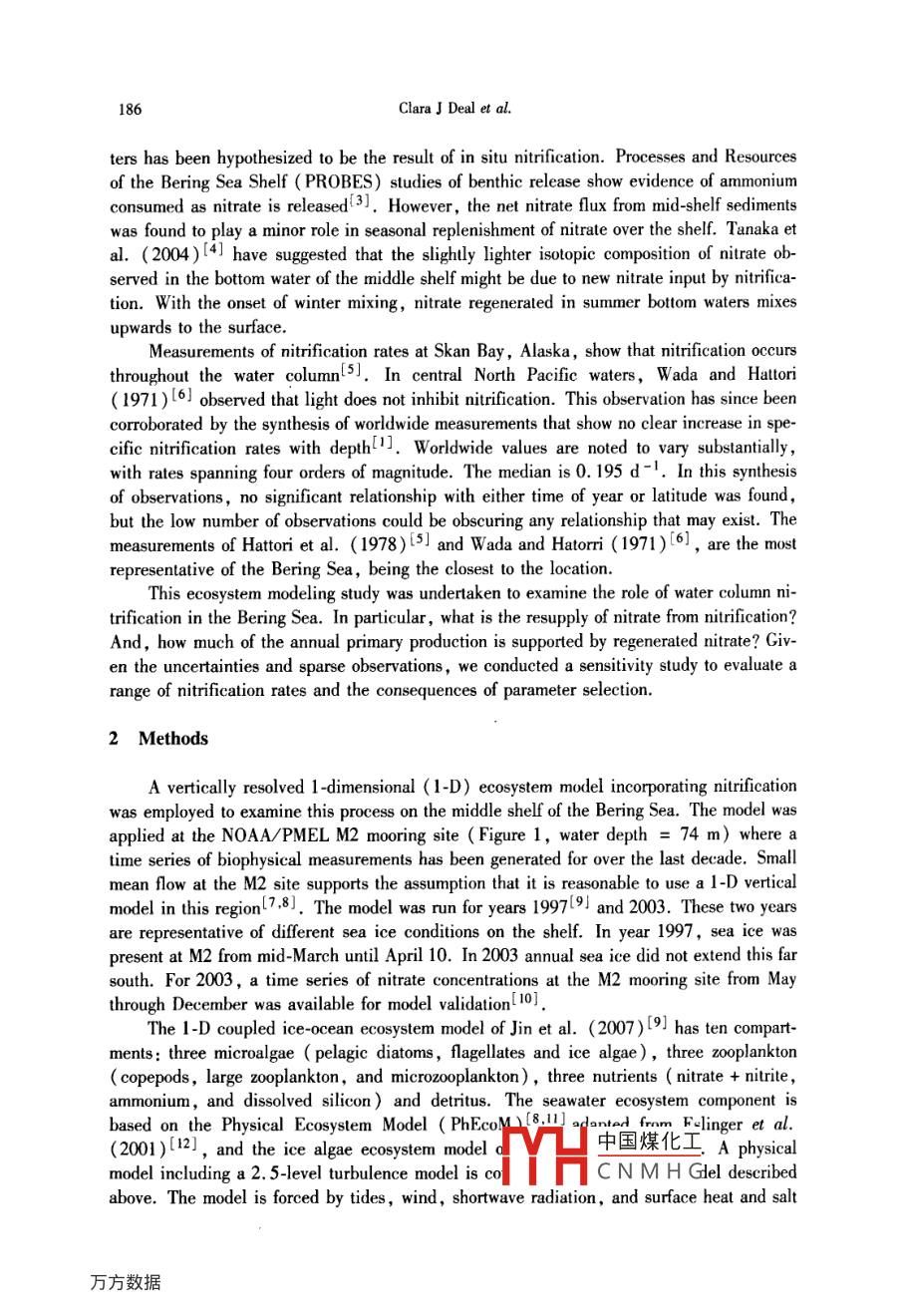 Chinese Joumnal of Polar Science, Vol. 19 ,No.2, 185 - 192, December 2008The significance of water column nitrification in the southeasternBering SeaClara J Deal , Jin Meibing' and Wang Jia21 Intenational Arctic Research Center, Universily of Alaska Fairbanks, USA2 Great Lakes Environmental Research Lab, NOAA, USAReceived September 20, 2008Abstract Nitrate is considered the nutrient that limits new primary production in thesoutheastem Bering Sea shelf. Nitrate regenerated through biological nitrification hathe potential to significantly support primary production as well. Here we use meas-urements of the specific rate of water column nitrification in a 1-D ecosystem model toquantify the resupply of nitrate fromn nitrification in the middle shelf of the southeast-em Bering Sea. Model sensitivity studies reveal nitrification rale is an important con-trol on the dominant phytoplankton functional type , and the amount of nitrate in sum-mer bottom waters and in the winter water column. Evaluation of nitrification usingthe model supports the hypothesis that inereases in late-summer nitrate concentrationsobserved in the southeasterm Bering Sea bottom waters are due to nitrifcation. Modelresuls for nitrale replenishment exceed previously estimated rates of 20-30% based onobservations. The results of his study indicate that nitrification, potentially the sourceof up to ~ 38% of the springtime water column nitrate, could support ~24% of theannual primary production.Key words Arctice , Southeast Bering Sea, water column ntrification.1 IntroductionIn the southeastern Bering Sea, like other productive high latitude seas, most of theprimary production is fuelled by nitrate. Much of this nitrate is thought to be new nitrate 0-riginating from Pacific waters that flow through several Aleutian passes and deep basin wa-ters that upwell onto the shelf. Another source that has received little attention until re-cently is the biological regeneration of nitrate from ammonium, or nitrification. A recentsynthesis of open ocean measurements indicates that nitrification is a very important factorin the euphotic nitrogen cyclel'l. In this paper, we investigate the role of nitrification insupplying the nitrate needed for the primary production that sustains the world class fisher-ies of the Bering Sea and potentially the arctic food web beyond the Bering Sea.Observations suggest significant nitrification in bottom waters on the southeastern Be-ring Sea shelf. Starting at the time of spring bloom , ammonium regenerated from sinking or-ganic nitrogen accumulates in the middle shelf botto中國煤化工ons markedlydecrease in September-Octoberl2]. The coincidentalYHCNMHGbottom wa-186ClaraJ Deal et al.ters has been hypothesized to be the result of in situ nitification. Processes and Resourcesof the Bering Sea Shelf ( PROBES ) studies of benthic release show evidence of ammoniumconsumed as nitrate is released(3]. However, the net nitrate flux from mid-shelf sedimentswas found to play a minor role in seasonal replenishment of nitrate over the shelf. Tanaka etal. ( 2004)l4] have suggested that the slighly lighter isotopic composition of nitrate ob-served in the bottom water of the middle shelf might be due to new nitrate input by nitrifica-tion. With the onset of winter mixing, nitrate regenerated in summer bottom waters mixesupwards to the surface.Measurements of nitrification rates at Skan Bay, Alaska, show that nitrification occursthroughout the water column5]. In central North Pacific waters, Wada and Hattori( 1971)l6] observed that light does not inhibit nitrification. This observation has since beencorroborated by the synthesis of worldwide measurements that show no clear increase in spe-eifie nitrification rates with depth1]. Worldwide values are noted to vary substantially,with rates spanning four orders of magnitude. The median is 0.195 d -1. In this synthesisof observations , no significant relationship with either time of year or latitude was found ,but the low number of observations could be obscuring any relationship that may exist. Themeasurements of Hattori et al. (1978)[5] and Wada and Hatorri ( 1971)6], are the mostrepresentative of the Bering Sea, being the closest to the location.This ecosystem modeling study was undertaken to examine the role of water column ni-trification in the Bering Sea. In particular , what is the resupply of nitrate from nitrification?And, how much of the annual primary production is supported by regenerated nitrate? Giv-en the uncertainties and sparse observations, we conducted a senstivity study to evaluate arange of nitrification rates and the consequences of parameter selection.2 MethodsA vertically resolved 1 -dimensional (1-D) ecosystem model incorporating nitrificationwas employed to examine this process on the middle shelf of the Bering Sea. The model wasapplied at the NOAA/PMEL M2 mooring site ( Figure 1, water depth = 74 m) where atime series of biophysical measurements has been generated for over the last decade. Smallmean flow at the M2 site supports the assumption that it is reasonable to use a 1-D verticalmodel in this regionl7,8J. The model was run for years 1997191 and 2003. These two yearsare representative of different sea ice conditions on the shelf. In year 1997, sea ice waspresent at M2 from mid-March until April 10. In 2003 annual sea ice did not extend this farsouth. For 2003, a time series of nitrate concentrations at the M2 mooring site from Maythrough December was available for model validationl10J.'The 1-D coupled ice- ocean ecosystem model of Jin et al. (2007)[9] has ten compart-ments: three microalgae ( pelagic diatoms, flagellates and ice algae) ,three zooplankton( copepods, large zooplankton, and microzooplankton), three nutrients ( nitrate + nitrite ,ammonium, and dissolved silicon) and detritus. The seawater ecosystem component isbased on the Physical Ecosystem Model ( PhEcoM)[8]danted frm Flinger et al.(2001)[12], and the ice algae ecosystem model