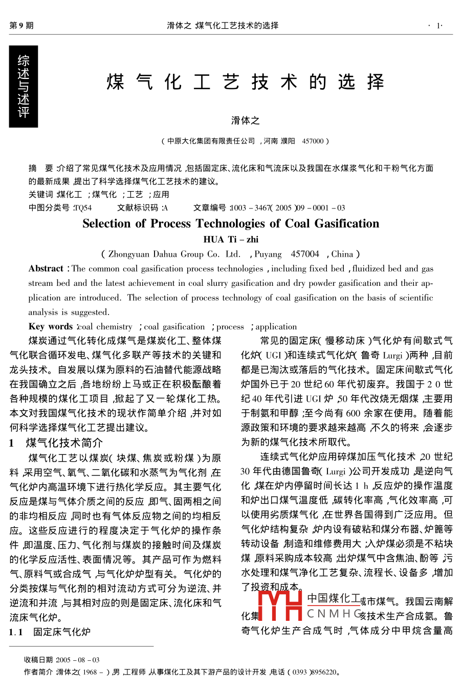 第9期滑體之煤氣化工藝技術的選擇1.綜沭與煤氣化工藝技術的選擇述評滑體之(中原大化集團有限責任公司,河南 濮陽457000 )摘要介紹了 常見煤氣化技術及應用情況包括固定床、流化床和氣流床以及我國在水煤漿氣化和干粉氣化方面的最新成果提出了科學選擇煤氣化工藝技術的建議。關鍵詞煤化工;煤氣化;工藝;應用中圖分類號:TQ54文獻標識碼:A文章編號:1003 -3467( 2005 )09 -0001 -03 .Selection of Process Technologies of Coal GasificationHUA Ti - zhi( Zhongyuan Dahua Group Co. Ltd. , Puyang 457004 , China )Abstract : The common coal gasification process technologies , including fixed bed , fluidized bed and gasstream bed and the latest achievement in coal slurry gasification and dry powder gasification and their ap-plication are introduced. The selection of process technology of coal gasification on the basis of scientificanalysis is suggested.Key words coal chemistry ; coal gasification ; process ; application煤炭通過氣化轉化成煤氣是煤炭化工、整體煤常見的固定床(慢移動床)氣化爐有間歇式氣氣化聯(lián)合循環(huán)發(fā)電、煤氣化多聯(lián)產(chǎn)等技術的關鍵和化爐( UGI )和連續(xù)式氣化爐(魯奇Lurgi )兩種,目前龍頭技術。自發(fā)展以煤為原料的石油替代能源戰(zhàn)略都是已淘汰或落后的氣化技術。固定床間歇式氣化在我國確立之后,各地紛紛上馬或正在積極醞釀著爐國外已于20世紀60年代初廢棄。我國于20世各種規(guī)模的煤化工項目,掀起了又一輪煤化工熱。.紀40年代引進UGI爐50年代改燒無煙煤主要用本文對我國煤氣化技術的現(xiàn)狀作簡單介紹,并對如于制氨和甲醇;至今尚有600余家在使用。隨著能何科學選擇煤氣化工藝提出建議。源政策和環(huán)境的要求越來越高不久的將來會逐步1煤氣化技術簡介為新的煤氣化技術所取代。煤氣化工藝以煤炭(塊煤、焦炭或粉煤)為原連續(xù)式氣化爐應用碎煤加壓氣化技術20世紀料采用空氣、氧氣、二氧化碳和水蒸氣為氣化劑在30年代由德國魯奇( Lurgi )公司開發(fā)成功是逆向氣氣化爐內高溫環(huán)境下進行熱化學反應。其主要氣化化煤在爐內停留時間長達1 h反應爐的操作溫度反應是煤與氣體介質之間的反應即氣、固兩相之間和爐出口煤氣溫度低碳轉化率高,氣化效率高,可的非均相反應同時也有氣體反應物之間的均相反以使用劣質煤氣化,在世界各國得到廣泛應用。但應。這些反應進行的程度決定于氣化爐的操作條氣化爐結構復雜爐內設有破粘和煤分布器、爐篦等件即溫度、壓力、氣化劑與煤炭的接觸時間及煤炭轉動設備制造和維修費用大;入爐煤必須是不粘塊的化學反應活性、表面情況等。其產(chǎn)品可作為燃料煤原料采購成本較高;出爐煤氣中含焦油、酚等污氣原料氣或合成氣與氣化爐爐型有關。氣化爐的水處理和煤氣凈化工藝復雜、流程長、設備多增加分類按煤與氣化劑的相對流動方式可分為逆流、并了投資和成本。逆流和并流與其相對應的則是固定床、流化床和氣中國煤化工城市煤氣。我國云南解流床氣化爐。化集MHcNMH咳技術生產(chǎn)合成氨。魯1.1 固定床氣化爐奇氣化爐生產(chǎn)合成氣時,氣體成分中甲烷含量高收稿日期2005 -08 -03作者簡介滑體之( 1968- )男工程師從事煤化工及其下游產(chǎn)品的設計開發(fā)電話( 0393 )8956220。河南化工●2.HENAN CHEMICAL INDUSTRY2005年第22 卷(8% ~10% ) ,且生產(chǎn)流程長投資大;因此魯奇氣化爐底部連續(xù)加入,從中心管(射流區(qū))送入部分氧化爐不適宜生產(chǎn)合成氣。氣在爐內1 050~1 100 C的高溫下進行快速氣化1.2 流化床氣化爐反應被粗煤氣夾帶的未完全反應的殘?zhí)己惋w灰經(jīng)流化床氣化爐的氣化劑由爐下部吹入,使細粒兩級旋風分離器回收再返回爐內進行氣化碳轉化煤(小于6 mm )在爐內呈并逆流反應煤粒(粉煤)率達90%以上。局部高溫,有利于灰渣分離排灰和氣化劑在爐底錐形部分呈并流運動,在爐上筒體系統(tǒng)簡單粗煤氣中幾乎不含焦油、酚等有害物質部分呈并流和逆流運動,使爐內的煤粒在流化狀態(tài)煤氣容易凈化。缺點是碳轉化率較德士古和魯奇爐下氣化在燃燒產(chǎn)生的高溫條件下,氣固兩相充分混低。合接觸發(fā)生煤的還原反應最終實現(xiàn)煤的氣化。該技術的工業(yè)化示范裝置建在陜西城固化肥常見的流化床氣化爐有溫克勒( Winkler )灰團廠2002年3月通過陜西省科技廳組織的驗收。它聚( U-Gas )循環(huán)流化床( CFB )加壓流化床( PFB以陜西彬縣煙煤為原料,日處理原煤100~120t所是PFBC的氣化部分)以及中國科學院山西煤炭化產(chǎn)合格氣有效成分( CO + H2 )≥68% ,甲烷含量不學研究所研發(fā)的灰熔聚氣化爐等。目前較成功的流高于2.0% ,送入合成氨生產(chǎn)系統(tǒng)。該技術可用于化床氣化爐有魯奇公司開發(fā)的循環(huán)流化床( CFB )和生產(chǎn)燃料氣、合成氣和聯(lián)合循環(huán)發(fā)電特別適用于中中國科學院山西煤炭化學研究所研發(fā)的灰熔聚氣化小氮肥廠替代間歇式固定床氣化爐,以煙煤替代無爐。煙煤生產(chǎn)合成氨原料氣,可以使合成氨成本降低1.2.1 循環(huán)流化床氣化爐( CFB )15% ~ 20%[11。魯奇公司開發(fā)的循環(huán)流化床氣化爐( CFB )可氣目前漢中成化有限公司亦有-套工業(yè)化裝置運化各種煤也可以用碎木、樹皮、城市可燃垃圾作為行。氣化原料水蒸氣和氧氣作氣化劑,氣化比較完全,1.3 氣流床 氣