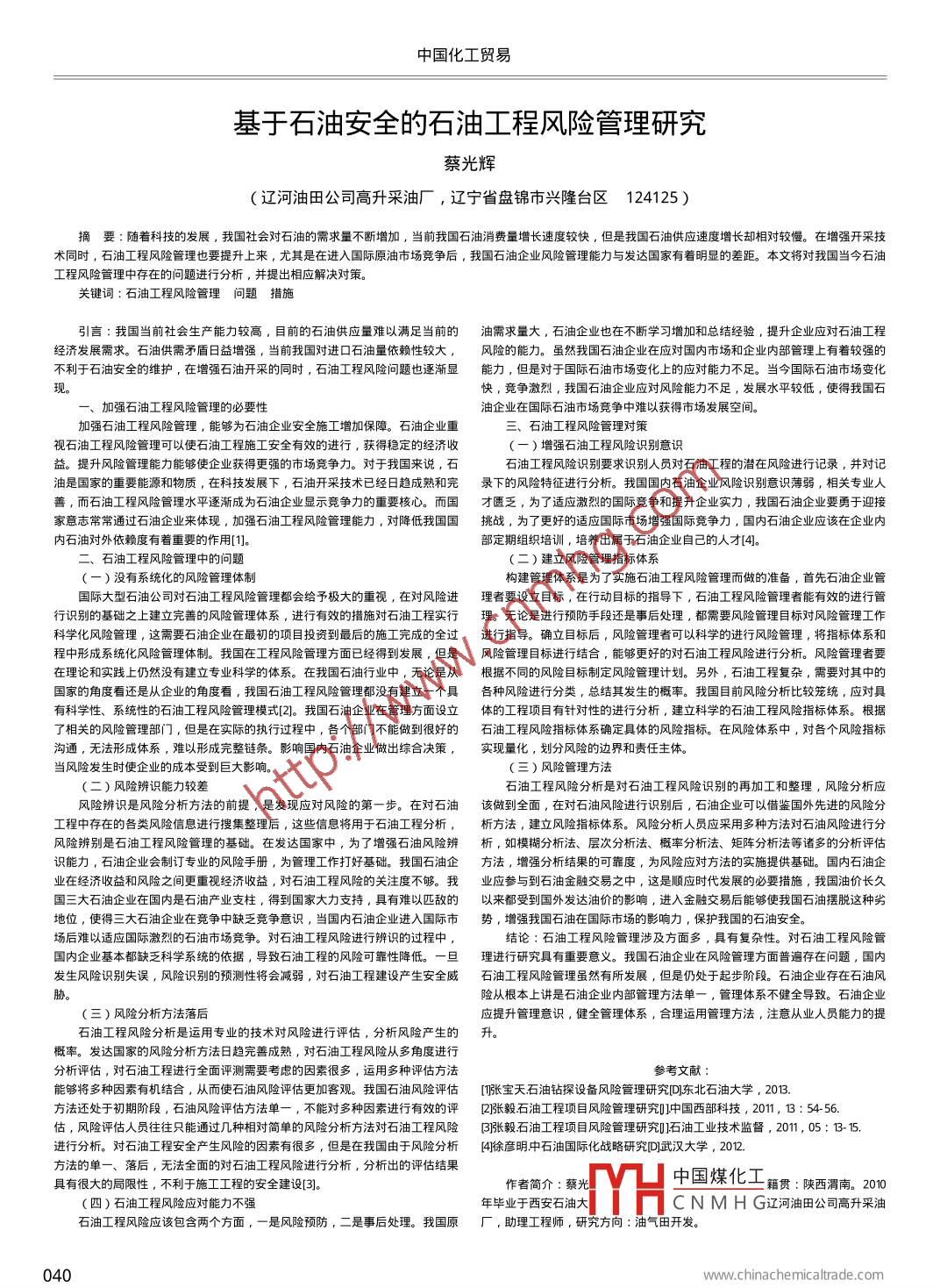 中國(guó)化工貿(mào)易基于石油安全的石油工程風(fēng)險(xiǎn)管理研究蔡光輝(遼河油田公司高升采油廠, 遼寧省盤(pán)錦市興隆臺(tái)區(qū)124125 )摘要:隨著科技的發(fā)展,我國(guó)社會(huì)對(duì)石油的需求量不斷增加,當(dāng)前我國(guó)石油消費(fèi)量增長(zhǎng)速度較快,但是我國(guó)石油供應(yīng)速度增長(zhǎng)卻相對(duì)較慢。在增強(qiáng)開(kāi)采技術(shù)同時(shí),石油工程風(fēng)險(xiǎn)管理也要提升上來(lái),尤其是在進(jìn)入國(guó)際原油市場(chǎng)競(jìng)爭(zhēng)后,我國(guó)石油企業(yè)風(fēng)險(xiǎn)管理能力與發(fā)達(dá)國(guó)家有著明顯的差距。本文將對(duì)我國(guó)當(dāng)今石油工程風(fēng)險(xiǎn)管理中存在的問(wèn)題進(jìn)行分析,并提出相應(yīng)解決對(duì)策。關(guān)鍵詞:石油工程風(fēng)險(xiǎn)管理問(wèn)題措施引言:我國(guó)當(dāng)前社會(huì)生產(chǎn)能力較高,目前的石油供應(yīng)量難以滿足當(dāng)前的油需求量大 ,石油企業(yè)也在不斷學(xué)習(xí)增加和總結(jié)經(jīng)驗(yàn),提升企業(yè)應(yīng)對(duì)石油工程經(jīng)濟(jì)發(fā)展需求。石油供需矛盾日益增強(qiáng),當(dāng)前我國(guó)對(duì)進(jìn)口石油量依賴性較大,風(fēng)險(xiǎn)的能力。 雖然我國(guó)石油企業(yè)在應(yīng)對(duì)國(guó)內(nèi)市場(chǎng)和企業(yè)內(nèi)部管理上有著較強(qiáng)的不利于石油安全的維護(hù),在增強(qiáng)石油開(kāi)采的同時(shí),石油工程風(fēng)險(xiǎn)問(wèn)題也逐漸顯能力 ,但是對(duì)于國(guó)際石油市場(chǎng)變化上的應(yīng)對(duì)能力不足。當(dāng)今國(guó)際石油市場(chǎng)變化現(xiàn)快,競(jìng)爭(zhēng)激烈,我國(guó)石油企業(yè)應(yīng)對(duì)風(fēng)險(xiǎn)能力不足, 發(fā)展水平較低,使得我國(guó)石-、加強(qiáng)石油工程風(fēng)險(xiǎn)管理的必要性油企業(yè)在國(guó)際石油市場(chǎng)競(jìng)爭(zhēng)中難以獲得市場(chǎng)發(fā)展空間。加強(qiáng)石油工程風(fēng)險(xiǎn)管理,能夠?yàn)槭推髽I(yè)安全施工增加保障。石油企業(yè)重三、石油工程風(fēng)險(xiǎn)管理對(duì)策視石油工程風(fēng)險(xiǎn)管理可以使石油工程施工安全有效的進(jìn)行,獲得穩(wěn)定的經(jīng)濟(jì)收( - )增強(qiáng)石油工程風(fēng)險(xiǎn)識(shí)別意識(shí)益。提升風(fēng)險(xiǎn)管理能力能夠使企業(yè)獲得更強(qiáng)的市場(chǎng)競(jìng)爭(zhēng)力。對(duì)于我國(guó)來(lái)說(shuō),石石油工程風(fēng)險(xiǎn)識(shí)別要求識(shí)別人員對(duì)石油工程的潛在風(fēng)險(xiǎn)進(jìn)行記錄,并對(duì)記油是國(guó)家的重要能源和物質(zhì),在科技發(fā)展下 ,石油開(kāi)采技術(shù)已經(jīng)日趨成熟和完錄 下的風(fēng)險(xiǎn)特征進(jìn)行分析。我國(guó)國(guó)內(nèi)石油企業(yè)風(fēng)險(xiǎn)識(shí)別意識(shí)薄弱,相關(guān)專業(yè)人善,而石油工程風(fēng)險(xiǎn)管理水平逐漸成為石油企業(yè)顯示競(jìng)爭(zhēng)力的重要核心。而國(guó)才匱乏 ,為了適應(yīng)激烈的國(guó)際競(jìng)爭(zhēng)和提升企業(yè)實(shí)力,我國(guó)石油企業(yè)要勇于迎接家意志常常通過(guò)石油企業(yè)來(lái)體現(xiàn),加強(qiáng)石油工程風(fēng)險(xiǎn)管理能力,對(duì)降低我國(guó)國(guó)挑戰(zhàn) ,為了更好的適應(yīng)國(guó)際市場(chǎng)增強(qiáng)國(guó)際競(jìng)爭(zhēng)力,國(guó)內(nèi)石油企業(yè)應(yīng)該在企業(yè)內(nèi)內(nèi)石油對(duì)外依賴度有著重要的作用[1]。部定期組織培訓(xùn),培養(yǎng)出屬于石油企業(yè)自己的人才[4]。二-、石油工程風(fēng)險(xiǎn)管理中的問(wèn)題(二)建立風(fēng)險(xiǎn)管理指標(biāo)體系(一)沒(méi)有系統(tǒng)化的風(fēng)險(xiǎn)管理體制構(gòu)建管理體系是為了實(shí)施石油工程風(fēng)險(xiǎn)管理而做的準(zhǔn)備,首先石油企業(yè)管國(guó)際大型石油公司對(duì)石油工程風(fēng)險(xiǎn)管理都會(huì)給予極大的重視,在對(duì)風(fēng)險(xiǎn)進(jìn)理 者要設(shè)立目標(biāo),在行動(dòng)目標(biāo)的指導(dǎo)下,石油工程風(fēng)險(xiǎn)管理者能有效的進(jìn)行管行識(shí)別的基礎(chǔ)之上建立完善的風(fēng)險(xiǎn)管理體系, 進(jìn)行有效的措施對(duì)石油工程實(shí)行理。 無(wú)論是進(jìn)行預(yù)防手段還是事后處理,都需要風(fēng)險(xiǎn)管理目標(biāo)對(duì)風(fēng)險(xiǎn)管理工作科學(xué)化風(fēng)險(xiǎn)管理,這需要石油企業(yè)在最初的項(xiàng)目投資到最后的施工完成的全過(guò)進(jìn)行指導(dǎo)。 確立目標(biāo)后,風(fēng)險(xiǎn)管理者可以科學(xué)的進(jìn)行風(fēng)險(xiǎn)管理,將指標(biāo)體系和程中形成系統(tǒng)化風(fēng)險(xiǎn)管理體制。我國(guó)在工程風(fēng)險(xiǎn)管理方面已經(jīng)得到發(fā)展,但是風(fēng)險(xiǎn)管理 目標(biāo)進(jìn)行結(jié)合,能夠更好的對(duì)石油工程風(fēng)險(xiǎn)進(jìn)行分析。風(fēng)險(xiǎn)管理者要在理論和實(shí)踐,上仍然沒(méi)有建立專業(yè)科學(xué)的體系。在我國(guó)石油行業(yè)中,無(wú)論是從根據(jù)不同的風(fēng)險(xiǎn) 目標(biāo)制定風(fēng)險(xiǎn)管理計(jì)劃。另外,石油工程復(fù)雜,需要對(duì)其中的國(guó)家的角度看還是從企業(yè)的角