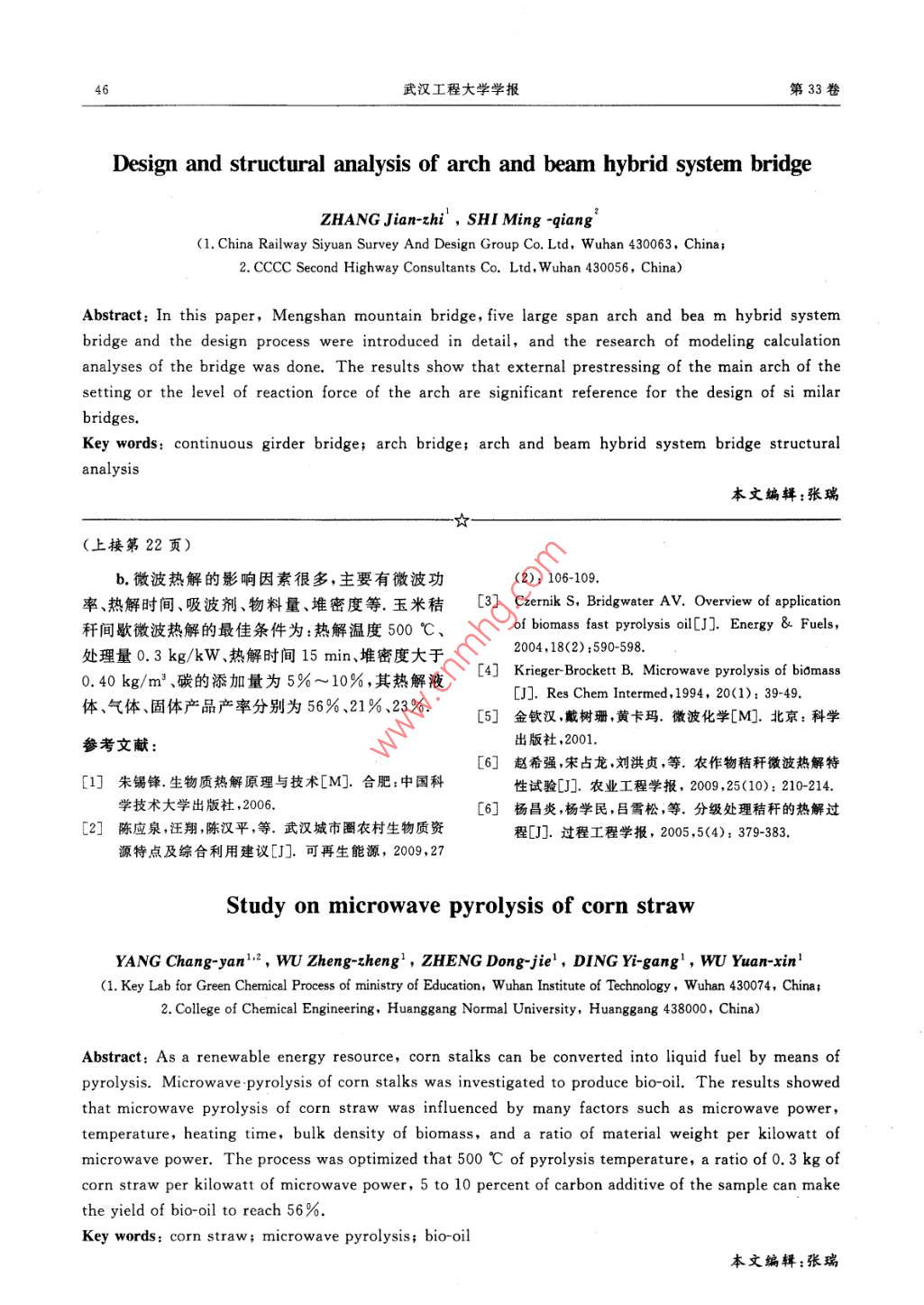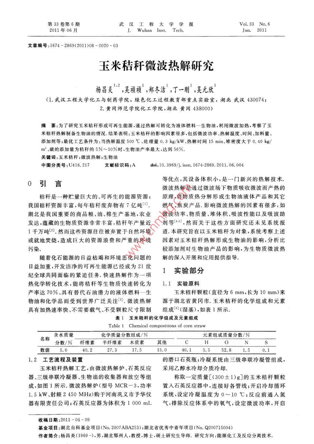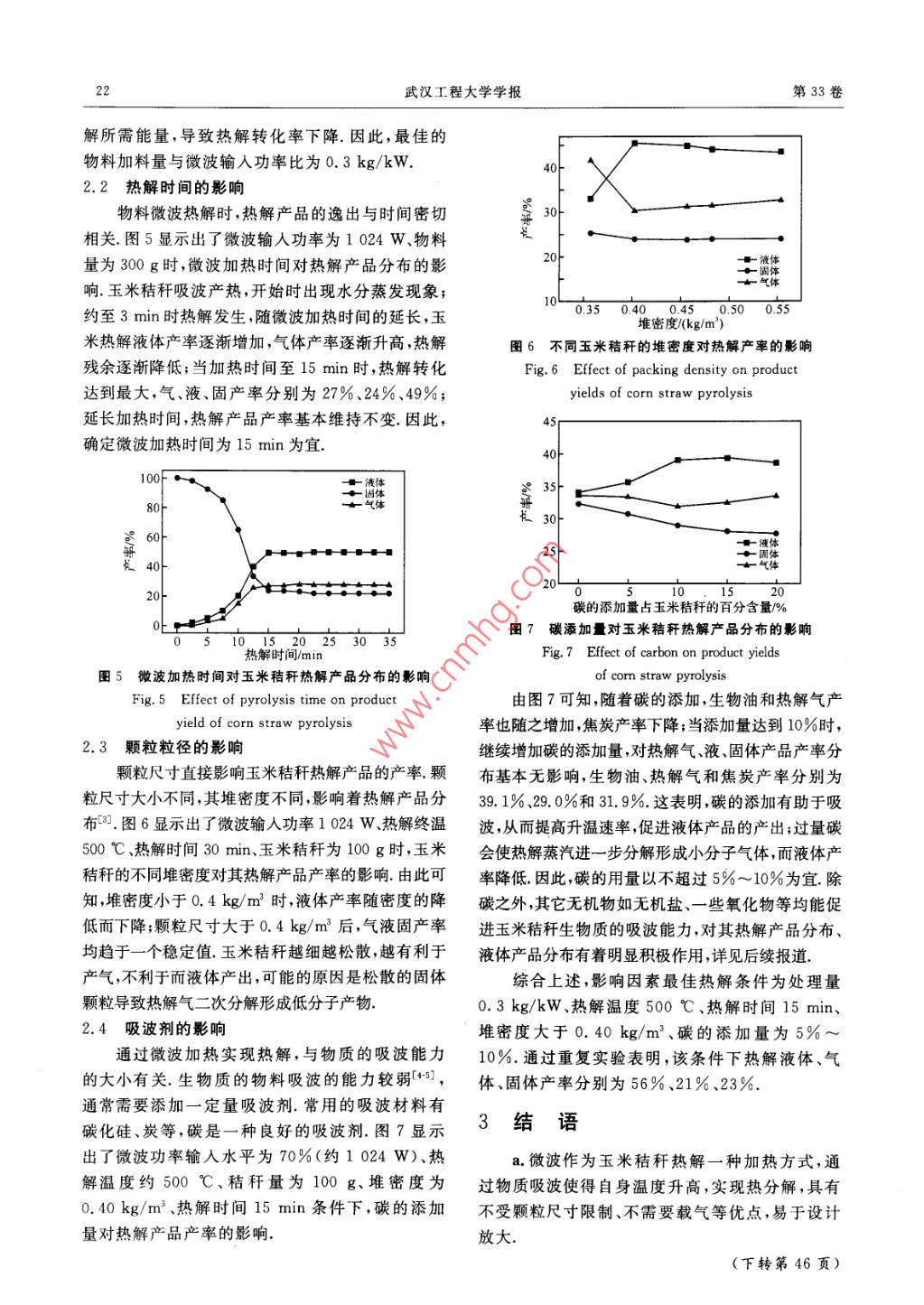 第33卷第6期武漢工程大學(xué)學(xué)報(bào)Vol 33 No 62011年06月. Wuhan Inst. TechJun. 201文章編號(hào):1674-2869(2011)06-0020-03玉米秸稈微波熱解研究楊昌炎,吳禎禎,鄭冬潔,丁一剛,吳元欣(1.武漢工程大學(xué)化工與制藥學(xué)院,綠色化工過程教育部重點(diǎn)實(shí)驗(yàn)室,湖北武漢430074;2.黃岡師范學(xué)院化工學(xué)院,湖北黃岡438000)摘要:為了研究玉米秸稈形成可再生能源,通過熱解可轉(zhuǎn)化為液體燃料一生物油,利用微波加熱,考察了玉米秸稈熱解制備生物油的情況.結(jié)果表明:玉米秸稈的影響因素很多,包括徵波功率、熱解溫度、時(shí)間、加料量添加劑等;最優(yōu)工藝條件為:當(dāng)熱解溫度500℃、處理量0.3kg/kW、熱解時(shí)間15min堆密度大于0.40kgm3碳的添加量為秸稈的5%~10%時(shí),生物油產(chǎn)率最大,達(dá)到56%關(guān)鍵詞:玉米秸稈;微波熱解;生物油中圖分類號(hào):U416.217文獻(xiàn)標(biāo)識(shí)碼:Adoi:10.3969/j.issn.1674-2869.2011.06.004引言等優(yōu)點(diǎn),其設(shè)備體積小,是一門新興的熱解技術(shù)微波熱解是通過微波場(chǎng)下物質(zhì)吸收微波而產(chǎn)熱的秸稈是一種貯量巨大的、可再生的能源資源;原理,將物質(zhì)熱分解形成生物油液體產(chǎn)品和其它我國(guó)秸稈資源豐富,每年秸稈廢棄物有7億噸口.燃?xì)?、焦炭產(chǎn)品.影響微波熱解的因素有很多,如湖北是我國(guó)重要的商品糧、油、棉生產(chǎn)基地,農(nóng)業(yè)微波功率、物質(zhì)量、堆體積、吸波性能以及吸波助發(fā)達(dá),蘊(yùn)藏的生物質(zhì)資源非常豐富,秸稈年產(chǎn)量近劑等3,然而關(guān)于這些方面研究還未見系統(tǒng)報(bào)1千萬噸[2.然而這些資源往往被棄置于自然環(huán)境道.本研究旨在以玉米秸稈為對(duì)象,系統(tǒng)考察上述或就地焚燒,造成巨大的資源浪費(fèi)和嚴(yán)重的環(huán)境因素對(duì)玉米秸稈熱解形成生物油的影響,分析比污染較添加劑對(duì)生物油產(chǎn)品的影響,為生物質(zhì)微波熱隨著化石能源的日益枯竭和環(huán)境惡化問題的解的深入開展和應(yīng)用提供指導(dǎo)日益加重,開發(fā)潔凈的可再生能源已經(jīng)成為21世紀(jì)全球共同面臨的緊迫任務(wù)快速熱解作為一項(xiàng)1實(shí)驗(yàn)部分熱化學(xué)轉(zhuǎn)化技術(shù),能將秸稈等生物質(zhì)快速轉(zhuǎn)化為1.1實(shí)驗(yàn)原料產(chǎn)率達(dá)70%、具有替代石油潛力的液體燃料一生玉米秸稈顆粒(直徑為6mm,長(zhǎng)為10mm)來物油和化學(xué)品而受到世界廣泛關(guān)注3.微波熱解源于湖北省黃岡市.玉米秸稈的化學(xué)組成和元素具有加熱速率快、不需要載氣、不受顆粒尺寸限制組成(濕基),如表1所示表1玉米秸稈的化學(xué)組成及元素組成Table 1 Chemical compositions of corn straw名稱含水質(zhì)量化學(xué)質(zhì)量分?jǐn)?shù)組成/%元素組成質(zhì)量分?jǐn)?shù)/%分?jǐn)?shù)/%纖維素半纖維素木質(zhì)素其他CH數(shù)值5.040.227,317.515.040.15,552.81.50.11,2工藝流程及裝置的磨口石英瓶;冷凝系統(tǒng)由三級(jí)串聯(lián)冷凝管組成,玉米秸稈熱解工藝,由微波熱解爐、石英反應(yīng)采用乙醇水冷卻介質(zhì)冷卻器、三級(jí)串聯(lián)冷凝器、生物油的收集器和放空等組稱取一定質(zhì)量[(300±1)g]的玉米秸稈顆粒成,如圖1所示.微波熱解爐(型號(hào)MCR-3,功率置人石英反應(yīng)器中,連接好各管線;開啟冷卻循環(huán)1.5kW、射頻2450MHz)購于河南鞏義市予華儀系統(tǒng),設(shè)定冷凝溫度為0~10℃;反應(yīng)前通入氮器有限責(zé)任公司;石英反應(yīng)器為體積為1000mL氣,排除反應(yīng)體系中的氧氣,設(shè)定微波功率,開啟收稿日期:2011-04-09基金項(xiàng)目:湖北自科基金項(xiàng)目(No.2007ABA253);湖北省優(yōu)秀中青年項(xiàng)目(No.Q200715004)作者簡(jiǎn)介;楊昌炎(1969-),男,湖北鄂州人,教授,博士,碩士研究生導(dǎo)師.研究方向:能源化工及反應(yīng)分離技術(shù)第6期楊昌炎,等:玉米秸稈微波熱解研究微波熱解爐,待管內(nèi)基本無熱解氣逸出時(shí),停止加60%~70%;當(dāng)進(jìn)一步增加輸入功率時(shí),溫度開始逐熱,立即取出石英反應(yīng)器,采用熱電偶測(cè)定瓶?jī)?nèi)物步上升,滿功率輸入時(shí)熱解溫度達(dá)到535℃.料溫度;當(dāng)石英反應(yīng)器冷卻至室溫,稱重.熱解蒸2.1.2熱解產(chǎn)品產(chǎn)率常壓下壓吸波劑添加汽經(jīng)過冷凝形成的生物油,通過收集瓶收集;附著下,熱解時(shí)間為30min時(shí),玉米秸稈(300±1)g熱在冷凝管內(nèi)壁的生物油,采用乙醇洗滌,再用旋轉(zhuǎn)解時(shí)其熱解產(chǎn)品產(chǎn)率受輸入功率水平大小的影蒸發(fā)器脫去乙醇后,冷卻至室溫,與收集瓶中的生響,如圖3所示物油合并,稱重圖1微波熱解工藝流程輸入功率占總功率的百分?jǐn)?shù)%Fig 1 Process of microwave pyrolysis圖3微波輸入水平對(duì)玉米秸稈熱解產(chǎn)品產(chǎn)率的影響注:1.石英反應(yīng)器;2.微波熱解爐;3.冷凝管;Fig 3 Effect of different power levels on product4冷凝管;5.收集瓶;6冷凝管;7.放空yields of corn straw pyrolysis1.3計(jì)算方法由圖3可知,隨著微波輸入功率的增加,生物生物油產(chǎn)率(溫基)為所收集的生物油占玉米油產(chǎn)率逐漸上升,當(dāng)輸入功率達(dá)到總功率的40%秸稈總質(zhì)量的百分?jǐn)?shù);焦炭產(chǎn)率為石器、英反應(yīng)器時(shí),生物油產(chǎn)率基本穩(wěn)