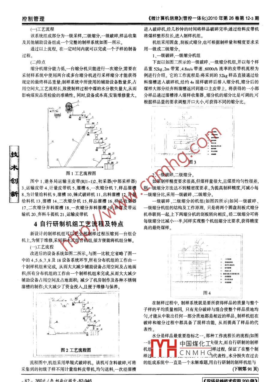 您的論文得到兩院院士關(guān)注控制管理文章編號:1008- 0570(2010)12- -3 -0081-02大型煤炭制樣機(jī)組的研制及應(yīng)用development and application of large scale coal sample producing system(秦皇島出入境檢驗(yàn)檢疫局張躍田浩ZHANG Yue TIAN Hao摘要:近幾年來,隨著煤炭內(nèi)貿(mào)的大幅增長及采祥設(shè)備的嚴(yán)重老化,迫切需要增設(shè)制樣系統(tǒng)以滿足頻繁的煤炭檢驗(yàn)工作。在充分吸取和總結(jié)20多年來在采制樣設(shè)備的引進(jìn)、使用和維修改造過程中所積累的知識和經(jīng)驗(yàn)的基礎(chǔ)上,率先在國內(nèi)自行研制成功了大型全自動謀炭采制祥系統(tǒng)-一制樣機(jī)組。該制樣機(jī)組2004年10月14日已通過河北省檢驗(yàn)檢疫局驗(yàn)收,符合1IS013909標(biāo)準(zhǔn),質(zhì)量總評為優(yōu),并在秦皇島港所有煤炭碼頭中推廣應(yīng)用,效盛頗佳。目前正在申請中華人民共和國知識產(chǎn)權(quán)局專利。關(guān)鍵詞:煤炭;制樣機(jī)組;研制和應(yīng)用中圖分類號: TQ533文獻(xiàn)標(biāo)識碼: BAbstract : In reent years;as the development of domestic trade and the serious aging of euipmenls,we urgent needto add newsampling and sample making machines to satisty our frequent coal inspection lsksAcordingn to 20 years experience of samplingwork,including sampling coal, making samples and machine maintenance, we scsulll reearched and developed large scale bulkgoods lerminal fully automatic sampling sysem 一一Sampling Sets. The innovation passed the acceptance of Hebei Inspection an術(shù)Quarantine Bureau on Oectober 14h2004,and it meet the IS013909 standard very wll,plus that is achieved Super Good qulficatin.Recenuly, lhe Sampling Selts is developed and aplied very well in all Coal port in Qinhuangdao.It is now under the proces of appli創(chuàng)cation for patent of Stale Ielletual Property Ofice of the People' s Republic of China.Key words: Coal Sample making equipment sets' Research and Application新1引言2制樣機(jī)組在煤炭內(nèi)外貿(mào)易中的作用我國是世界上最大的煤炭生產(chǎn)國和使用國,煤炭國際貿(mào)易大型煤炭采制樣機(jī)組是在煤炭輸送過程中自動進(jìn)行采樣、和國內(nèi)貿(mào)易的健康發(fā)展離不開公正的第三方品質(zhì)檢驗(yàn)。由于煤制樣、化驗(yàn)、化驗(yàn)結(jié)果分析等采集系列信息的工具,用以確定該炭具有品質(zhì)和顆粒不均勻的特性,因此對于商品煤準(zhǔn)確采取具批煤的質(zhì)量。有代表性的樣品十分重要。該設(shè)備廣泛用于煤港、煤炭發(fā)電廠洗煤廠、發(fā)煤站、煤礦從整批煤炭中抽取一部分煤樣進(jìn)行化學(xué) 、物理性質(zhì)的檢驗(yàn),等生產(chǎn) 及銷售單位。使用者根據(jù)該批煤炭的化驗(yàn)結(jié)果(如全水、其抽取過程就叫煤炭采樣。所抽取的這部分煤炭叫煤樣。采樣內(nèi)水 、灰分、硫發(fā)熱量等煤質(zhì)情況)對環(huán)境影響做出正確評估,是煤炭品質(zhì)檢驗(yàn)的首要環(huán)節(jié),也是最易產(chǎn)生誤差的過程。據(jù)統(tǒng)用以指導(dǎo)生產(chǎn) ,提高經(jīng)濟(jì)利益。同時,根據(jù)煤炭的質(zhì)量,也可作為計(jì),由采樣所產(chǎn)生的誤差占煤炭品質(zhì)檢驗(yàn)總誤差的85%左右。煤炭 貿(mào)易買賣雙方的結(jié)算依據(jù)。傳統(tǒng)的手工采樣不僅勞動強(qiáng)度大,而且采樣精度低。因此,手工近年來,人們的質(zhì)量意識、環(huán)境意識越來越強(qiáng),許多單位對采樣正逐步被機(jī)械自動化采樣所代替。機(jī)械自動化采制樣系統(tǒng)經(jīng)濟(jì)效 益的要求越來越高,對環(huán)境等方面的要求也越來越嚴(yán)格??梢栽诟咚龠\(yùn)行的煤流中采取樣品,規(guī)避了人工采樣容易產(chǎn)生因此,煤炭港口 、發(fā)煤站、洗煤廠、煤礦電廠、焦化廠、鋼鐵廠等的誤差,減少了人力,確保了采樣人員的安全和煤炭運(yùn)輸設(shè)備的單位紛紛安裝使用煤 炭采制樣設(shè)備,從而達(dá)到提高經(jīng)濟(jì)效益,控正常運(yùn)轉(zhuǎn)。制污染物排放,保護(hù)交易雙方的根本利益的目的。秦皇島港是我國最大的煤炭輸出港,20多年來,隨著秦皇島3目前國內(nèi)技術(shù)狀況及使用情況港煤二期、煤三期和煤四期港口建設(shè),相繼配套引進(jìn)了8套機(jī)械化采制樣設(shè)備,這些設(shè)施的引進(jìn)和使用,極大的促進(jìn)了煤炭內(nèi)、目前國內(nèi)的采制樣系統(tǒng)基本上都是用各種單--功能的設(shè)外貿(mào)易事業(yè)的發(fā)展。21世紀(jì)是技術(shù)創(chuàng)新的世紀(jì),我們在掌握煤備,即用皮帶機(jī)及溜槽等 輔助設(shè)備制成系統(tǒng),這樣的結(jié)果造成系炭采制祥國際標(biāo)準(zhǔn)的基礎(chǔ)上,充分吸取和總結(jié)了20多年來在采統(tǒng)龐大 占用面積大、機(jī)房結(jié)構(gòu)大、基礎(chǔ)成本高、浪費(fèi)材料、系統(tǒng)制樣設(shè)備引進(jìn)使用和維修改造過程中所積累的知識和經(jīng)驗(yàn),提故障點(diǎn)多、維修量大等缺點(diǎn),不僅浪費(fèi)許多人力.物力和財(cái)力,而出了走國產(chǎn)化自行研制之路,充分發(fā)揮秦皇島檢驗(yàn)檢疫局在人且樣品中國煤化工佳的技術(shù)要求,影響煤炭才、技術(shù)和經(jīng)驗(yàn)上的優(yōu)勢,率先在國內(nèi)研制大型全自動煤炭采制檢驗(yàn)最YHCNMHG樣系統(tǒng)-- -制樣機(jī)組。45進(jìn)制樣機(jī)組的工藝流程及特點(diǎn)下面以港口裝船生產(