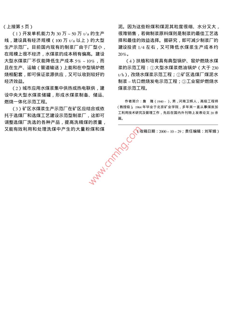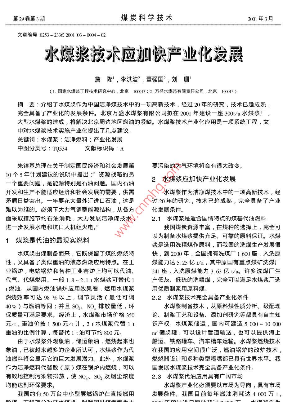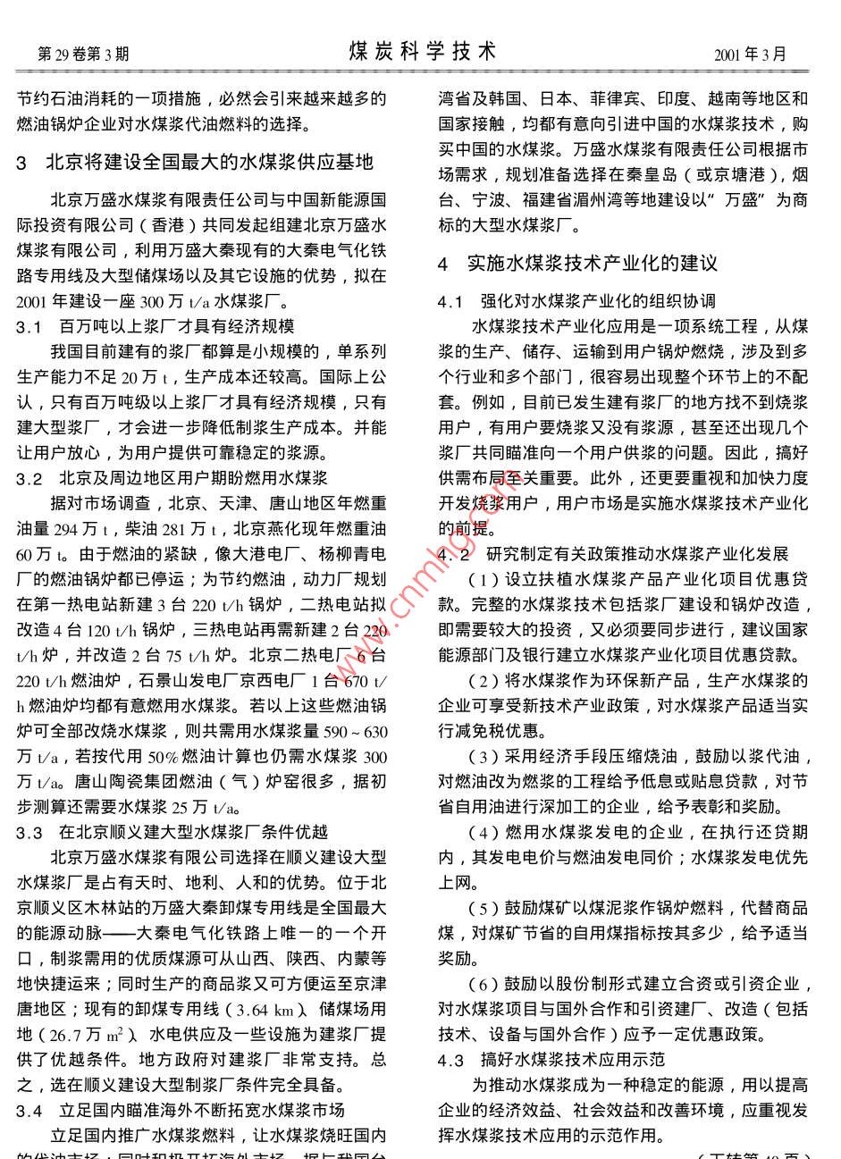 第29卷第3期煤炭科學(xué)技術(shù)2001年3月文章編號(hào)m253-233200)3-0004-02水煤漿技術(shù)應(yīng)加快產(chǎn)業(yè)化發(fā)展詹隆,李洪波2,董強(qiáng)國(guó)2,劉珊(1.國(guó)家水煤漿工程技術(shù)研究中心,北京100013:2.萬(wàn)盛水煤漿有限責(zé)任公司,北京10003)摘要:介紹了水煤漿作為中國(guó)潔凈煤技術(shù)中的一項(xiàng)高新技術(shù),經(jīng)過(guò)20年的研究,技術(shù)已趨成熟,完全具備了產(chǎn)業(yè)化的發(fā)展條件。北京萬(wàn)盛水煤漿有限公司擬在2001年建設(shè)一座300t/a水煤漿廠大型水煤漿的建成,將解決北京周邊地區(qū)燃油的緊缺。水煤漿技術(shù)產(chǎn)業(yè)化應(yīng)用是一項(xiàng)系統(tǒng)工程,文中對(duì)水煤漿技術(shù)實(shí)施產(chǎn)業(yè)化提出了幾點(diǎn)建議關(guān)鍵詞∶水煤漿;潔凈燃料;產(chǎn)業(yè)化發(fā)展中圖分類號(hào):mQ534文獻(xiàn)標(biāo)識(shí)碼:A朱镕基總理在關(guān)于制定國(guó)民經(jīng)濟(jì)和社會(huì)發(fā)展第要污染的大氣環(huán)境將會(huì)有很大改變。10個(gè)5年計(jì)劃建議的說(shuō)明中指出:資源戰(zhàn)略的另個(gè)重要問(wèn)題,是能源特別是石油問(wèn)題。國(guó)內(nèi)石油2水煤漿應(yīng)加快產(chǎn)業(yè)化發(fā)展開(kāi)發(fā)和生產(chǎn)不能適應(yīng)經(jīng)濟(jì)和社會(huì)發(fā)展的需要,供需水煤漿作為潔凈煤技術(shù)中的一項(xiàng)高新技術(shù),經(jīng)矛盾日益突出。一年要花大量外匯進(jìn)口石油,這是過(guò)20年的研究,技術(shù)已趨成熟,完全具備了產(chǎn)業(yè)難以為繼的。必須下大力氣調(diào)整能源結(jié)構(gòu),從各方化發(fā)展條件。面采取措施節(jié)約石油消耗,大力發(fā)展?jié)崈裘杭夹g(shù)2.1水煤漿是適合國(guó)情特點(diǎn)的煤基代油燃料進(jìn)一步發(fā)展水電和坑口大機(jī)組火電。我國(guó)煤炭資源豐富,在煤種的選擇上,完全可煤漿是代油的最現(xiàn)實(shí)燃料以為制備水煤漿提供充足、可靠的原料保證。水煤漿是選用洗精煤作原料,而我國(guó)的洗煤生產(chǎn)發(fā)展很水煤漿由煤制備而來(lái),它既保留了煤的燃燒特快,到2000年,全國(guó)擁有洗煤廠1600座,入洗原性,又具備了類似重油的液態(tài)燃燒應(yīng)用特點(diǎn)。在工煤能力達(dá)5.25億υa,其中原國(guó)有重點(diǎn)煤礦洗煤廠業(yè)鍋爐,電站鍋爐和各種工業(yè)窯爐上均可以代油、241座,入洗原煤能力3.63億υa。許多洗煤廠生代氣、代煤燃用。一般1.8~2.1t水煤漿可替代1產(chǎn)低灰、低硫的洗精煤,完全可以滿足水煤漿廠選t燃油。從囯內(nèi)燃油鍋爐應(yīng)用效果看,燃用水煤漿用優(yōu)質(zhì)制漿用原料煤。燃燒效率可達(dá)98%以上,調(diào)節(jié)靈活(最低可調(diào)2.2水煤漿技術(shù)完全具備產(chǎn)業(yè)化條件40%)與燃油等同;并且SO2、NO排放量低,環(huán)水煤漿制備技術(shù),從原料煤性質(zhì)分析、級(jí)配理保質(zhì)量可滿足要求。經(jīng)濟(jì)上,水煤漿市場(chǎng)價(jià)格350論、制漿工藝和設(shè)備、添加劑研究等都具有自主知元/t,重油價(jià)按1500元/t計(jì),2t水煤漿代替1t識(shí)產(chǎn)權(quán)。水煤漿儲(chǔ)運(yùn),國(guó)內(nèi)可建造5000~1000重油的比例計(jì)算,每替代1t油可節(jié)約800元。m3儲(chǔ)漿罐,可以設(shè)計(jì)管道輸送,也可以提供海上由于水煤漿外觀象油,儲(chǔ)運(yùn)象油,燃燒起來(lái)也船運(yùn)、鐵路罐車、汽車槽車運(yùn)輸。水煤漿燃燒技術(shù)象油,已被越來(lái)越多的企業(yè)所認(rèn)可,水煤漿作為代在我國(guó)的應(yīng)用空間很廣泛,燃油鍋爐的改爐技術(shù)油燃料將會(huì)顯示它的巨大發(fā)展?jié)摿?。此?水煤漿燃燒器設(shè)計(jì)和多種類型噴嘴都已具有世界水平。我作為潔凈燃料代替散(原)煤在鍋爐內(nèi)燃燒,可以國(guó)發(fā)展水煤漿技術(shù)完全具備產(chǎn)業(yè)化條件。有效地控制污染物排放,使NO、SO2及煙塵濃度2.3水煤漿代油應(yīng)用具有廣闊市場(chǎng)均能達(dá)到環(huán)保要求。水煤漿產(chǎn)業(yè)化必須要以市場(chǎng)為導(dǎo)向,具有市場(chǎng)我國(guó)約有50萬(wàn)臺(tái)中小型層燃鍋爐在直接燃用發(fā)展條件。我國(guó)目前每年燃油消耗達(dá)4000萬(wàn)t,第29卷第3期煤炭科學(xué)技術(shù)2001年3月節(jié)約石油消耗的一項(xiàng)措施,必然會(huì)引來(lái)越來(lái)越多的灣省及韓國(guó)、日本、菲律賓、印度、越南等地區(qū)和燃油鍋爐企業(yè)對(duì)水煤漿代油燃料的選擇。國(guó)家接觸,均都有意向引進(jìn)中國(guó)的水煤漿技術(shù),購(gòu)3北京將建設(shè)全國(guó)最大的水煤漿供應(yīng)基地買中國(guó)的水煤漿。萬(wàn)盛水煤漿有限責(zé)任公司根據(jù)市場(chǎng)需求,規(guī)劃準(zhǔn)備選擇在秦皇島(或京塘港),煙北京萬(wàn)盛水煤漿有限責(zé)任公司與中國(guó)新能源國(guó)臺(tái)、寧波、福建省湄州灣等地建設(shè)以"萬(wàn)盛”為商際投資有限公司(香港)共同發(fā)起組建北京萬(wàn)盛水標(biāo)的大型水煤漿廠。煤漿有限公司,利用萬(wàn)盛大秦現(xiàn)有的大秦電氣化鐵路專用線及大型儲(chǔ)煤場(chǎng)以及其它設(shè)施的優(yōu)勢(shì),擬在4實(shí)施水煤漿技術(shù)產(chǎn)業(yè)化的建議2001年建設(shè)一座300萬(wàn)ta水煤漿廠4.1強(qiáng)化對(duì)水煤漿產(chǎ