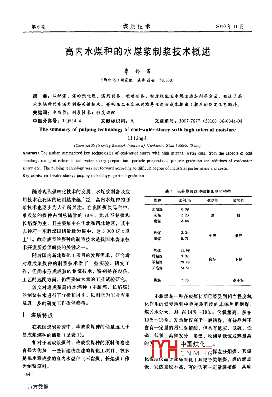 高內(nèi)水煤種的水煤漿制漿技術(shù)概述