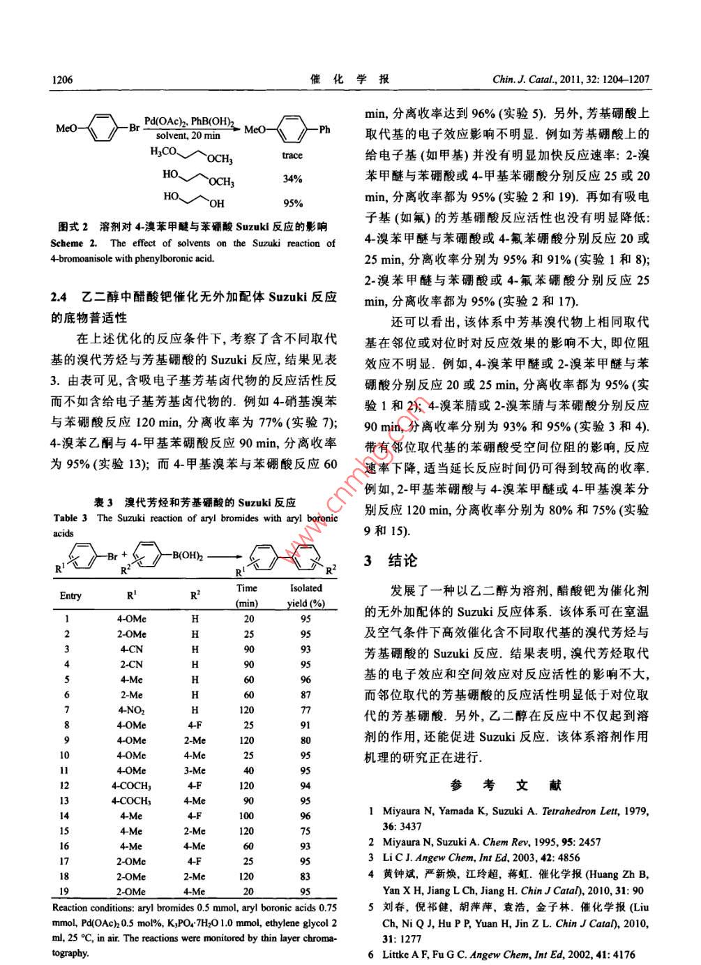 2011Chinese Journal of catalysisVol 32 No. 7文章編號:0253-9837(2011)07-1204-04DoI:10.3724SPJ.1088.2011.10225研究論文:1204120乙二醇中鈀催化無配體的室溫 Suzuki反應(yīng)劉春,韓娜,袁浩,何曉字,金子林大連理工大學(xué)精細化工國家重點實驗室,遼寧大連116024摘要:報道了一種在室溫下醋酸鈀催化乙二醇中無外加配體的 Suzuk反應(yīng)體系.以K3PO47H2O為堿,在該體系中可高效進行芳基溴代物和芳基硼酸的 Suzuki交叉偶聯(lián)反應(yīng),具有反應(yīng)條件溫和、無需惰性氣體保護等特點.在n(ABr)=0.5mmoln(ArB(OH2)=075mmol,x(Pd(OAc)=0.5mol%,n(KPO47H2O)=1.0mmol,v乙二醇)=2ml的優(yōu)化條件下,4-溴苯甲醚和苯硼酸反應(yīng)20min,分離收率即達95%關(guān)鍵詞: Suzuki反應(yīng);鈀;無配體;乙二醇;室溫中圖分類號:0643文獻標(biāo)識碼:A收稿日期:2011-0220.接受日期:201103-16.通訊聯(lián)系人.電話傳真:(041184986182;電子信箱:ciu@dlut.edu.cn基金來源:國家自然科學(xué)基金(21076034,20976024,20923006);中央高?;究蒲袠I(yè)務(wù)費專項資金( DUTIILKI5)Pd(oAc)2-Catalyzed Ligand-Free Suzuki Reaction in Ethylene Glycolt room TemperatureLIU Chun, HAN Na, YUAN Hao, HE Xiaoyu, JiN ZilinState Key Laboratory of Fine Chemicals, Dalian University of Technology, Dalian 116024, Liaoning, ChinaAbstract: An aerobic and efficient protocol has been developed for the pd(OAch-catalyzed ligand-free Suzuki reaction of aryl bromideswith aryl boronic acids in ethylene glycol at room temperature, affording cross-coupling products in good to excellent yields. Under the op-ized reaction conditions (i.e, 0.5 mmol ArBr, 0.75 mmol ArB(OH), 0.5 mol% Pd(OAch, 1.0 mmol K,PO4 7H20, and 2 ml ethyleneglycol), the Suzuki reaction between 4-bromoanisole and phenylboronic acid provided a 95% isolated yield in 20 minKey words: Suzuki reaction; palladium; ligand-free; ethylene glycol; room temperatureReceived 20 February 2011. Accepted 16 March 2011.*Correspondingauthor.Tel/Fax+86-411-84986182:E-mail:cliu@dut.edu.cnThis work was supported by the National Natural Science Foundation of China(21076034, 20976024, 20923006) and the FundamentalResearch Funds for the Central Universities(DUTIILK15)Suz山k交又偶聯(lián)反應(yīng)是現(xiàn)代有機合成中構(gòu)建體等但大多數(shù)配體存在合成困難,成本較高,且CC鍵最為有效的方法之一-.它具有反應(yīng)條件溫和、有機硼試劑低毒和穩(wěn)定性好、底物適用范圍廣ArAreductivePd(0)dativ等優(yōu)點,已廣泛應(yīng)用于天然產(chǎn)物、醫(yī)藥、農(nóng)藥、除草eliminationaddition劑、高分子傳導(dǎo)材料和液晶材料等的合成67.目前ArPd(Ⅱ} Ar Ar-Pd(l)X公認的 Suzuk反應(yīng)機理分為三個步驟,依次為氧化加成、金屬轉(zhuǎn)移化和還原消除(見圖式1),其中氧XB(OH Ar'B(OH)化加成為反應(yīng)決速步驟圖式1鈀催化的Suuk反應(yīng)機理該反應(yīng)通常需要添加膦配體或M雜環(huán)卡賓配Scheme 1. Mechanism of palladium-catalyzed Suzuki reaction.www.chxb.cn劉春等:乙二醇中鈀催化無配體的室溫 Suzuki反應(yīng)1205對水和氧敏感,反應(yīng)過程中需要溶劑除水和惰性氣表1催化劑前體對4溴苯甲醚與苯硼酸S以四k反應(yīng)的影體保護等措施等問題,因而限制了它的應(yīng)用.Pd催化無配體的反應(yīng)體系因具有操作簡單和成本低等優(yōu)點Table 1 Effect of precatalysts on the Suzuki reaction of4-bromoanisole and phenylboronic acid而備受關(guān)注1.目前,有機溶劑作為反應(yīng)介質(zhì)已廣Meo泛應(yīng)用于無配體的Suuk反應(yīng)Deng等以乙醇為溶劑,與PdOA)2NaoH3組成催化體系考察了芳Isolated yield (%基溴代物和芳基碘代物的 Suzuk反應(yīng)Yin等18報PCh210% Pd/Ctrace道了在分子量為300的聚乙二醇中,以PCl2為催化Pd,(dba劑的高效催化芳基氯代物與芳基硼酸的無配體Su- Reaction conditions:4 bromozuki反應(yīng)0.75 mmol, Pd 0.5 mol%, K, PO. 7Hyo 1.0 mmol, ethylene glycol 2 mL,最近,本課題組報道了一個甲苯中醋酸鈀催化25. C, 20 min, in air. The reactions were monitored by thin layerchromatography.無配體的 Suzuki反應(yīng)體系,以K3PO47H2O為堿,在空氣中即可高效催化芳基溴代物和芳基硼酸的Su-22堿對 Suzuki反應(yīng)的影響zuk反應(yīng)19.因此,發(fā)展新型鈀催化無外加配體的表2為堿對4-溴苯甲醚與苯硼酸的 Suzuki反Suuk反應(yīng)體系仍具有學(xué)術(shù)意義和應(yīng)用價值應(yīng)的影響.由表可見,在本文考察的堿中,以本文報道一種在乙二醇中Pd(OAc)2催化無配K3PO47H2O的促進效果最強,反應(yīng)20min,產(chǎn)物分體的 Suzuki反應(yīng)體系,在該體系中,芳基溴代物和離收率達95%;其次是K2CO3,反應(yīng)60min,產(chǎn)物分芳基硼酸的 Suzuki交叉偶聯(lián)反應(yīng)可在室溫及空氣離收率達88%.另外,相對于鉀鹽,以CH3ONa和條件下快速高效地進行,并發(fā)現(xiàn)乙二醇中羥基能促NaOH為堿,反應(yīng)20min,產(chǎn)物收率較低.由此可見,進 Suzuki反應(yīng)鉀鹽好于鈉鹽,這可能是由于具有較大離子半徑的鉀離子在金屬交換過程中起到模板作用,因而促進1實驗部分了該步驟的進行20于二口瓶中,依次加入溴代芳烴(0.5mmol)、芳表2堿對4溴苯甲醚與苯硼酸 Suzuki反應(yīng)的影響基硼酸(0.75mmol)、堿(1.0mo)、Pd催化劑(0.5 Table2 Effect of bases on the Suzuki reaction of4 bromoanisole andmol%, Pd(oAc)2和PdCl2購自 Alfa Aesar公司ronIc aPd2(dba)3購自Acos公司,PdC購自 Fluka公司)和Time(min) lsolated yield (%K,PO.7HO乙二醇(2ml),在25°C進行反應(yīng).反應(yīng)結(jié)束后,加co6088入15m飽和NaCl溶液淬滅,并用乙醚萃取4次, CHIONE每次15ml偶聯(lián)產(chǎn)物經(jīng)柱層析提
